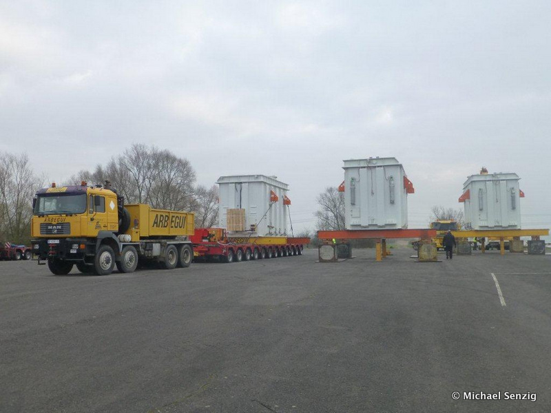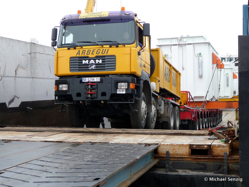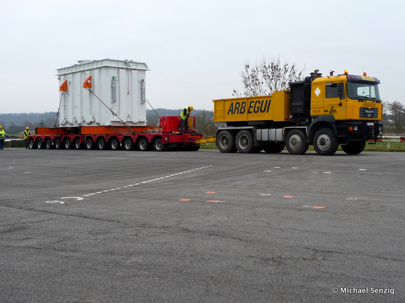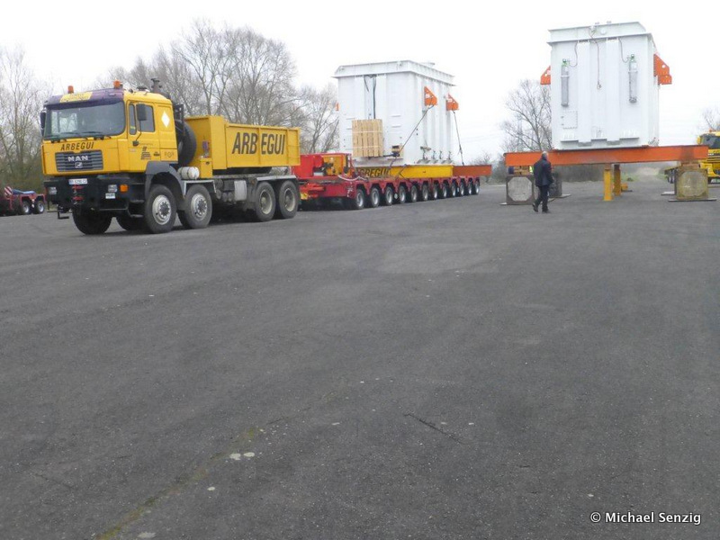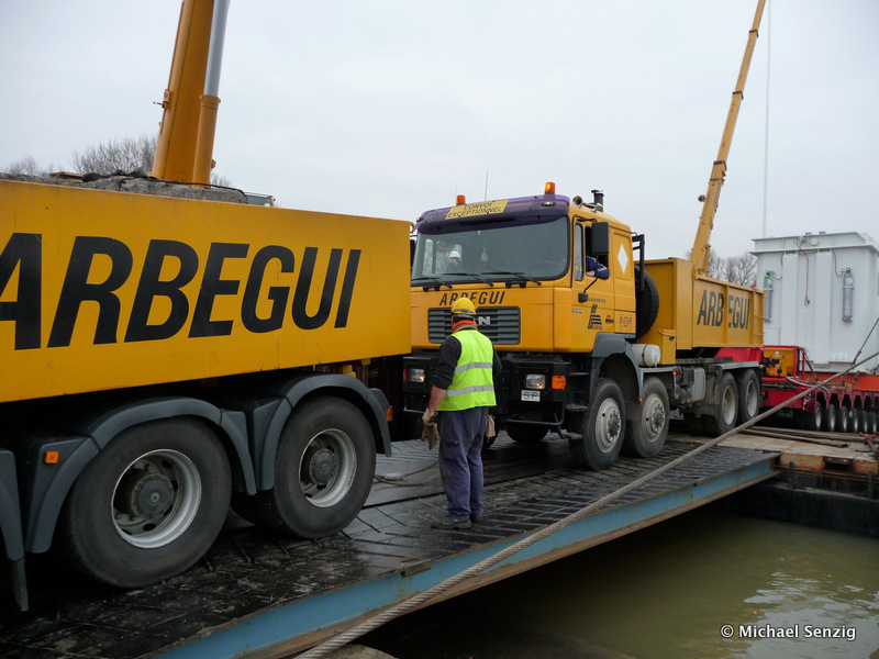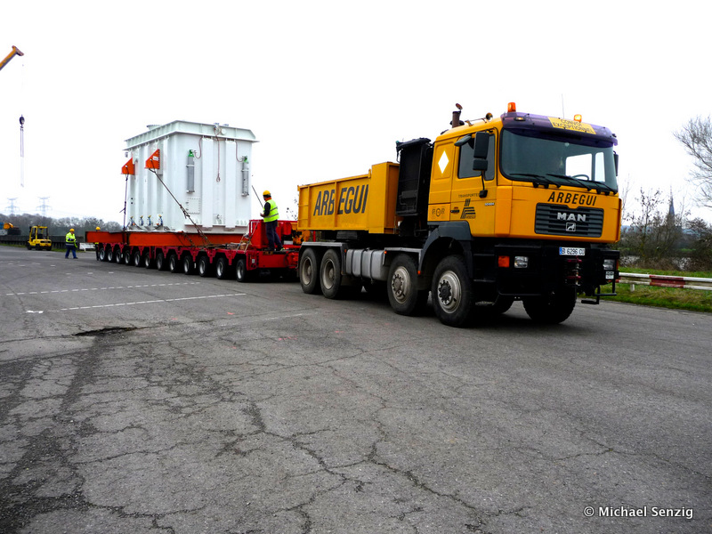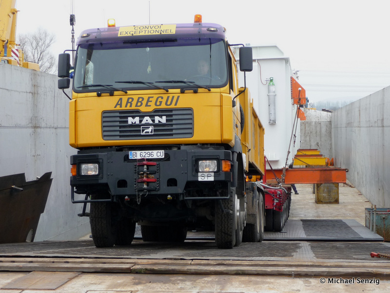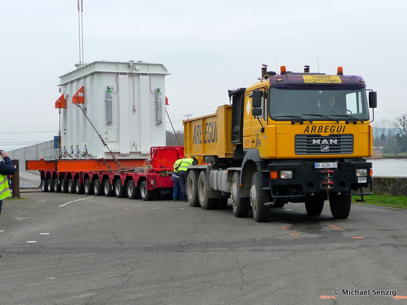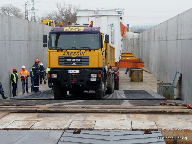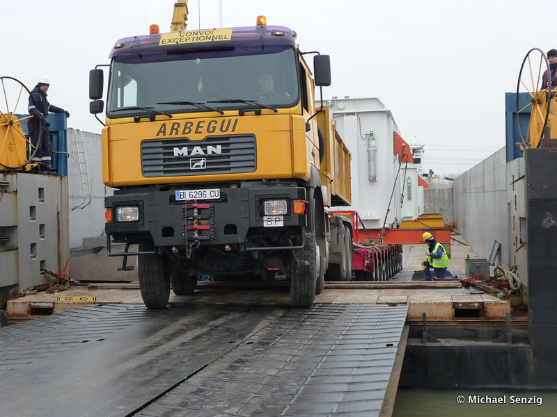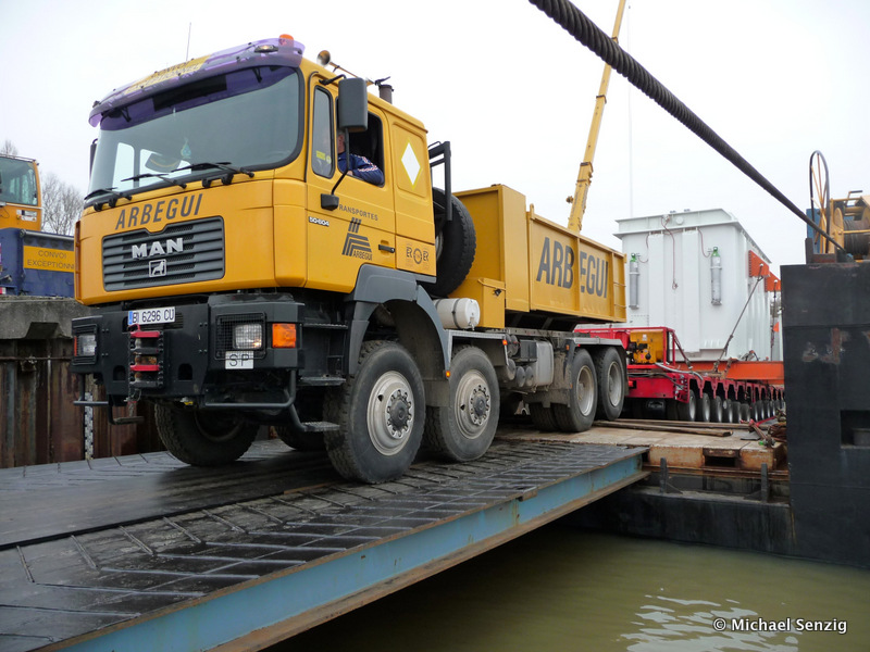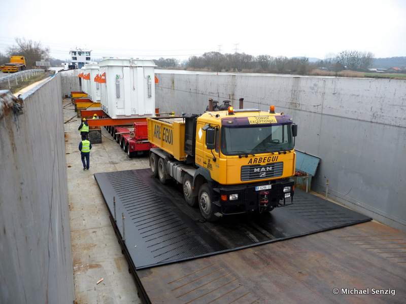 Im Februar 2016 hat der spanische Schwertransport-Spezialist ARBEGUI drei je 255 Tonnen schwere Trafos von einer RoRo-Rampe an der Mosel ins französischen Atomkraftwerk Cattnom transportiert. Die Trafos wurden bei ABB in Spanien gebaut und sind über den Seeweg in die Niederlande gelangt. Dort wurden die Trafos in ein Binnenschiff umgeladen und sind dann Mitte Februar in Dillingen angekommen. ARBEGUI hat für den Transport einen MAN F2000 Evo 50.604 8x8 und einen MAN TGA 41.660 eingesetzt. Beide Zugmaschinen sind schon älter, aber sehr interessant. Michael Senzig hat den Umschlag der Trafos an der Rampe beobachtet und fotografiert.