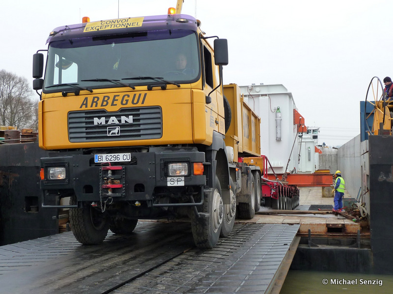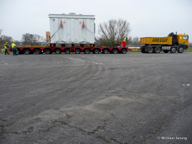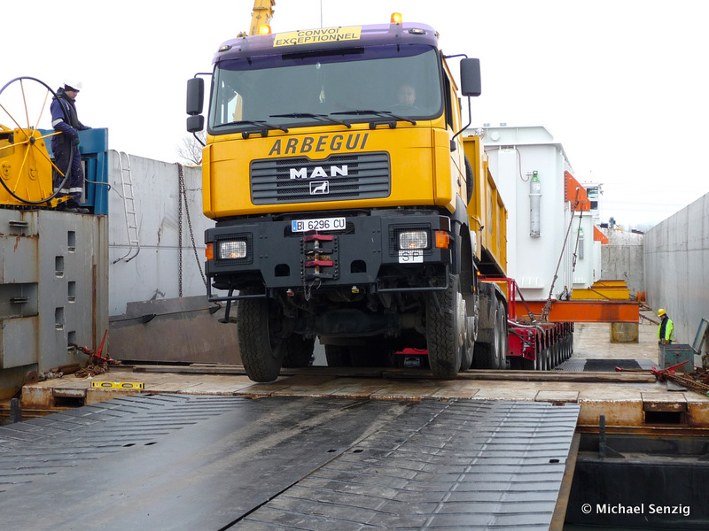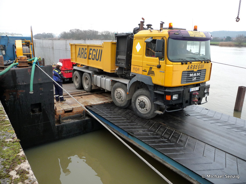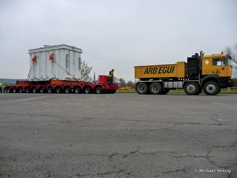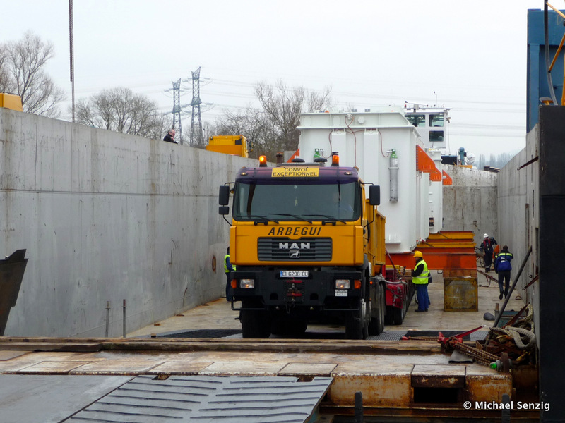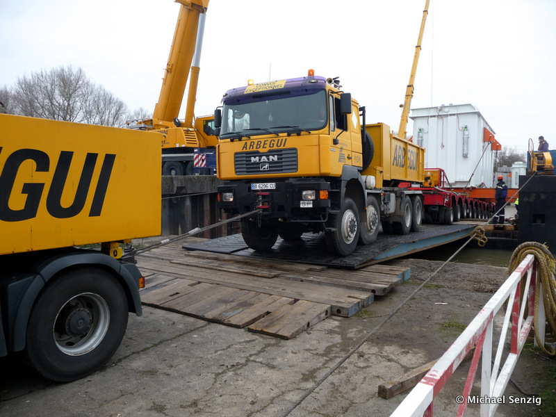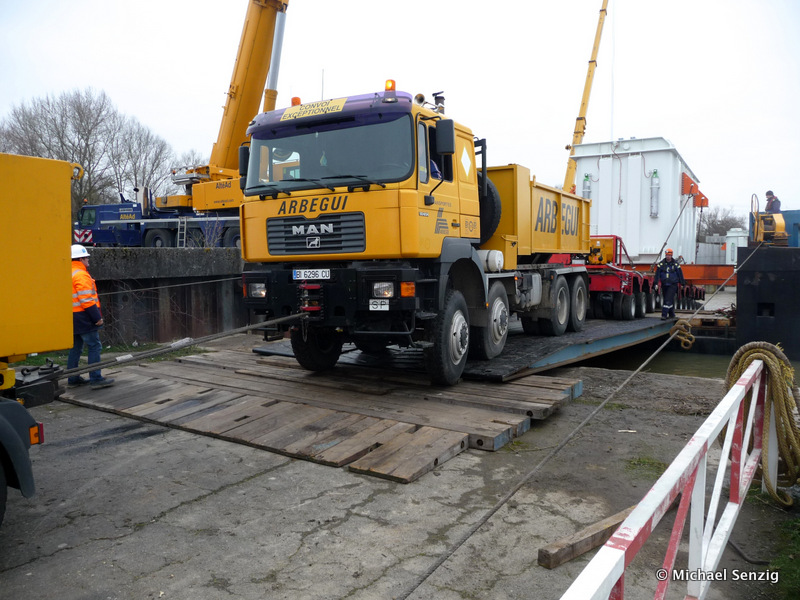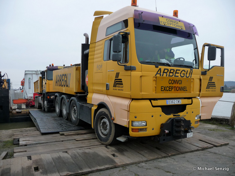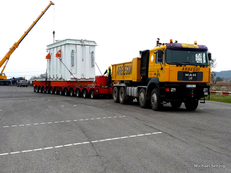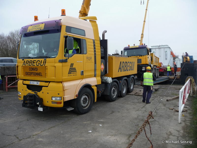 Im Februar 2016 hat der spanische Schwertransport-Spezialist ARBEGUI drei je 255 Tonnen schwere Trafos von einer RoRo-Rampe an der Mosel ins französischen Atomkraftwerk Cattnom transportiert. Die Trafos wurden bei ABB in Spanien gebaut und sind über den Seeweg in die Niederlande gelangt. Dort wurden die Trafos in ein Binnenschiff umgeladen und sind dann Mitte Februar in Dillingen angekommen. ARBEGUI hat für den Transport einen MAN F2000 Evo 50.604 8x8 und einen MAN TGA 41.660 eingesetzt. Beide Zugmaschinen sind schon älter, aber sehr interessant. Michael Senzig hat den Umschlag der Trafos an der Rampe beobachtet und fotografiert.