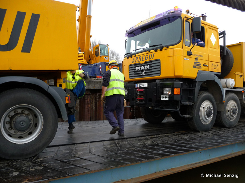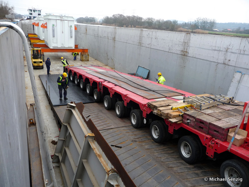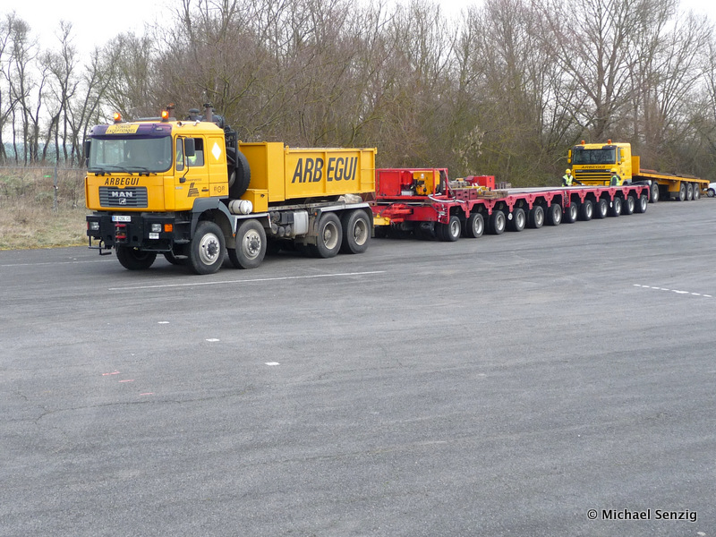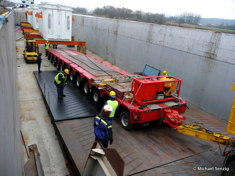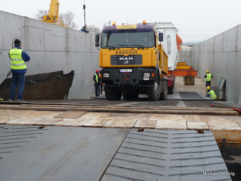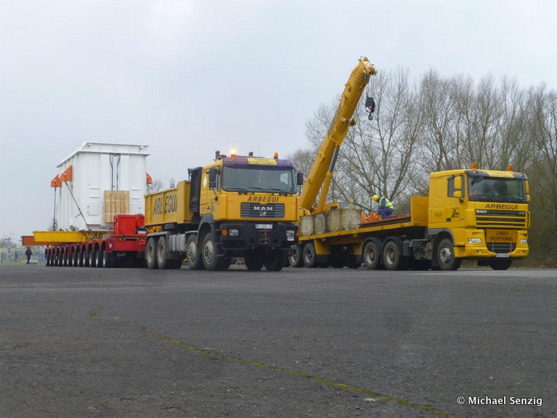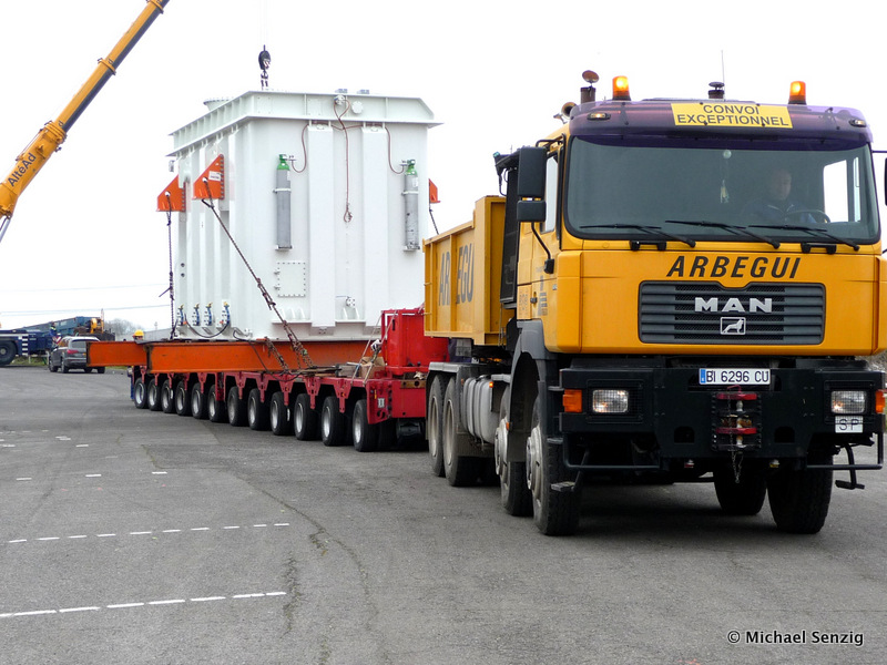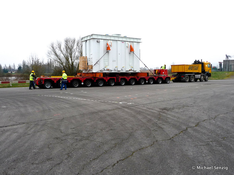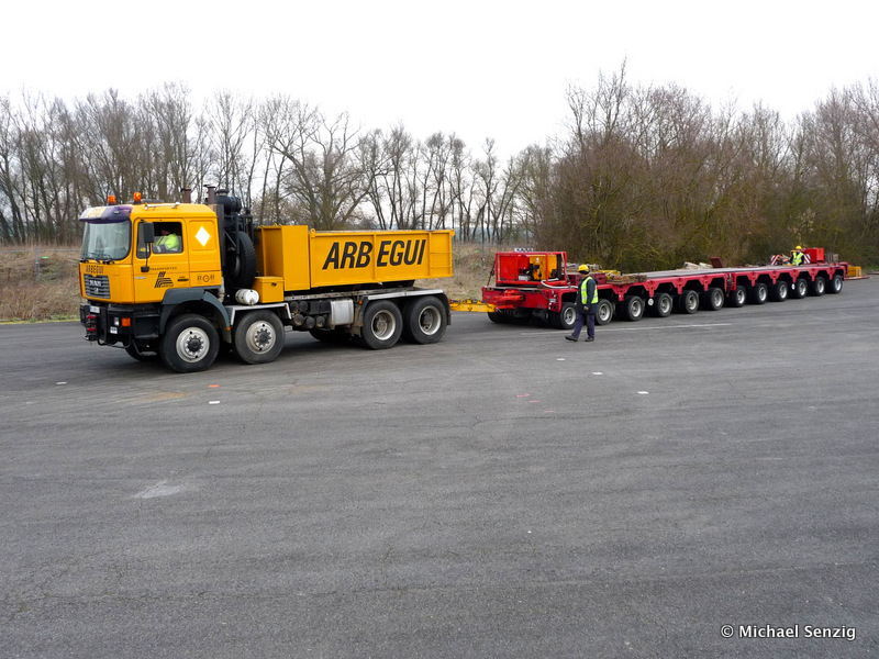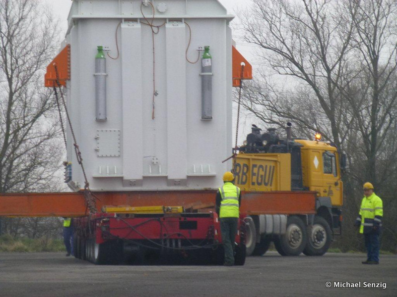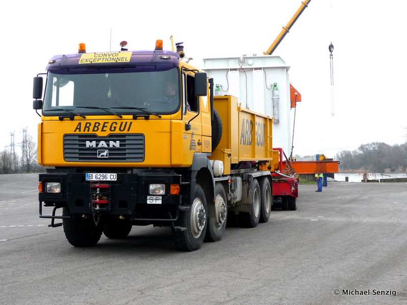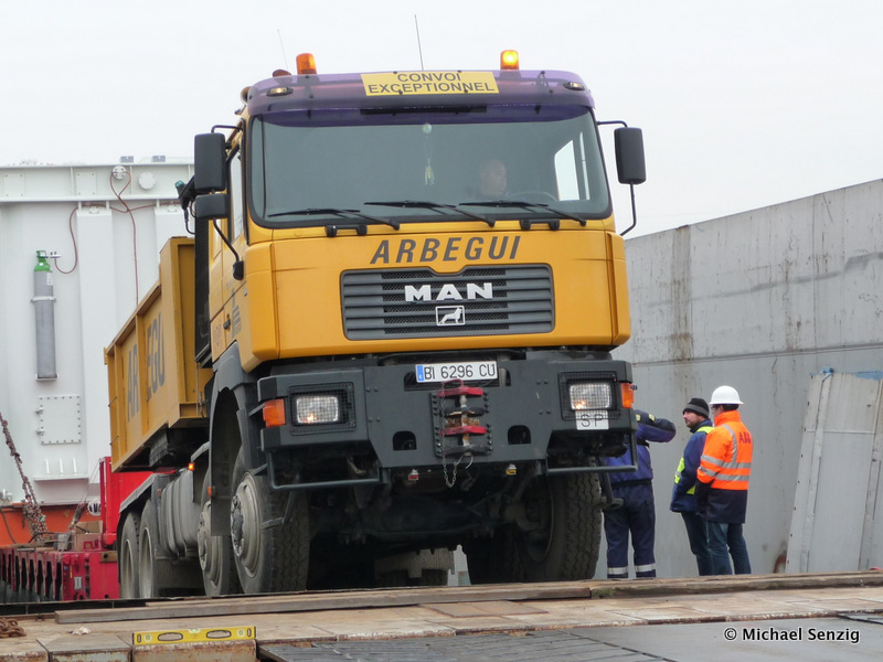 Im Februar 2016 hat der spanische Schwertransport-Spezialist ARBEGUI drei je 255 Tonnen schwere Trafos von einer RoRo-Rampe an der Mosel ins französischen Atomkraftwerk Cattnom transportiert. Die Trafos wurden bei ABB in Spanien gebaut und sind über den Seeweg in die Niederlande gelangt. Dort wurden die Trafos in ein Binnenschiff umgeladen und sind dann Mitte Februar in Dillingen angekommen. ARBEGUI hat für den Transport einen MAN F2000 Evo 50.604 8x8 und einen MAN TGA 41.660 eingesetzt. Beide Zugmaschinen sind schon älter, aber sehr interessant. Michael Senzig hat den Umschlag der Trafos an der Rampe beobachtet und fotografiert.