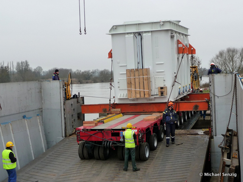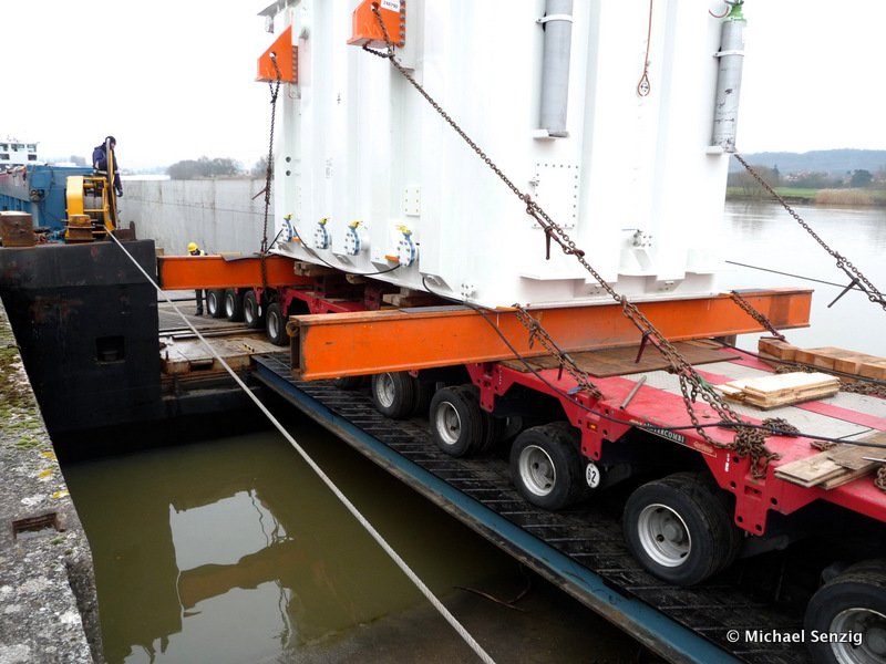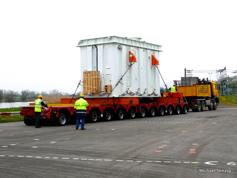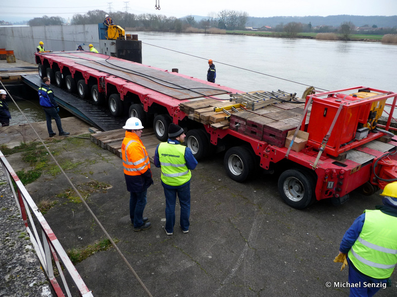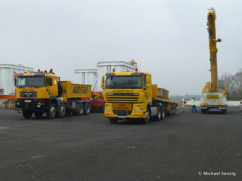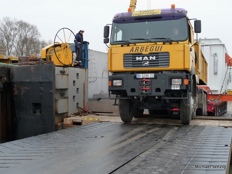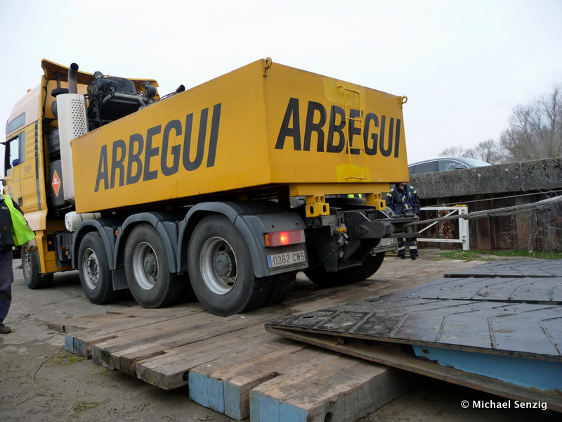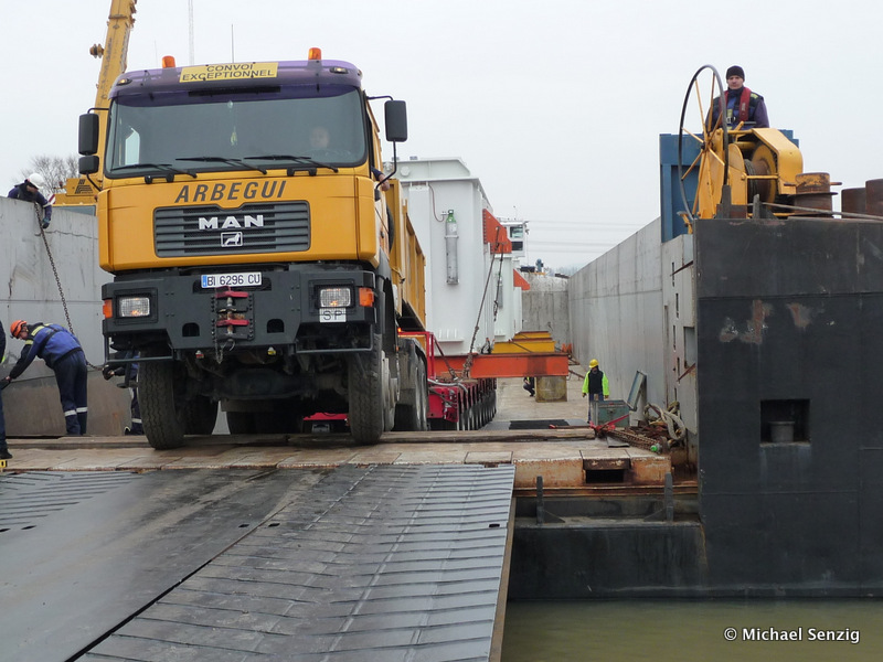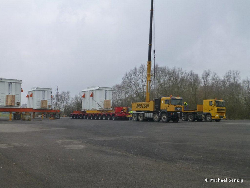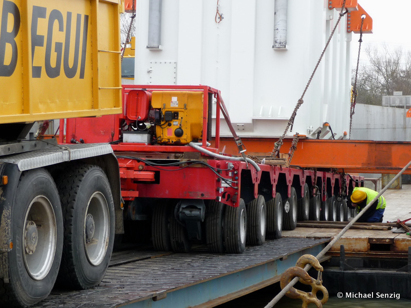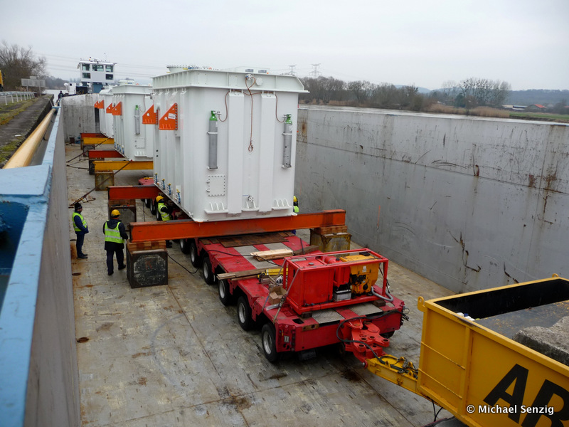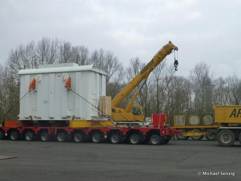 Im Februar 2016 hat der spanische Schwertransport-Spezialist ARBEGUI drei je 255 Tonnen schwere Trafos von einer RoRo-Rampe an der Mosel ins französischen Atomkraftwerk Cattnom transportiert. Die Trafos wurden bei ABB in Spanien gebaut und sind über den Seeweg in die Niederlande gelangt. Dort wurden die Trafos in ein Binnenschiff umgeladen und sind dann Mitte Februar in Dillingen angekommen. ARBEGUI hat für den Transport einen MAN F2000 Evo 50.604 8x8 und einen MAN TGA 41.660 eingesetzt. Beide Zugmaschinen sind schon älter, aber sehr interessant. Michael Senzig hat den Umschlag der Trafos an der Rampe beobachtet und fotografiert.