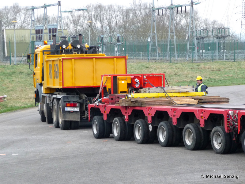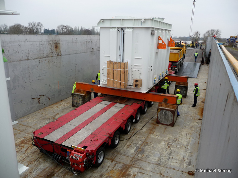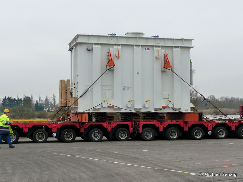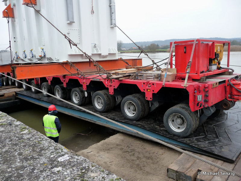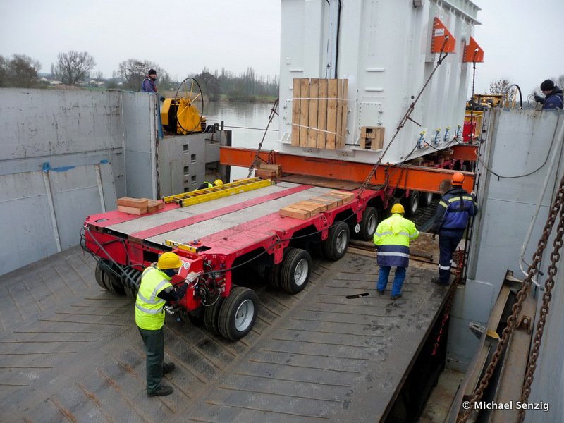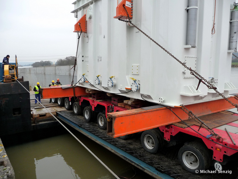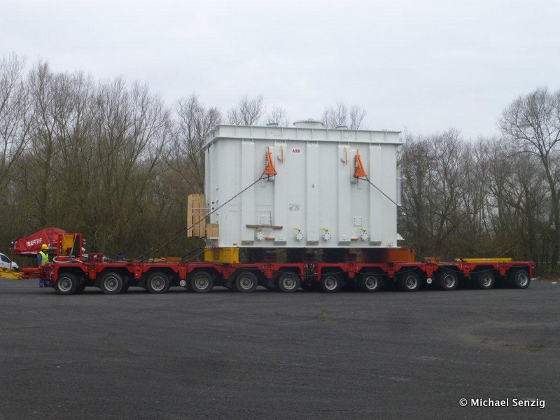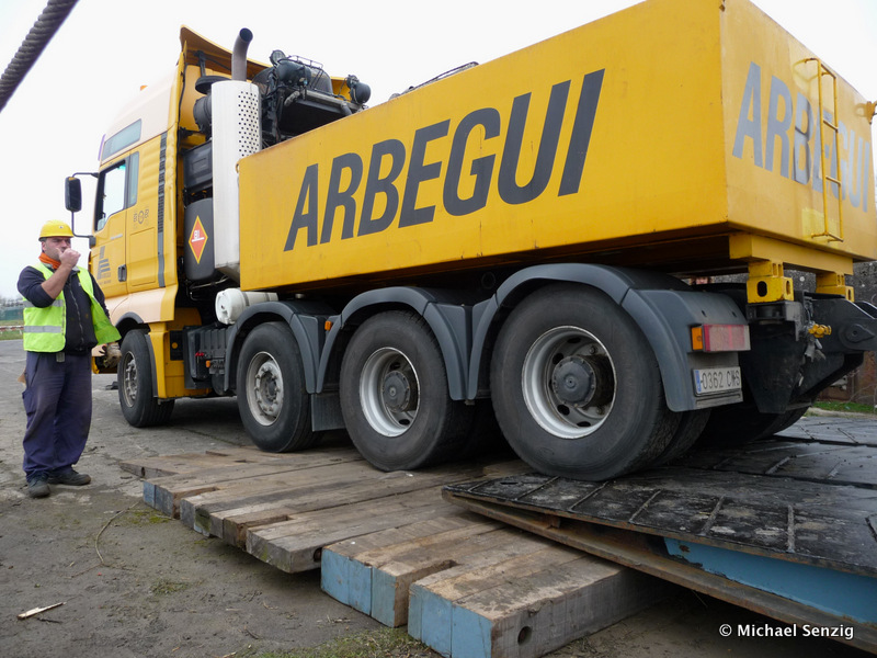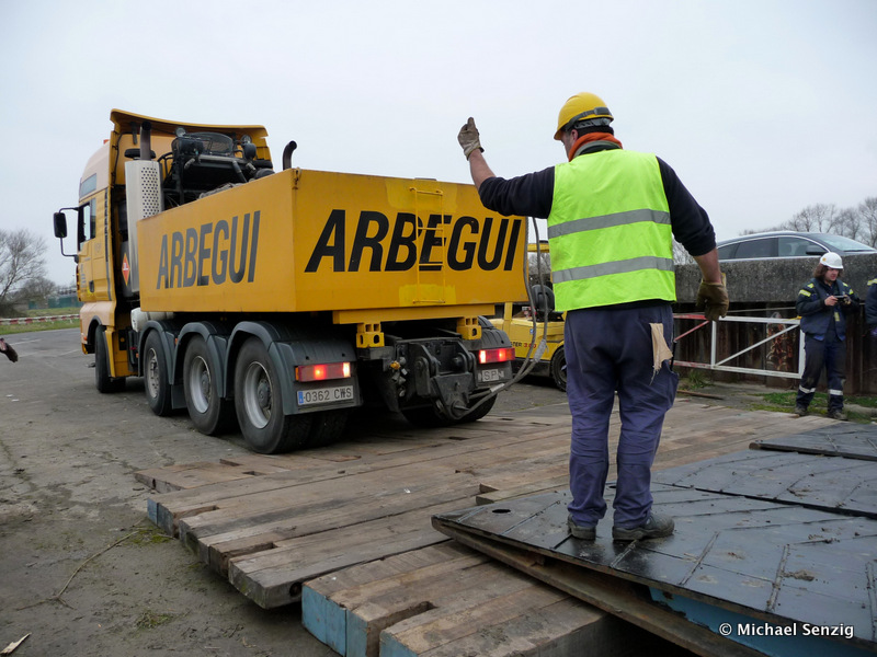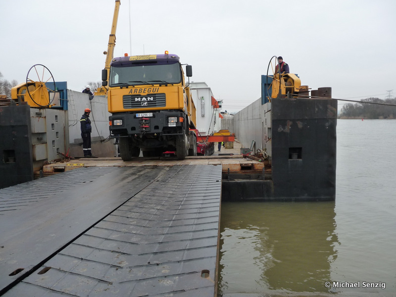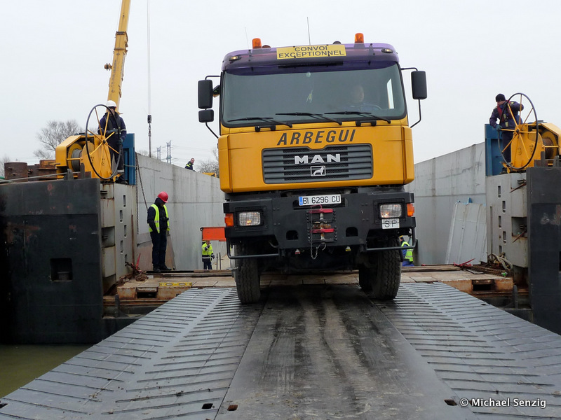 Im Februar 2016 hat der spanische Schwertransport-Spezialist ARBEGUI drei je 255 Tonnen schwere Trafos von einer RoRo-Rampe an der Mosel ins französischen Atomkraftwerk Cattnom transportiert. Die Trafos wurden bei ABB in Spanien gebaut und sind über den Seeweg in die Niederlande gelangt. Dort wurden die Trafos in ein Binnenschiff umgeladen und sind dann Mitte Februar in Dillingen angekommen. ARBEGUI hat für den Transport einen MAN F2000 Evo 50.604 8x8 und einen MAN TGA 41.660 eingesetzt. Beide Zugmaschinen sind schon älter, aber sehr interessant. Michael Senzig hat den Umschlag der Trafos an der Rampe beobachtet und fotografiert.