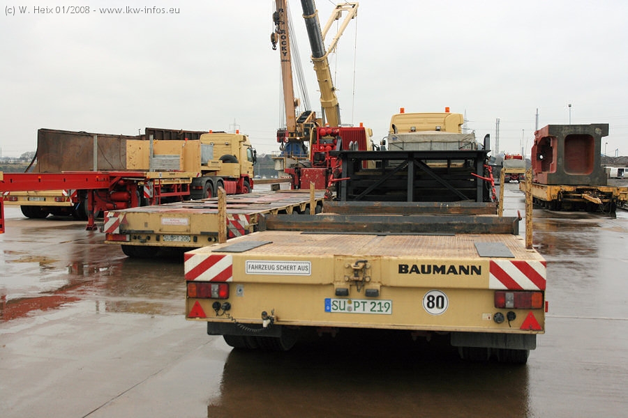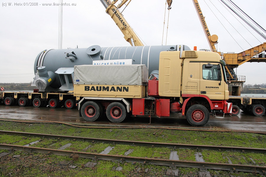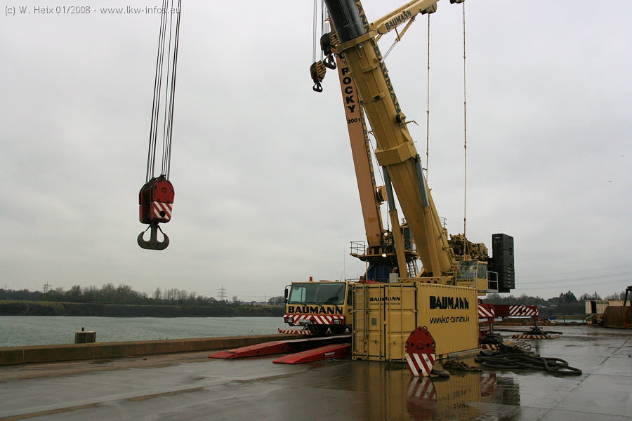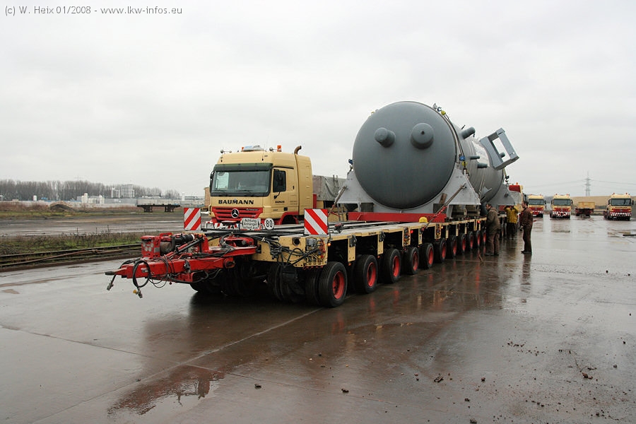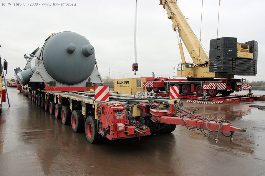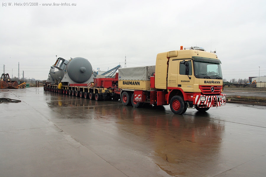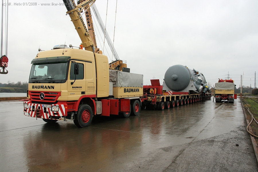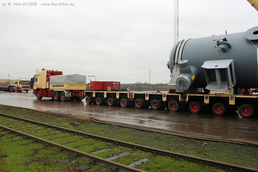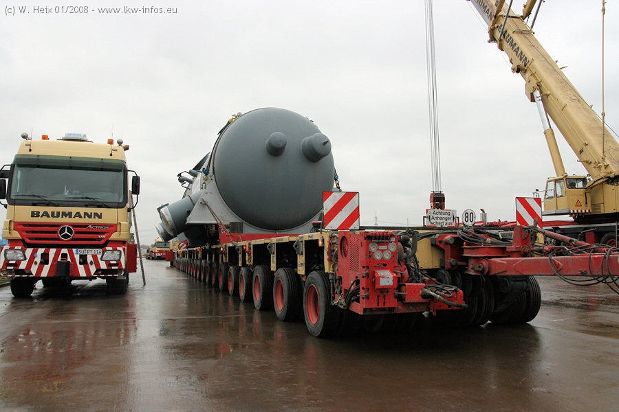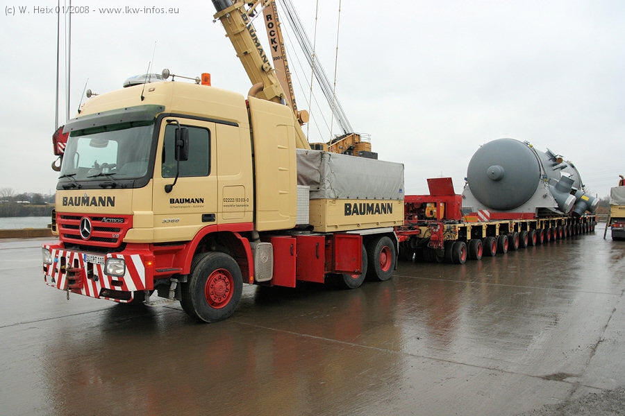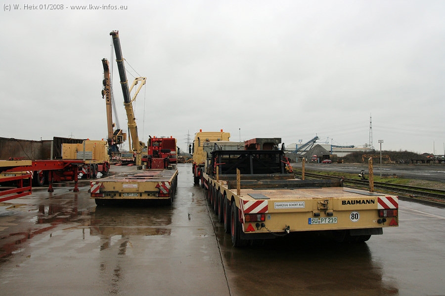 Am 21.01.2008 erreichte das Schiff den Krefelder Hafen. Der Hub vom Schiff auf den Tieflader von Baumann mit 20 Achslinien erfolgte erneute durch den Big Rocky und diesmal mit dem Liebherr LTM 1500 von Baumann. Das Gewicht des Wärmetauschers lag bei ca. 230 Tonnen. Da die Firma Baumann diesmal früher anfing als bei den ersten beiden Hüben mit Franz Bracht, warl ich leider zu spät. Dafür konnte ich aber noch einige weitere Zugmaschinen von Baumann fotografieren.