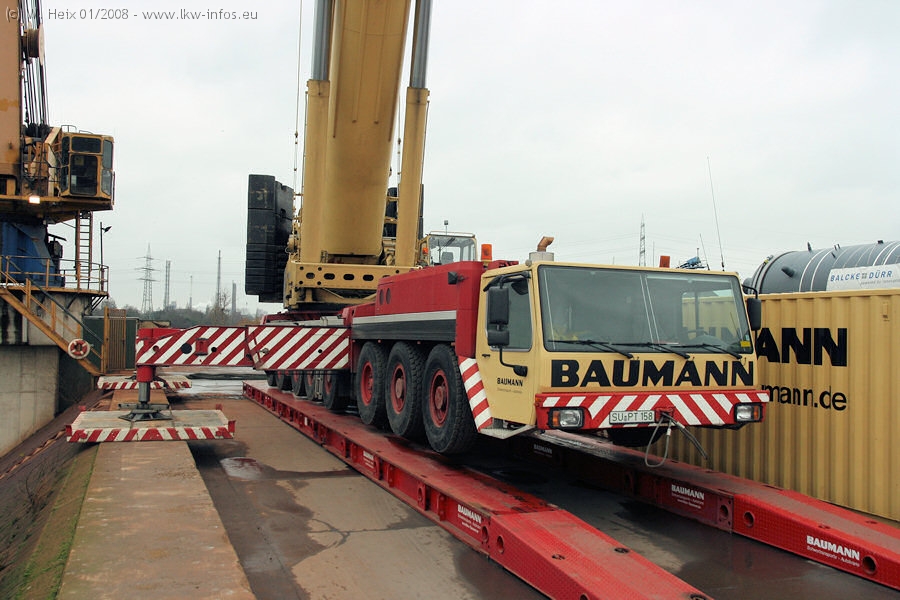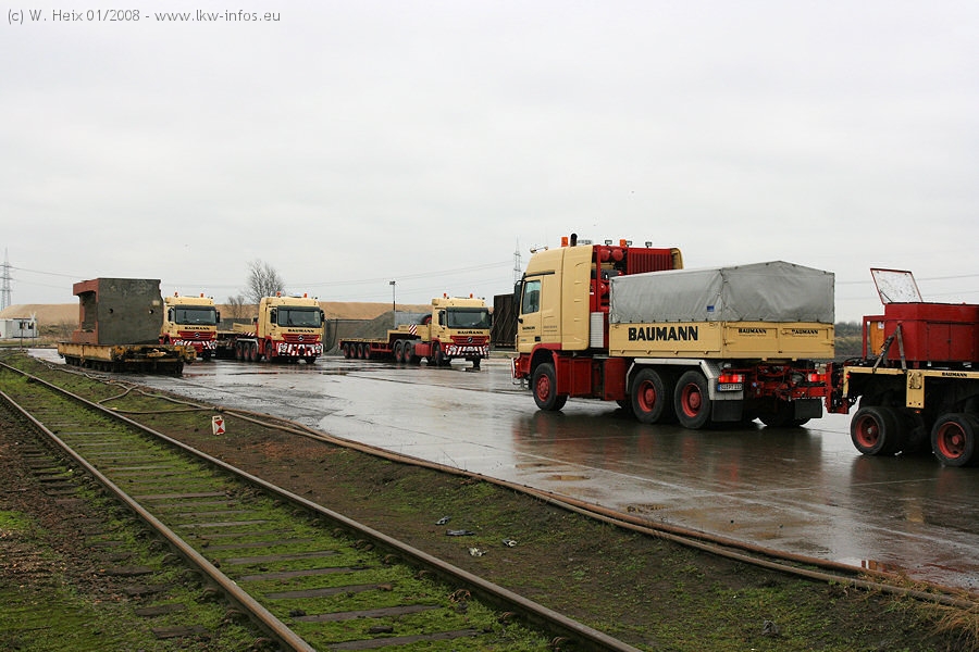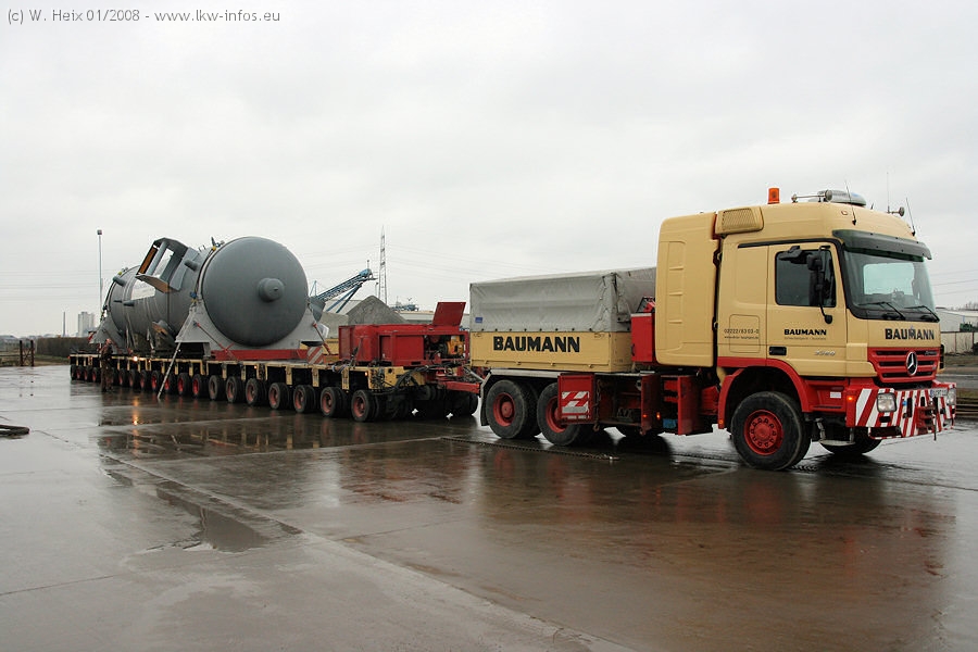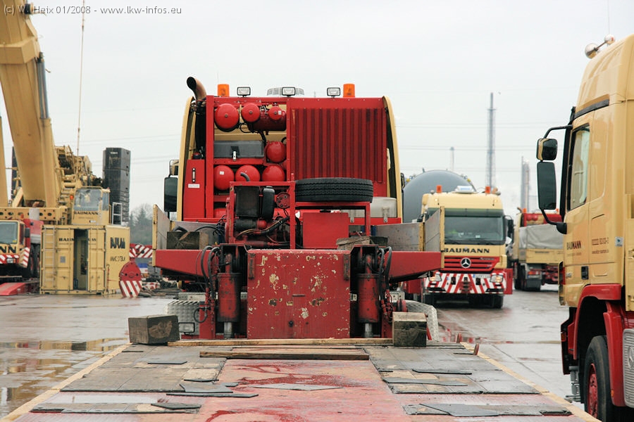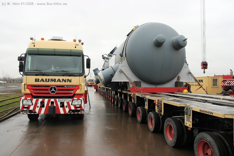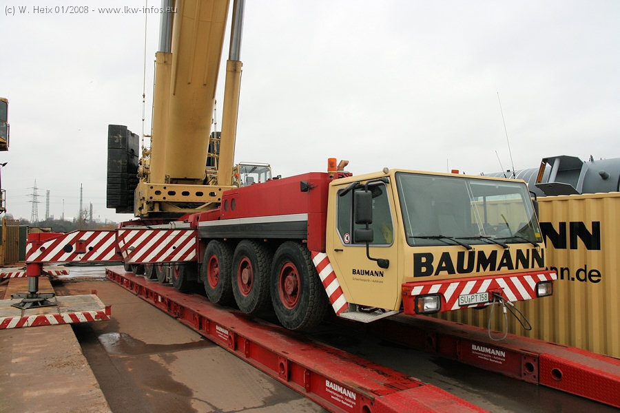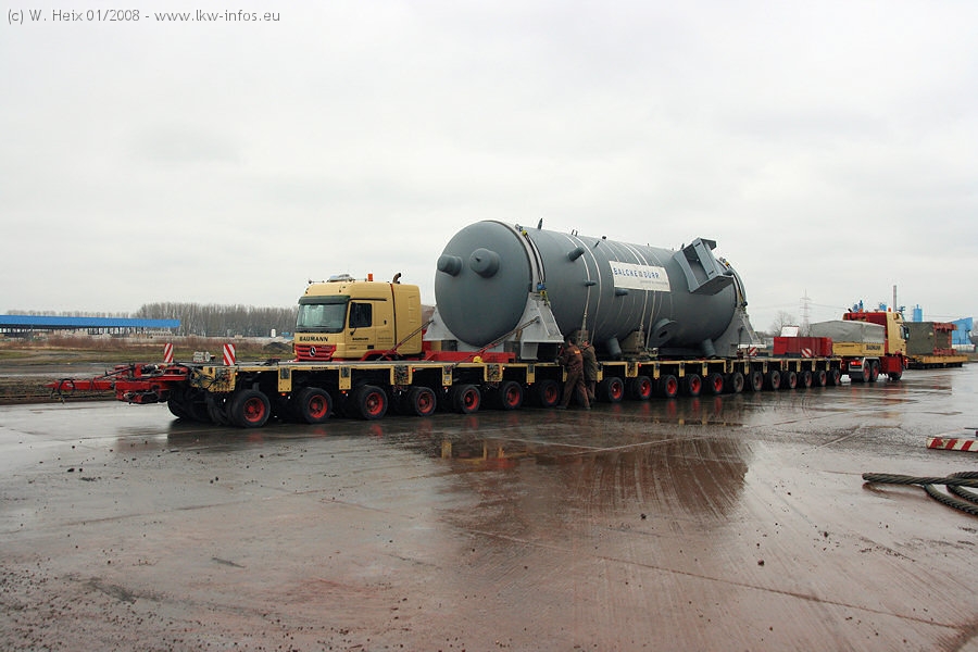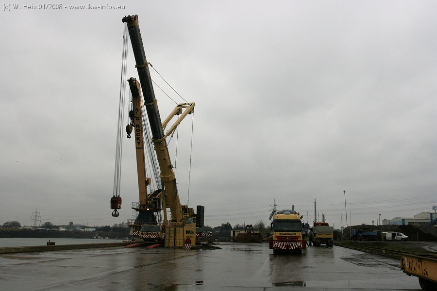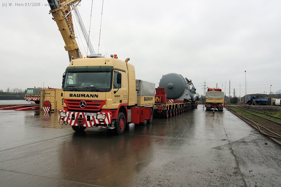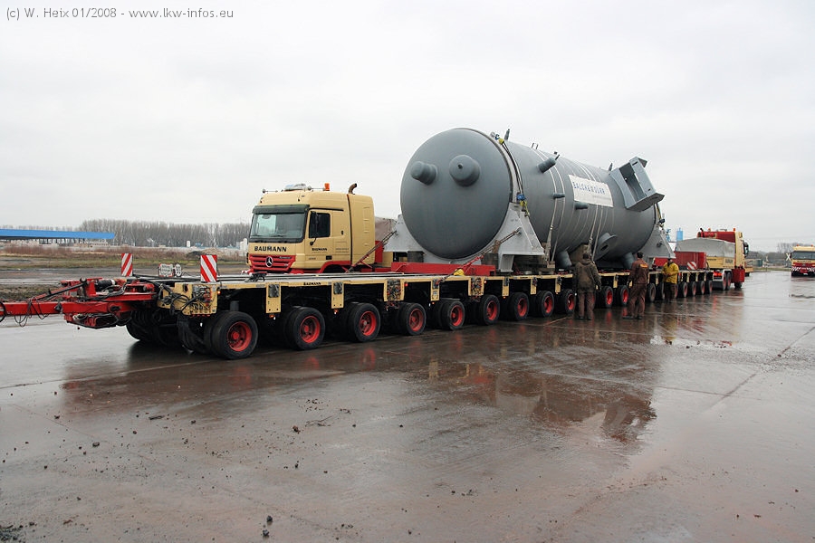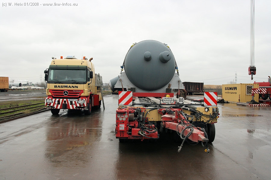 Am 21.01.2008 erreichte das Schiff den Krefelder Hafen. Der Hub vom Schiff auf den Tieflader von Baumann mit 20 Achslinien erfolgte erneute durch den Big Rocky und diesmal mit dem Liebherr LTM 1500 von Baumann. Das Gewicht des Wärmetauschers lag bei ca. 230 Tonnen. Da die Firma Baumann diesmal früher anfing als bei den ersten beiden Hüben mit Franz Bracht, warl ich leider zu spät. Dafür konnte ich aber noch einige weitere Zugmaschinen von Baumann fotografieren.