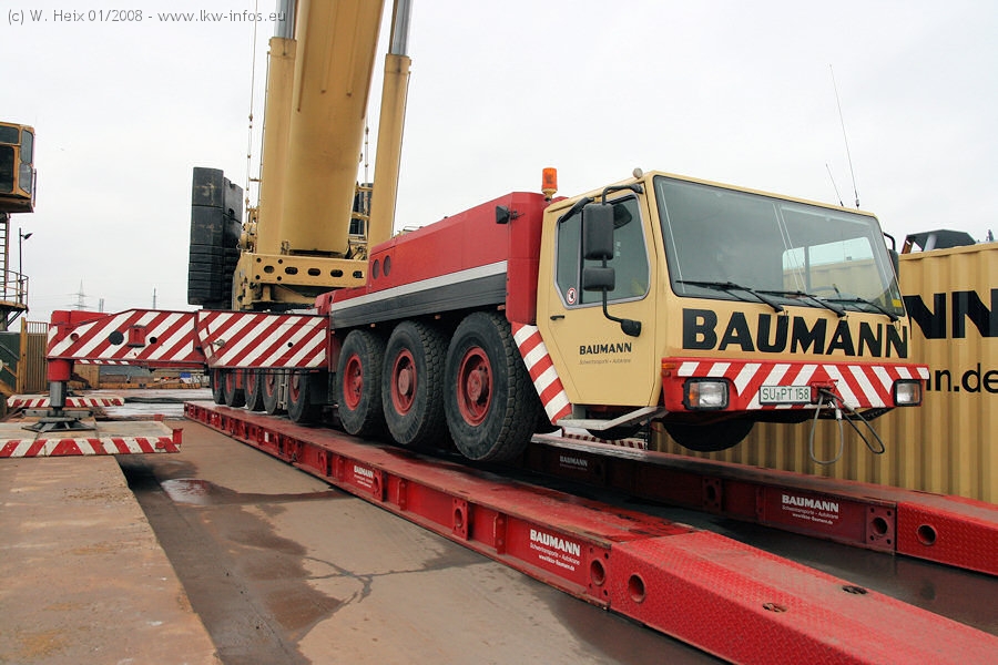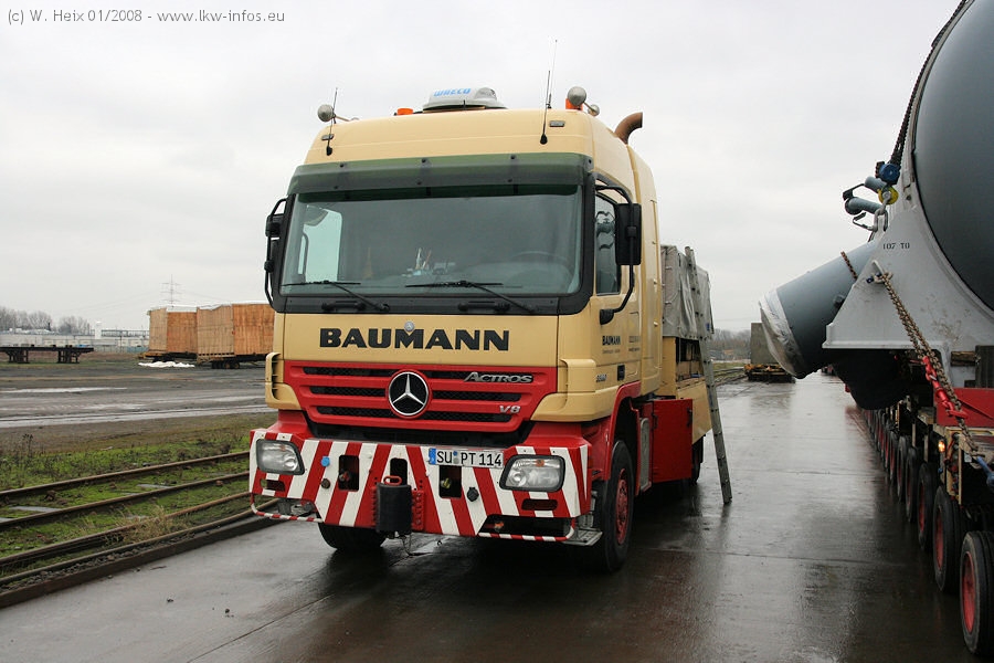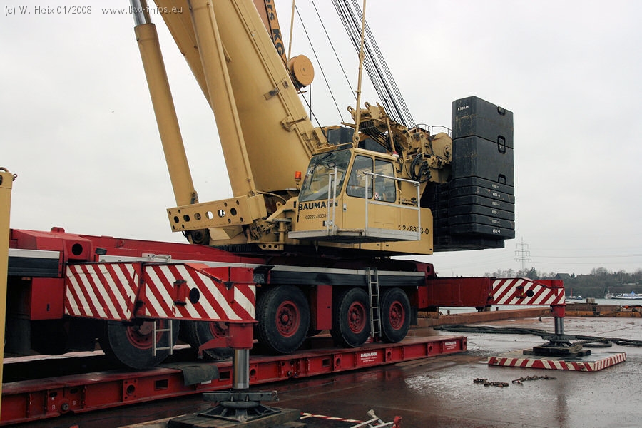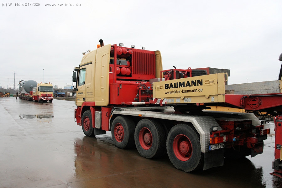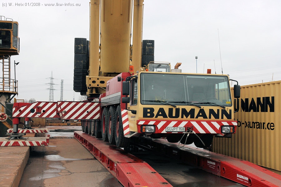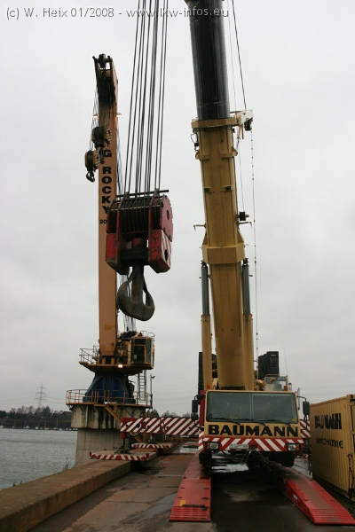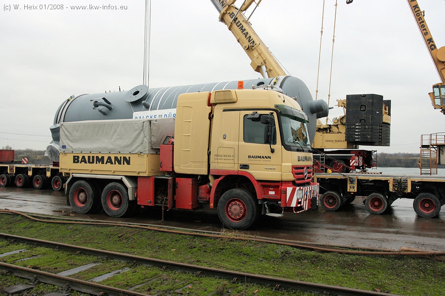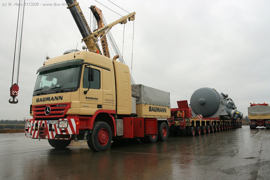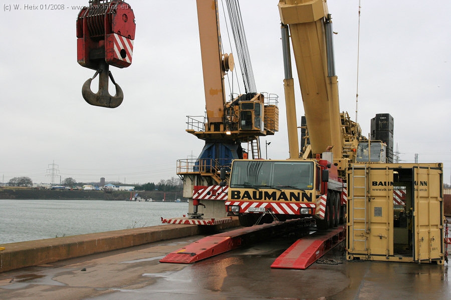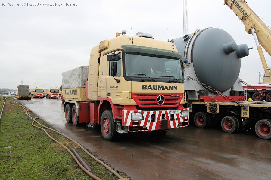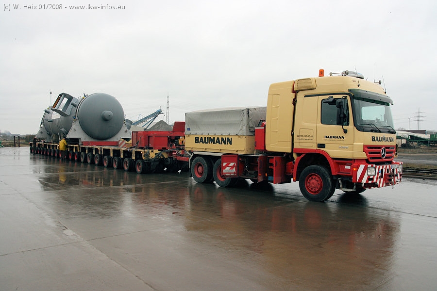 Am 21.01.2008 erreichte das Schiff den Krefelder Hafen. Der Hub vom Schiff auf den Tieflader von Baumann mit 20 Achslinien erfolgte erneute durch den Big Rocky und diesmal mit dem Liebherr LTM 1500 von Baumann. Das Gewicht des Wärmetauschers lag bei ca. 230 Tonnen. Da die Firma Baumann diesmal früher anfing als bei den ersten beiden Hüben mit Franz Bracht, warl ich leider zu spät. Dafür konnte ich aber noch einige weitere Zugmaschinen von Baumann fotografieren.