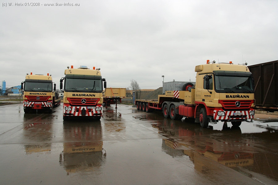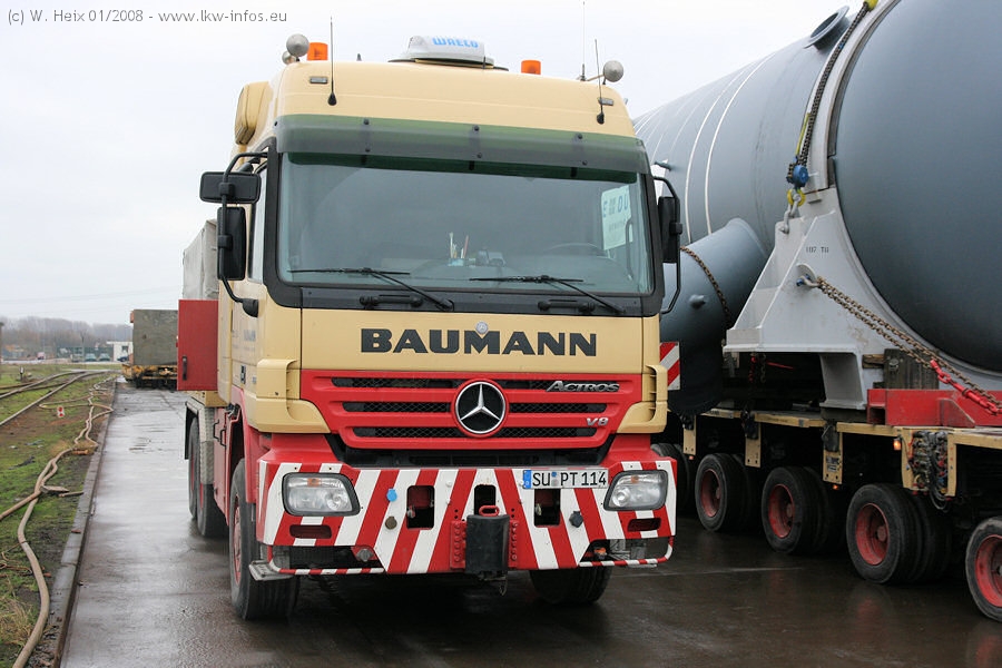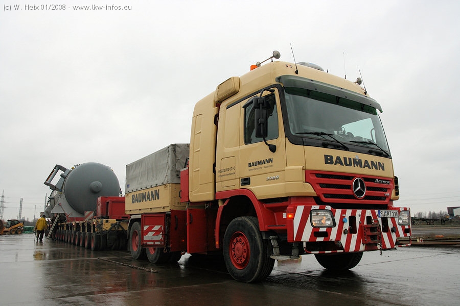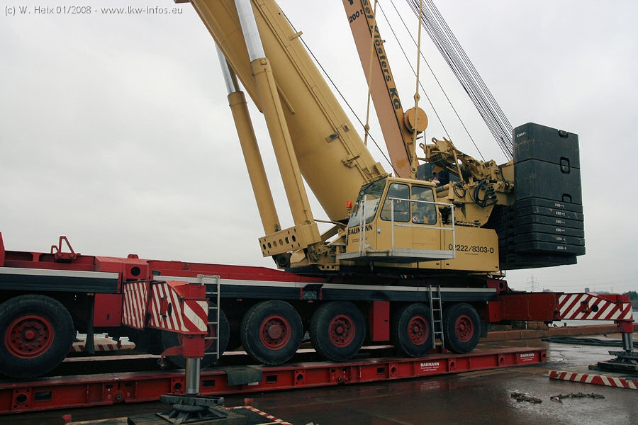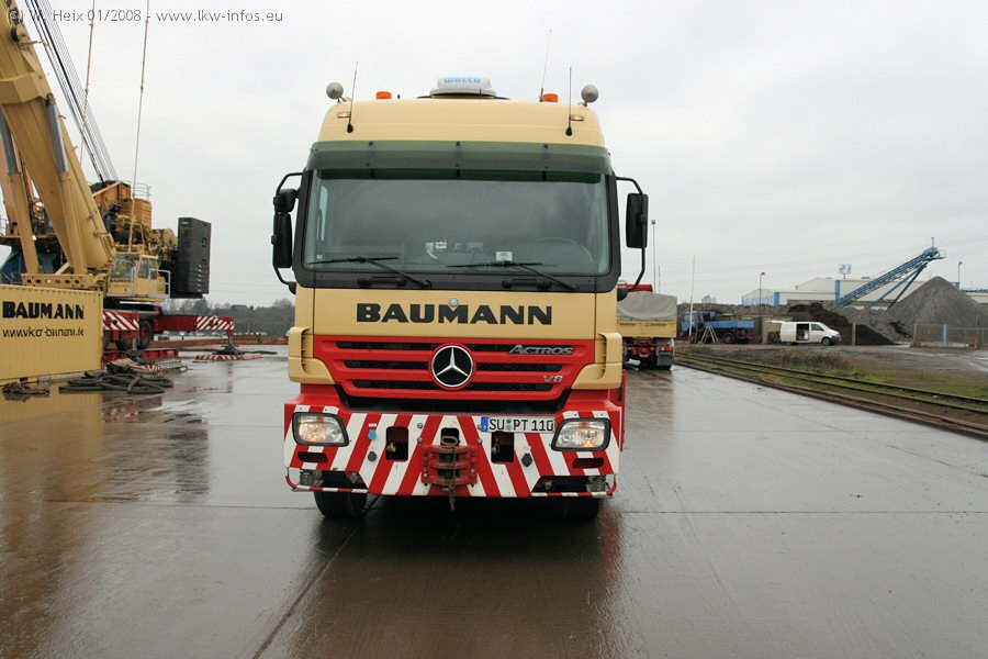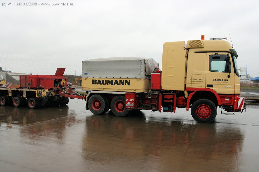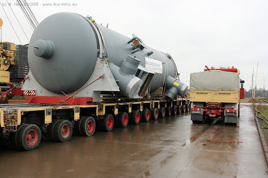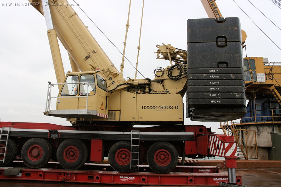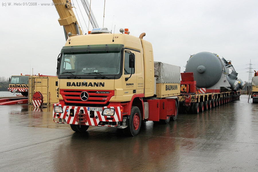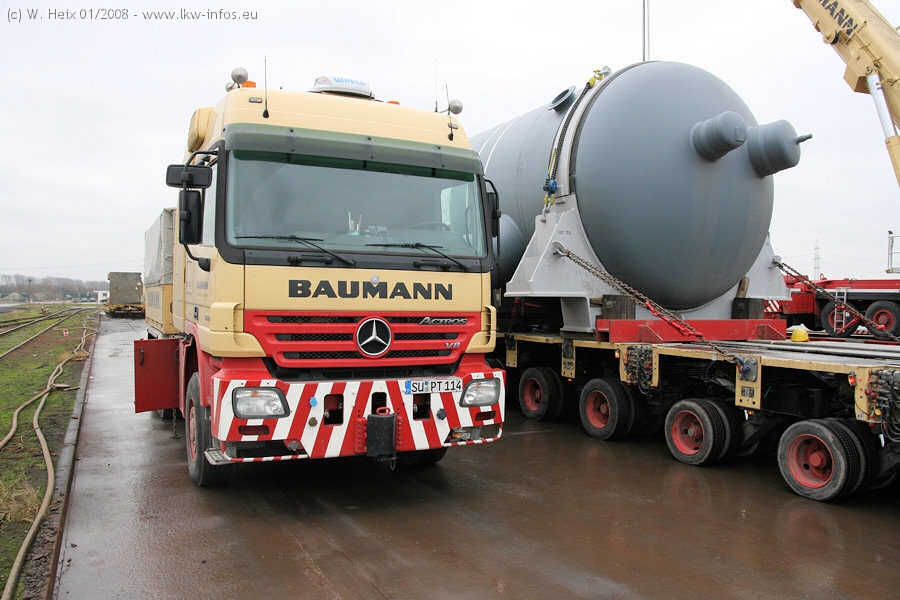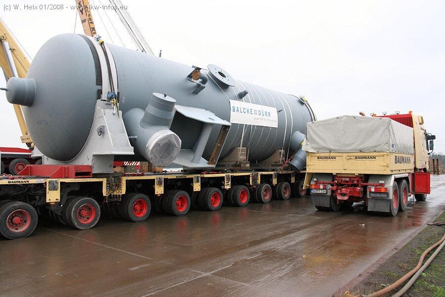 Am 21.01.2008 erreichte das Schiff den Krefelder Hafen. Der Hub vom Schiff auf den Tieflader von Baumann mit 20 Achslinien erfolgte erneute durch den Big Rocky und diesmal mit dem Liebherr LTM 1500 von Baumann. Das Gewicht des Wärmetauschers lag bei ca. 230 Tonnen. Da die Firma Baumann diesmal früher anfing als bei den ersten beiden Hüben mit Franz Bracht, warl ich leider zu spät. Dafür konnte ich aber noch einige weitere Zugmaschinen von Baumann fotografieren.