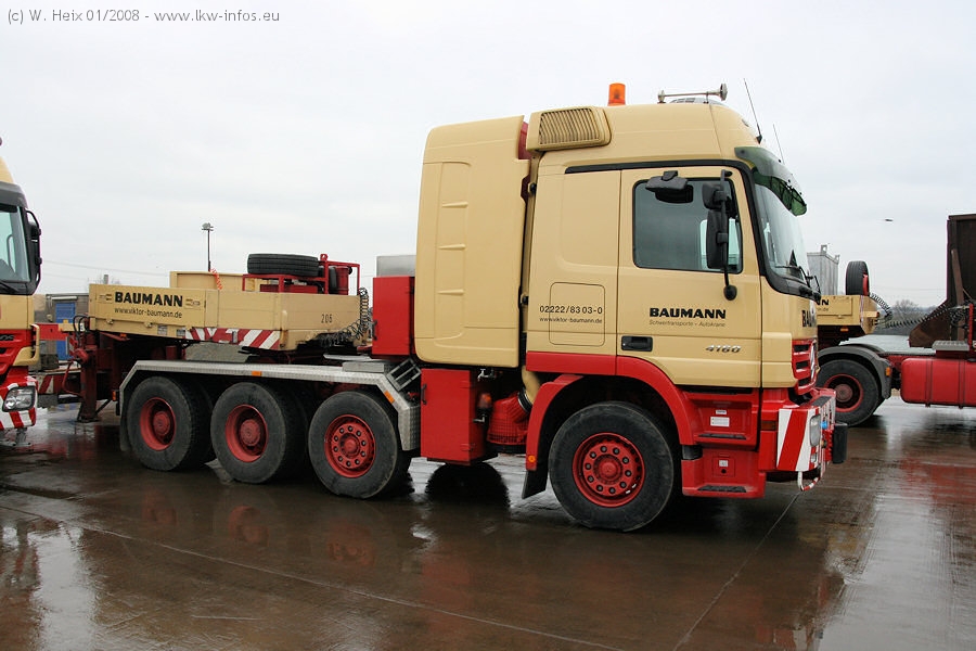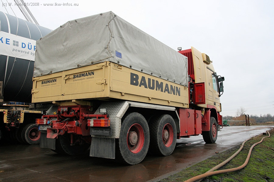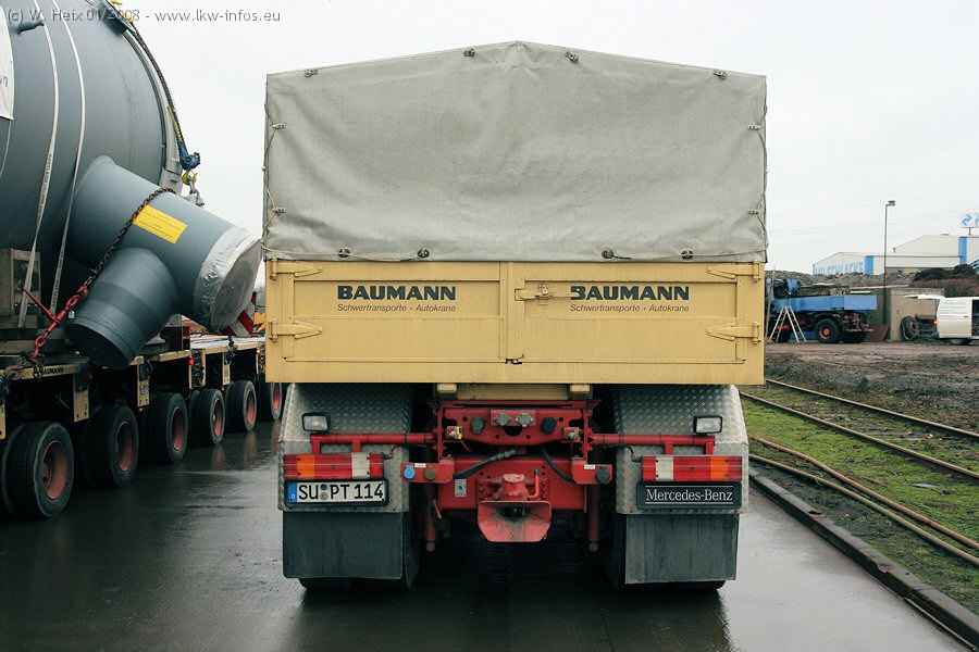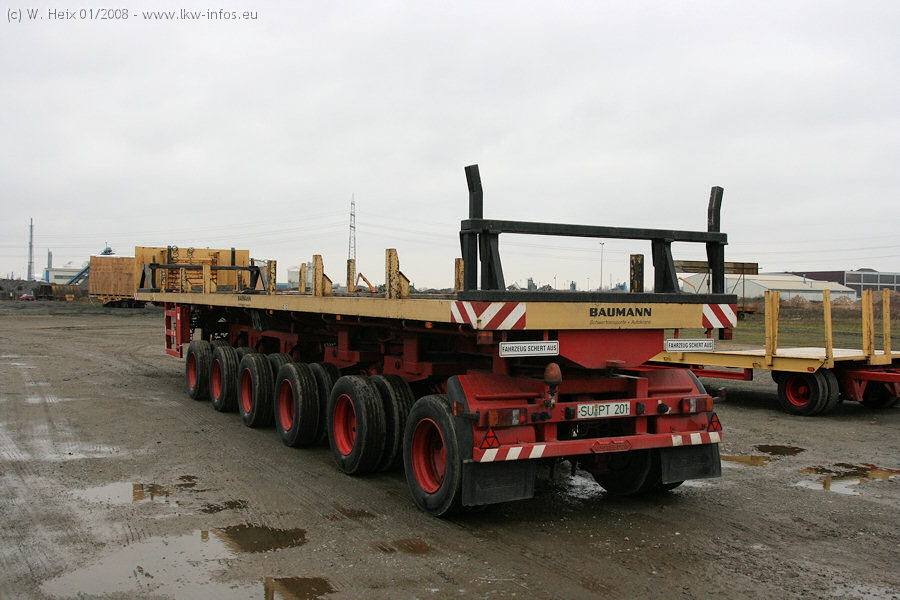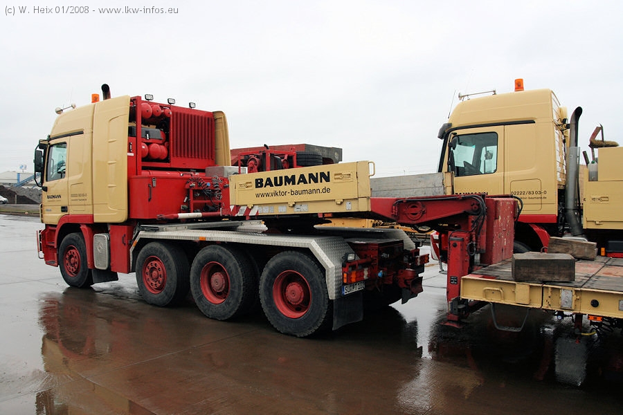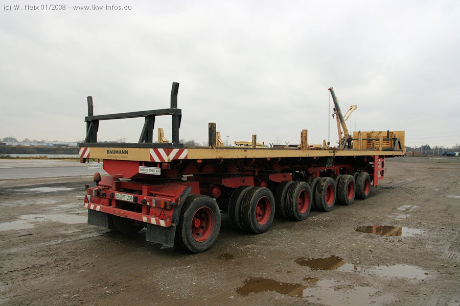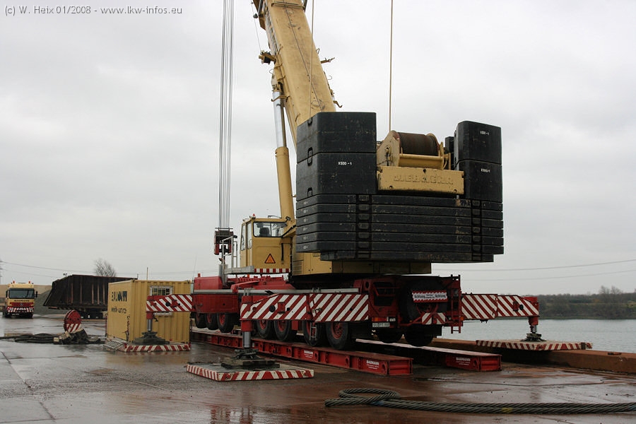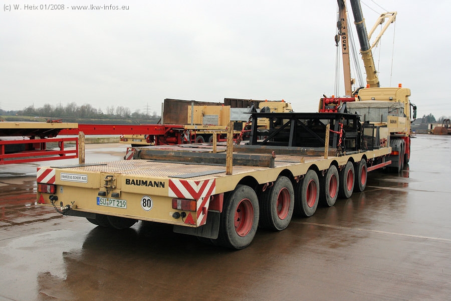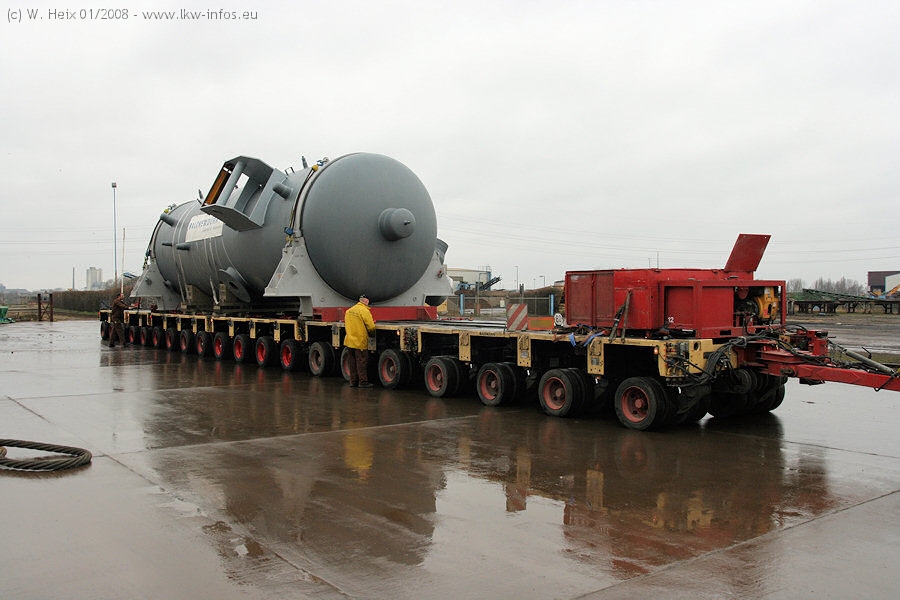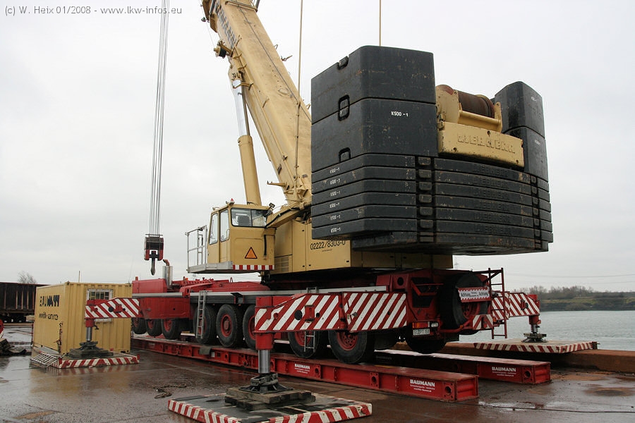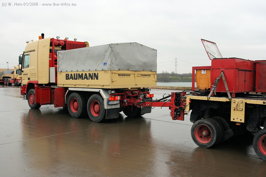 Am 21.01.2008 erreichte das Schiff den Krefelder Hafen. Der Hub vom Schiff auf den Tieflader von Baumann mit 20 Achslinien erfolgte erneute durch den Big Rocky und diesmal mit dem Liebherr LTM 1500 von Baumann. Das Gewicht des Wärmetauschers lag bei ca. 230 Tonnen. Da die Firma Baumann diesmal früher anfing als bei den ersten beiden Hüben mit Franz Bracht, warl ich leider zu spät. Dafür konnte ich aber noch einige weitere Zugmaschinen von Baumann fotografieren.