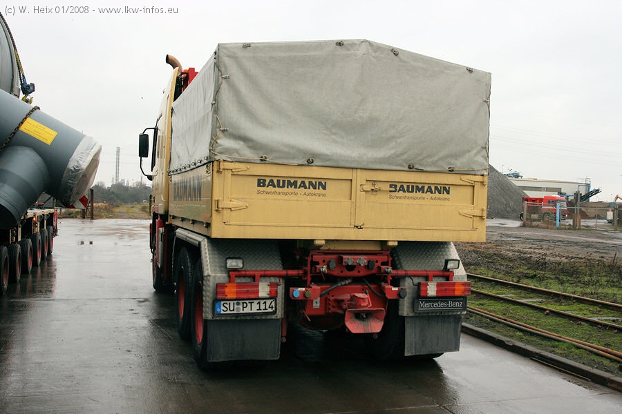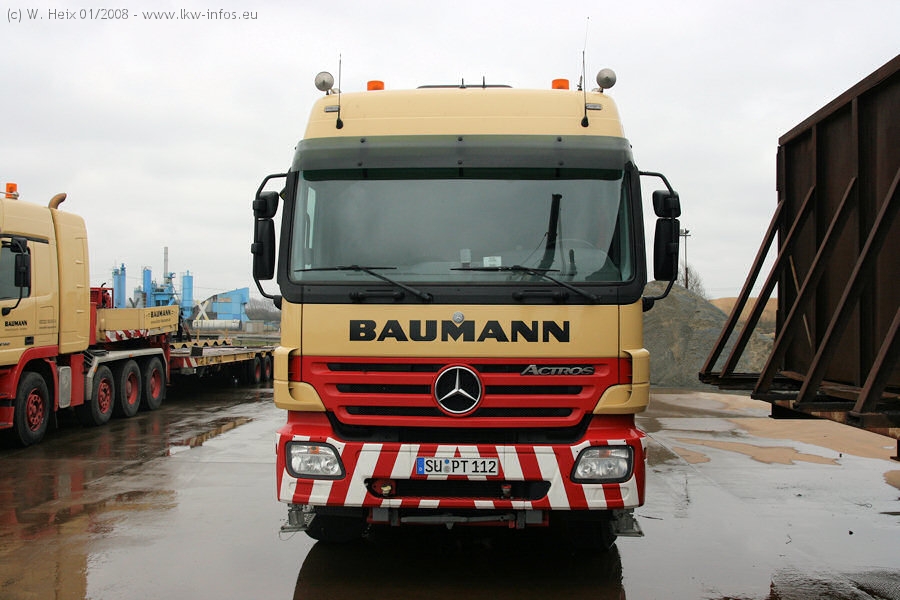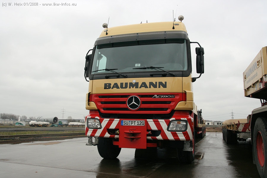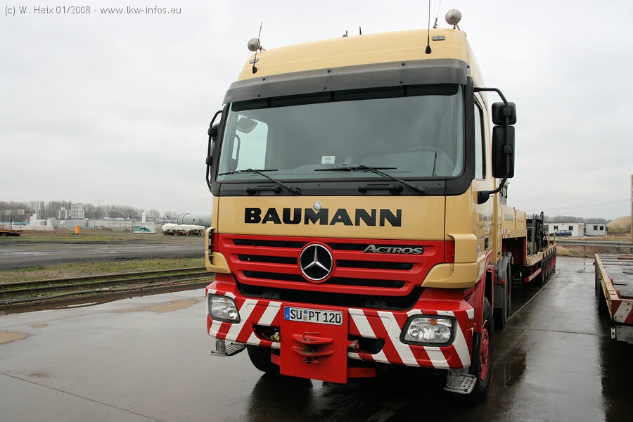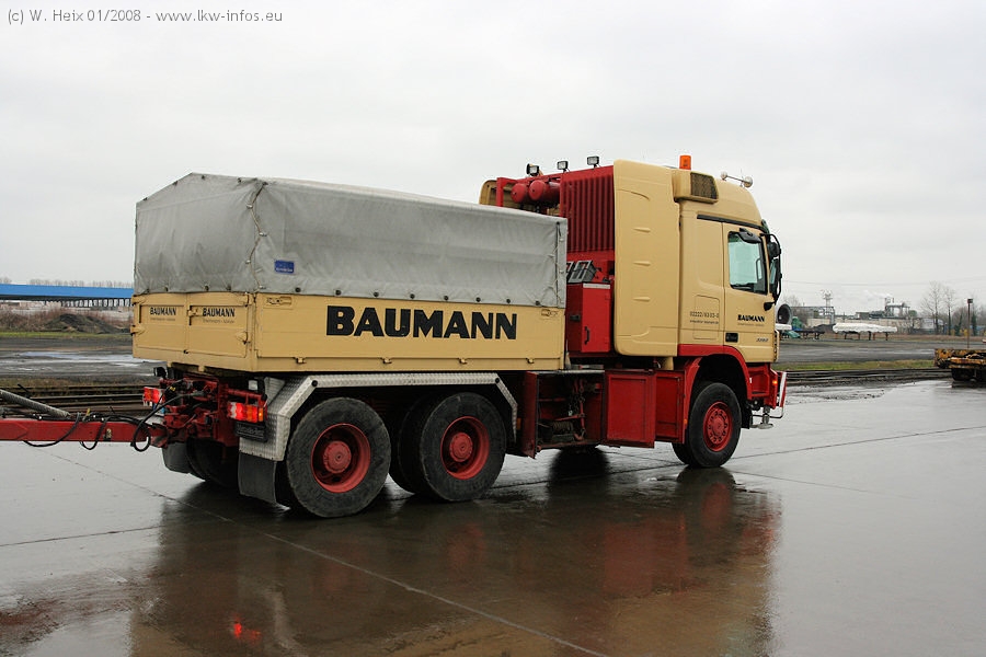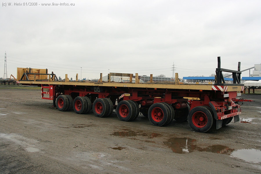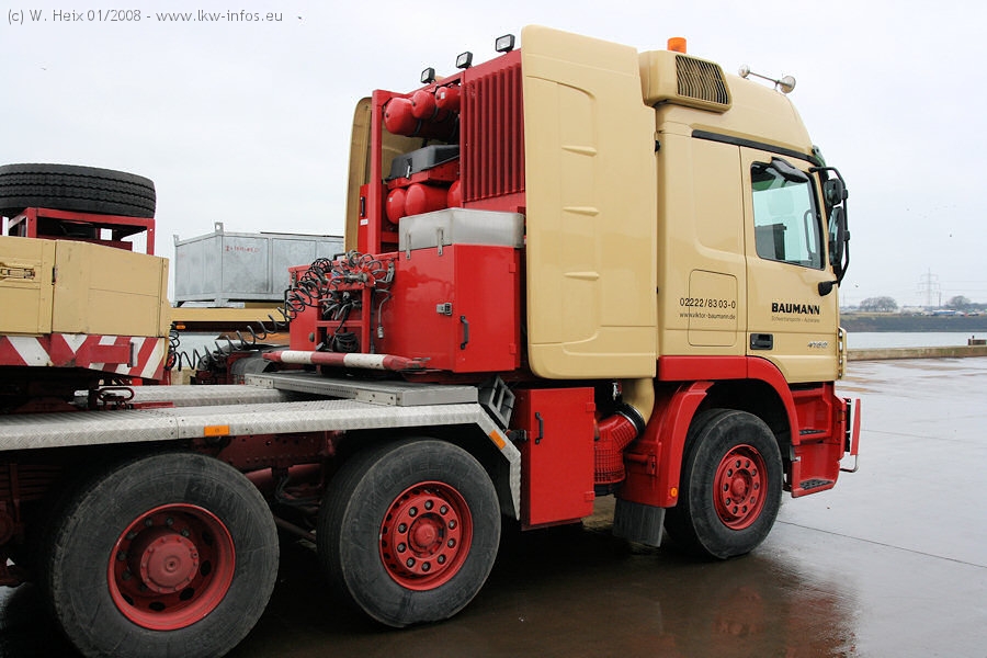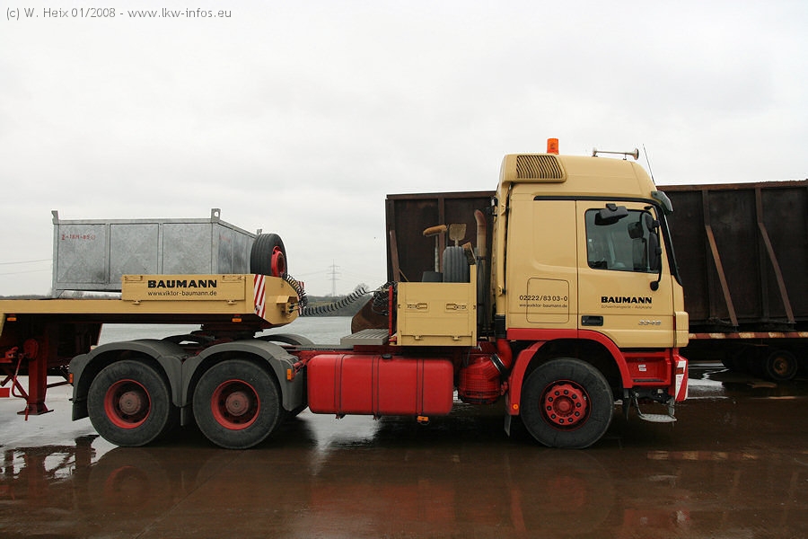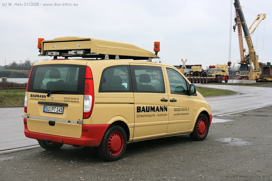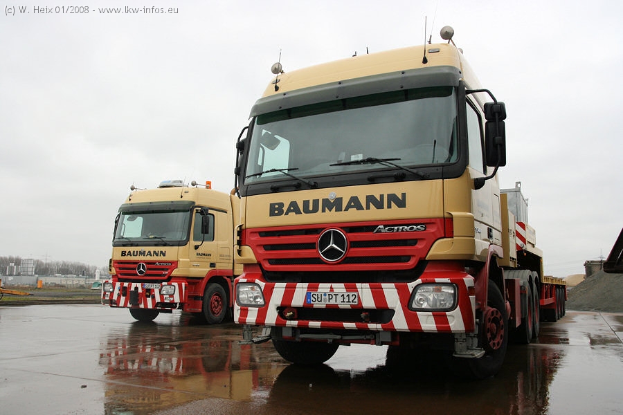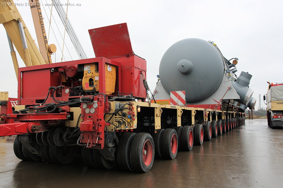 Am 21.01.2008 erreichte das Schiff den Krefelder Hafen. Der Hub vom Schiff auf den Tieflader von Baumann mit 20 Achslinien erfolgte erneute durch den Big Rocky und diesmal mit dem Liebherr LTM 1500 von Baumann. Das Gewicht des Wärmetauschers lag bei ca. 230 Tonnen. Da die Firma Baumann diesmal früher anfing als bei den ersten beiden Hüben mit Franz Bracht, warl ich leider zu spät. Dafür konnte ich aber noch einige weitere Zugmaschinen von Baumann fotografieren.