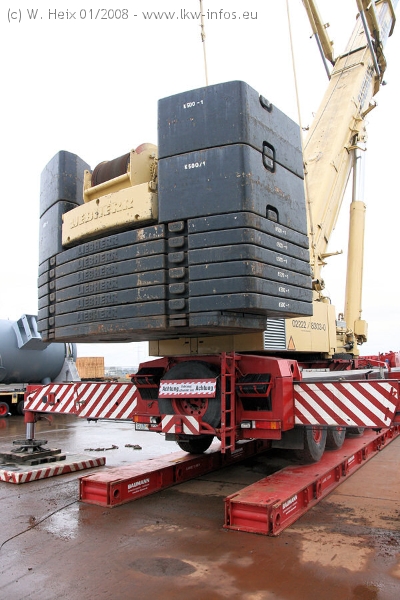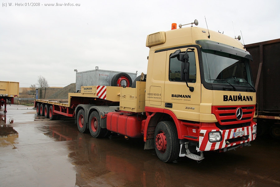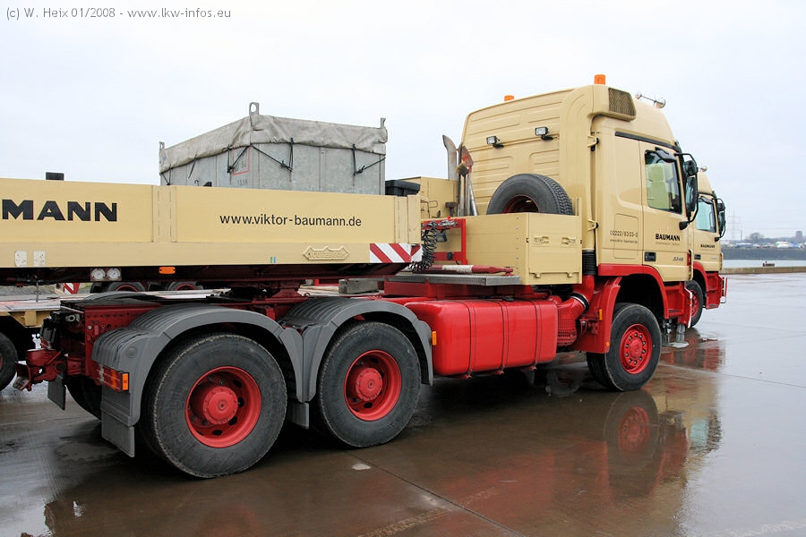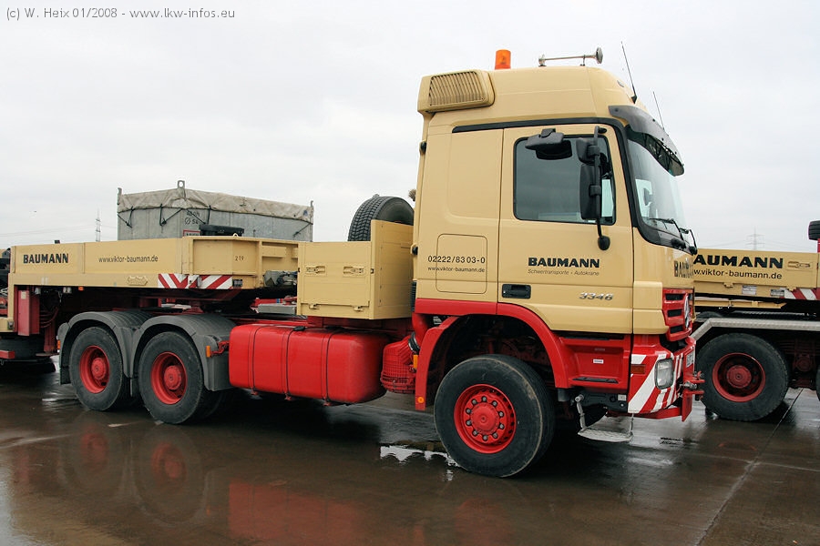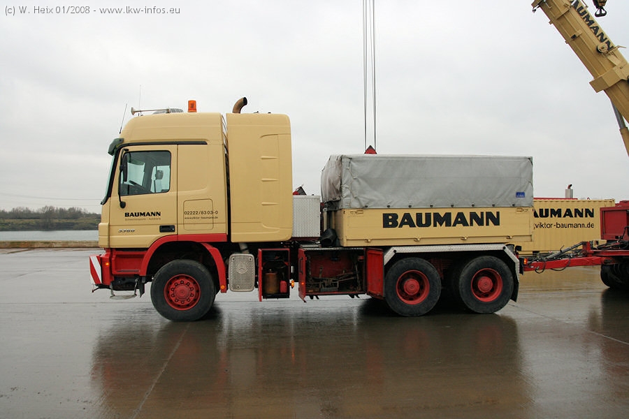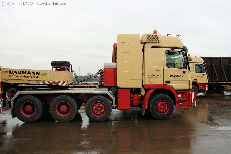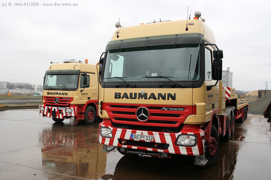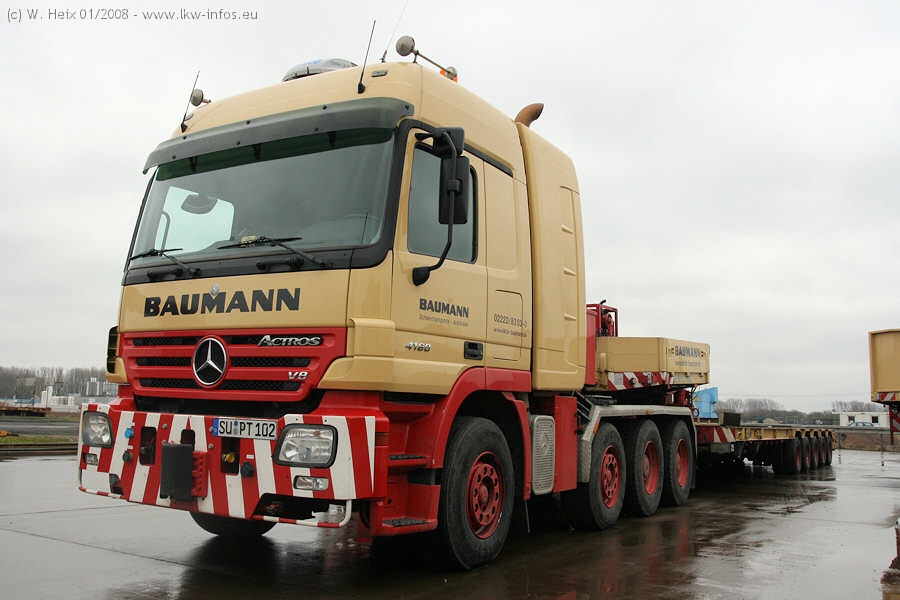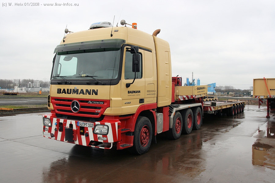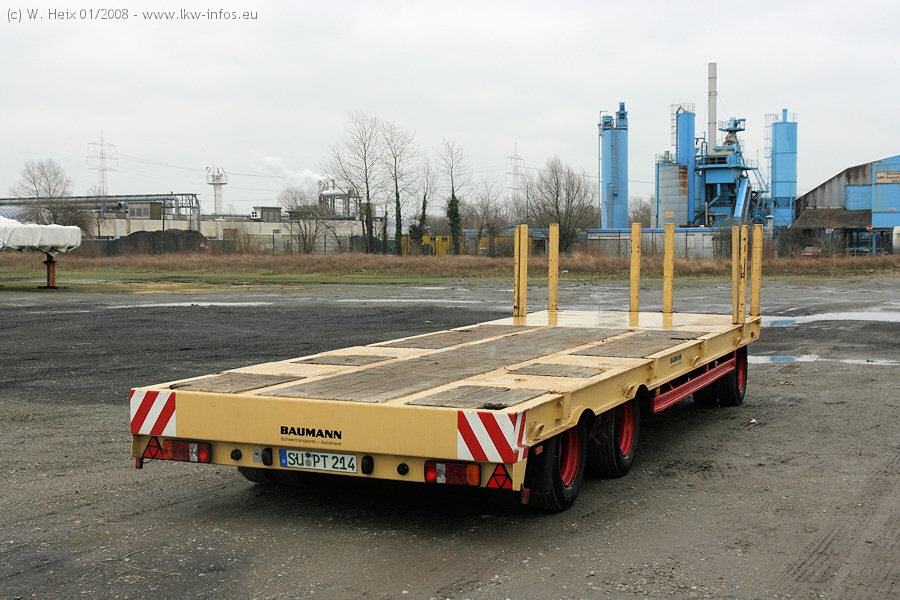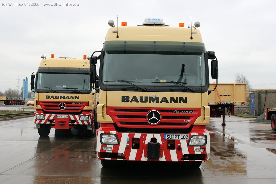 Am 21.01.2008 erreichte das Schiff den Krefelder Hafen. Der Hub vom Schiff auf den Tieflader von Baumann mit 20 Achslinien erfolgte erneute durch den Big Rocky und diesmal mit dem Liebherr LTM 1500 von Baumann. Das Gewicht des Wärmetauschers lag bei ca. 230 Tonnen. Da die Firma Baumann diesmal früher anfing als bei den ersten beiden Hüben mit Franz Bracht, warl ich leider zu spät. Dafür konnte ich aber noch einige weitere Zugmaschinen von Baumann fotografieren.