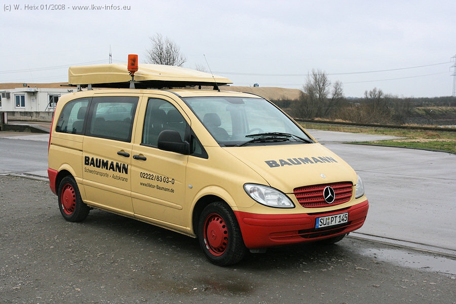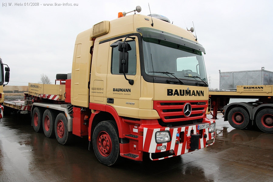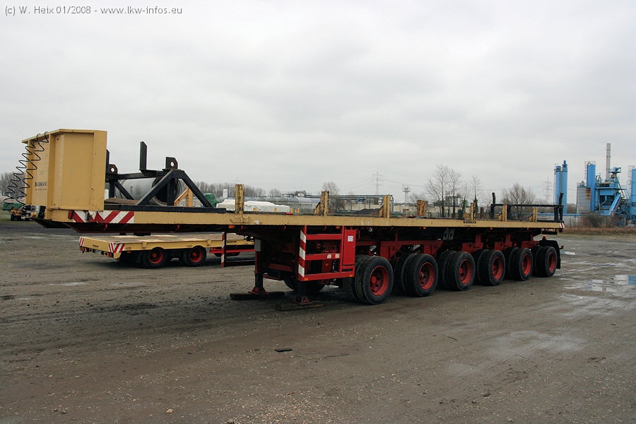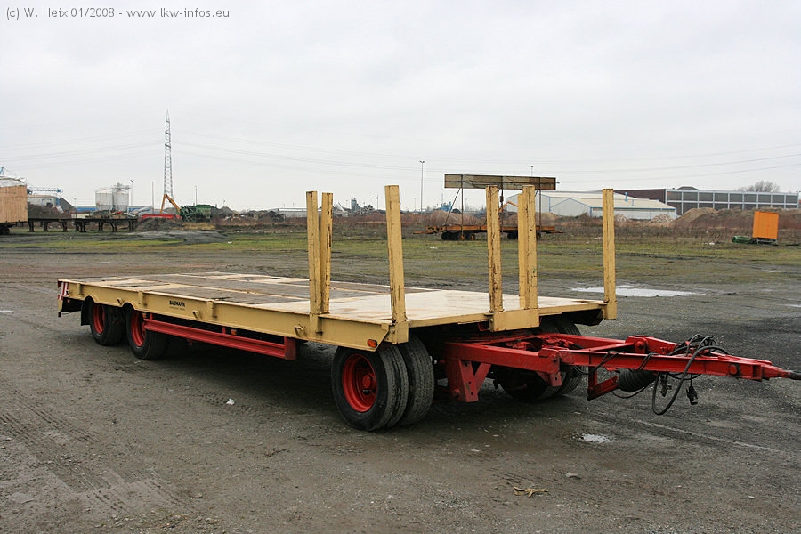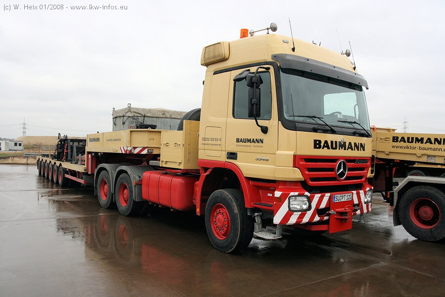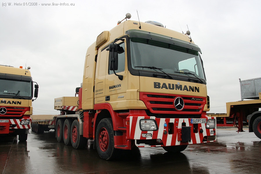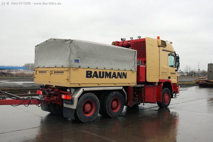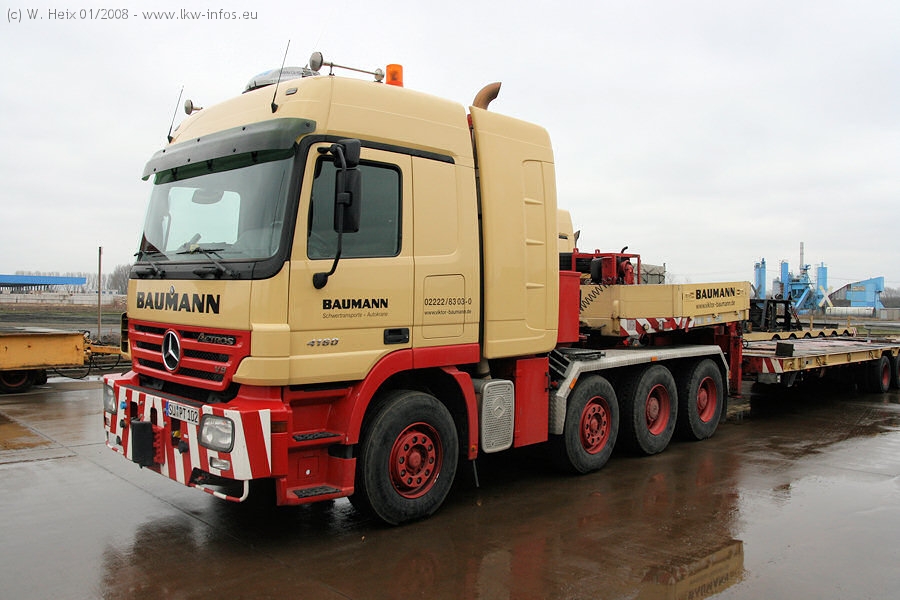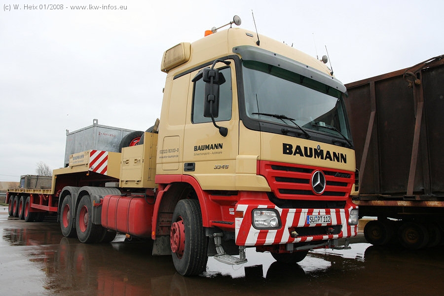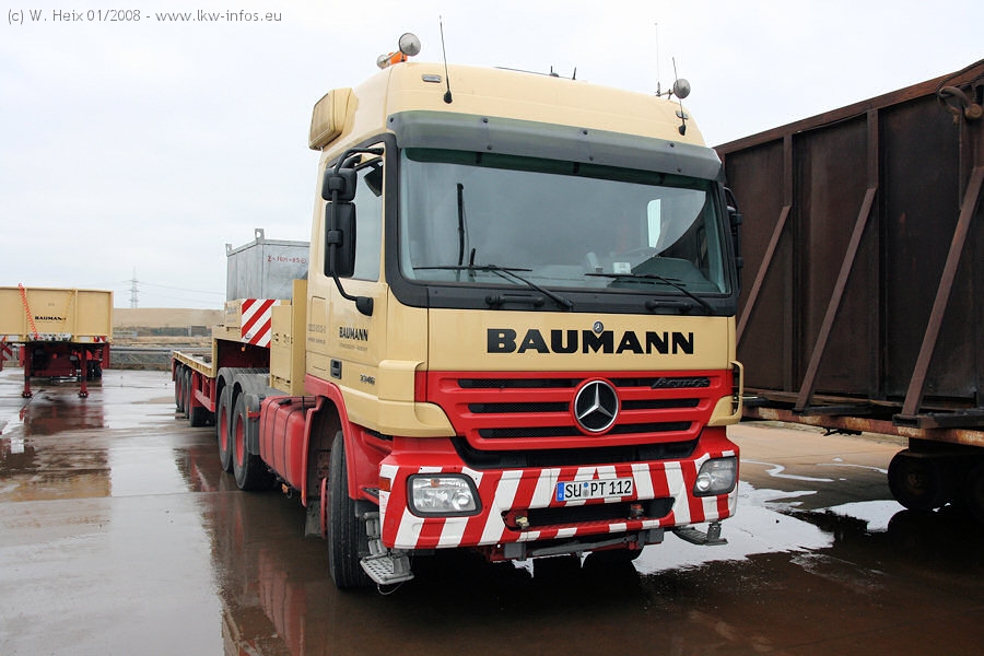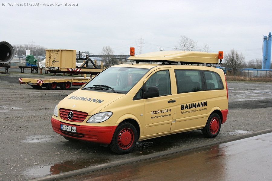 Am 21.01.2008 erreichte das Schiff den Krefelder Hafen. Der Hub vom Schiff auf den Tieflader von Baumann mit 20 Achslinien erfolgte erneute durch den Big Rocky und diesmal mit dem Liebherr LTM 1500 von Baumann. Das Gewicht des Wärmetauschers lag bei ca. 230 Tonnen. Da die Firma Baumann diesmal früher anfing als bei den ersten beiden Hüben mit Franz Bracht, warl ich leider zu spät. Dafür konnte ich aber noch einige weitere Zugmaschinen von Baumann fotografieren.