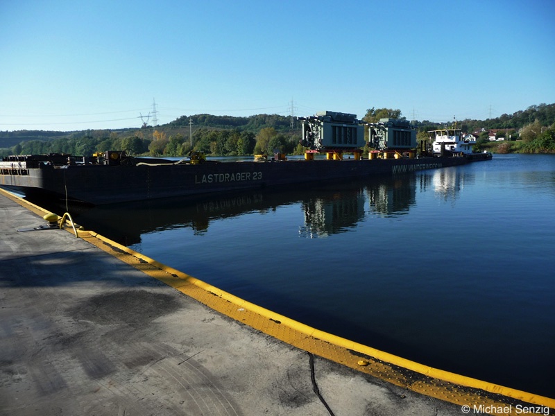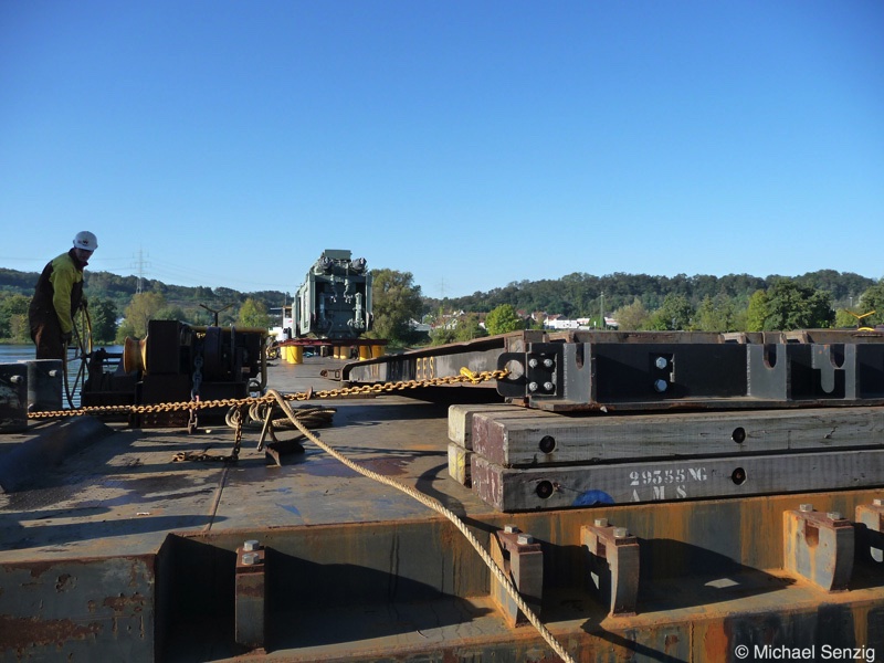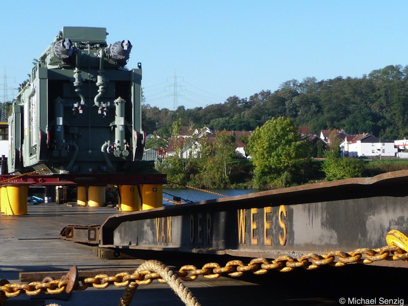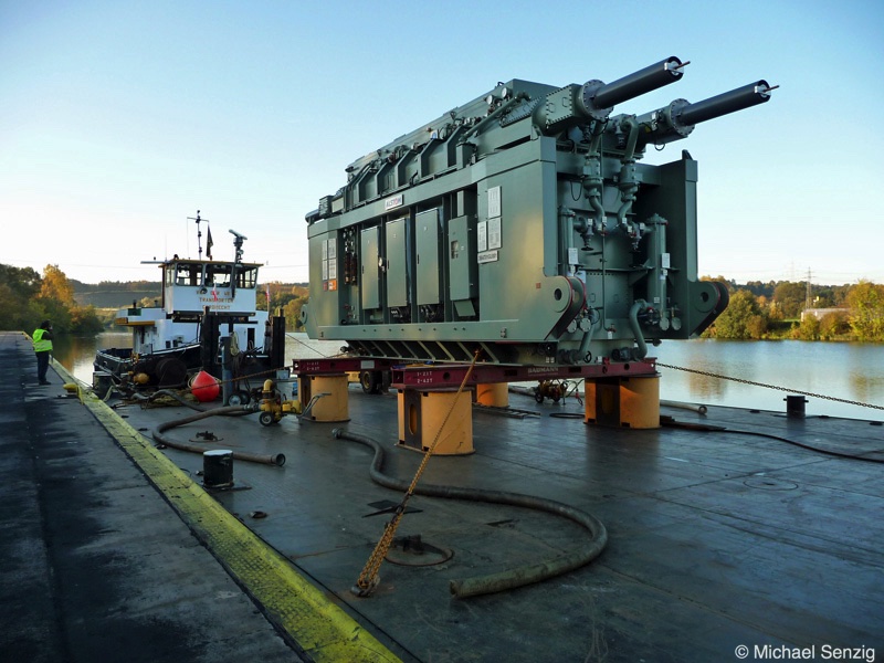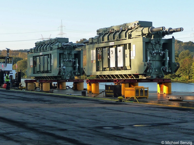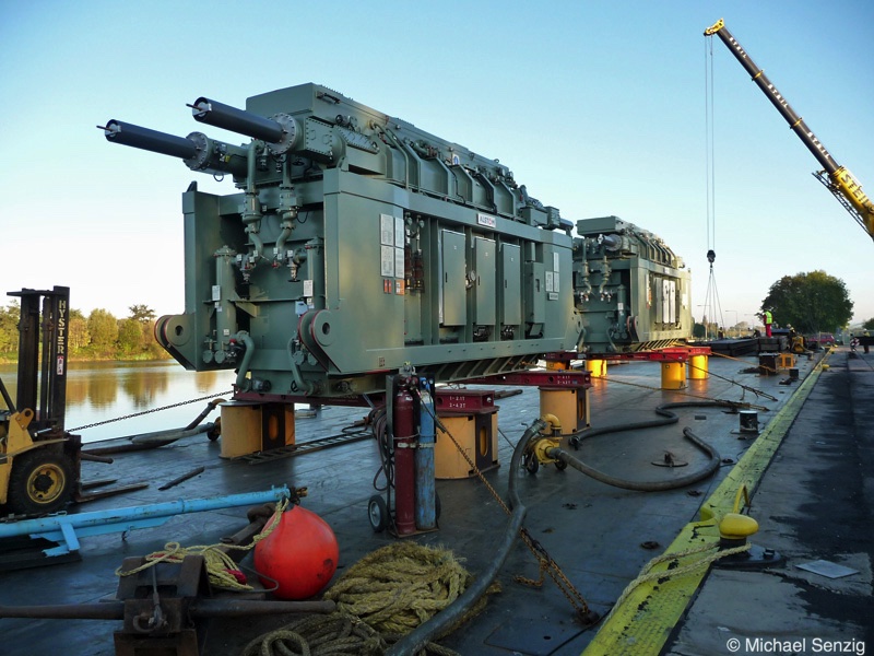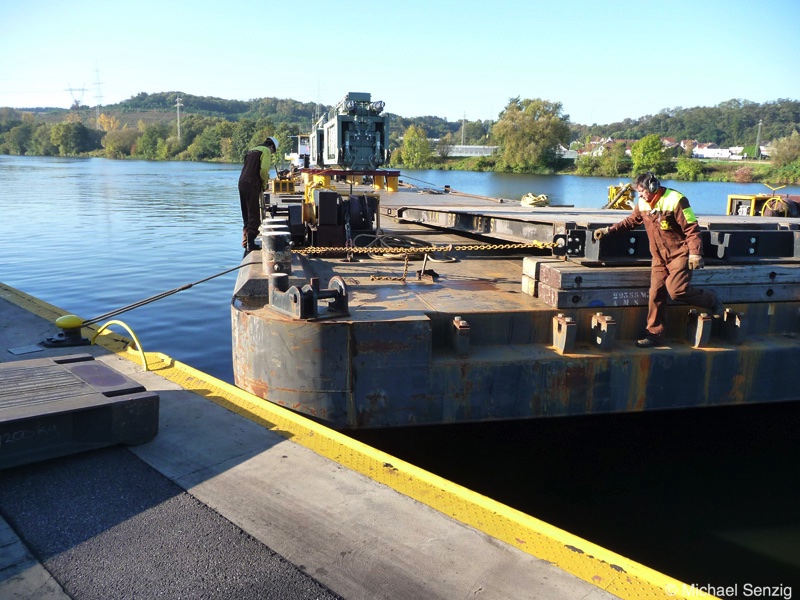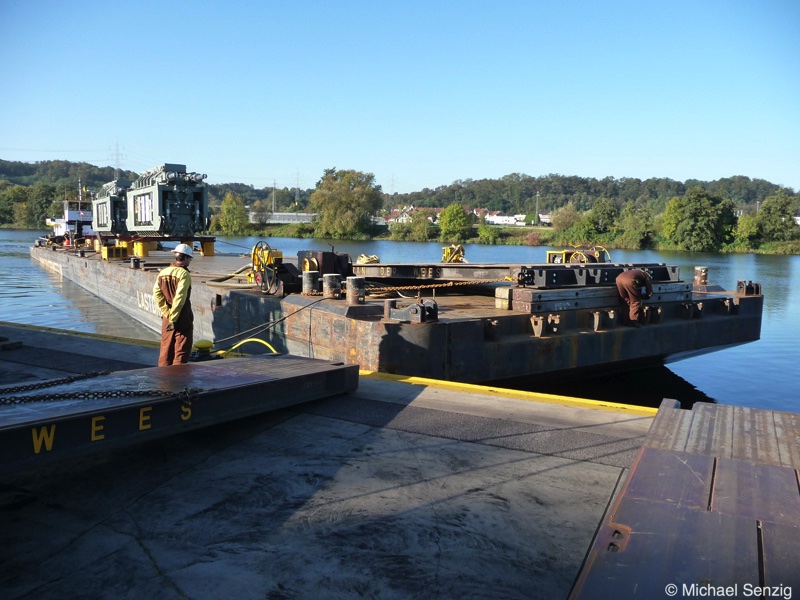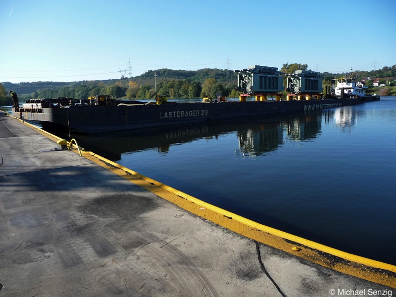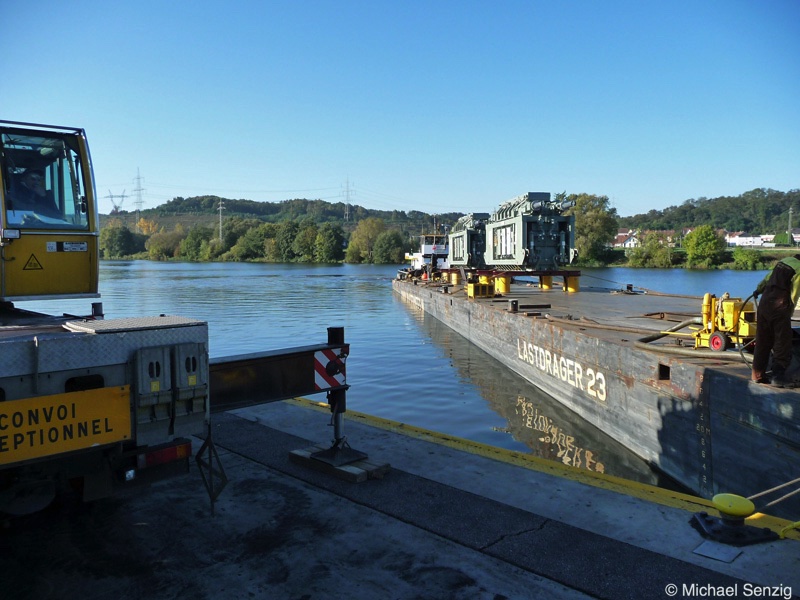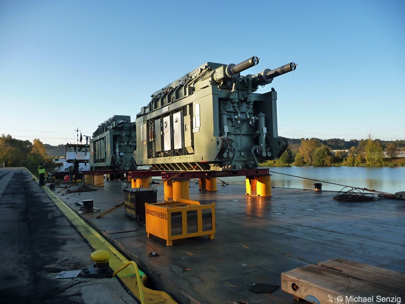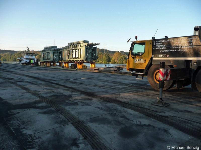 Am 15.10.2010 wurden im Saarland auf dem Gelände der Firma VSE zwei Trafos per Ponton-Schifff "angeliefert". Auf dem Ponton der Firma van der Wees aus dem niederländischen Dordrecht standen beide Trafos auf "Elefantenfüßen". Deswegen war für die Verladung kein Kran nötig. Es konnte einfach unter die Ladung gefahren werden. Michael Senzig hat einen Teil der Aktion beobachtet und fotografiert.