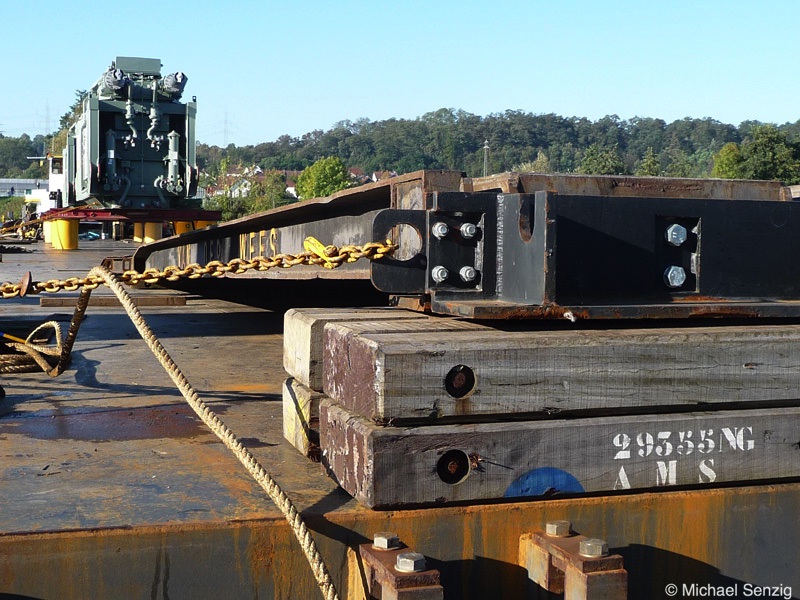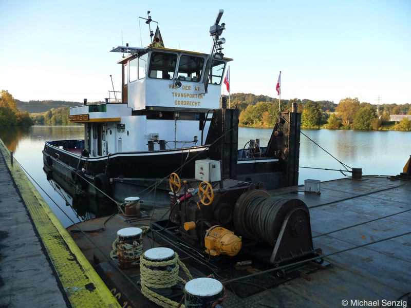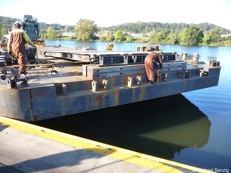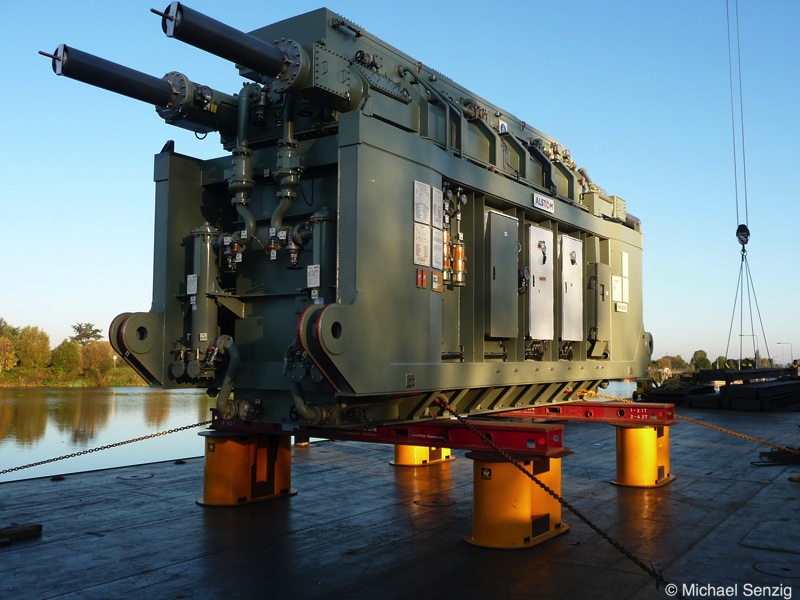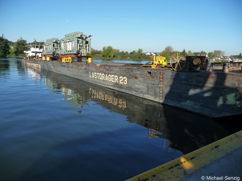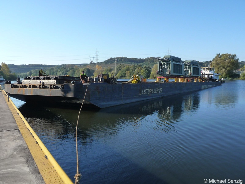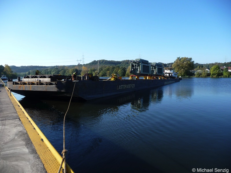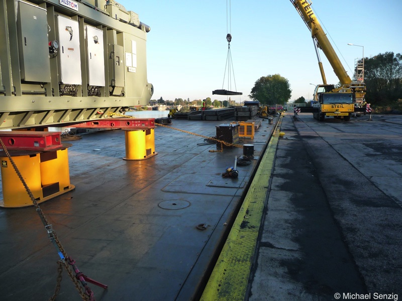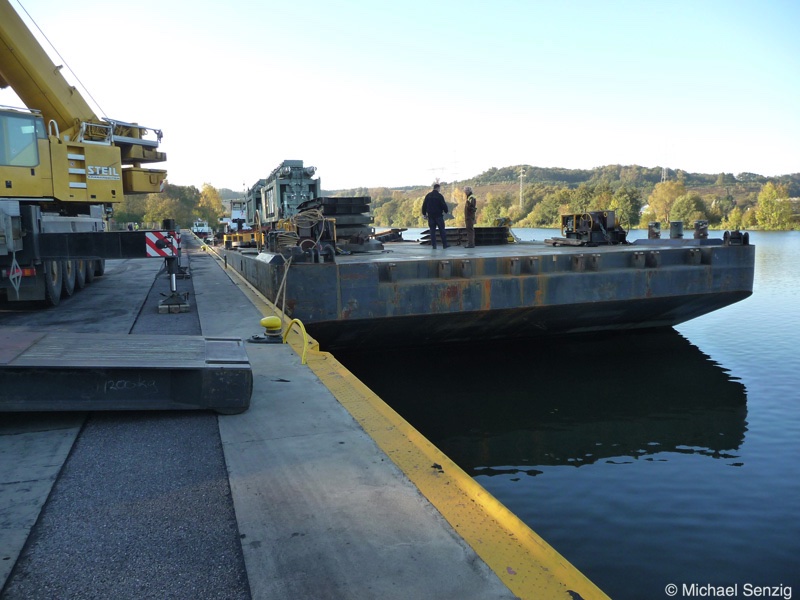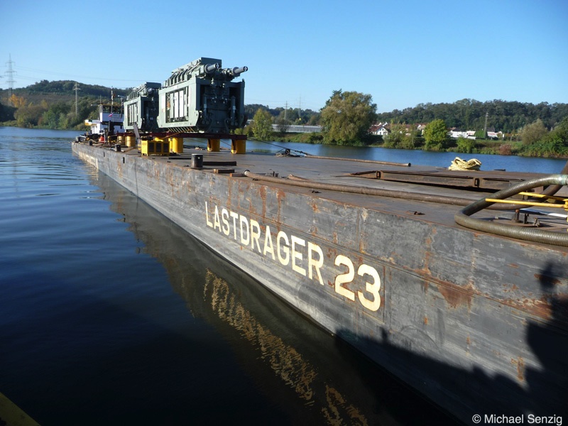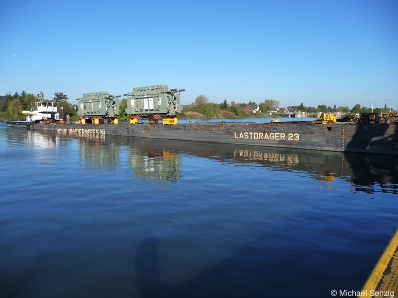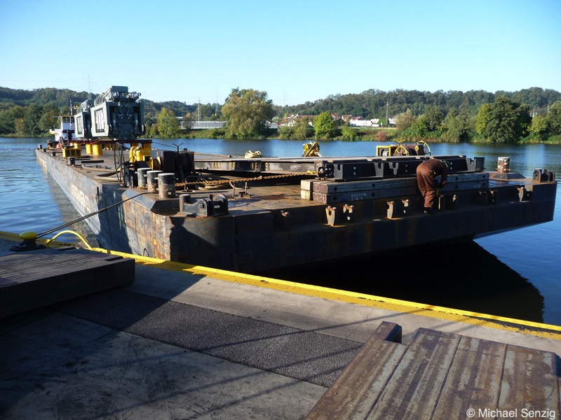 Am 15.10.2010 wurden im Saarland auf dem Gelände der Firma VSE zwei Trafos per Ponton-Schifff "angeliefert". Auf dem Ponton der Firma van der Wees aus dem niederländischen Dordrecht standen beide Trafos auf "Elefantenfüßen". Deswegen war für die Verladung kein Kran nötig. Es konnte einfach unter die Ladung gefahren werden. Michael Senzig hat einen Teil der Aktion beobachtet und fotografiert.