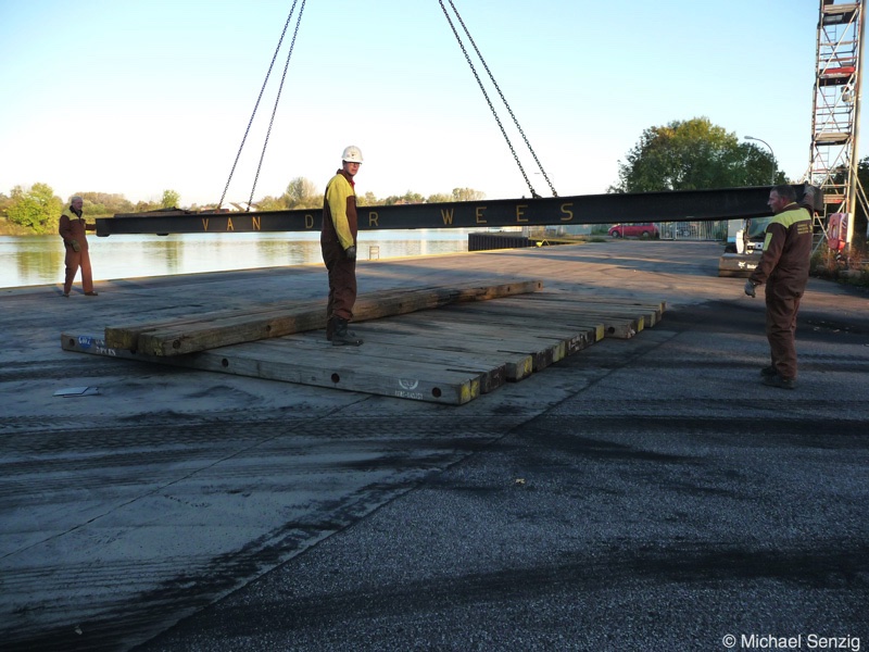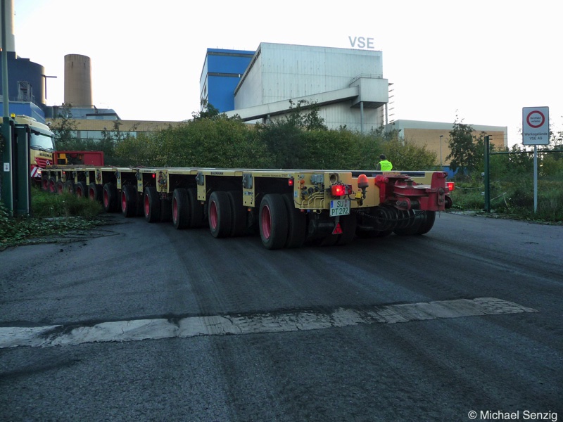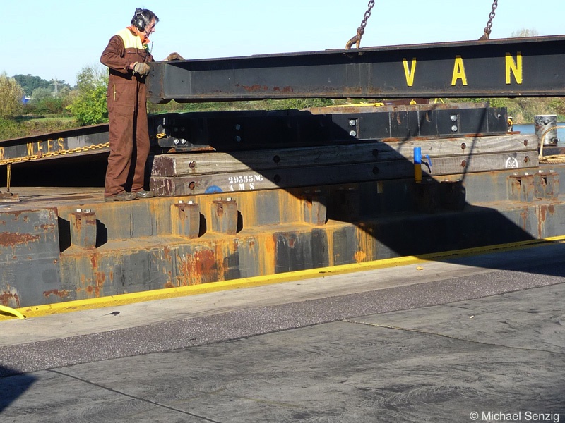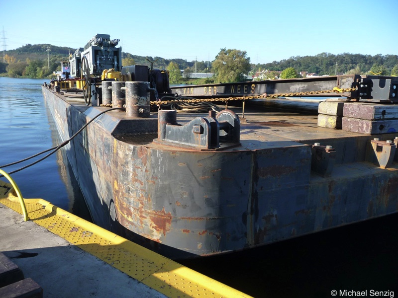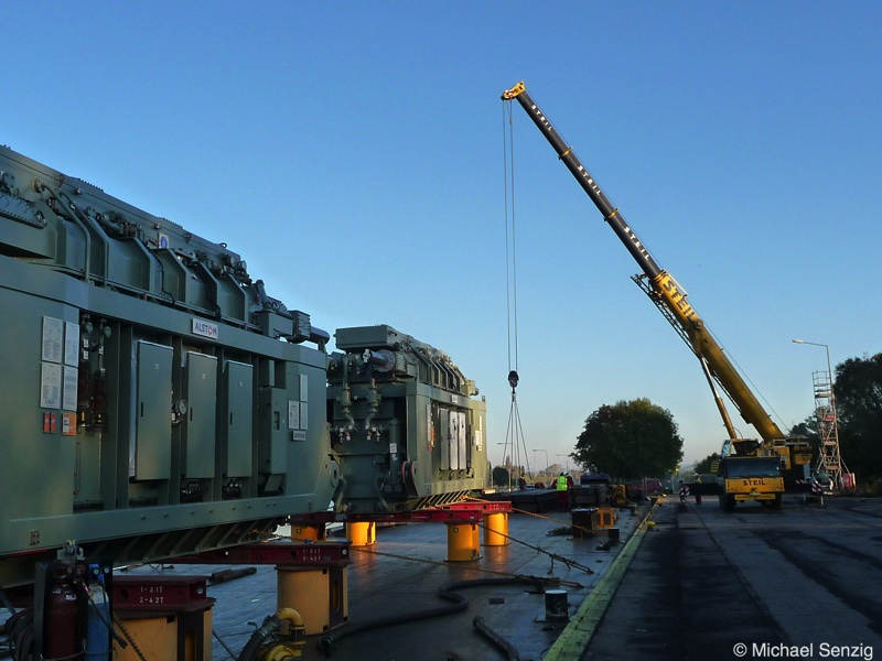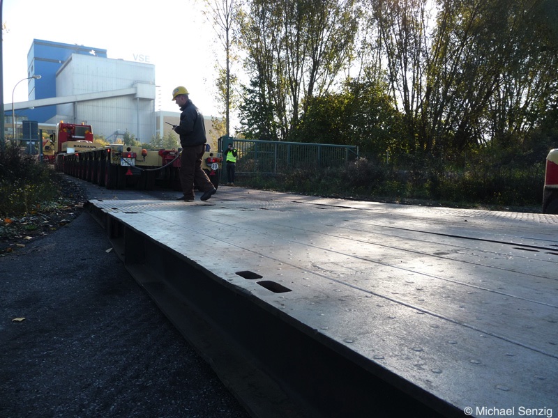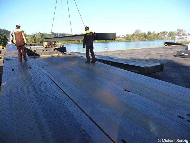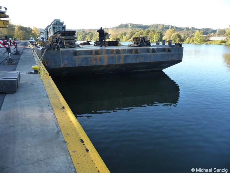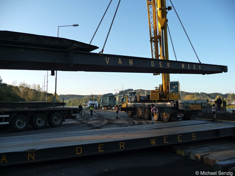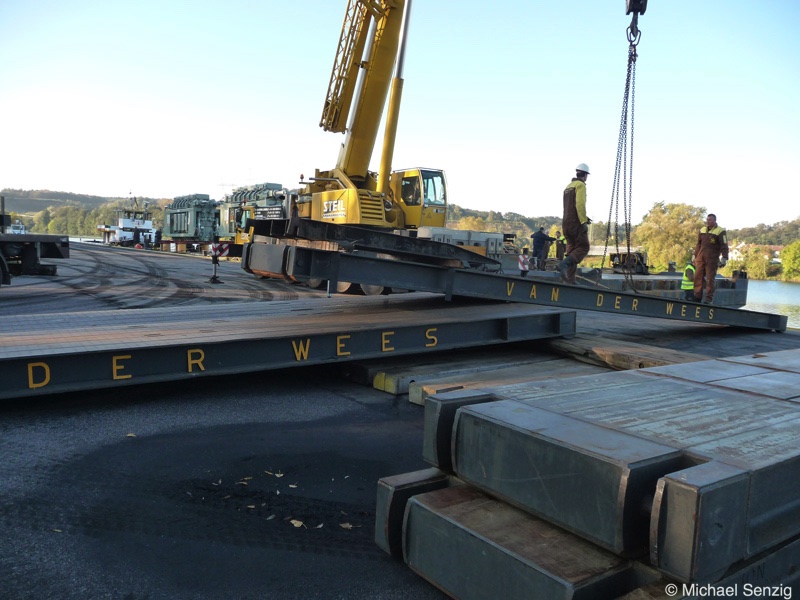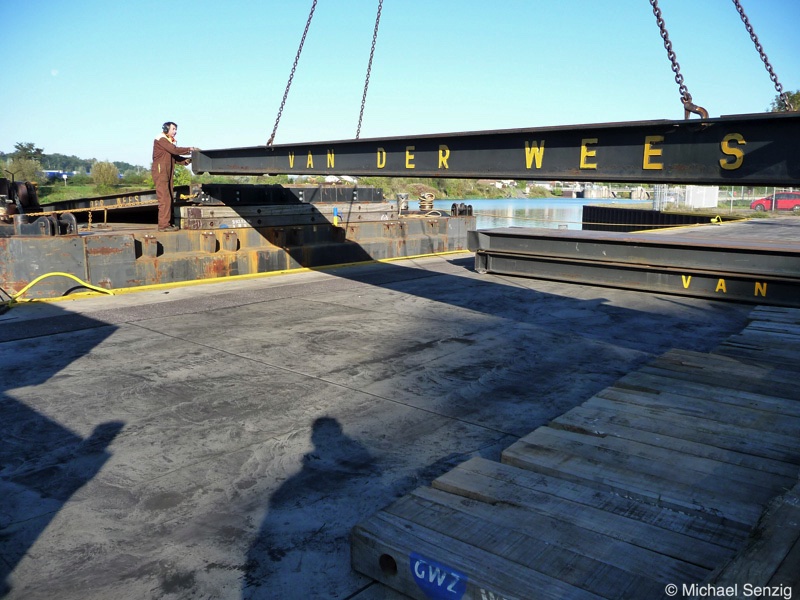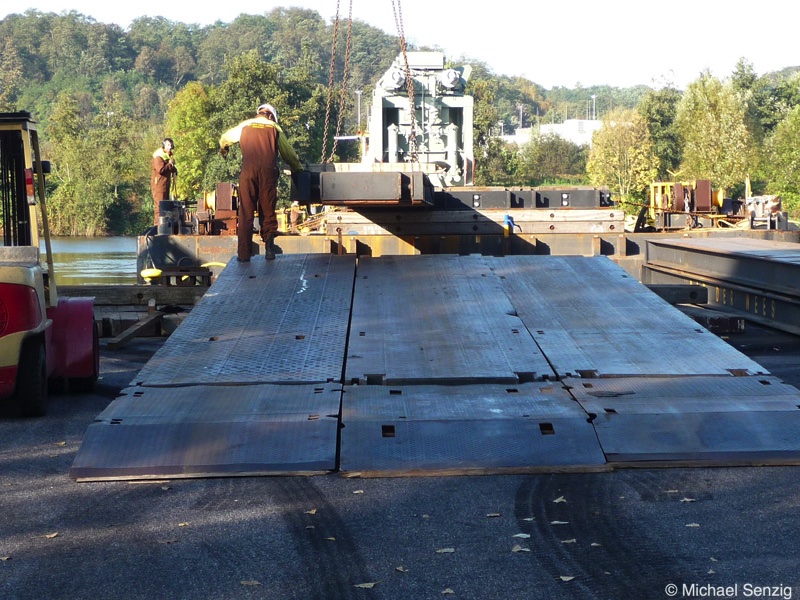 Am 15.10.2010 wurden im Saarland auf dem Gelände der Firma VSE zwei Trafos per Ponton-Schifff "angeliefert". Auf dem Ponton der Firma van der Wees aus dem niederländischen Dordrecht standen beide Trafos auf "Elefantenfüßen". Deswegen war für die Verladung kein Kran nötig. Es konnte einfach unter die Ladung gefahren werden. Michael Senzig hat einen Teil der Aktion beobachtet und fotografiert.