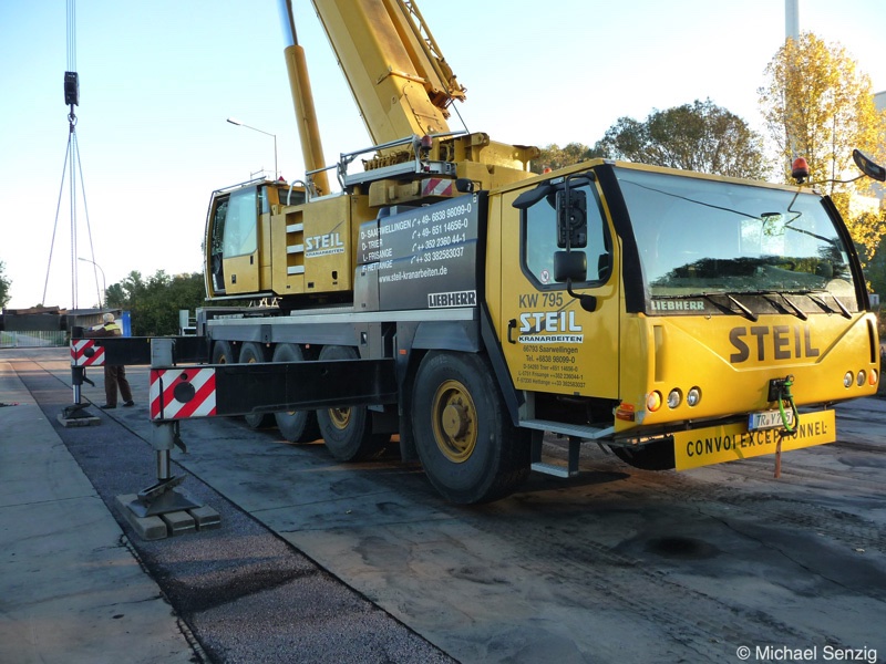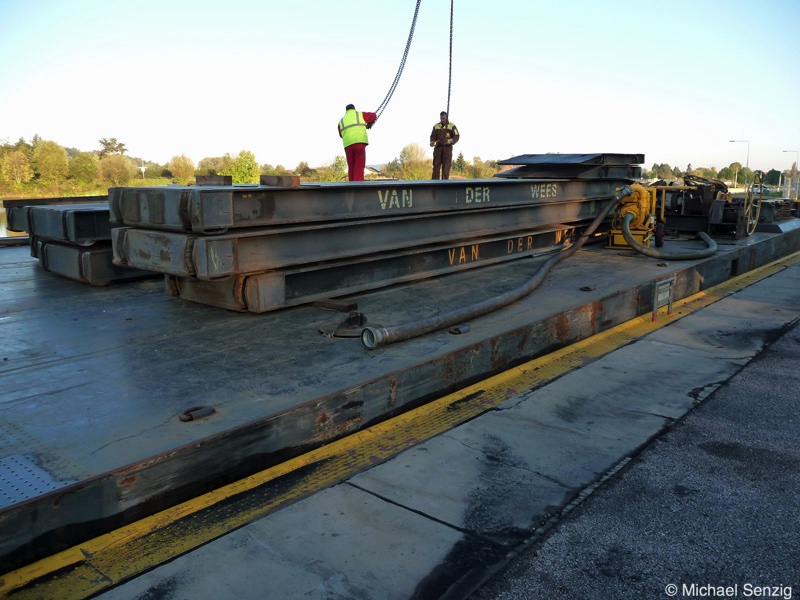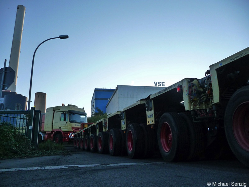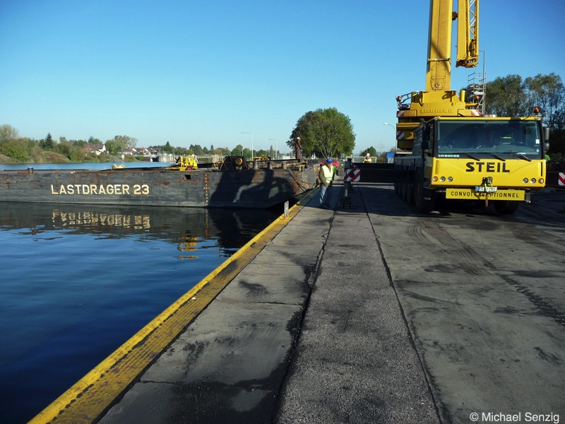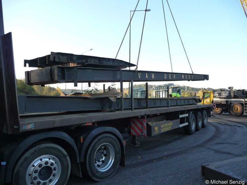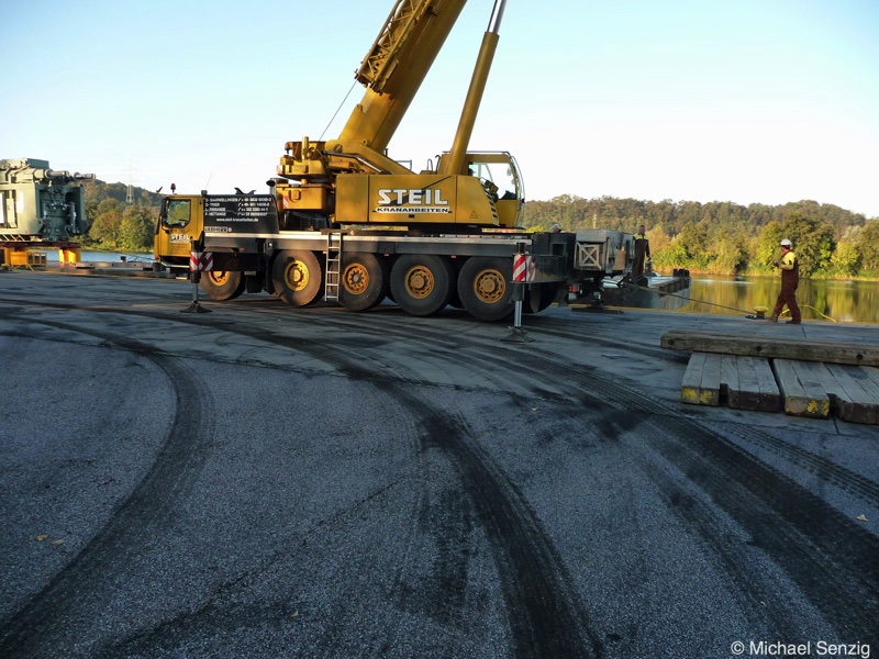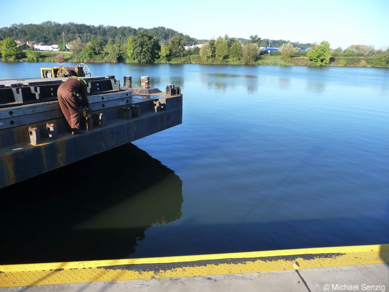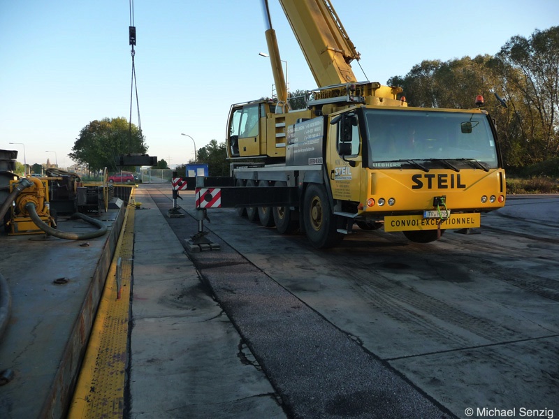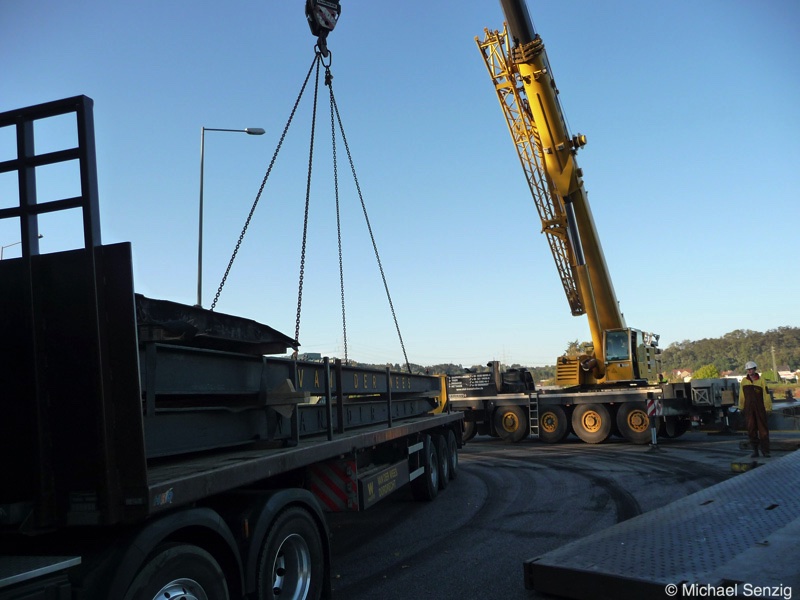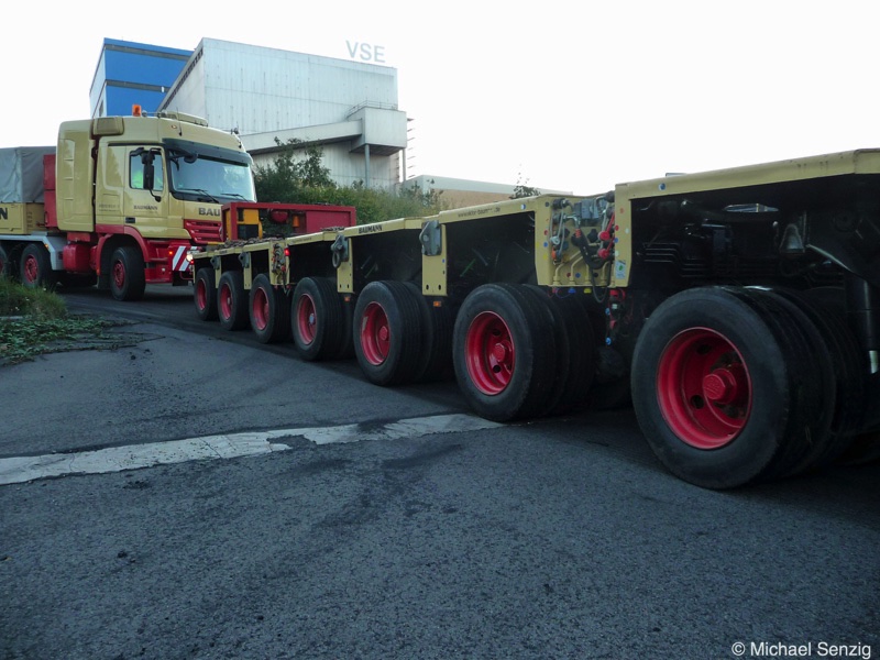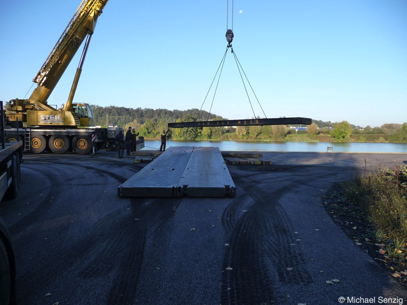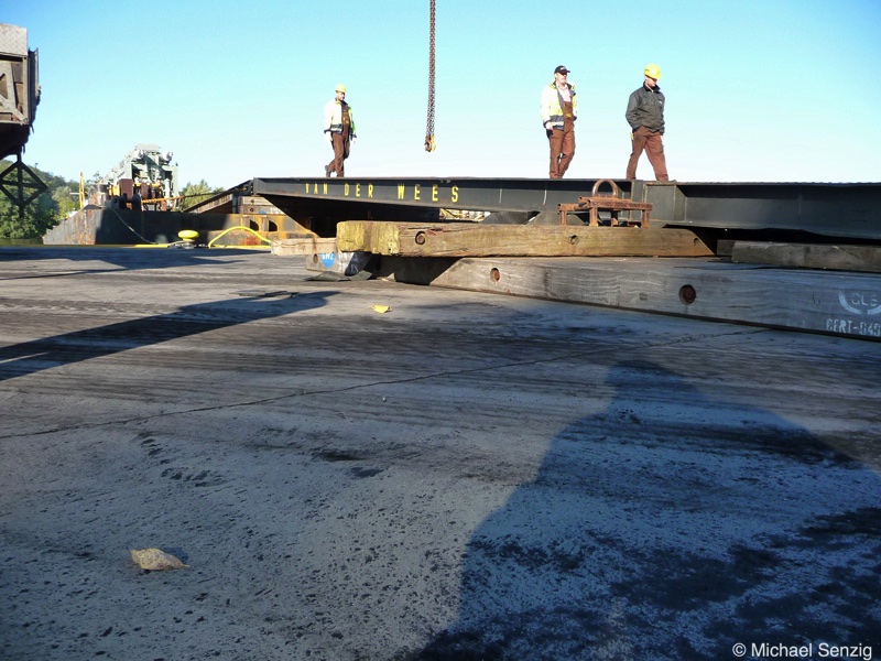 Am 15.10.2010 wurden im Saarland auf dem Gelände der Firma VSE zwei Trafos per Ponton-Schifff "angeliefert". Auf dem Ponton der Firma van der Wees aus dem niederländischen Dordrecht standen beide Trafos auf "Elefantenfüßen". Deswegen war für die Verladung kein Kran nötig. Es konnte einfach unter die Ladung gefahren werden. Michael Senzig hat einen Teil der Aktion beobachtet und fotografiert.