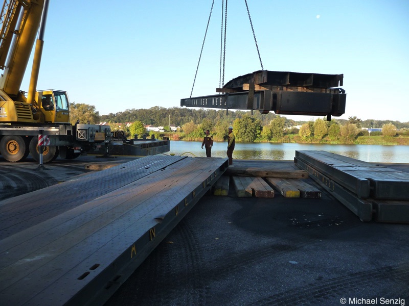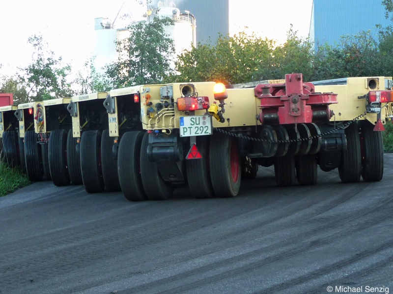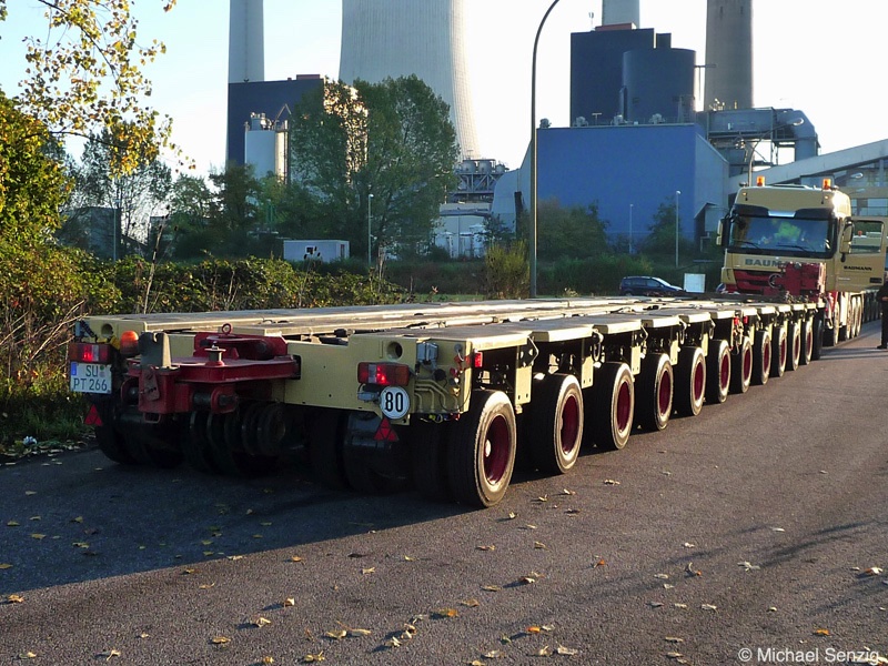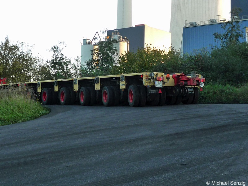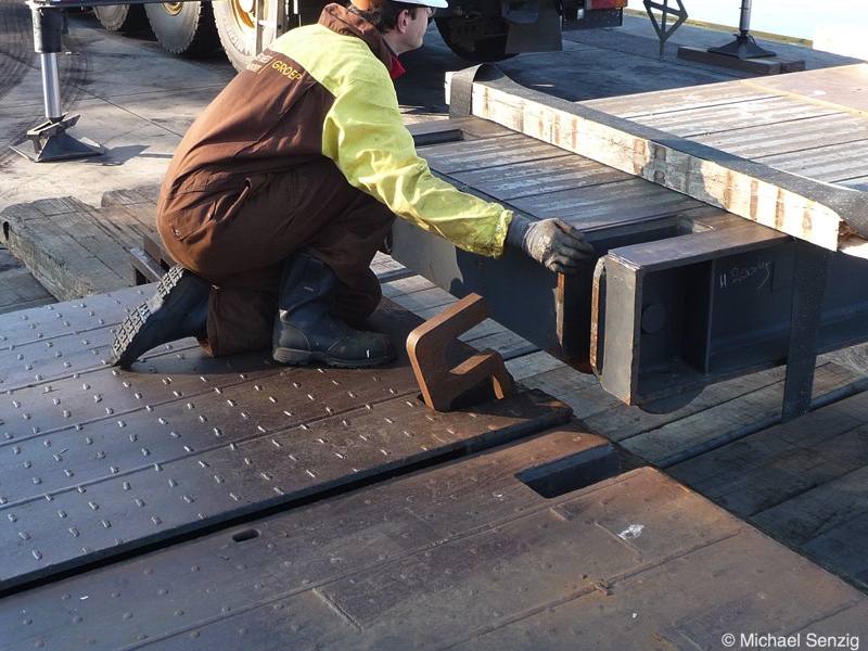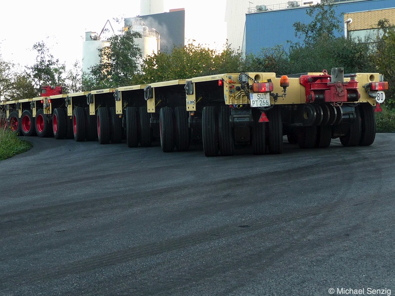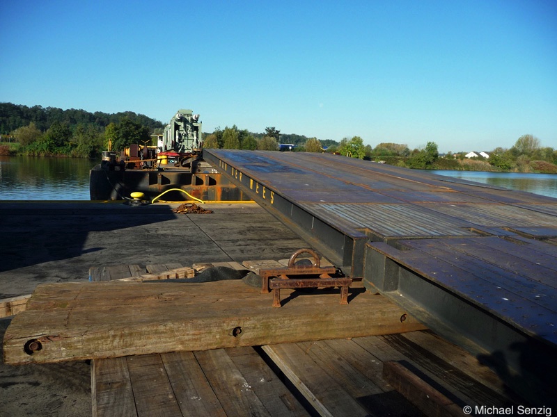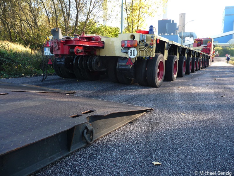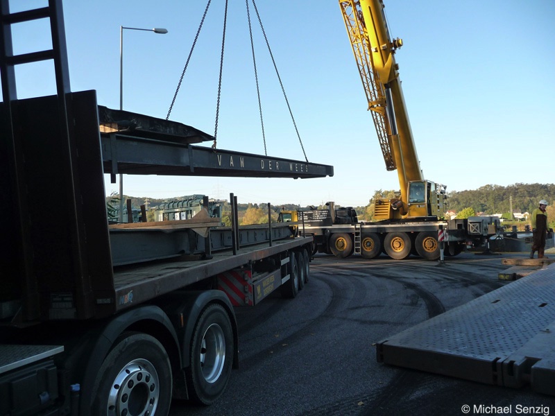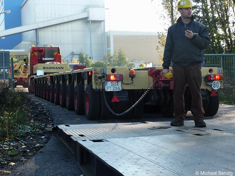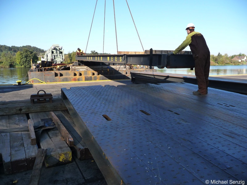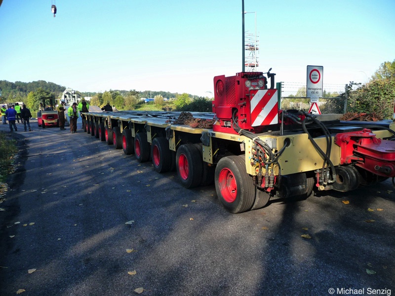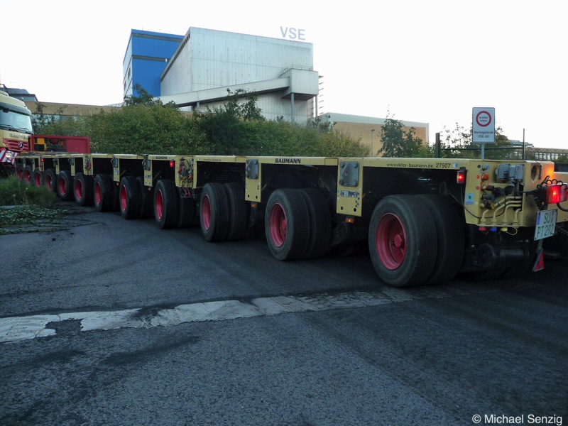 Am 15.10.2010 wurden im Saarland auf dem Gelände der Firma VSE zwei Trafos per Ponton-Schifff "angeliefert". Auf dem Ponton der Firma van der Wees aus dem niederländischen Dordrecht standen beide Trafos auf "Elefantenfüßen". Deswegen war für die Verladung kein Kran nötig. Es konnte einfach unter die Ladung gefahren werden. Michael Senzig hat einen Teil der Aktion beobachtet und fotografiert.