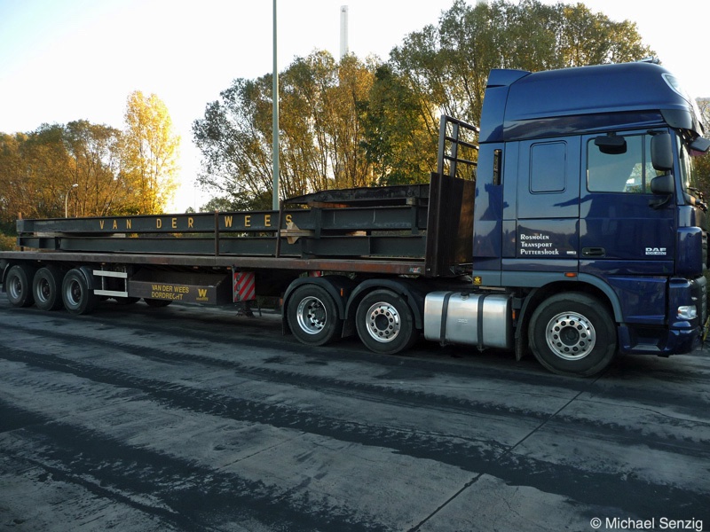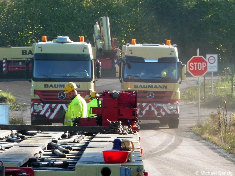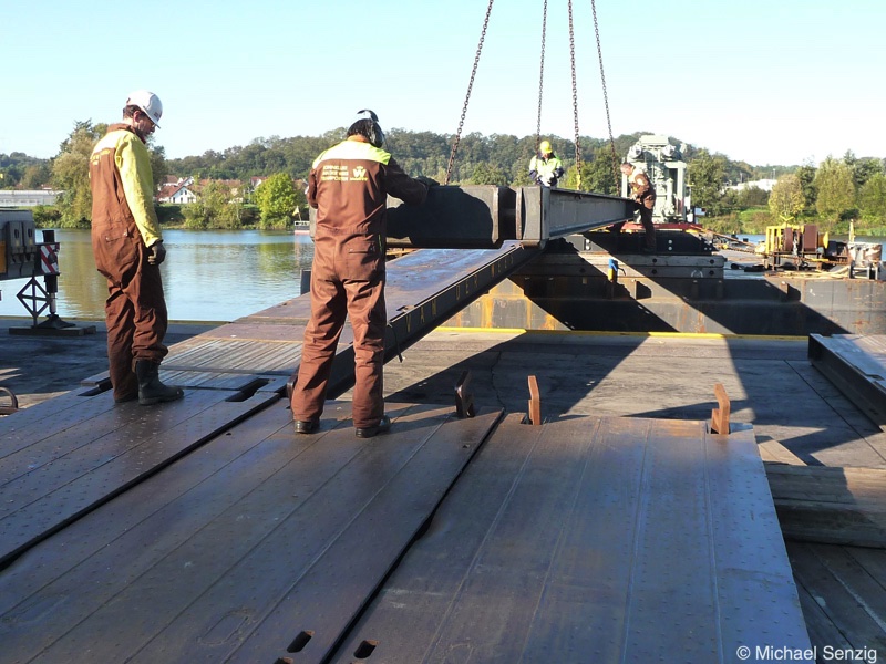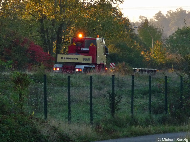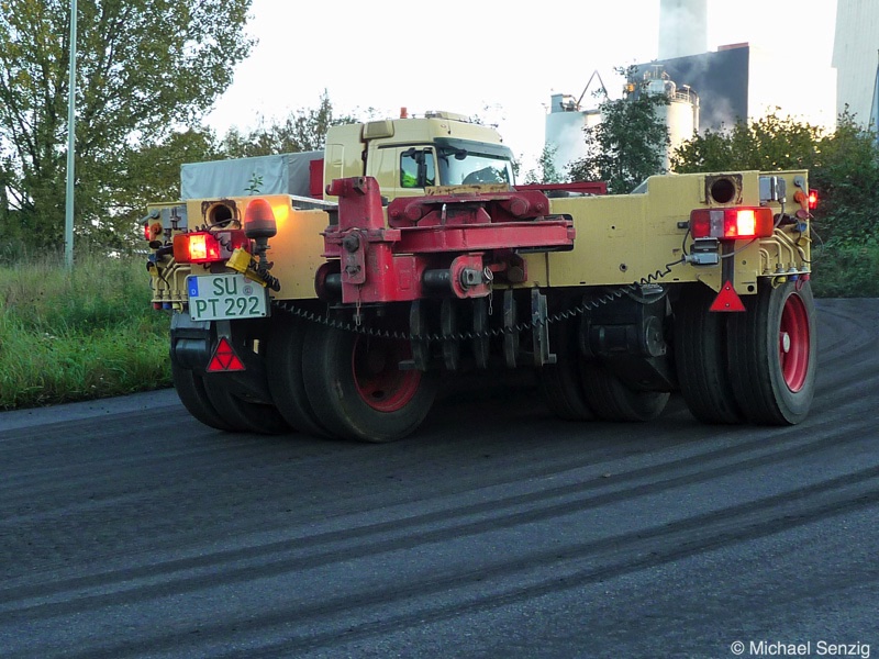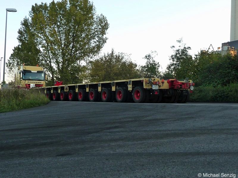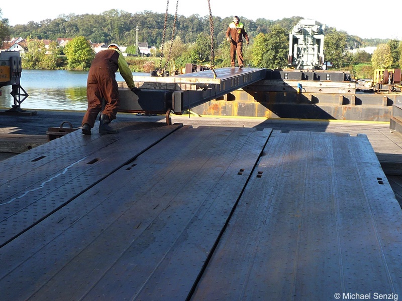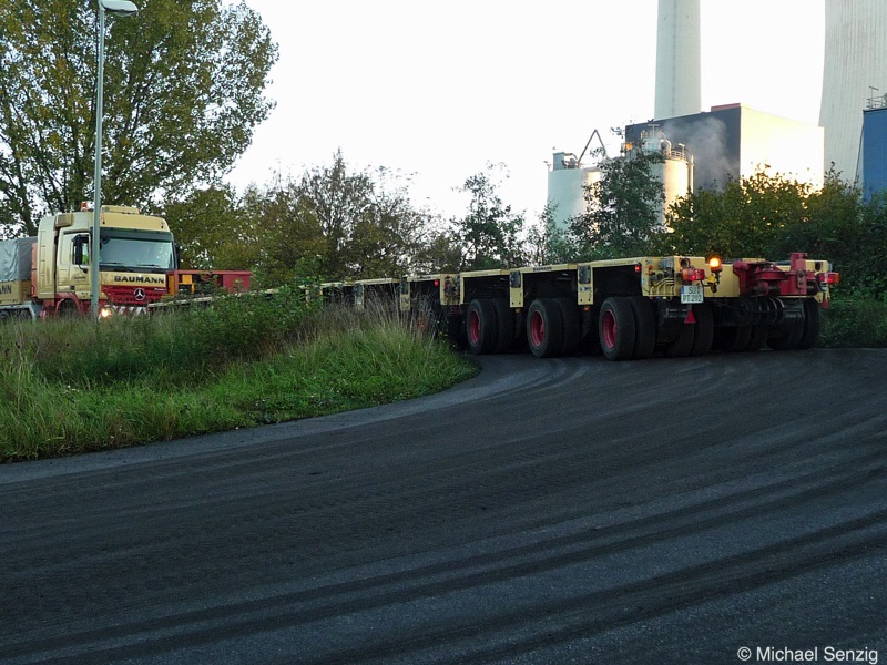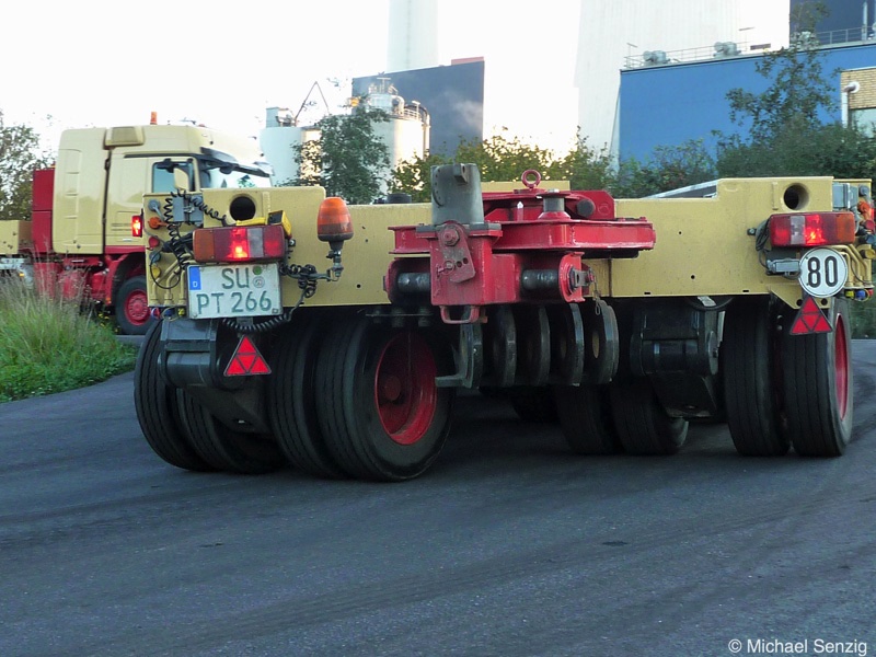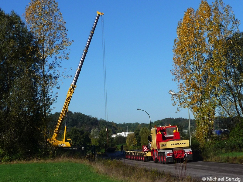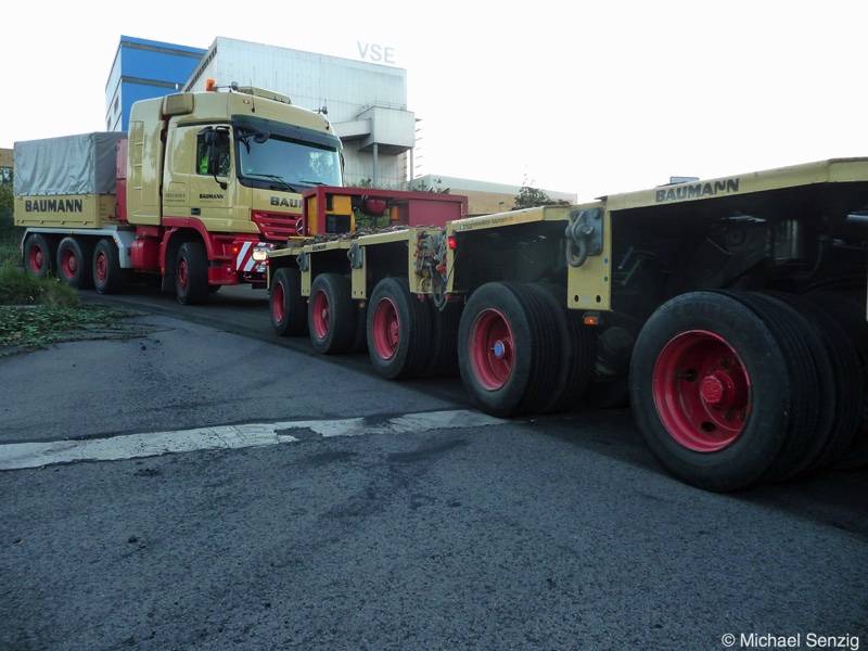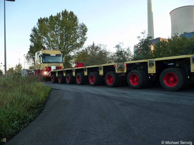 Am 15.10.2010 wurden im Saarland auf dem Gelände der Firma VSE zwei Trafos per Ponton-Schifff "angeliefert". Auf dem Ponton der Firma van der Wees aus dem niederländischen Dordrecht standen beide Trafos auf "Elefantenfüßen". Deswegen war für die Verladung kein Kran nötig. Es konnte einfach unter die Ladung gefahren werden. Michael Senzig hat einen Teil der Aktion beobachtet und fotografiert.