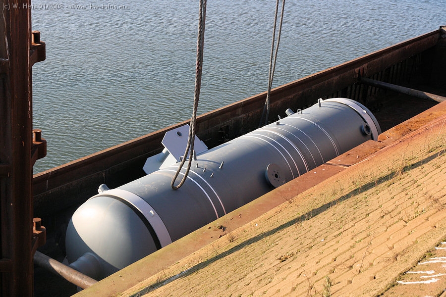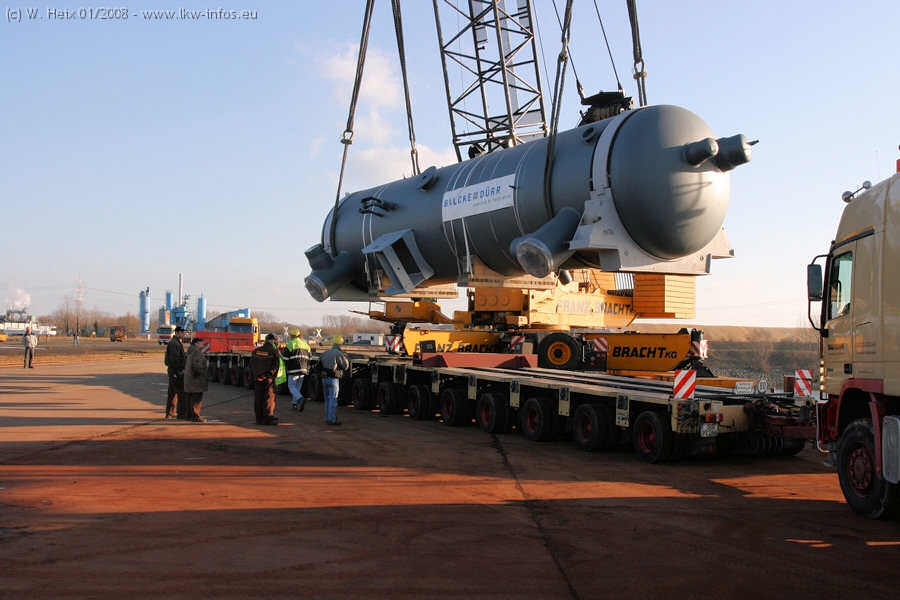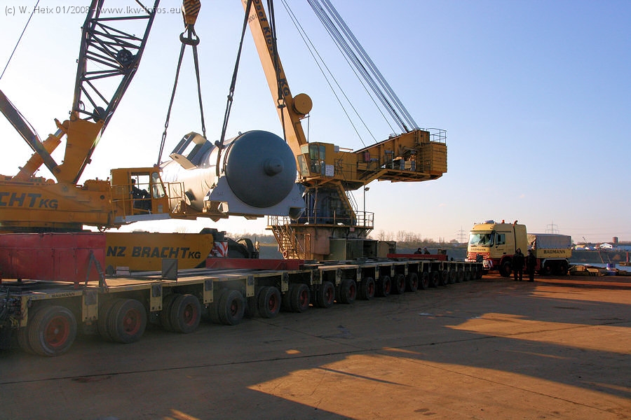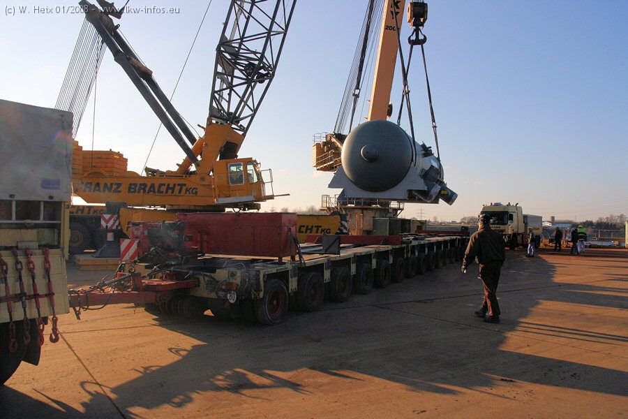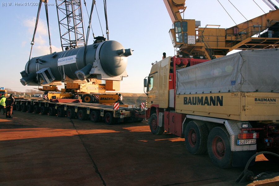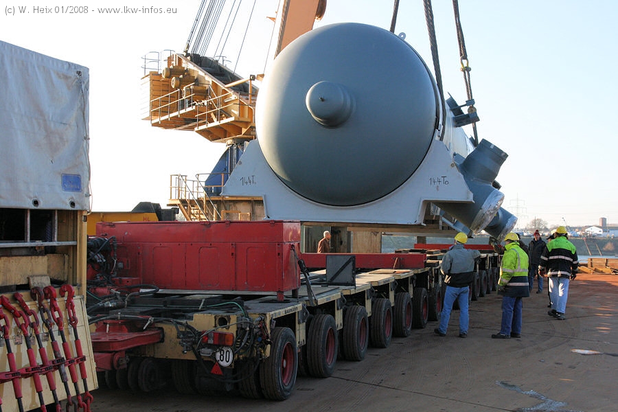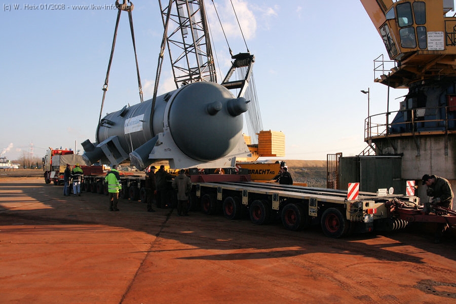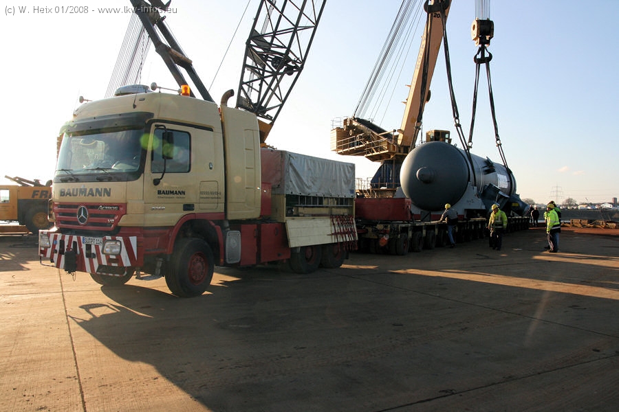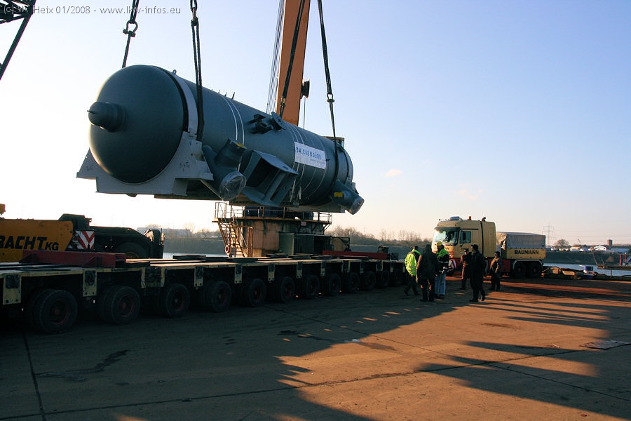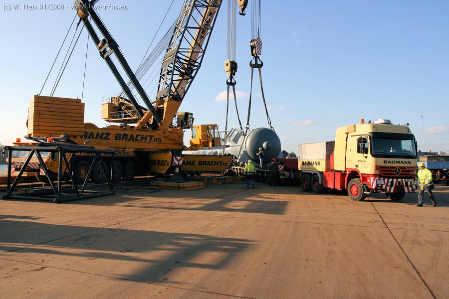 Am 02.01.2008 erreichte das Binnenschiff den Krefelder Hafen. Der Hub vom Schiff auf den Tieflader von Baumann erfolgte erneut durch den Big Rocky und den schon bekannten Gottwald AK 450-83 von Franz Bracht.. Der Hilfskran der Krefelder Bracht-Niederlassung war wieder identisch. Baumann war mit zwei Mercedes-Benz Actros 3360 SLT 6x6 und 20 Achslinien vor Ort. Die Fahrzeuge mussten vor dem Hub mehrfach umgesetzt werden, was man beim Betrachten der Bilder sieht. Auch das Schiff musste einmal drehen im Hafenbecken. Der anschließende Hub des 297 t schweren Vorwärmers verlief reibungslos. Am Abend gegen 22:00 Uhr startete Schwertransport Richtung Neurath. Die Bilder in den Teilen 1-3 zeigen alle Fahrzeuge aus verschiedenen Perspektiven, beladen und unbeladen sowie den Hub vom Schiff auf die Transporter.