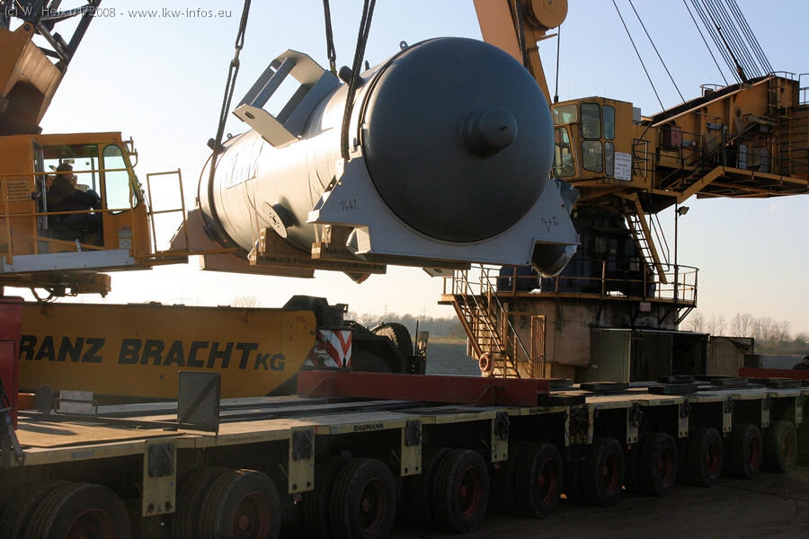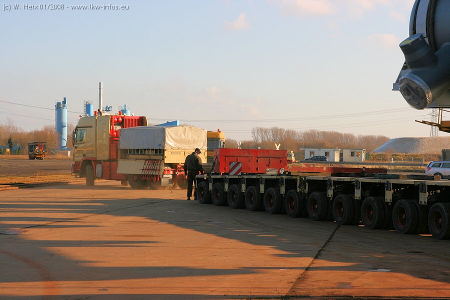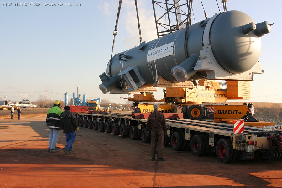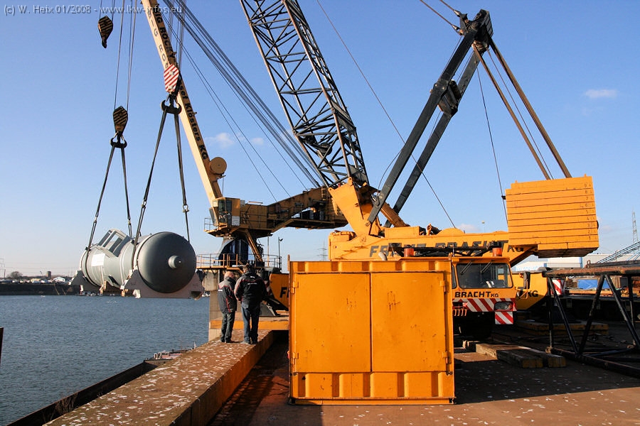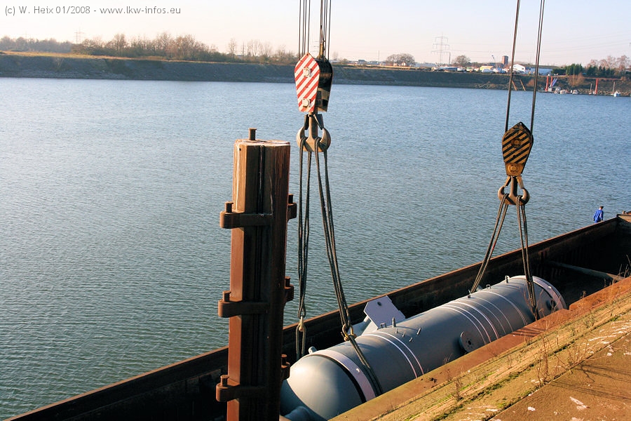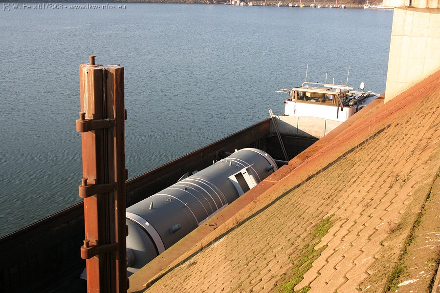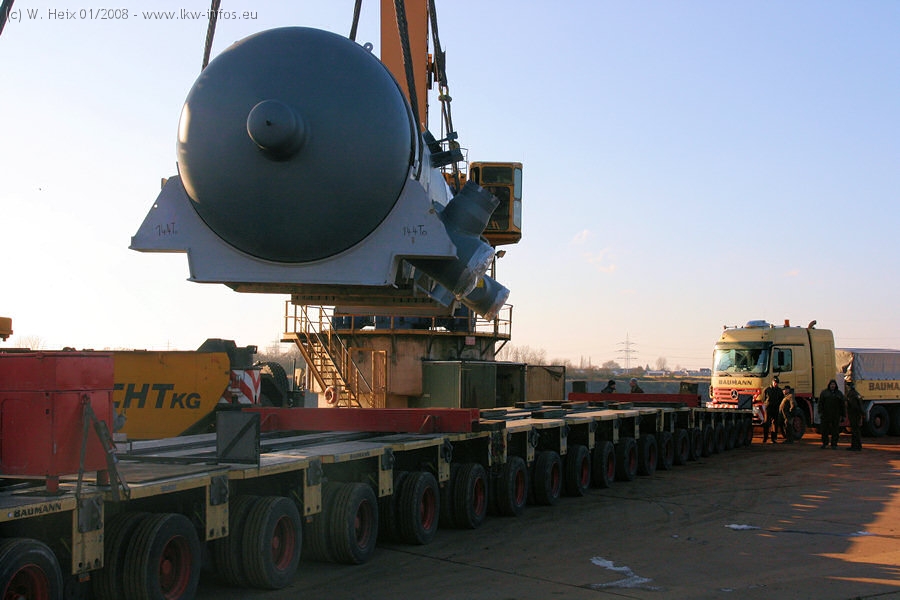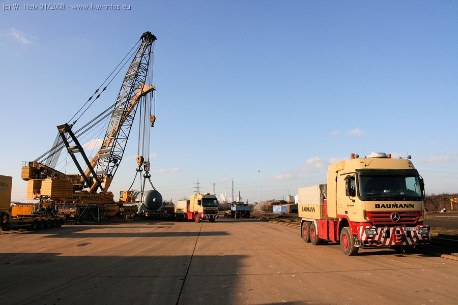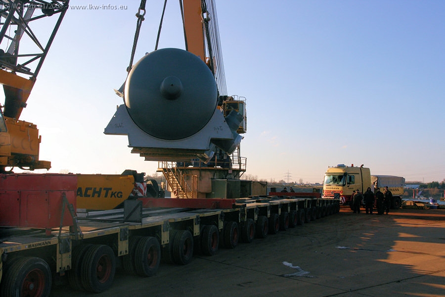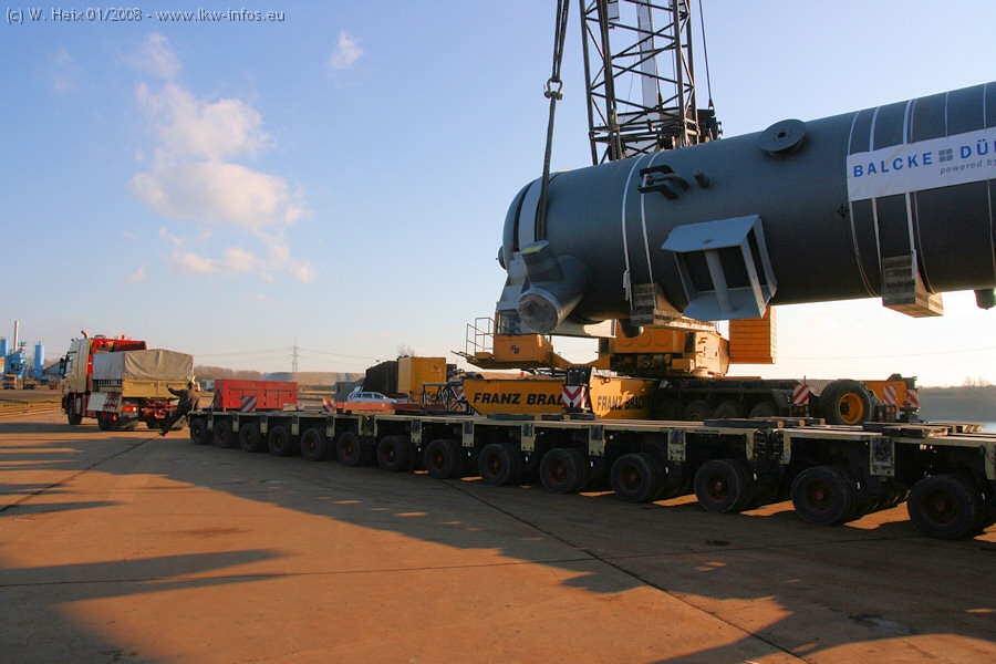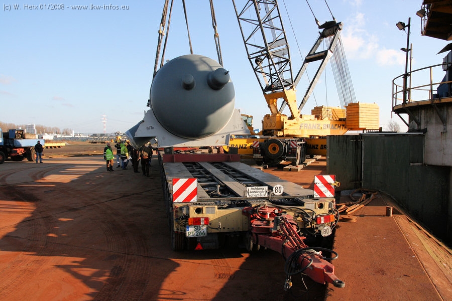 Am 02.01.2008 erreichte das Binnenschiff den Krefelder Hafen. Der Hub vom Schiff auf den Tieflader von Baumann erfolgte erneut durch den Big Rocky und den schon bekannten Gottwald AK 450-83 von Franz Bracht.. Der Hilfskran der Krefelder Bracht-Niederlassung war wieder identisch. Baumann war mit zwei Mercedes-Benz Actros 3360 SLT 6x6 und 20 Achslinien vor Ort. Die Fahrzeuge mussten vor dem Hub mehrfach umgesetzt werden, was man beim Betrachten der Bilder sieht. Auch das Schiff musste einmal drehen im Hafenbecken. Der anschließende Hub des 297 t schweren Vorwärmers verlief reibungslos. Am Abend gegen 22:00 Uhr startete Schwertransport Richtung Neurath. Die Bilder in den Teilen 1-3 zeigen alle Fahrzeuge aus verschiedenen Perspektiven, beladen und unbeladen sowie den Hub vom Schiff auf die Transporter.