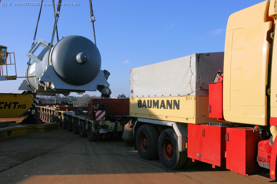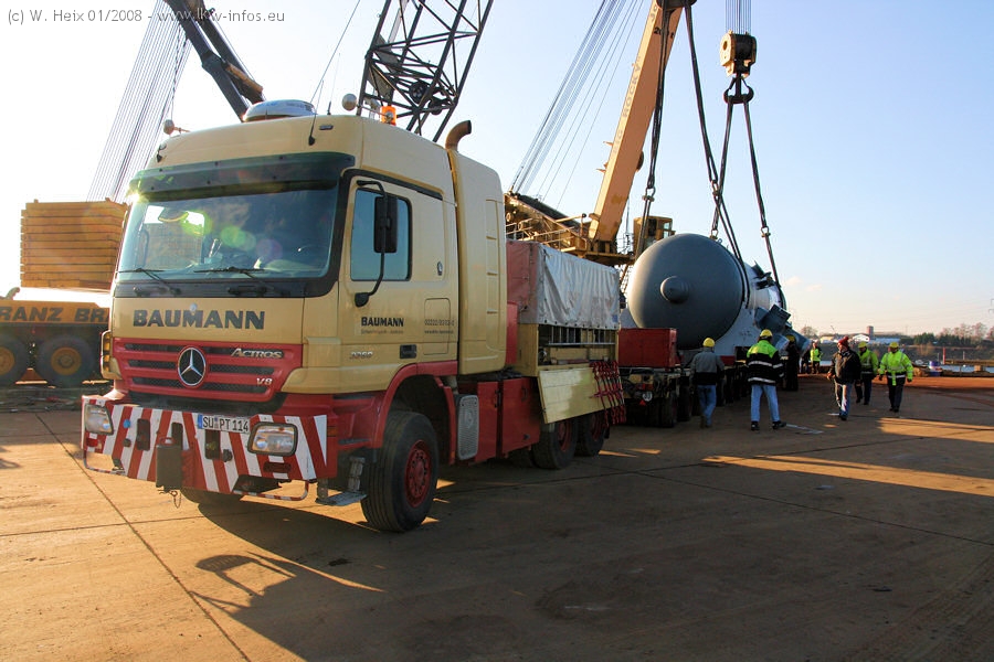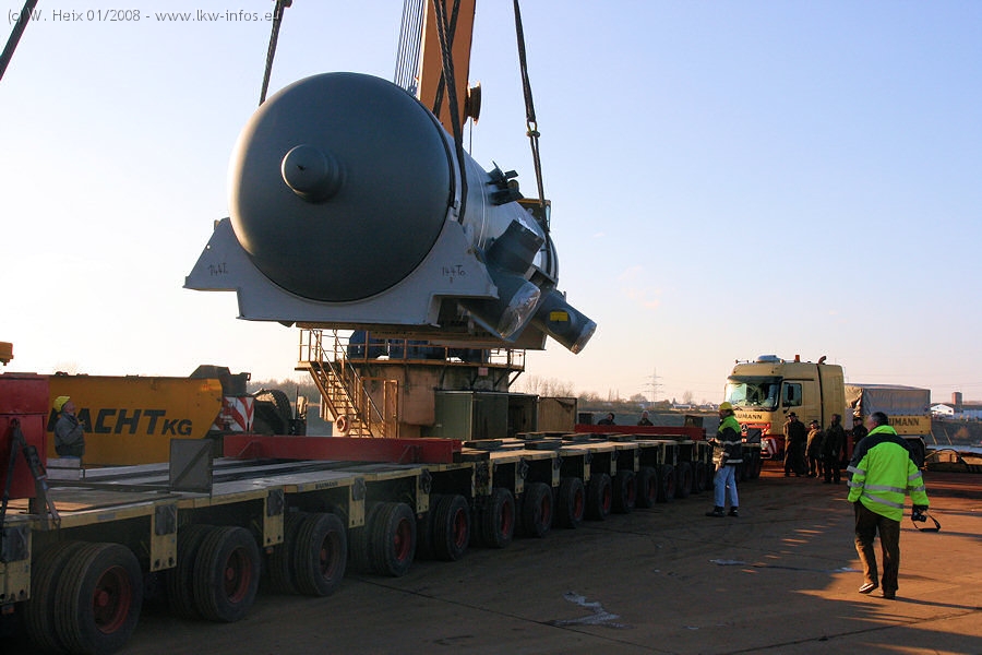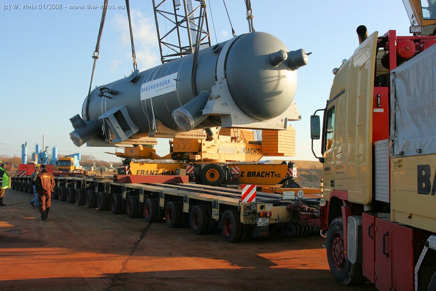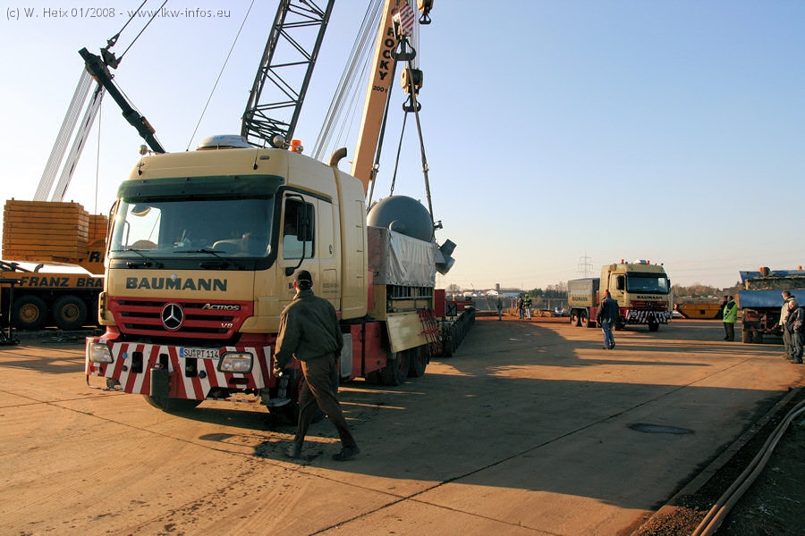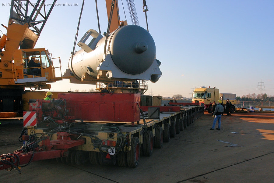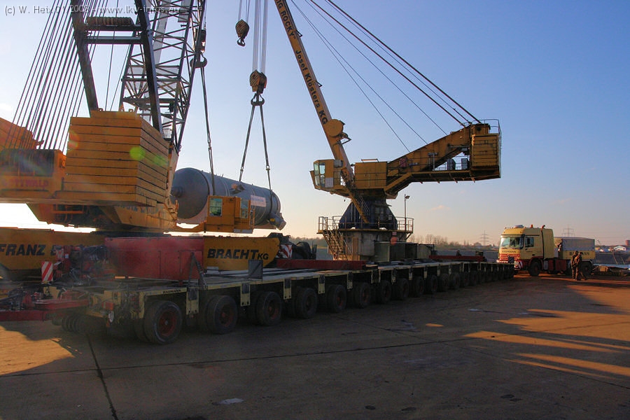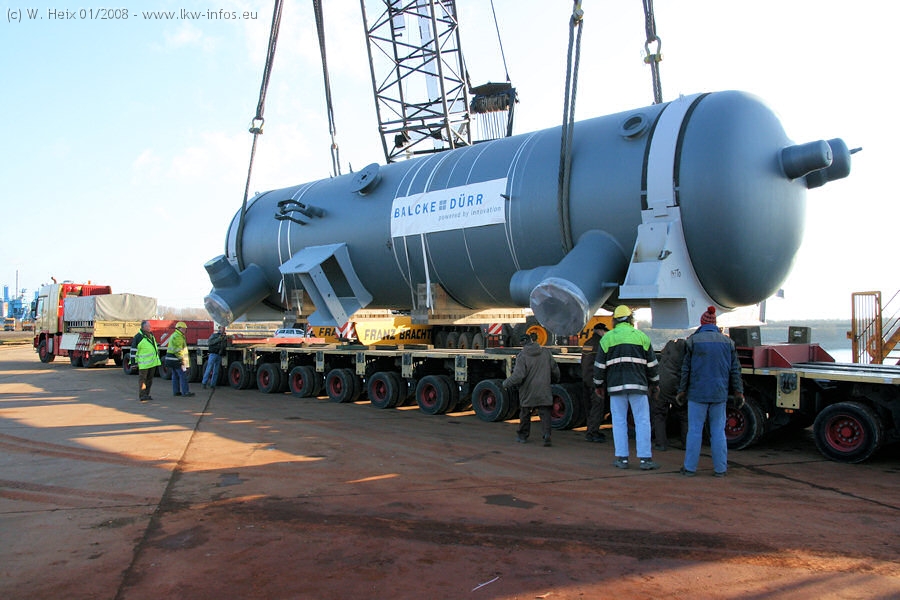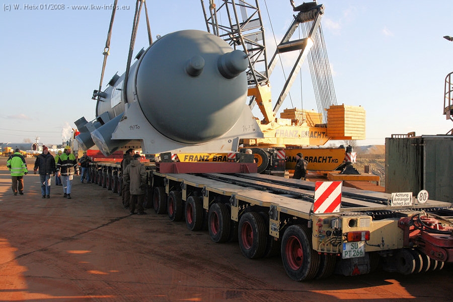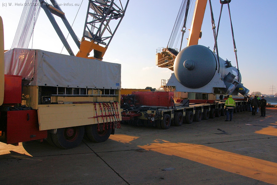 Am 02.01.2008 erreichte das Binnenschiff den Krefelder Hafen. Der Hub vom Schiff auf den Tieflader von Baumann erfolgte erneut durch den Big Rocky und den schon bekannten Gottwald AK 450-83 von Franz Bracht.. Der Hilfskran der Krefelder Bracht-Niederlassung war wieder identisch. Baumann war mit zwei Mercedes-Benz Actros 3360 SLT 6x6 und 20 Achslinien vor Ort. Die Fahrzeuge mussten vor dem Hub mehrfach umgesetzt werden, was man beim Betrachten der Bilder sieht. Auch das Schiff musste einmal drehen im Hafenbecken. Der anschließende Hub des 297 t schweren Vorwärmers verlief reibungslos. Am Abend gegen 22:00 Uhr startete Schwertransport Richtung Neurath. Die Bilder in den Teilen 1-3 zeigen alle Fahrzeuge aus verschiedenen Perspektiven, beladen und unbeladen sowie den Hub vom Schiff auf die Transporter.