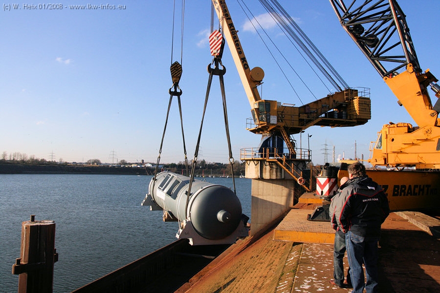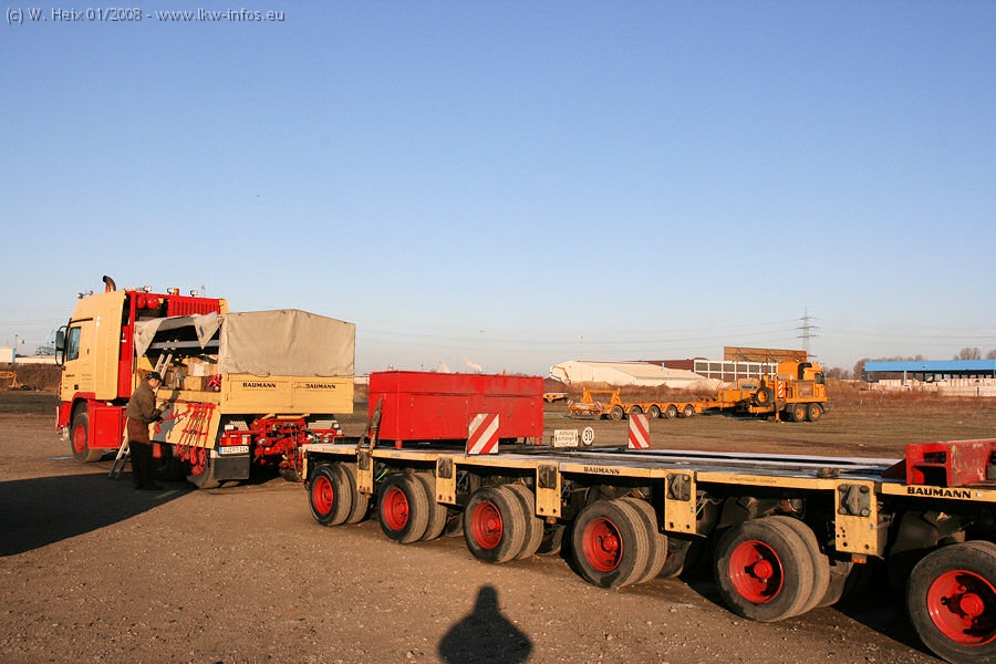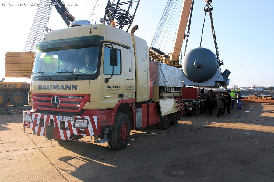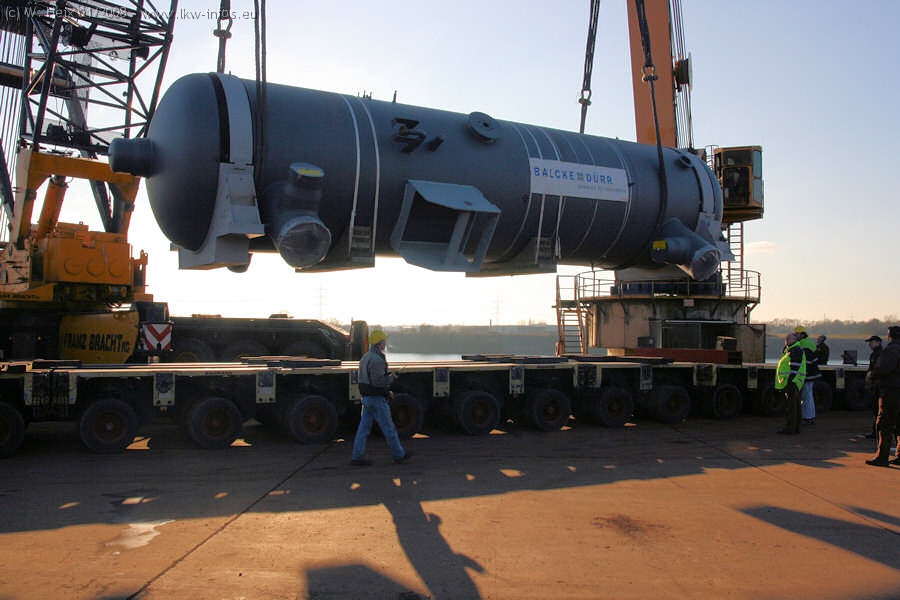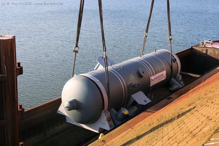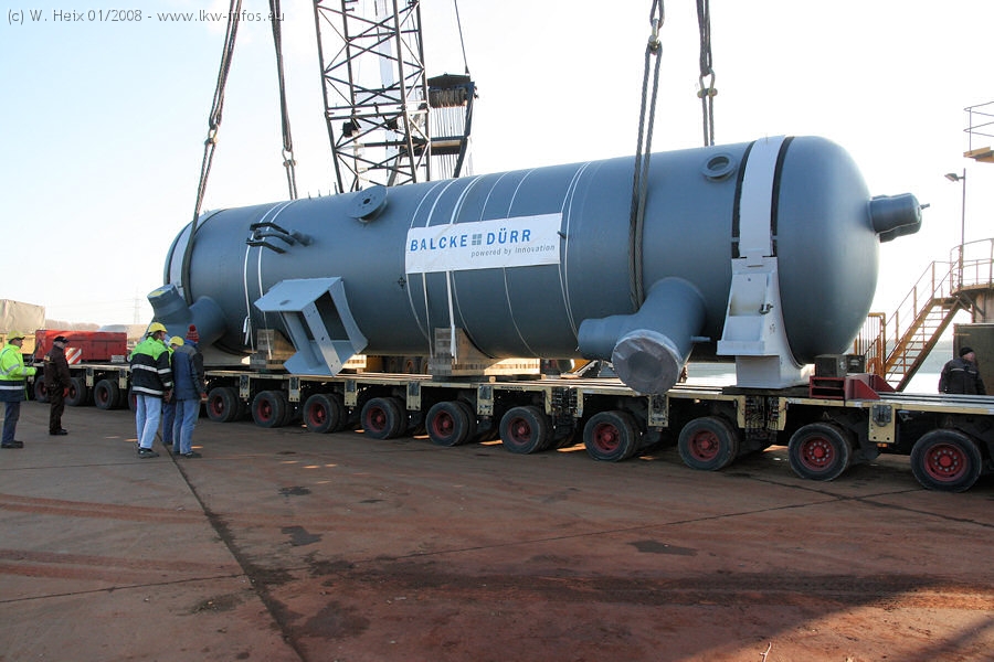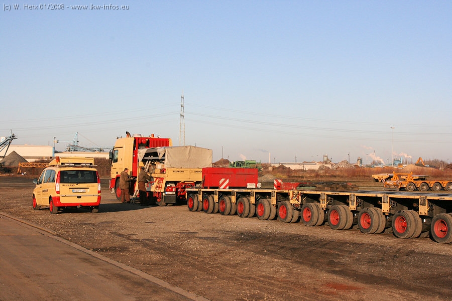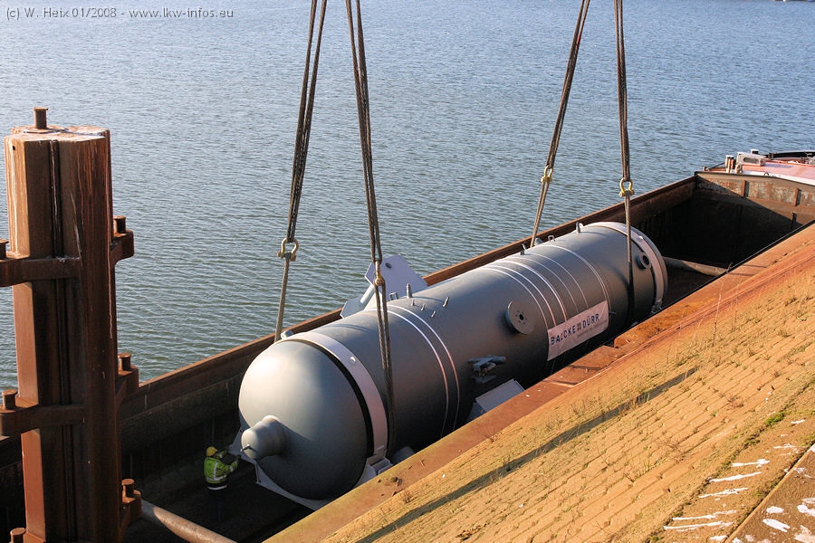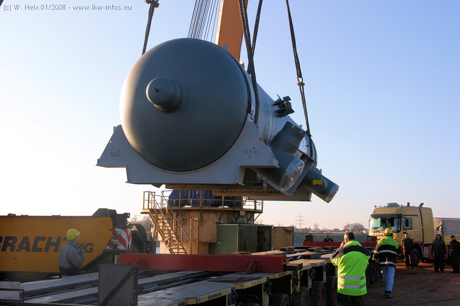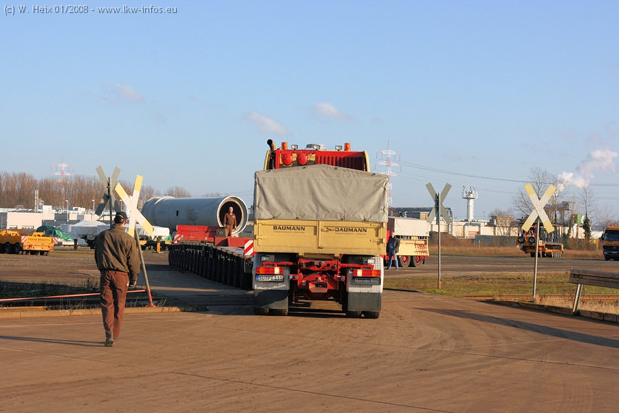 Am 02.01.2008 erreichte das Binnenschiff den Krefelder Hafen. Der Hub vom Schiff auf den Tieflader von Baumann erfolgte erneut durch den Big Rocky und den schon bekannten Gottwald AK 450-83 von Franz Bracht.. Der Hilfskran der Krefelder Bracht-Niederlassung war wieder identisch. Baumann war mit zwei Mercedes-Benz Actros 3360 SLT 6x6 und 20 Achslinien vor Ort. Die Fahrzeuge mussten vor dem Hub mehrfach umgesetzt werden, was man beim Betrachten der Bilder sieht. Auch das Schiff musste einmal drehen im Hafenbecken. Der anschließende Hub des 297 t schweren Vorwärmers verlief reibungslos. Am Abend gegen 22:00 Uhr startete Schwertransport Richtung Neurath. Die Bilder in den Teilen 1-3 zeigen alle Fahrzeuge aus verschiedenen Perspektiven, beladen und unbeladen sowie den Hub vom Schiff auf die Transporter.