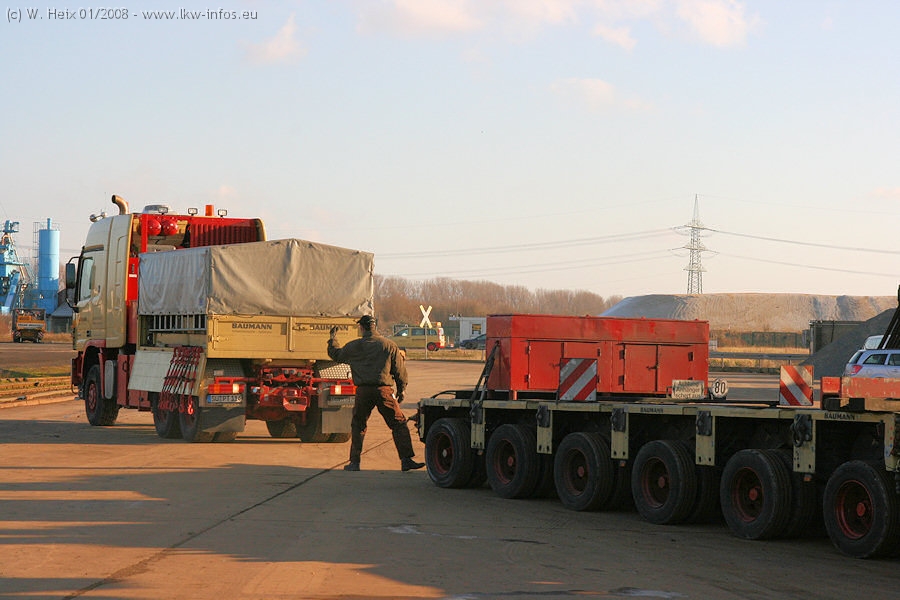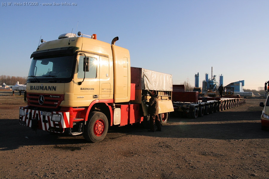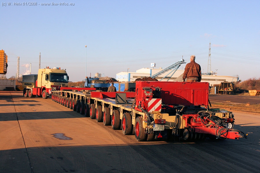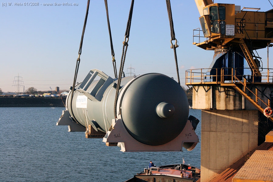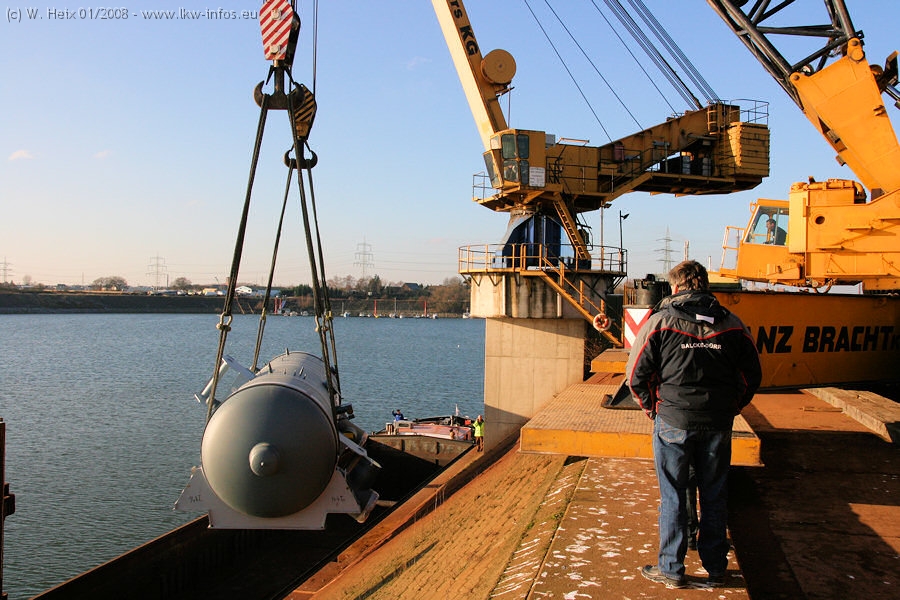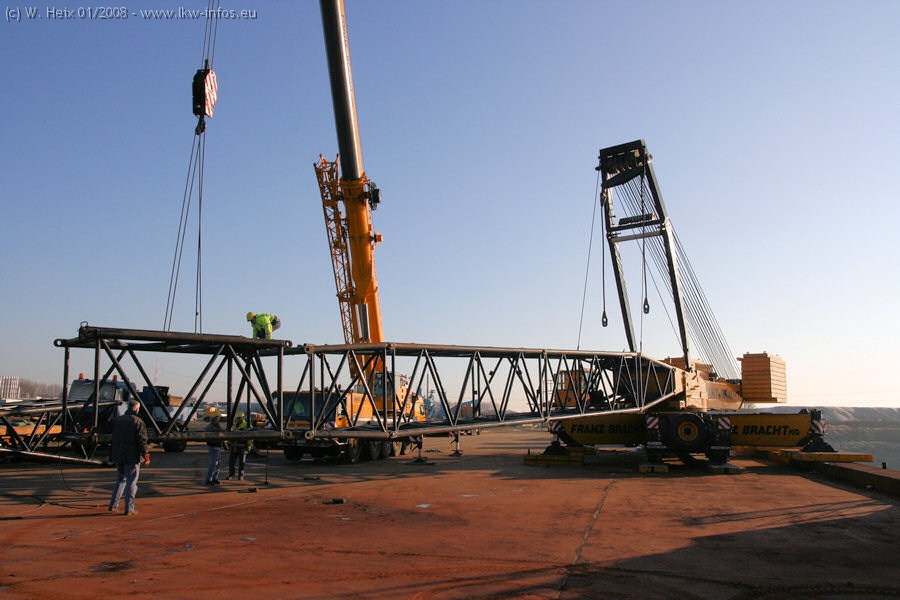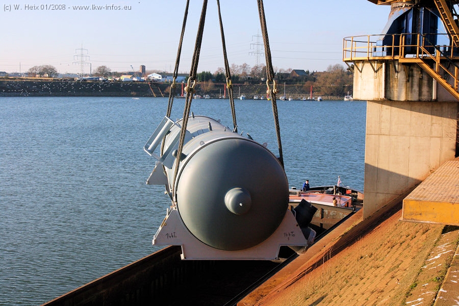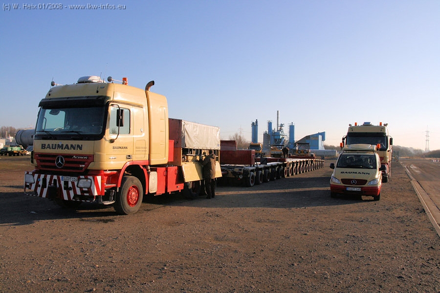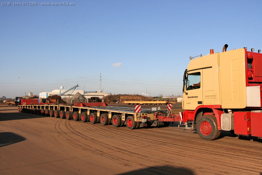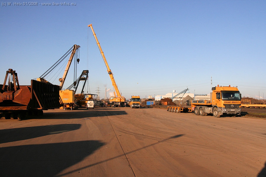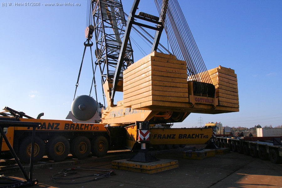 Am 02.01.2008 erreichte das Binnenschiff den Krefelder Hafen. Der Hub vom Schiff auf den Tieflader von Baumann erfolgte erneut durch den Big Rocky und den schon bekannten Gottwald AK 450-83 von Franz Bracht.. Der Hilfskran der Krefelder Bracht-Niederlassung war wieder identisch. Baumann war mit zwei Mercedes-Benz Actros 3360 SLT 6x6 und 20 Achslinien vor Ort. Die Fahrzeuge mussten vor dem Hub mehrfach umgesetzt werden, was man beim Betrachten der Bilder sieht. Auch das Schiff musste einmal drehen im Hafenbecken. Der anschließende Hub des 297 t schweren Vorwärmers verlief reibungslos. Am Abend gegen 22:00 Uhr startete Schwertransport Richtung Neurath. Die Bilder in den Teilen 1-3 zeigen alle Fahrzeuge aus verschiedenen Perspektiven, beladen und unbeladen sowie den Hub vom Schiff auf die Transporter.