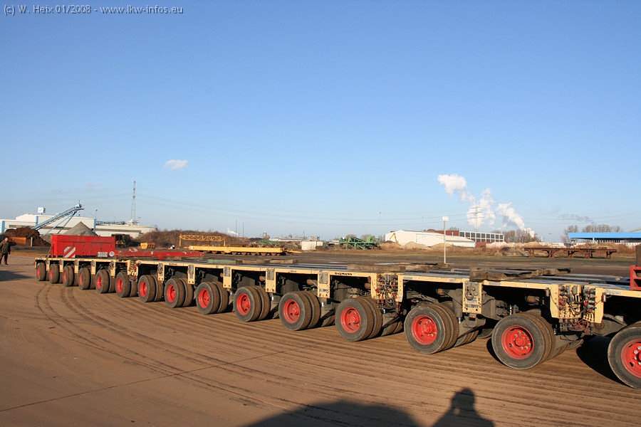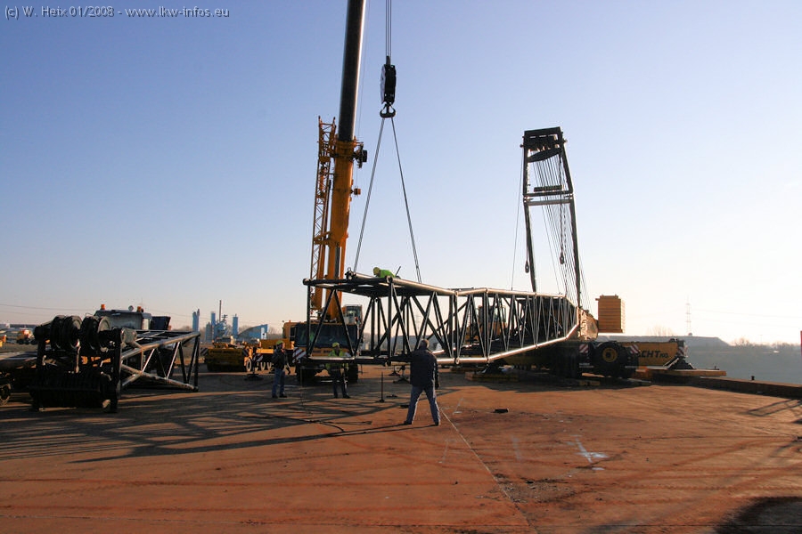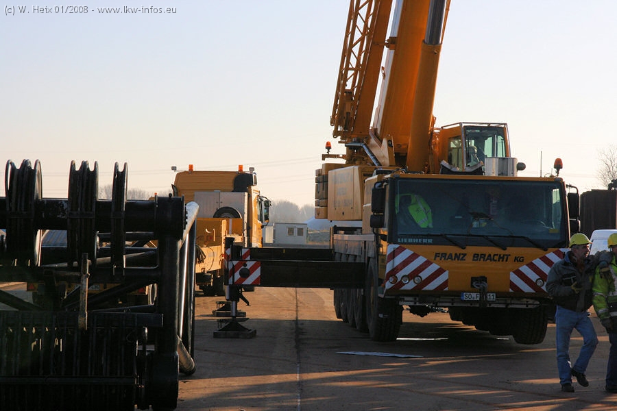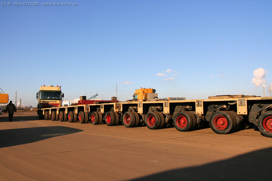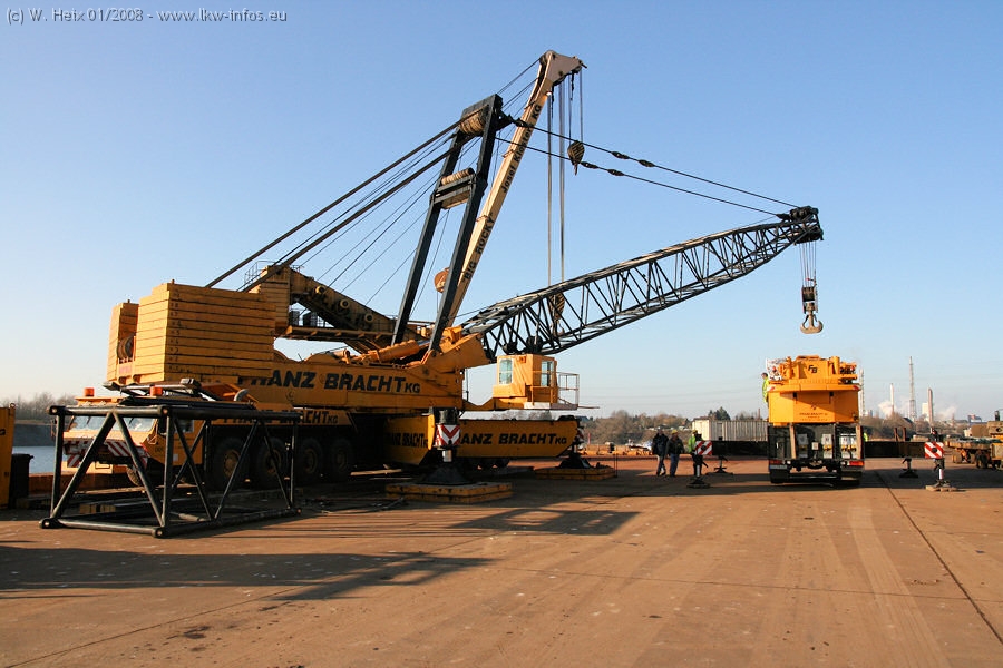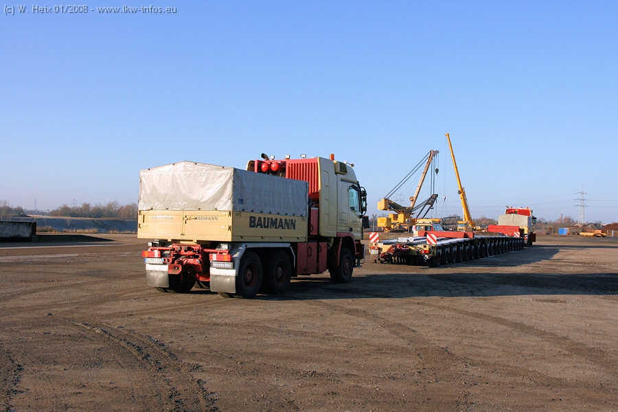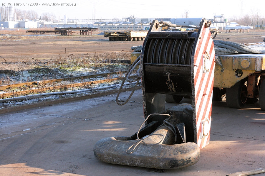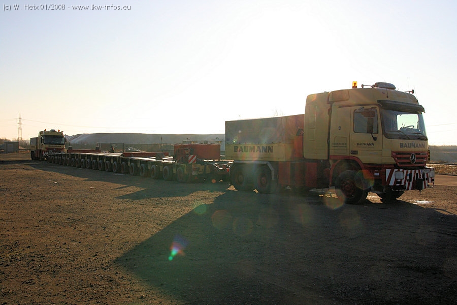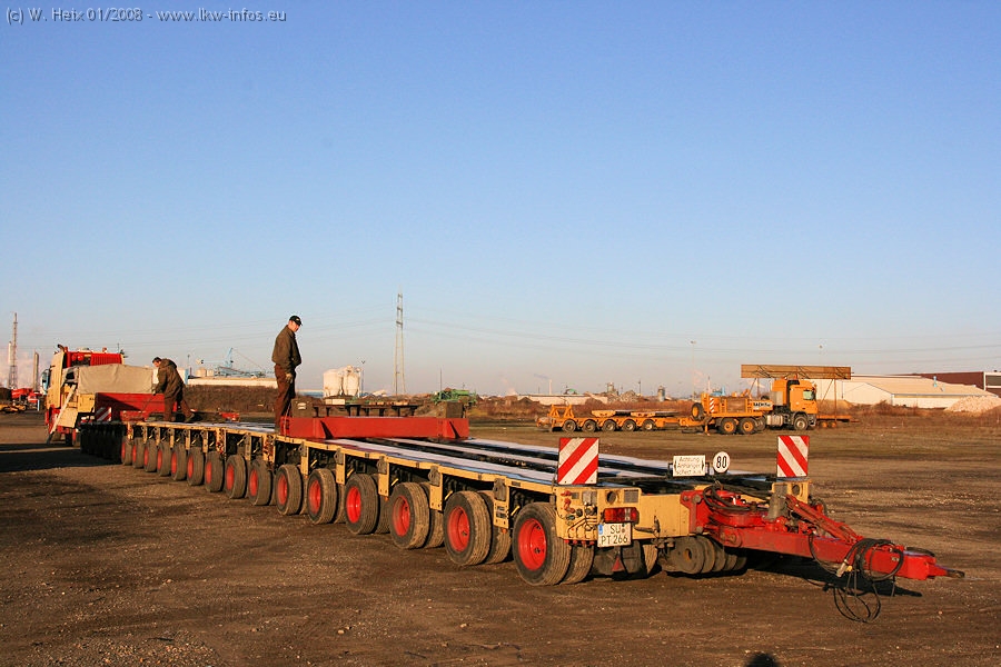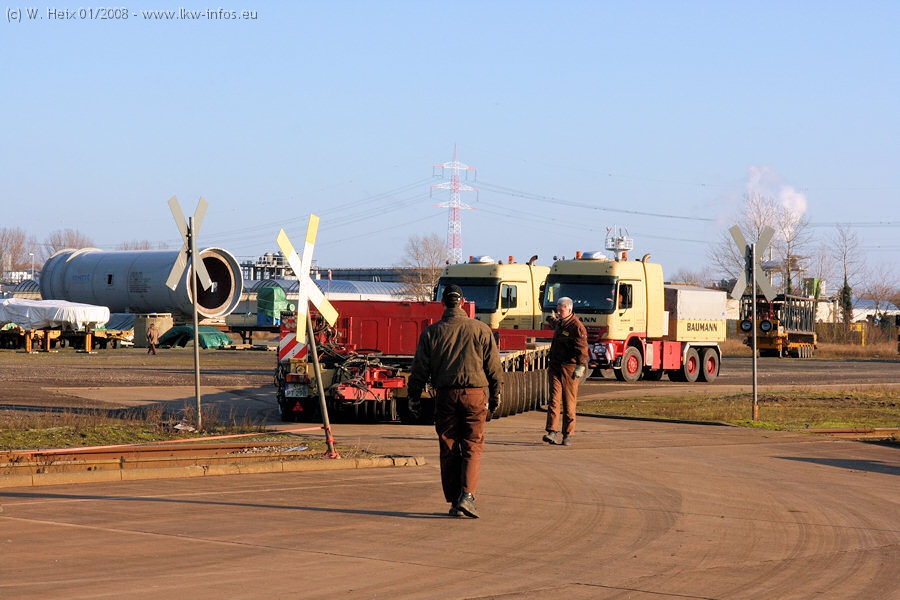 Am 02.01.2008 erreichte das Binnenschiff den Krefelder Hafen. Der Hub vom Schiff auf den Tieflader von Baumann erfolgte erneut durch den Big Rocky und den schon bekannten Gottwald AK 450-83 von Franz Bracht.. Der Hilfskran der Krefelder Bracht-Niederlassung war wieder identisch. Baumann war mit zwei Mercedes-Benz Actros 3360 SLT 6x6 und 20 Achslinien vor Ort. Die Fahrzeuge mussten vor dem Hub mehrfach umgesetzt werden, was man beim Betrachten der Bilder sieht. Auch das Schiff musste einmal drehen im Hafenbecken. Der anschließende Hub des 297 t schweren Vorwärmers verlief reibungslos. Am Abend gegen 22:00 Uhr startete Schwertransport Richtung Neurath. Die Bilder in den Teilen 1-3 zeigen alle Fahrzeuge aus verschiedenen Perspektiven, beladen und unbeladen sowie den Hub vom Schiff auf die Transporter.