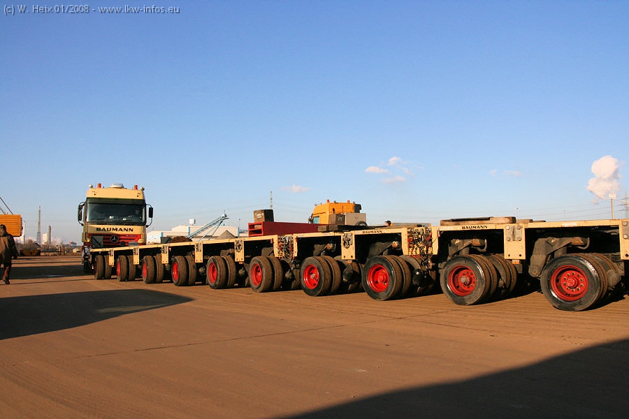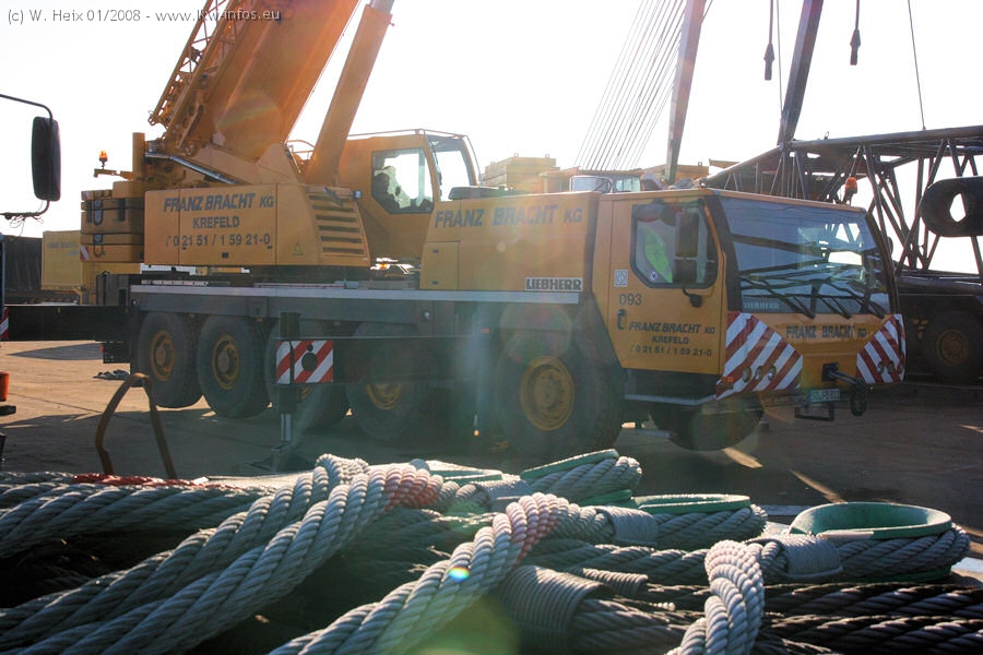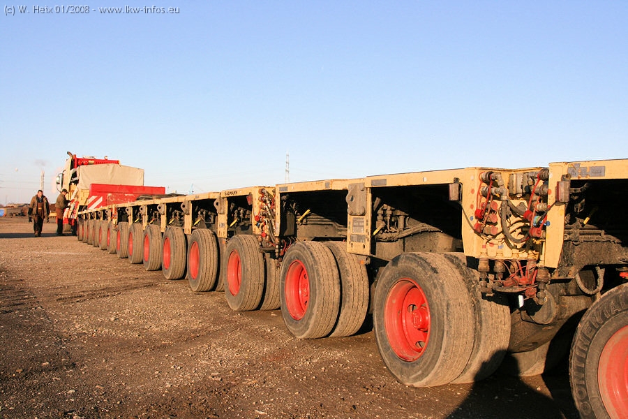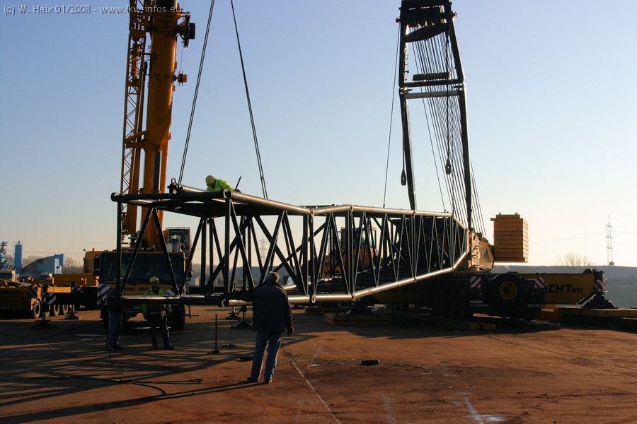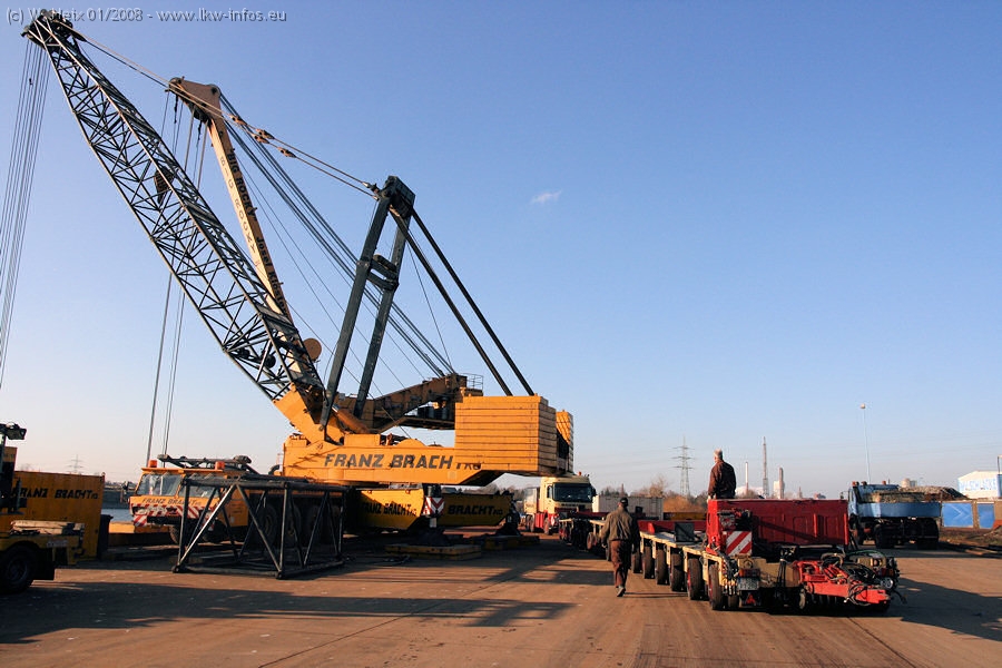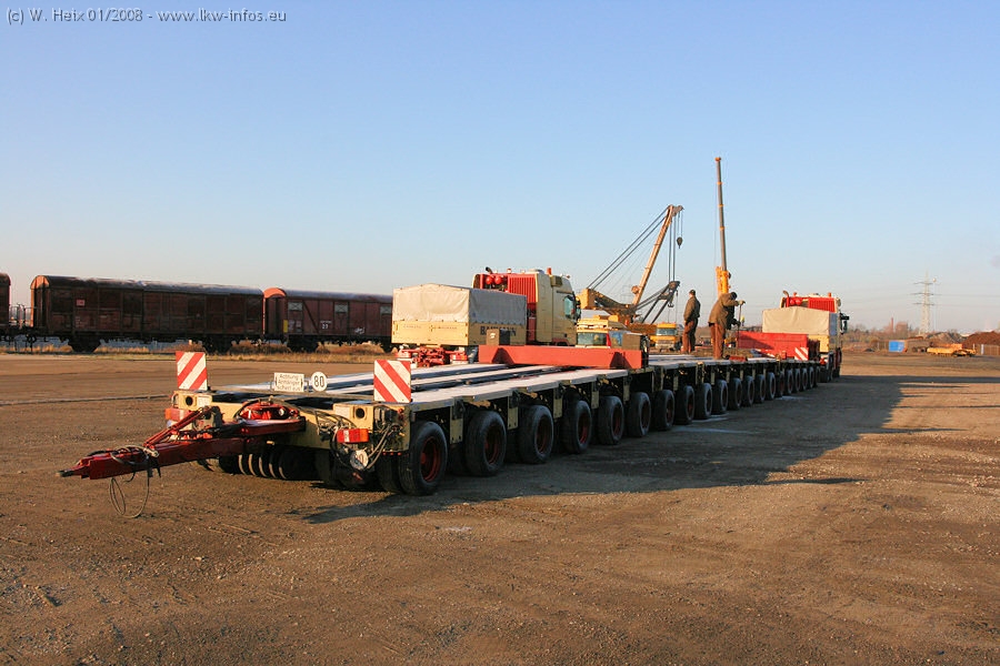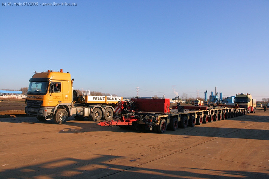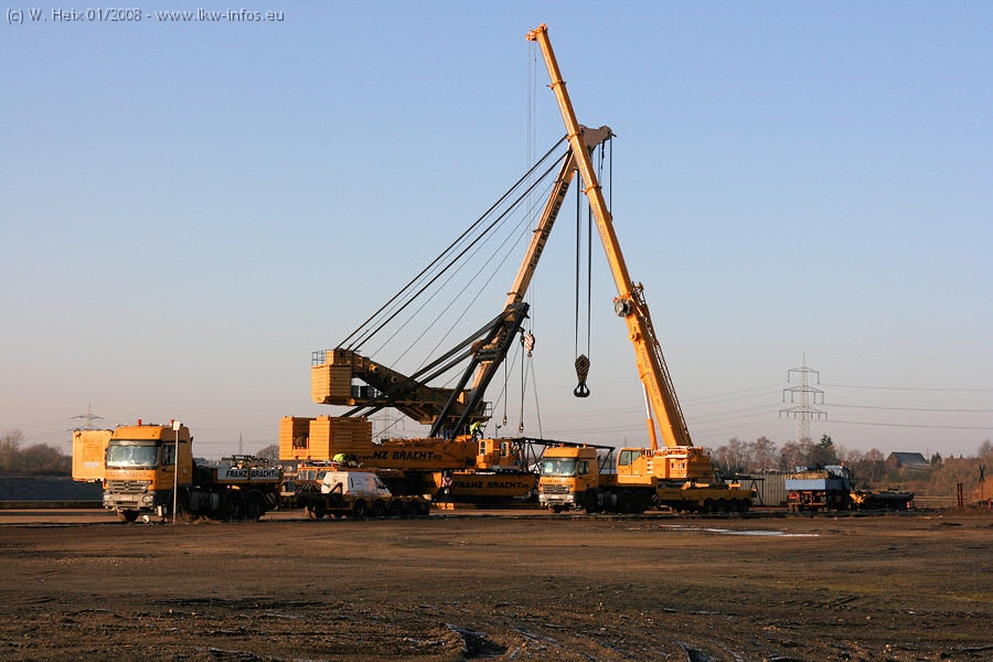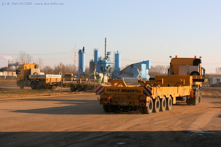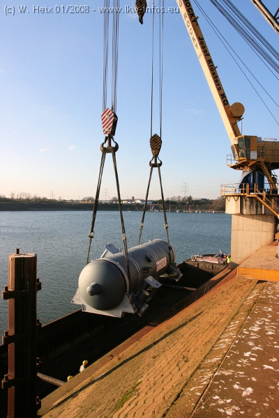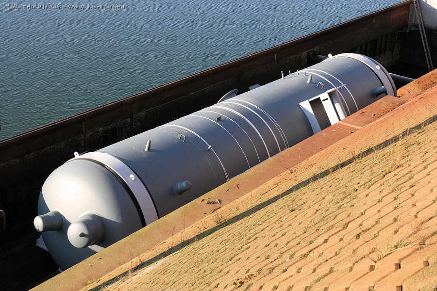 Am 02.01.2008 erreichte das Binnenschiff den Krefelder Hafen. Der Hub vom Schiff auf den Tieflader von Baumann erfolgte erneut durch den Big Rocky und den schon bekannten Gottwald AK 450-83 von Franz Bracht.. Der Hilfskran der Krefelder Bracht-Niederlassung war wieder identisch. Baumann war mit zwei Mercedes-Benz Actros 3360 SLT 6x6 und 20 Achslinien vor Ort. Die Fahrzeuge mussten vor dem Hub mehrfach umgesetzt werden, was man beim Betrachten der Bilder sieht. Auch das Schiff musste einmal drehen im Hafenbecken. Der anschließende Hub des 297 t schweren Vorwärmers verlief reibungslos. Am Abend gegen 22:00 Uhr startete Schwertransport Richtung Neurath. Die Bilder in den Teilen 1-3 zeigen alle Fahrzeuge aus verschiedenen Perspektiven, beladen und unbeladen sowie den Hub vom Schiff auf die Transporter.