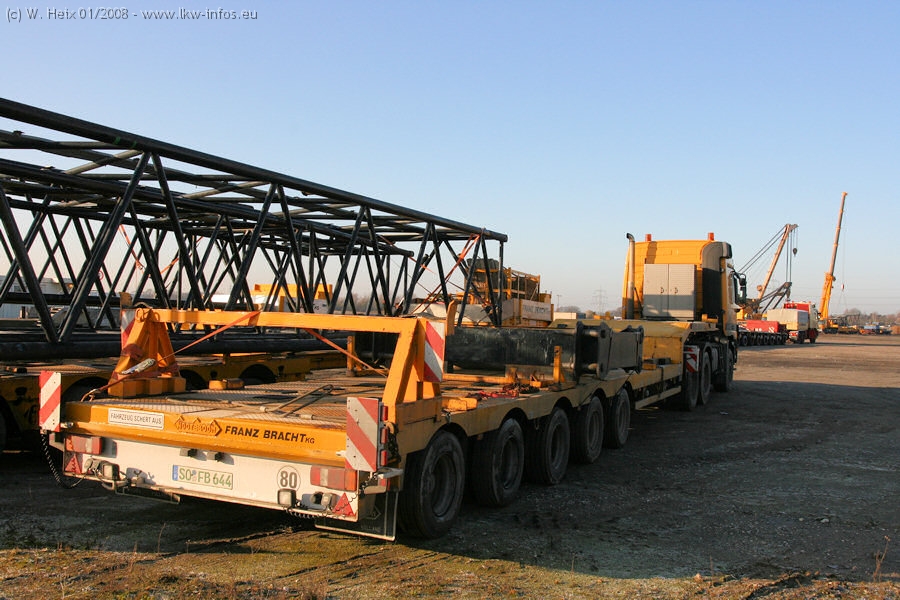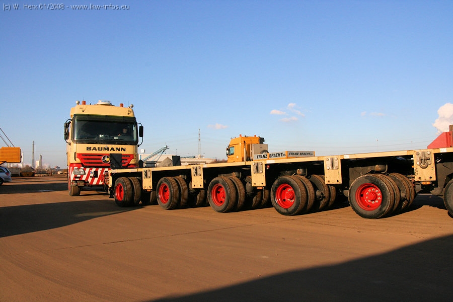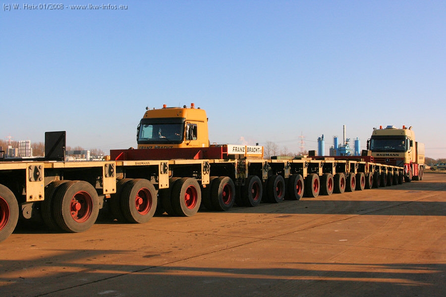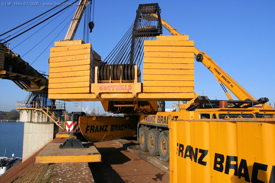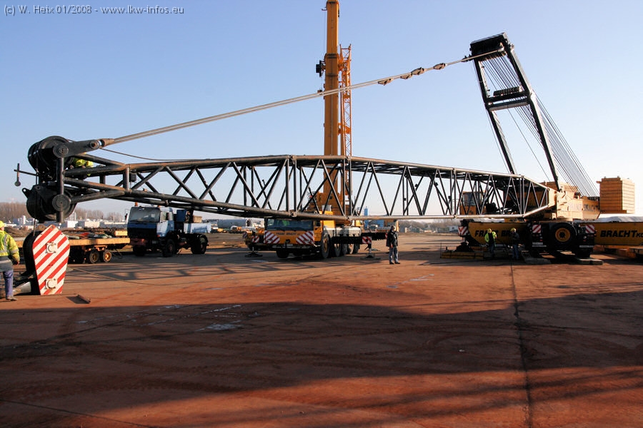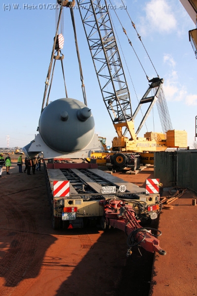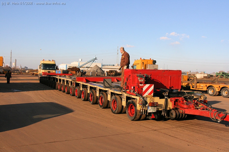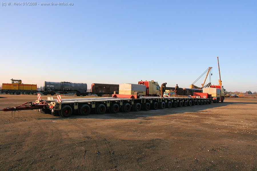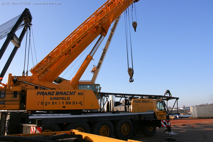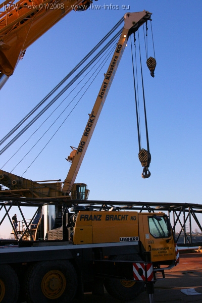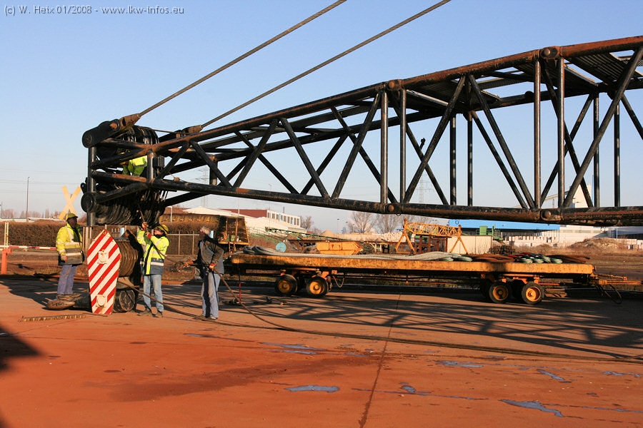 Am 02.01.2008 erreichte das Binnenschiff den Krefelder Hafen. Der Hub vom Schiff auf den Tieflader von Baumann erfolgte erneut durch den Big Rocky und den schon bekannten Gottwald AK 450-83 von Franz Bracht.. Der Hilfskran der Krefelder Bracht-Niederlassung war wieder identisch. Baumann war mit zwei Mercedes-Benz Actros 3360 SLT 6x6 und 20 Achslinien vor Ort. Die Fahrzeuge mussten vor dem Hub mehrfach umgesetzt werden, was man beim Betrachten der Bilder sieht. Auch das Schiff musste einmal drehen im Hafenbecken. Der anschließende Hub des 297 t schweren Vorwärmers verlief reibungslos. Am Abend gegen 22:00 Uhr startete Schwertransport Richtung Neurath. Die Bilder in den Teilen 1-3 zeigen alle Fahrzeuge aus verschiedenen Perspektiven, beladen und unbeladen sowie den Hub vom Schiff auf die Transporter.