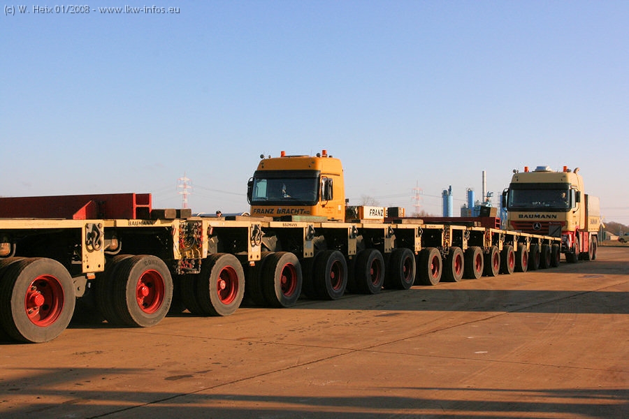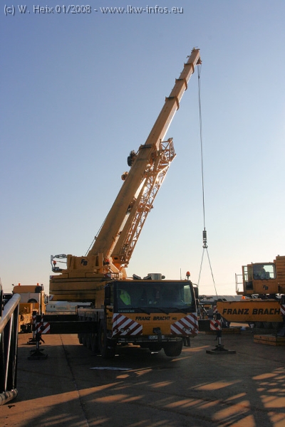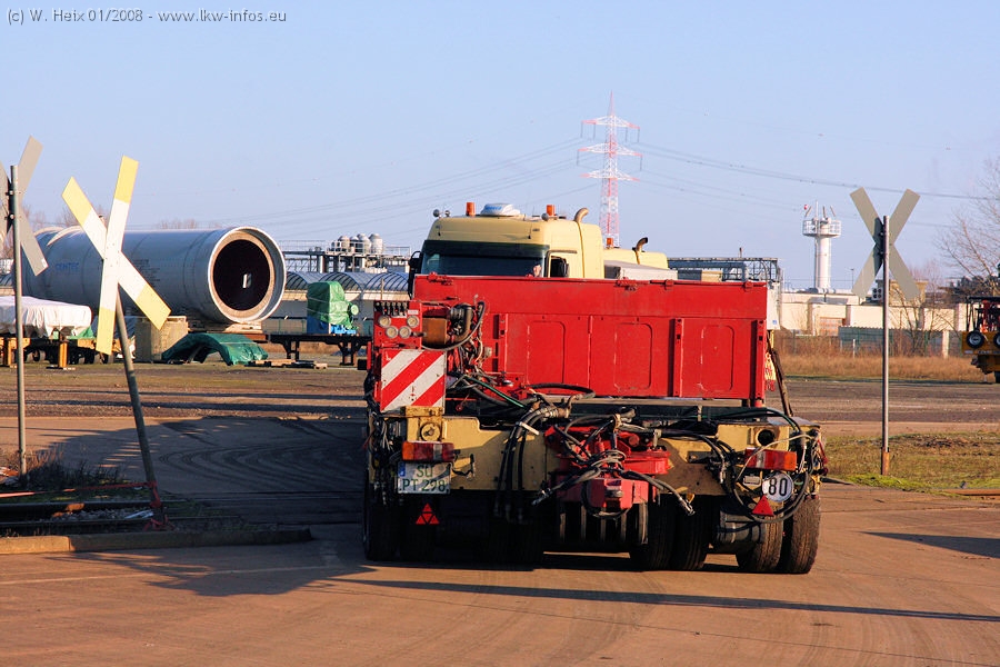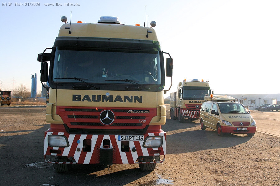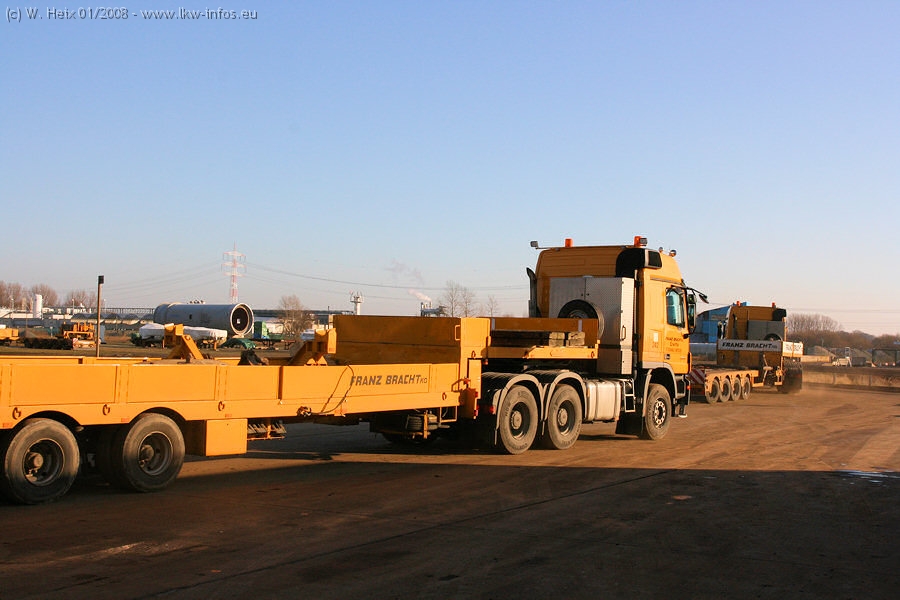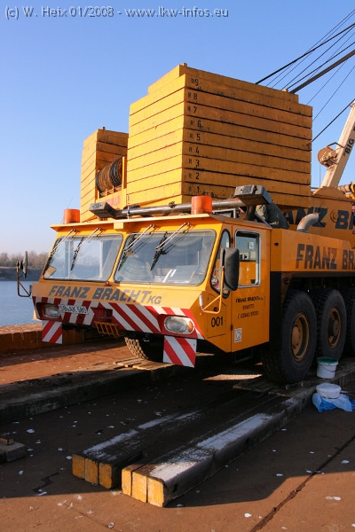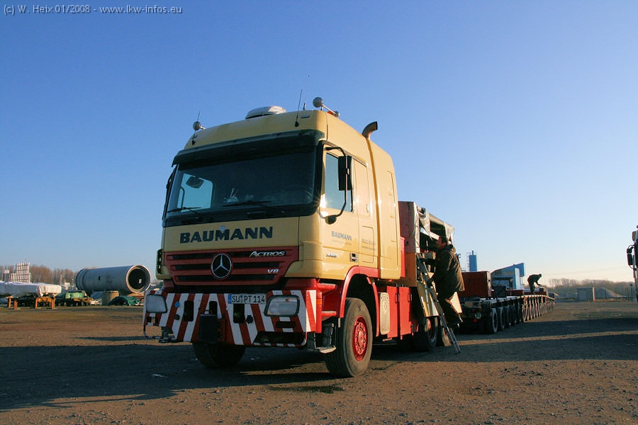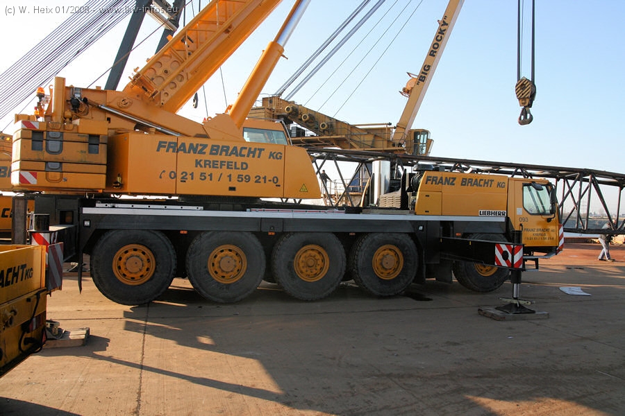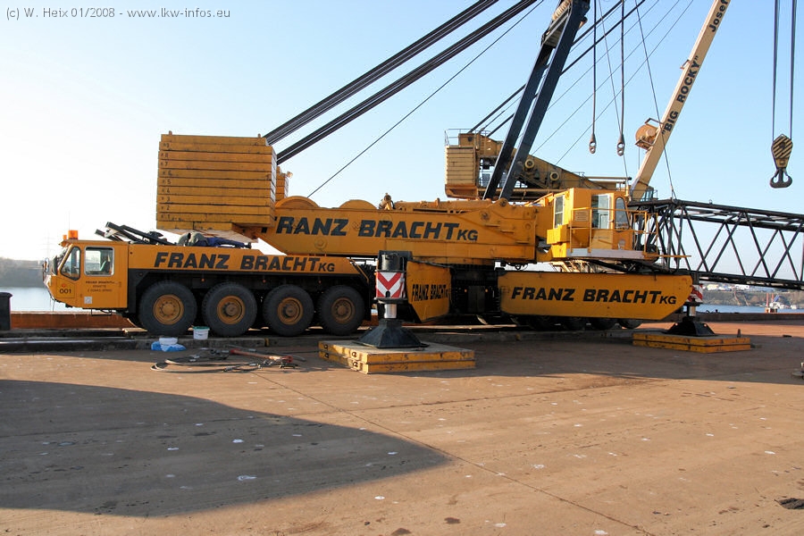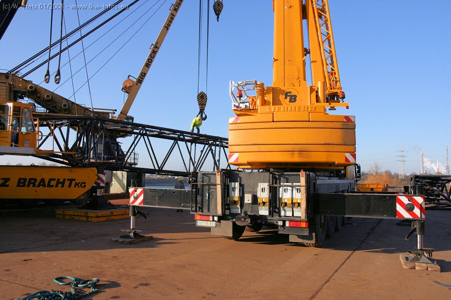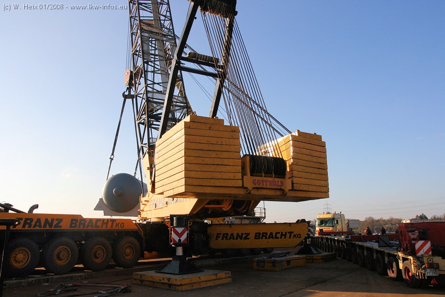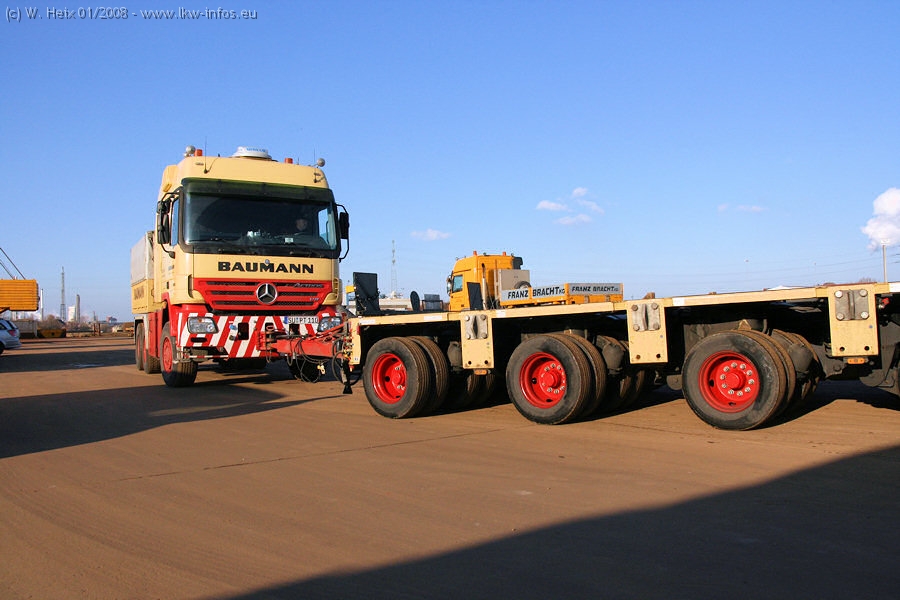 Am 02.01.2008 erreichte das Binnenschiff den Krefelder Hafen. Der Hub vom Schiff auf den Tieflader von Baumann erfolgte erneut durch den Big Rocky und den schon bekannten Gottwald AK 450-83 von Franz Bracht.. Der Hilfskran der Krefelder Bracht-Niederlassung war wieder identisch. Baumann war mit zwei Mercedes-Benz Actros 3360 SLT 6x6 und 20 Achslinien vor Ort. Die Fahrzeuge mussten vor dem Hub mehrfach umgesetzt werden, was man beim Betrachten der Bilder sieht. Auch das Schiff musste einmal drehen im Hafenbecken. Der anschließende Hub des 297 t schweren Vorwärmers verlief reibungslos. Am Abend gegen 22:00 Uhr startete Schwertransport Richtung Neurath. Die Bilder in den Teilen 1-3 zeigen alle Fahrzeuge aus verschiedenen Perspektiven, beladen und unbeladen sowie den Hub vom Schiff auf die Transporter.