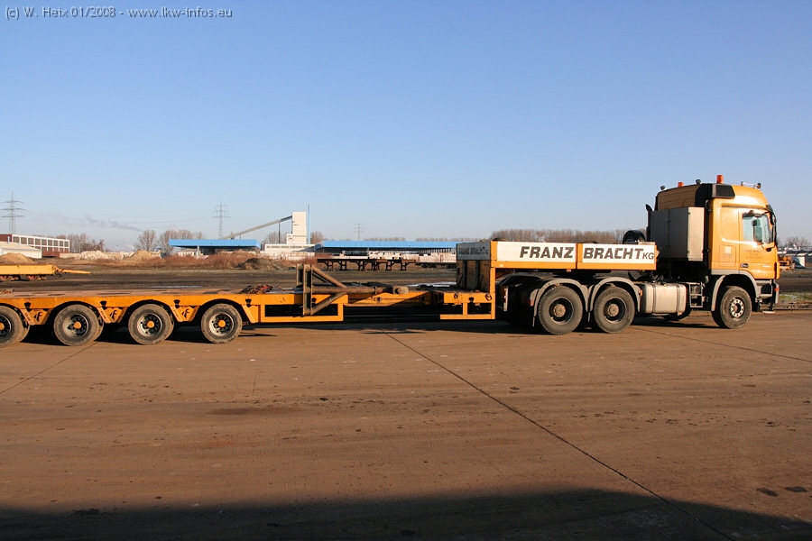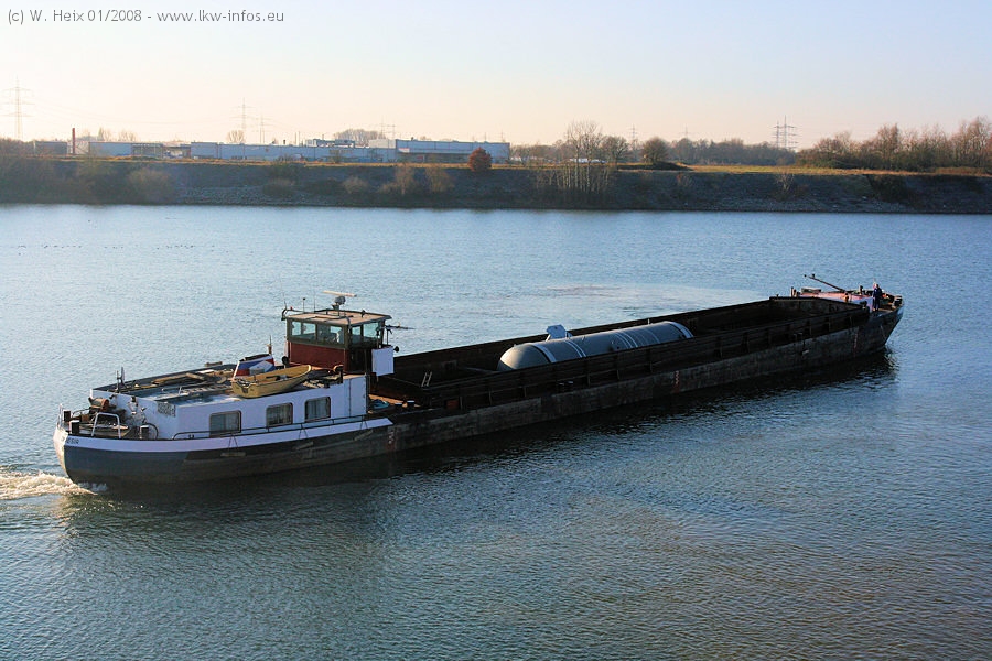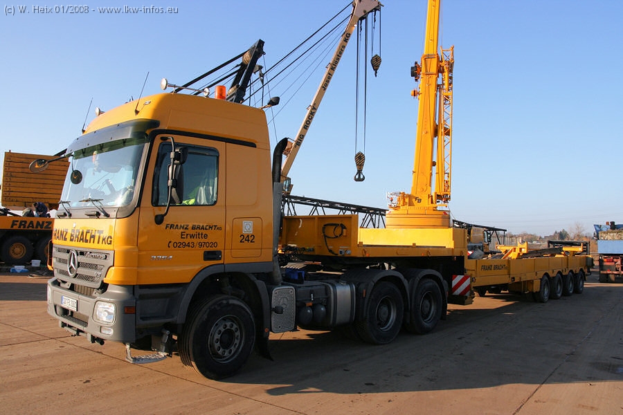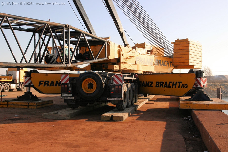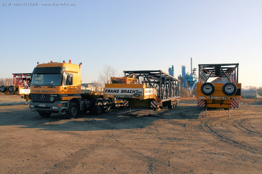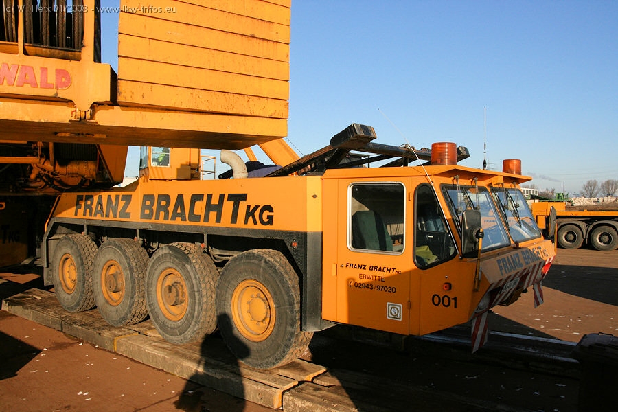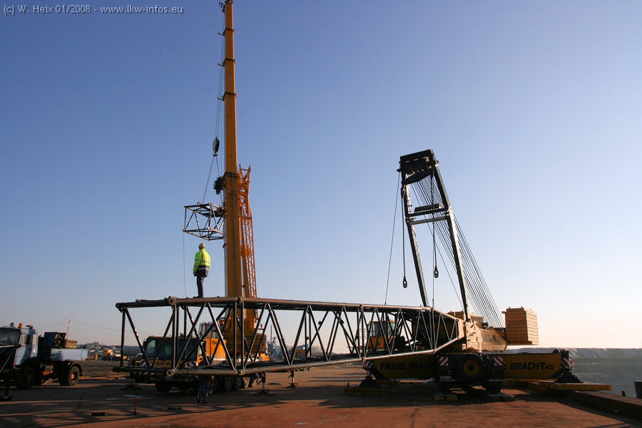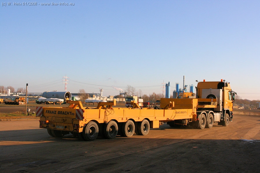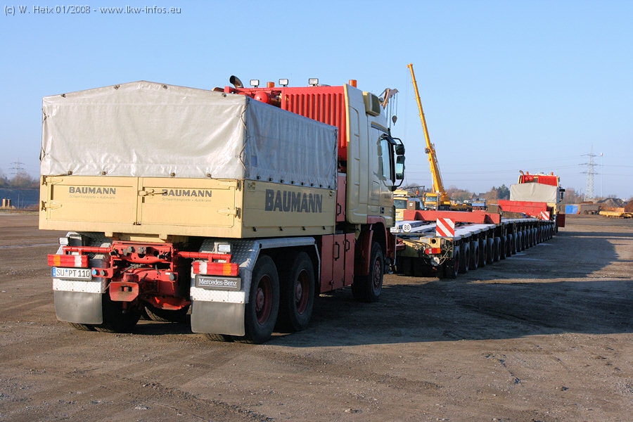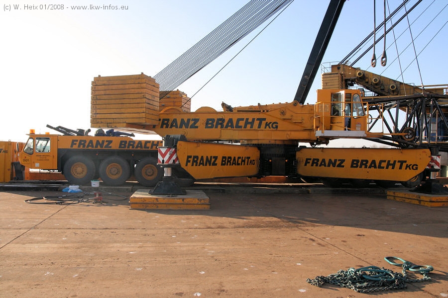 Am 02.01.2008 erreichte das Binnenschiff den Krefelder Hafen. Der Hub vom Schiff auf den Tieflader von Baumann erfolgte erneut durch den Big Rocky und den schon bekannten Gottwald AK 450-83 von Franz Bracht.. Der Hilfskran der Krefelder Bracht-Niederlassung war wieder identisch. Baumann war mit zwei Mercedes-Benz Actros 3360 SLT 6x6 und 20 Achslinien vor Ort. Die Fahrzeuge mussten vor dem Hub mehrfach umgesetzt werden, was man beim Betrachten der Bilder sieht. Auch das Schiff musste einmal drehen im Hafenbecken. Der anschließende Hub des 297 t schweren Vorwärmers verlief reibungslos. Am Abend gegen 22:00 Uhr startete Schwertransport Richtung Neurath. Die Bilder in den Teilen 1-3 zeigen alle Fahrzeuge aus verschiedenen Perspektiven, beladen und unbeladen sowie den Hub vom Schiff auf die Transporter.