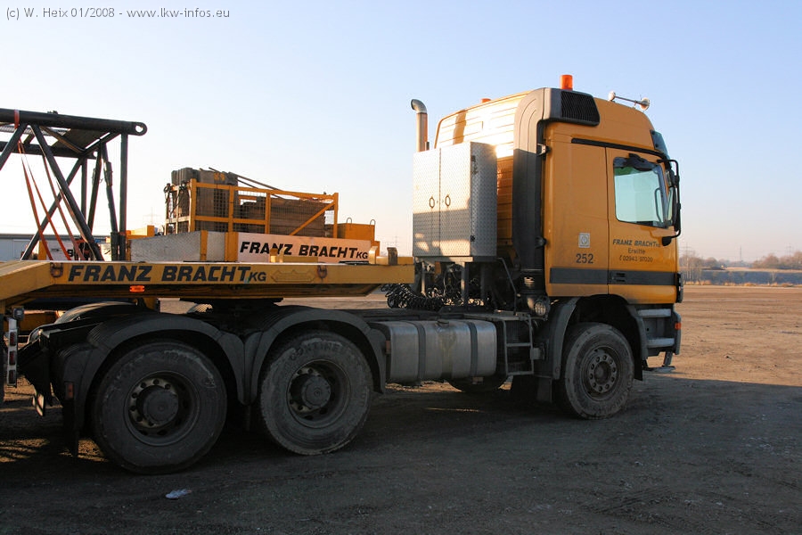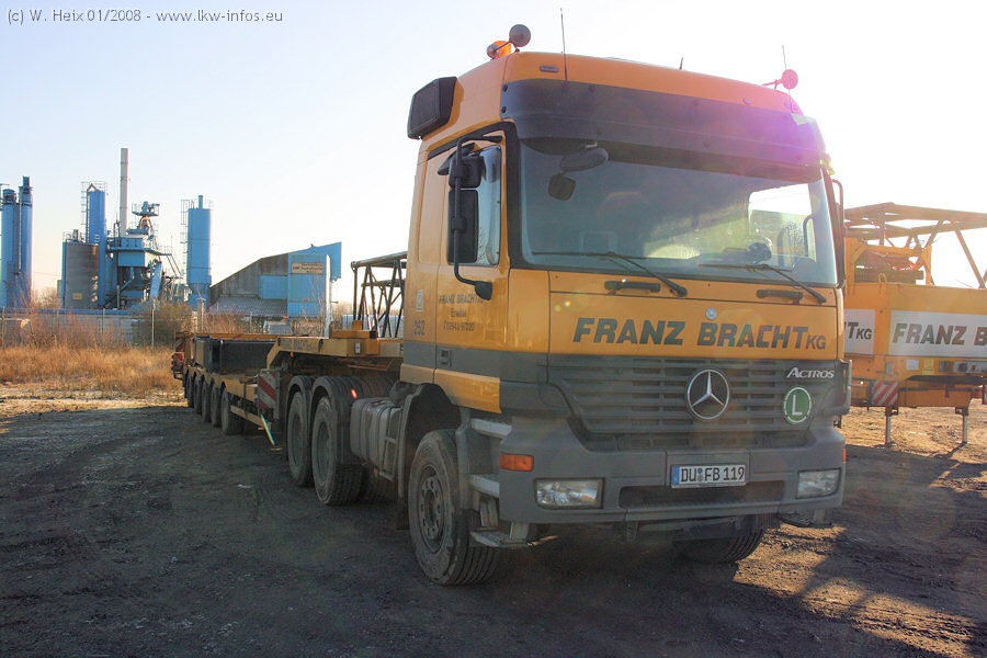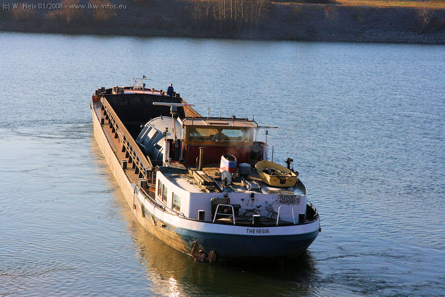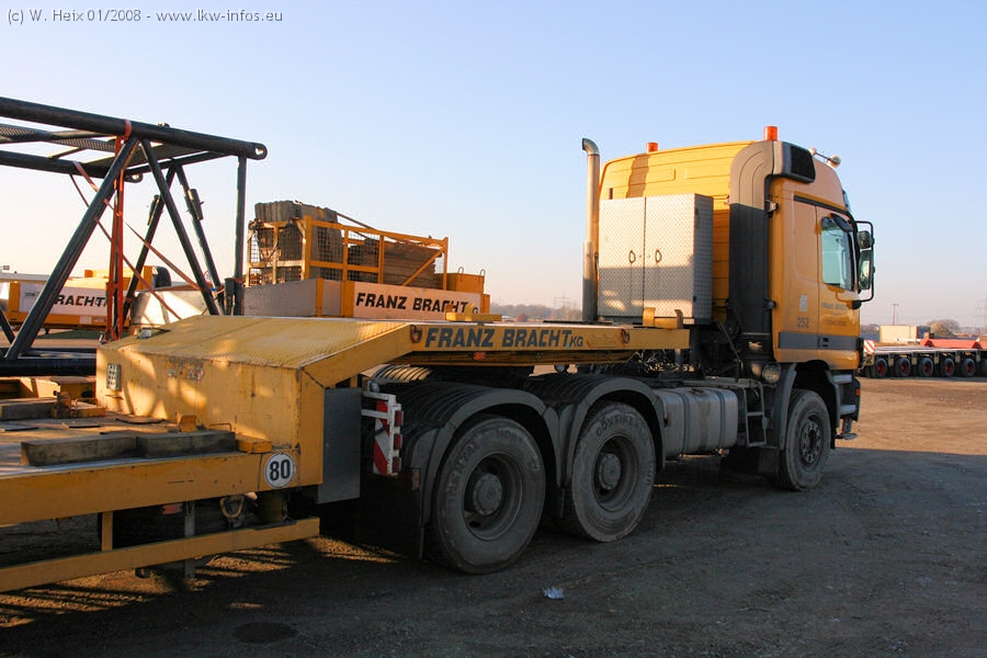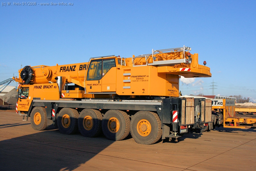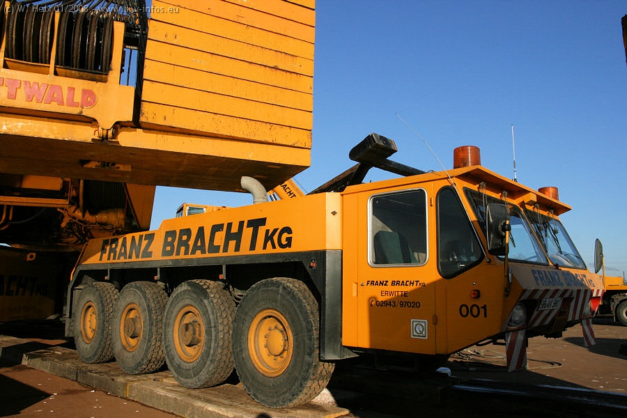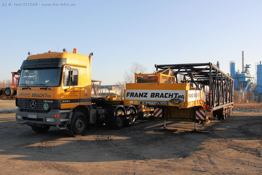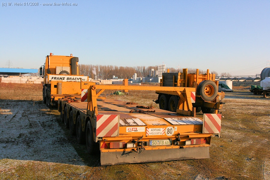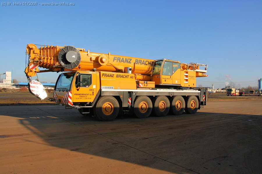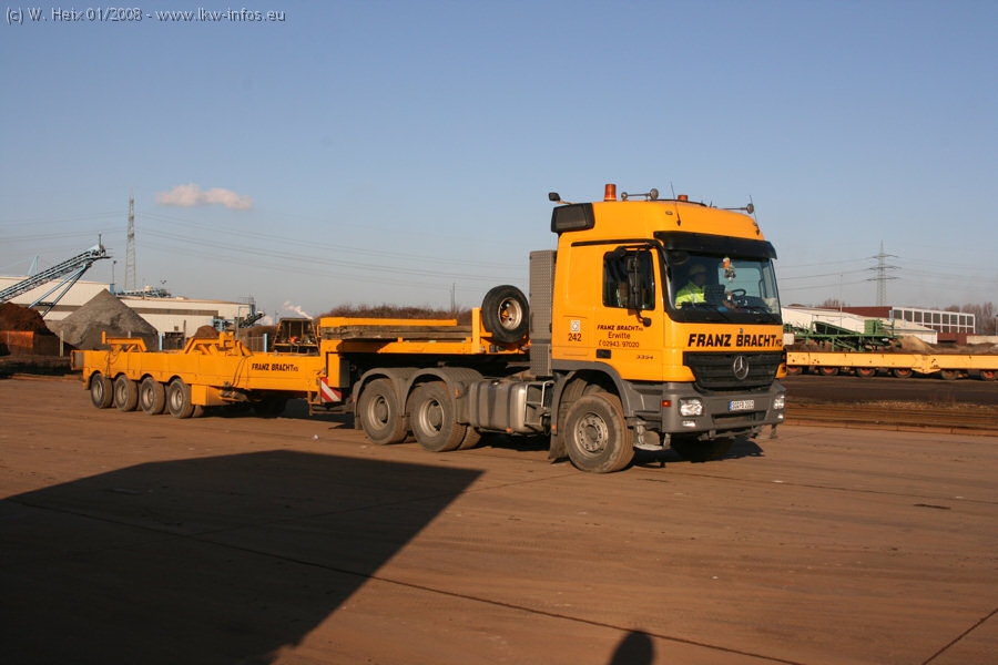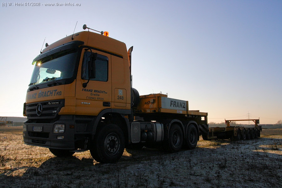 Am 02.01.2008 erreichte das Binnenschiff den Krefelder Hafen. Der Hub vom Schiff auf den Tieflader von Baumann erfolgte erneut durch den Big Rocky und den schon bekannten Gottwald AK 450-83 von Franz Bracht.. Der Hilfskran der Krefelder Bracht-Niederlassung war wieder identisch. Baumann war mit zwei Mercedes-Benz Actros 3360 SLT 6x6 und 20 Achslinien vor Ort. Die Fahrzeuge mussten vor dem Hub mehrfach umgesetzt werden, was man beim Betrachten der Bilder sieht. Auch das Schiff musste einmal drehen im Hafenbecken. Der anschließende Hub des 297 t schweren Vorwärmers verlief reibungslos. Am Abend gegen 22:00 Uhr startete Schwertransport Richtung Neurath. Die Bilder in den Teilen 1-3 zeigen alle Fahrzeuge aus verschiedenen Perspektiven, beladen und unbeladen sowie den Hub vom Schiff auf die Transporter.