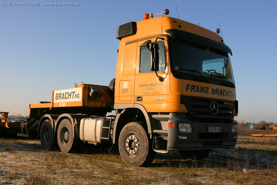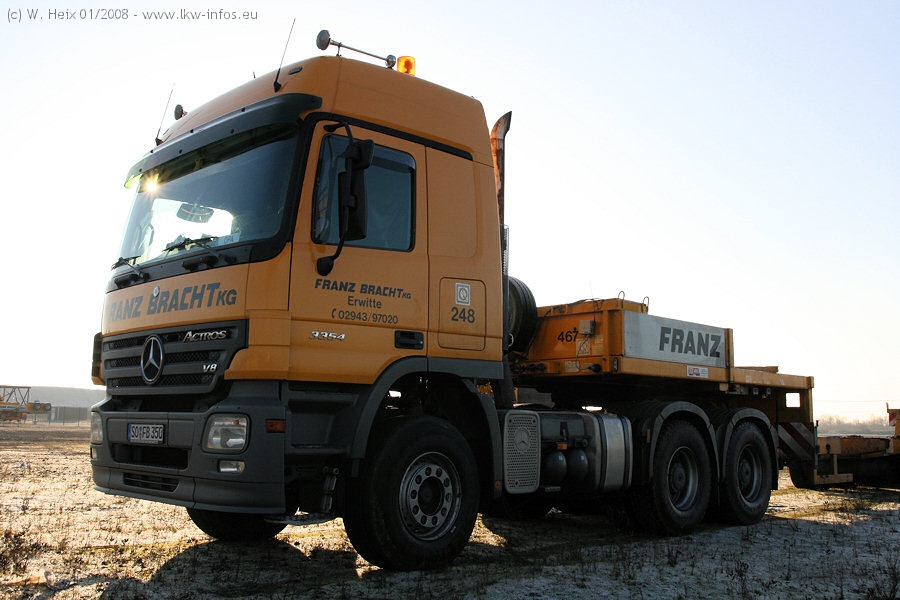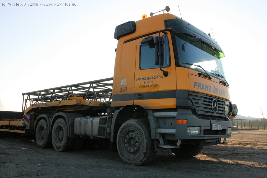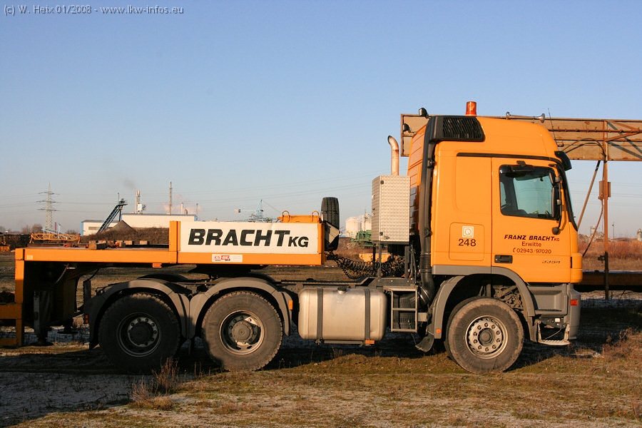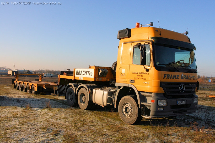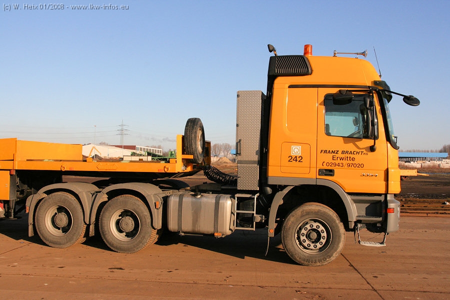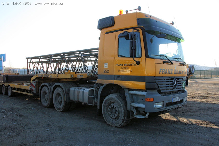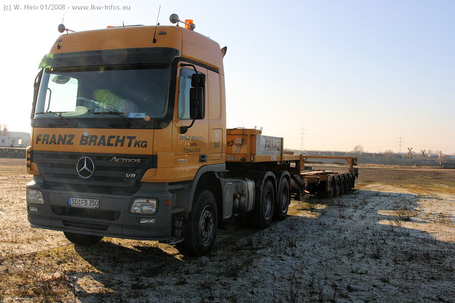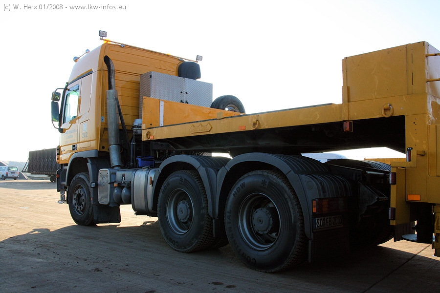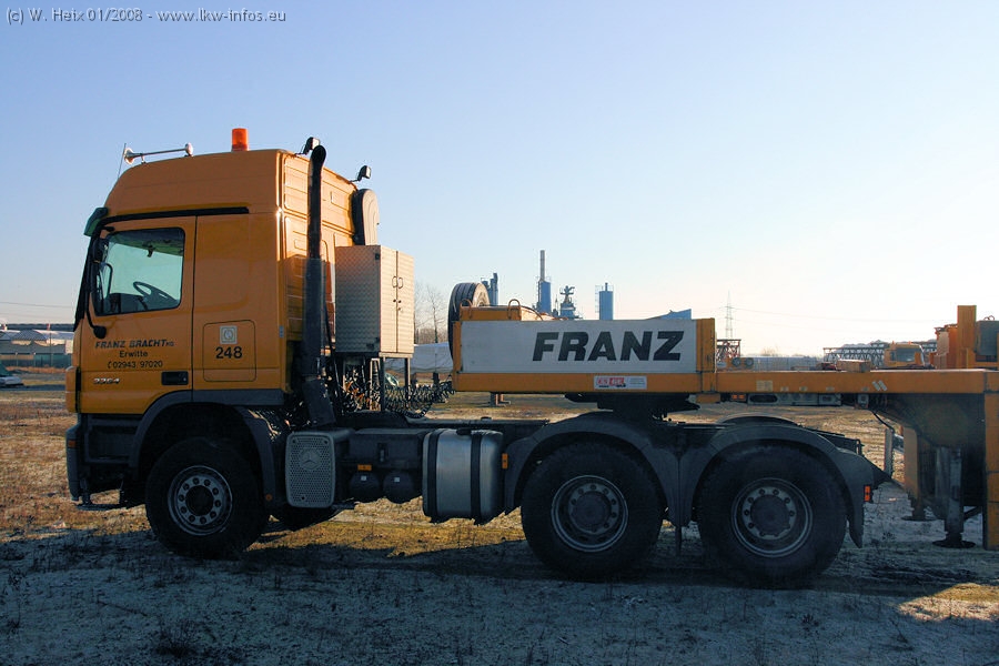 Am 02.01.2008 erreichte das Binnenschiff den Krefelder Hafen. Der Hub vom Schiff auf den Tieflader von Baumann erfolgte erneut durch den Big Rocky und den schon bekannten Gottwald AK 450-83 von Franz Bracht.. Der Hilfskran der Krefelder Bracht-Niederlassung war wieder identisch. Baumann war mit zwei Mercedes-Benz Actros 3360 SLT 6x6 und 20 Achslinien vor Ort. Die Fahrzeuge mussten vor dem Hub mehrfach umgesetzt werden, was man beim Betrachten der Bilder sieht. Auch das Schiff musste einmal drehen im Hafenbecken. Der anschließende Hub des 297 t schweren Vorwärmers verlief reibungslos. Am Abend gegen 22:00 Uhr startete Schwertransport Richtung Neurath. Die Bilder in den Teilen 1-3 zeigen alle Fahrzeuge aus verschiedenen Perspektiven, beladen und unbeladen sowie den Hub vom Schiff auf die Transporter.