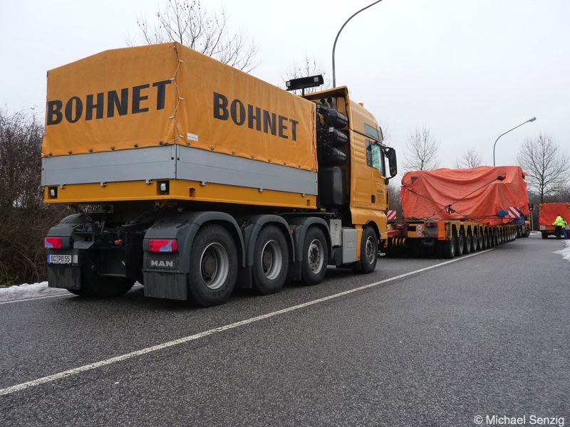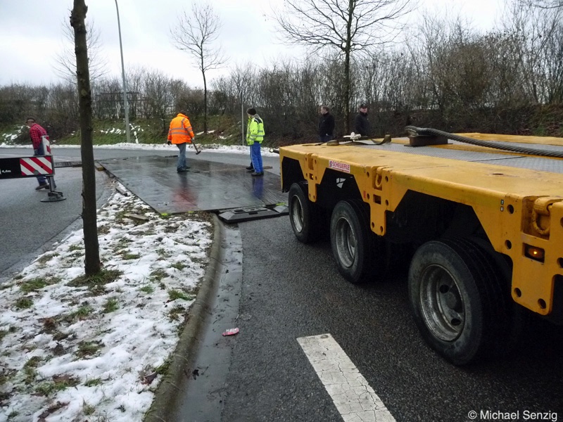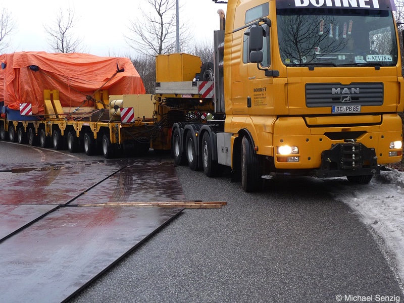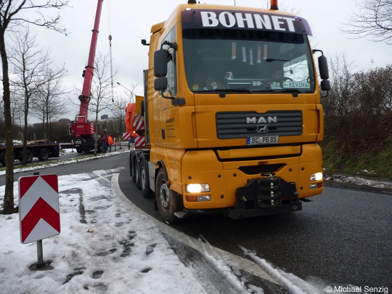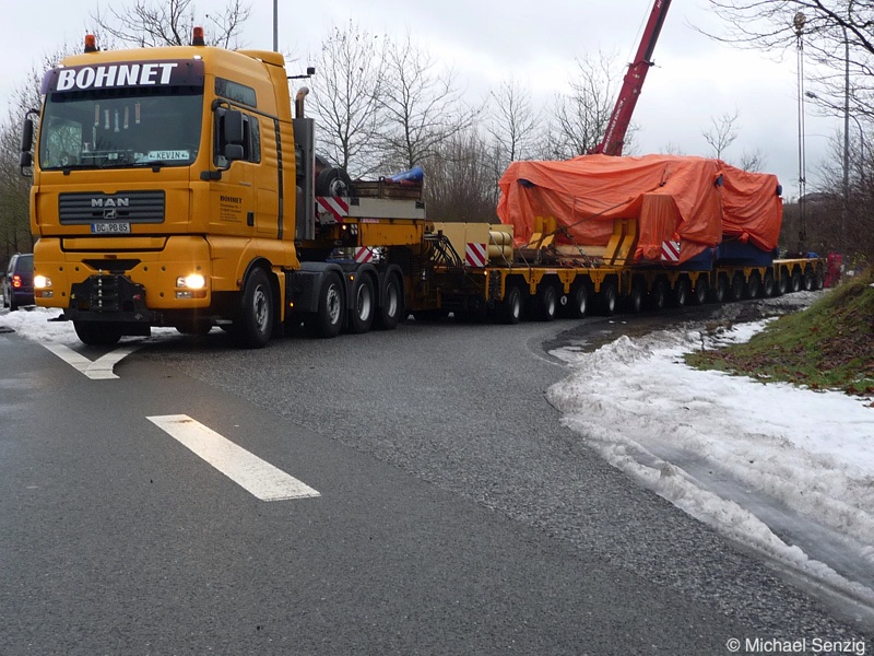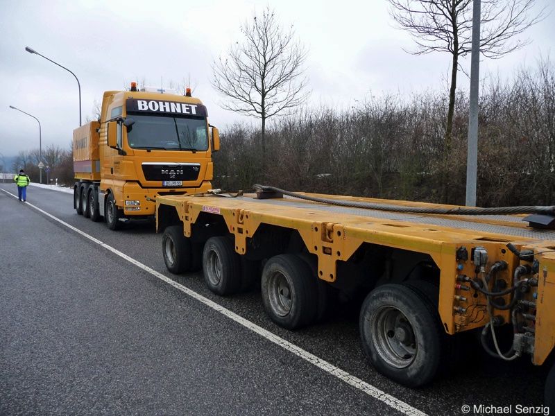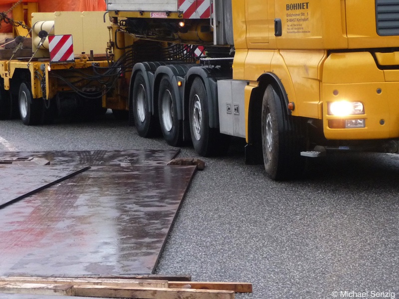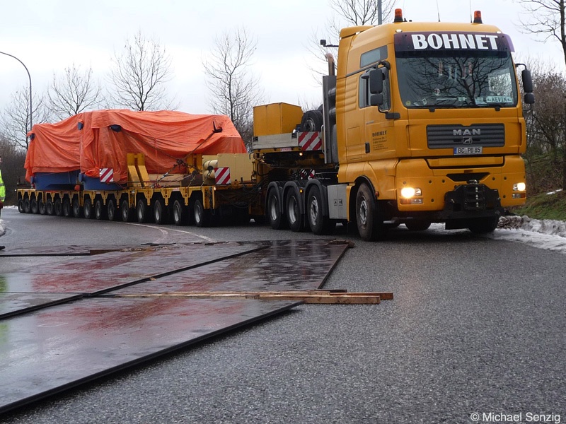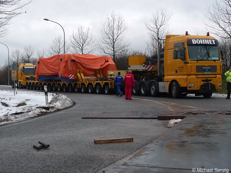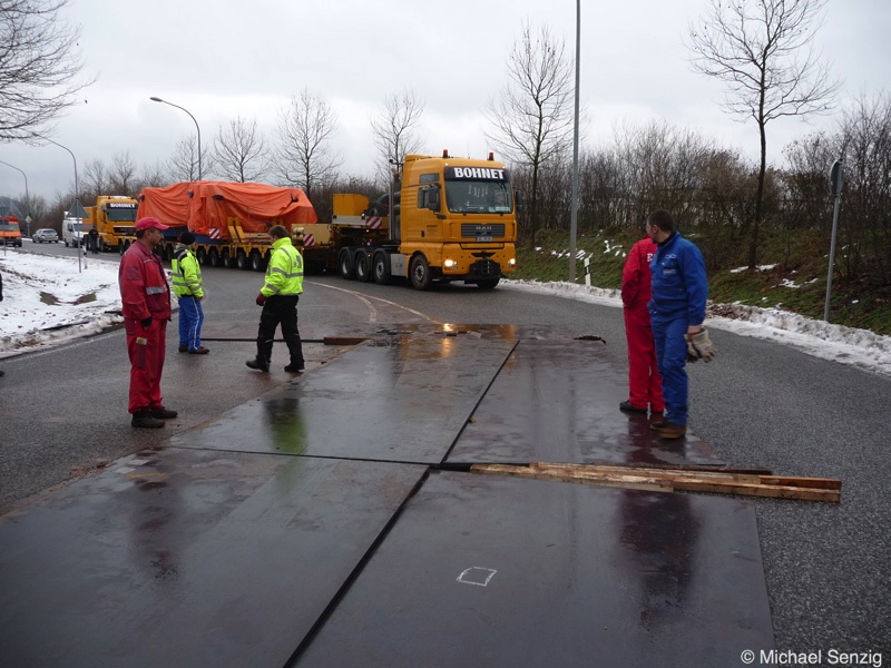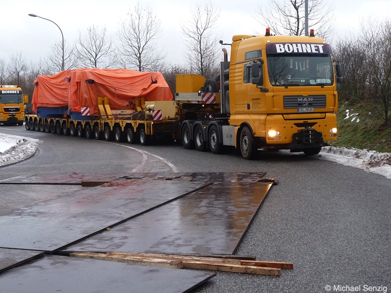 Am 23.12.2010 war Bohnet im saarländischen Saarlouis unterwegs. An einer engen Kreuzung musste eine Verkehrsinsel mit Stahlplatten ausgelegt werdem, damit der Schwertransport das Nadelöhr passieren konnte. Michael Senzig hat das beobachtet und die Fotos gemacht.