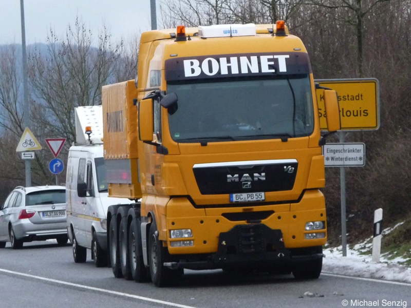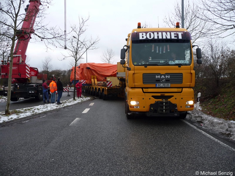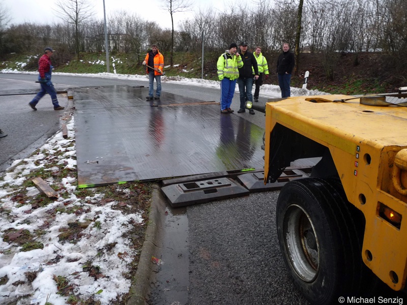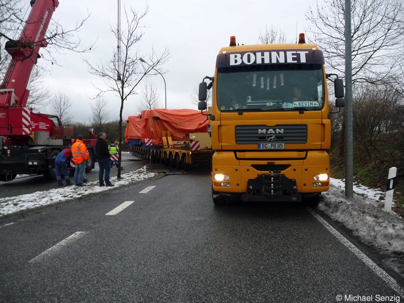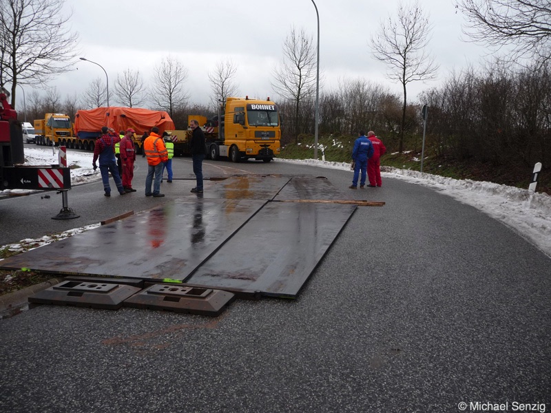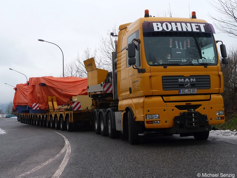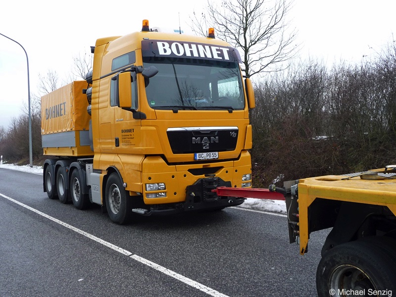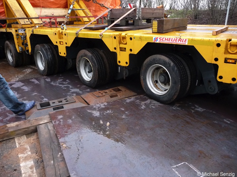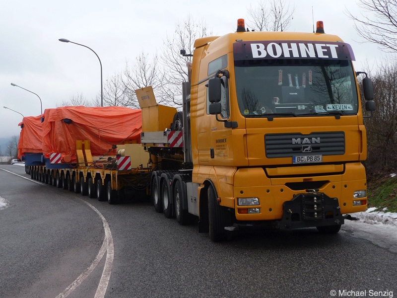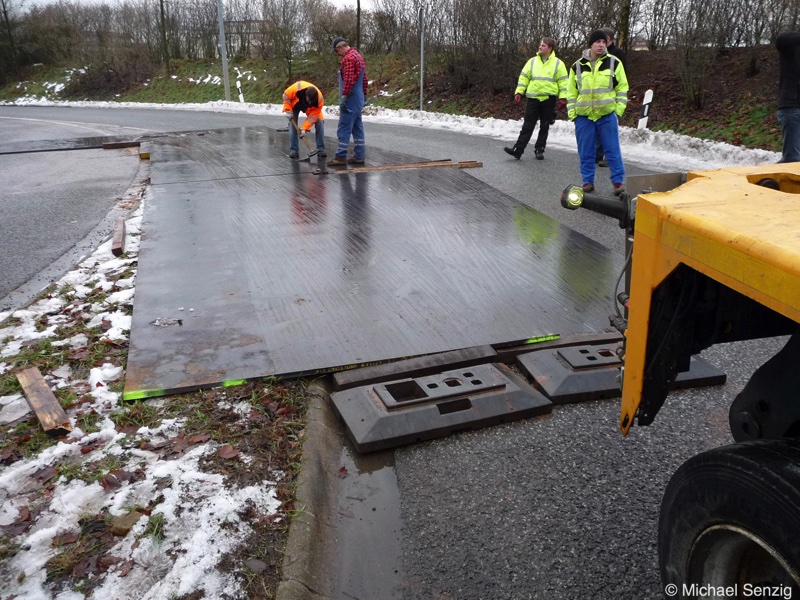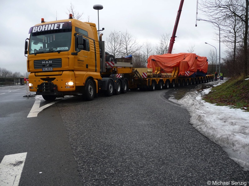 Am 23.12.2010 war Bohnet im saarländischen Saarlouis unterwegs. An einer engen Kreuzung musste eine Verkehrsinsel mit Stahlplatten ausgelegt werdem, damit der Schwertransport das Nadelöhr passieren konnte. Michael Senzig hat das beobachtet und die Fotos gemacht.