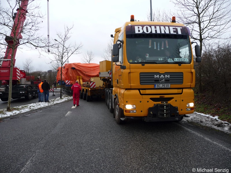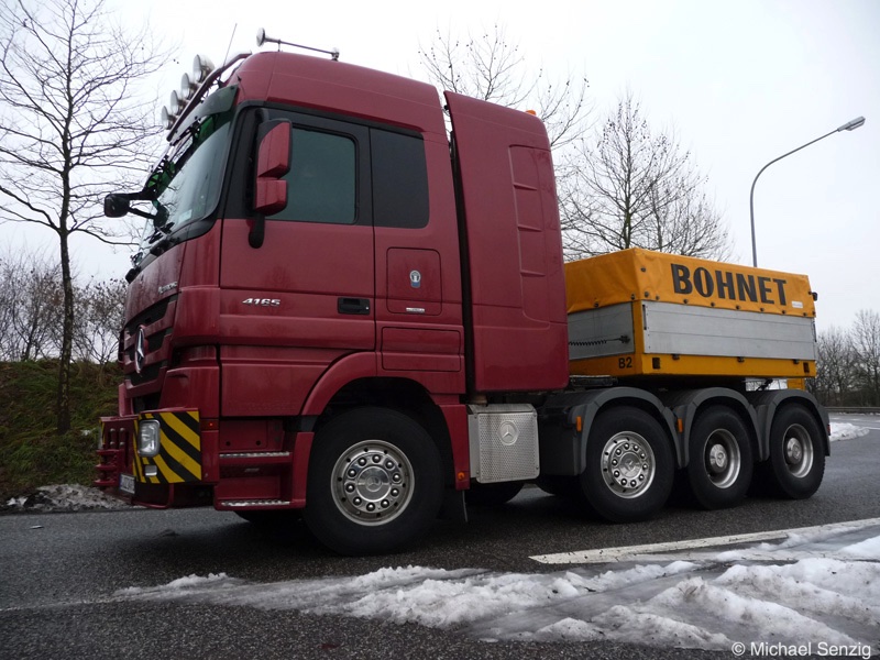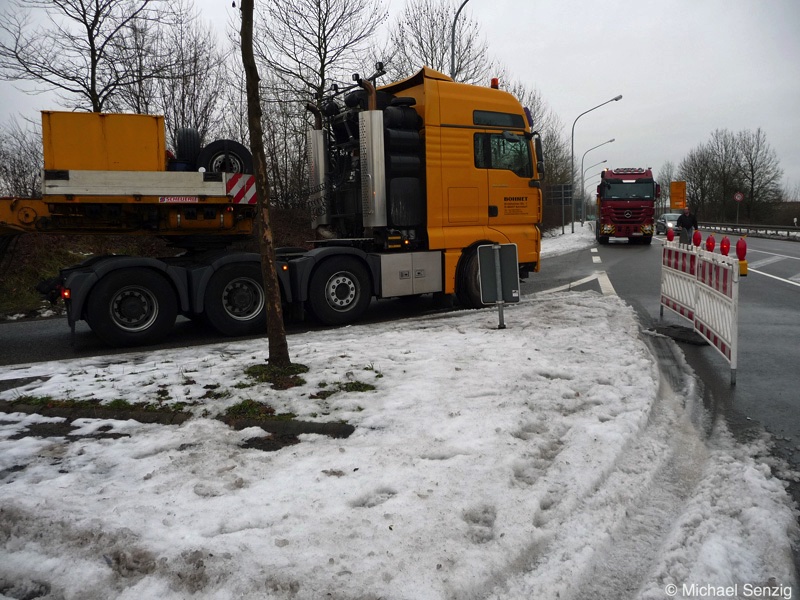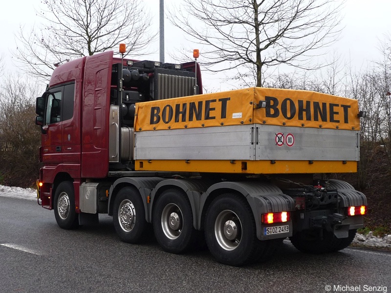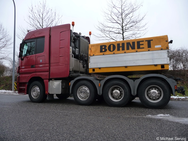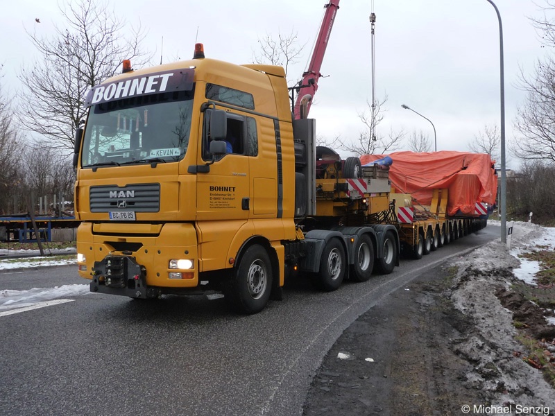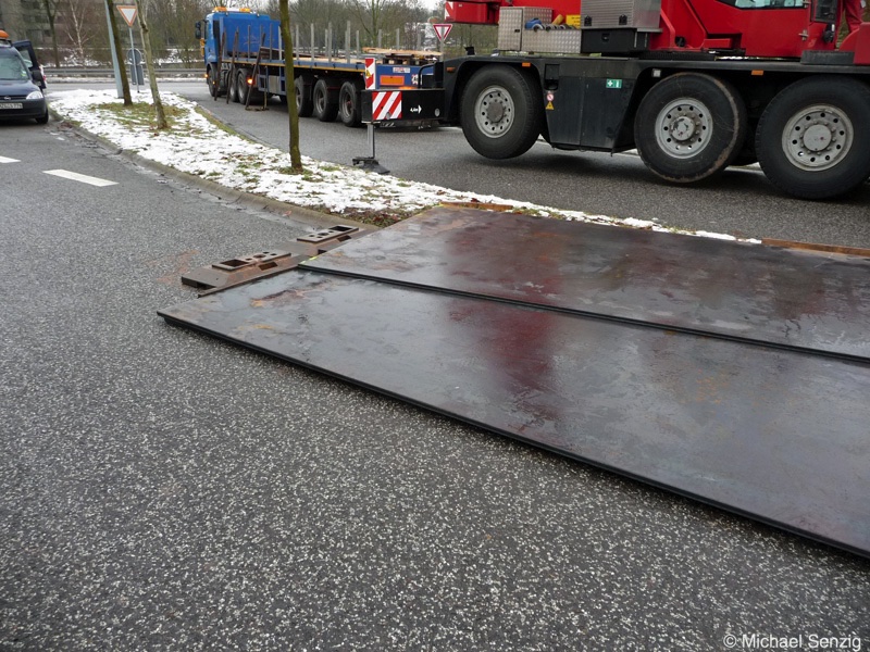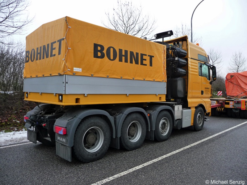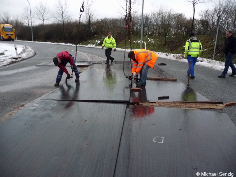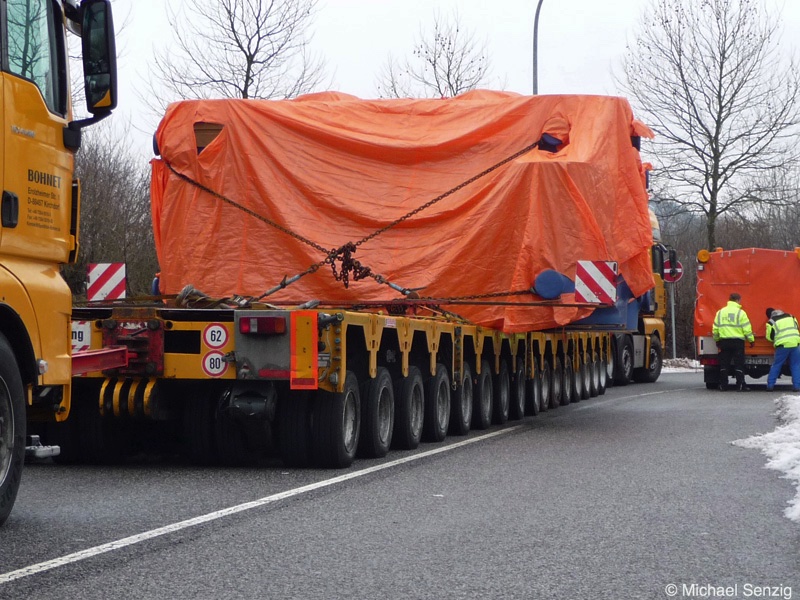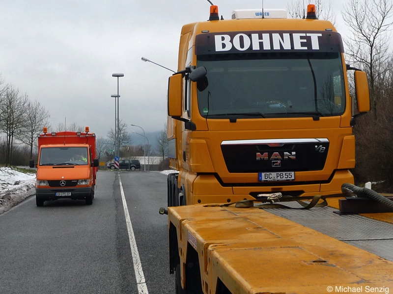 Am 23.12.2010 war Bohnet im saarländischen Saarlouis unterwegs. An einer engen Kreuzung musste eine Verkehrsinsel mit Stahlplatten ausgelegt werdem, damit der Schwertransport das Nadelöhr passieren konnte. Michael Senzig hat das beobachtet und die Fotos gemacht.