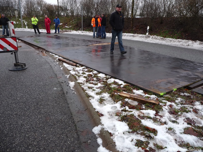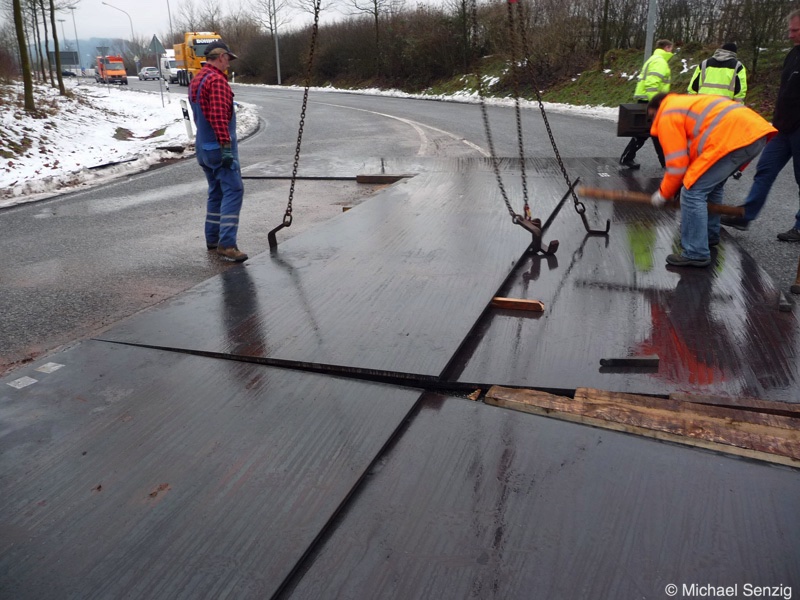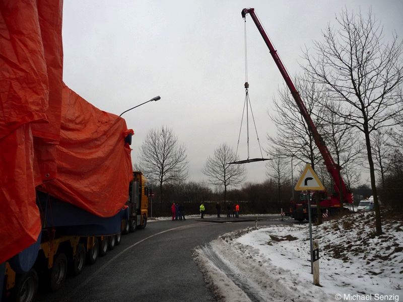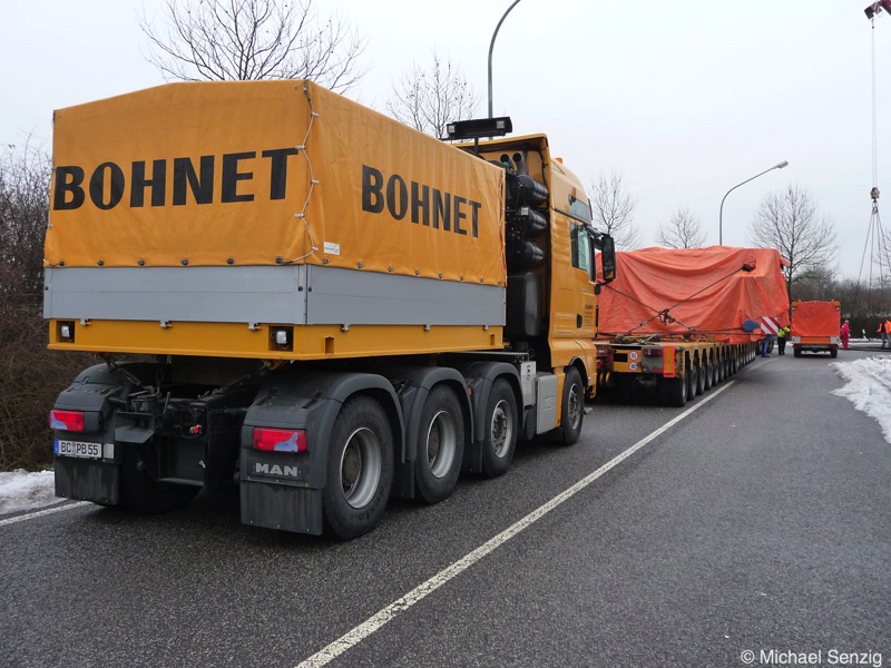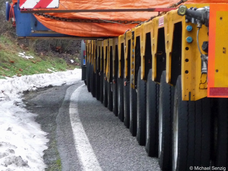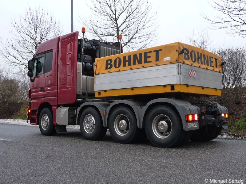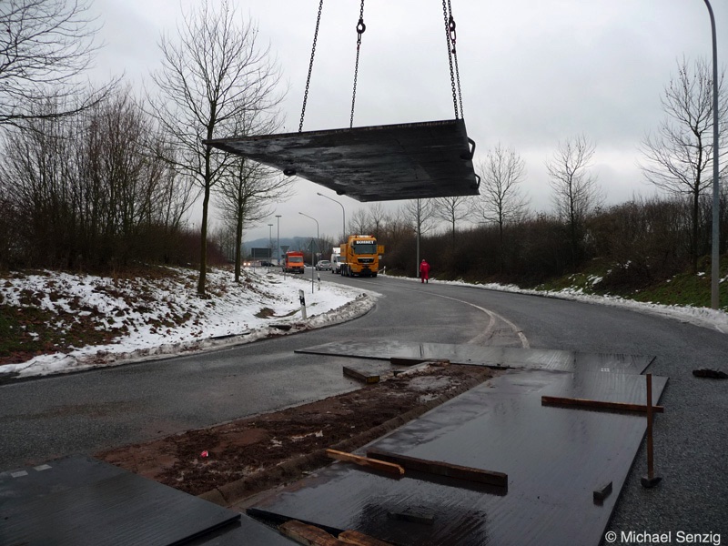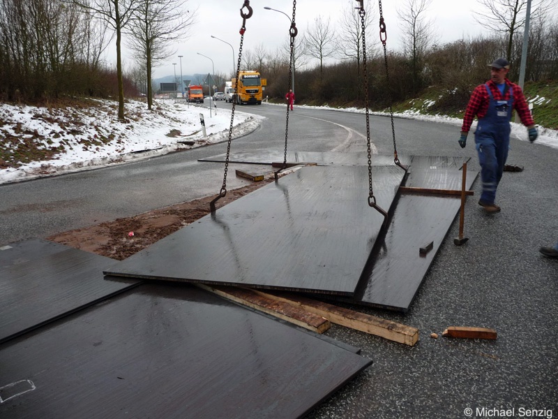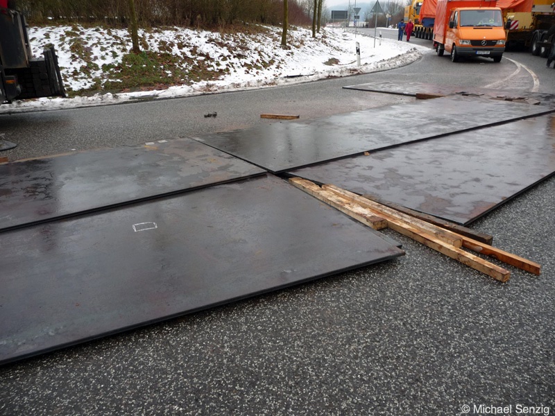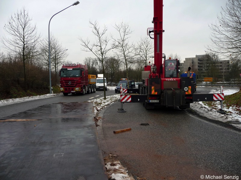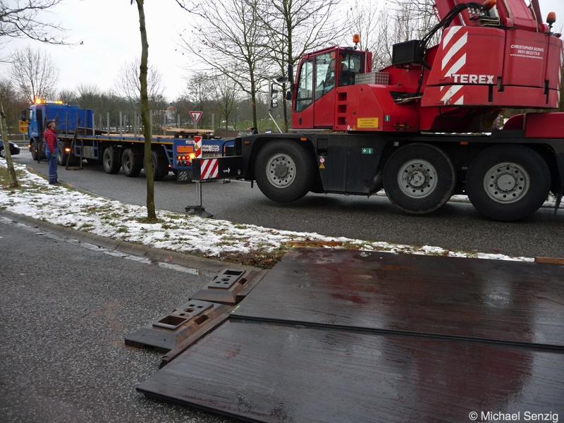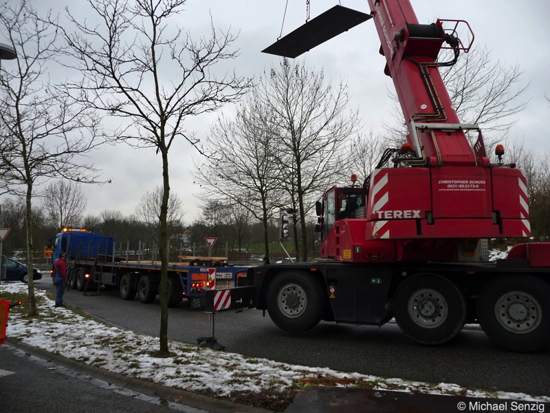 Am 23.12.2010 war Bohnet im saarländischen Saarlouis unterwegs. An einer engen Kreuzung musste eine Verkehrsinsel mit Stahlplatten ausgelegt werdem, damit der Schwertransport das Nadelöhr passieren konnte. Michael Senzig hat das beobachtet und die Fotos gemacht.