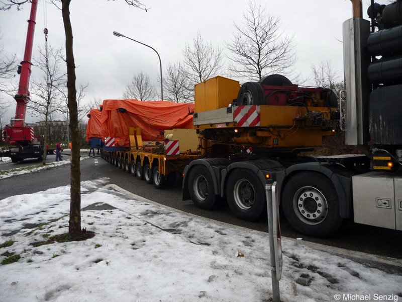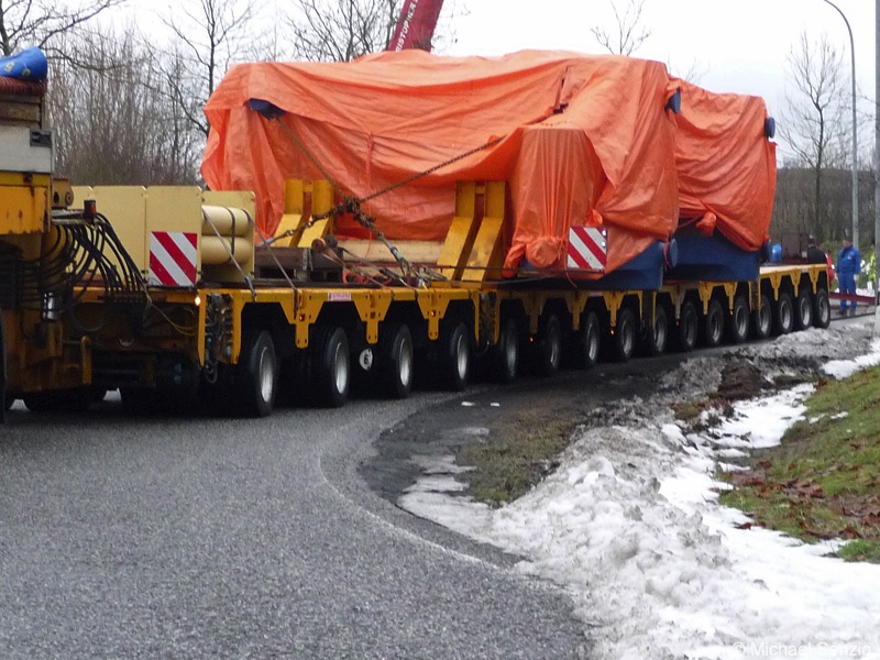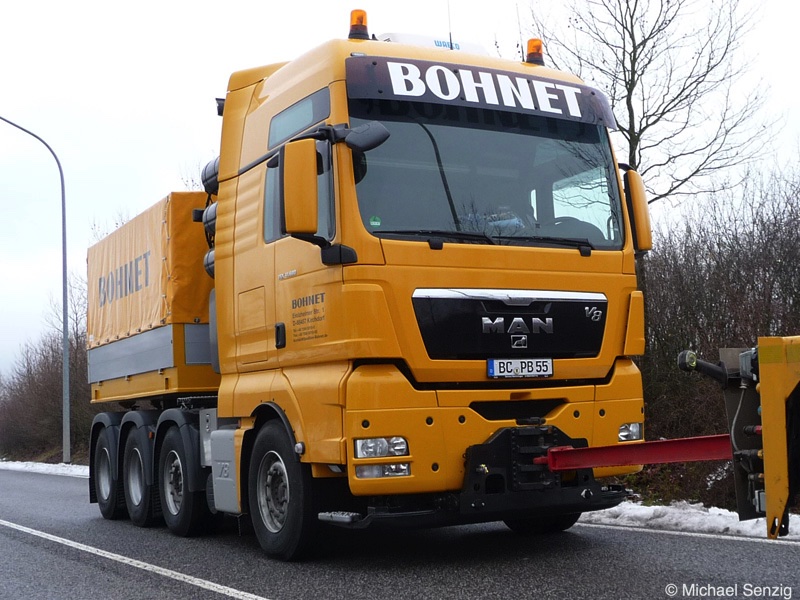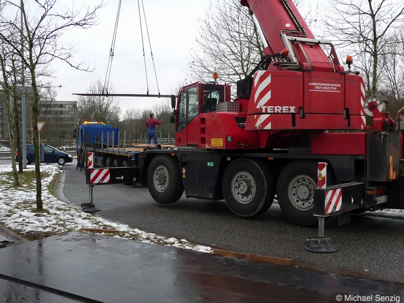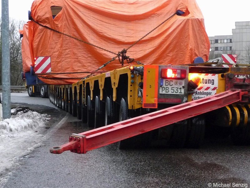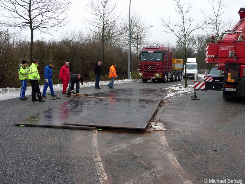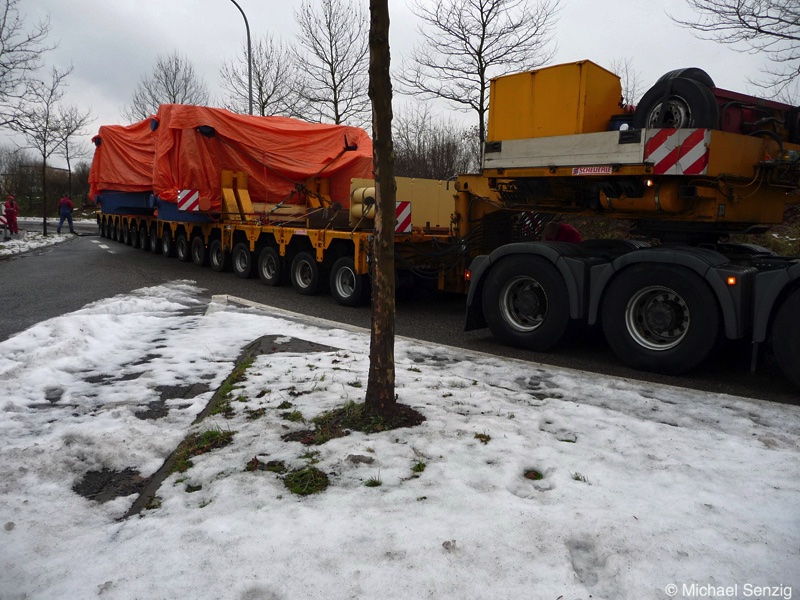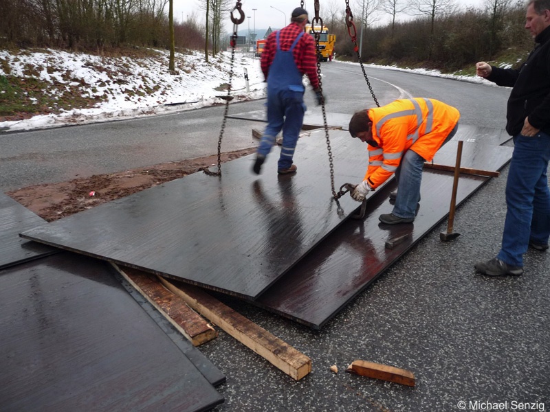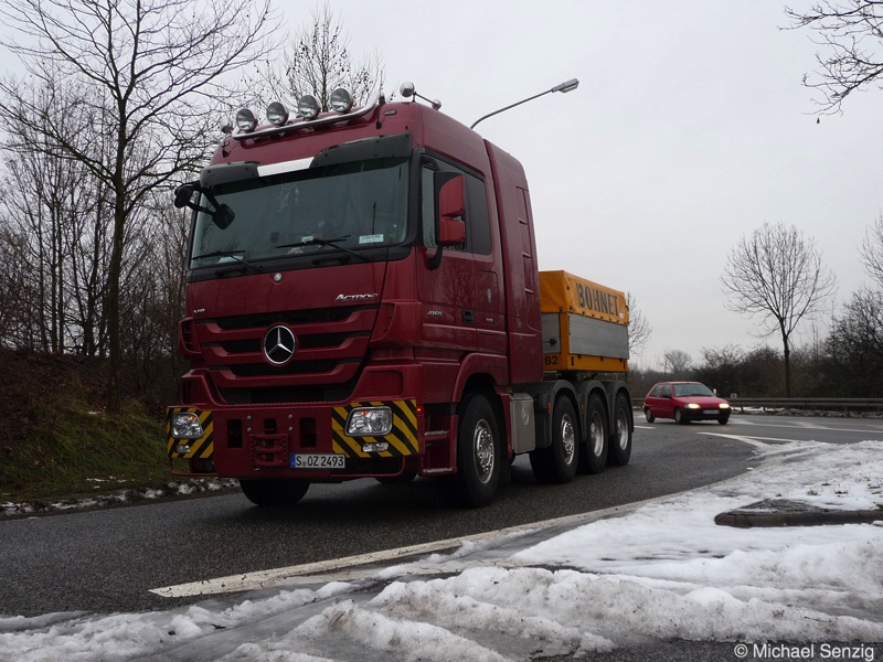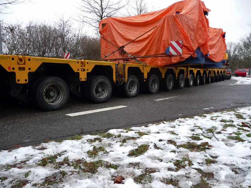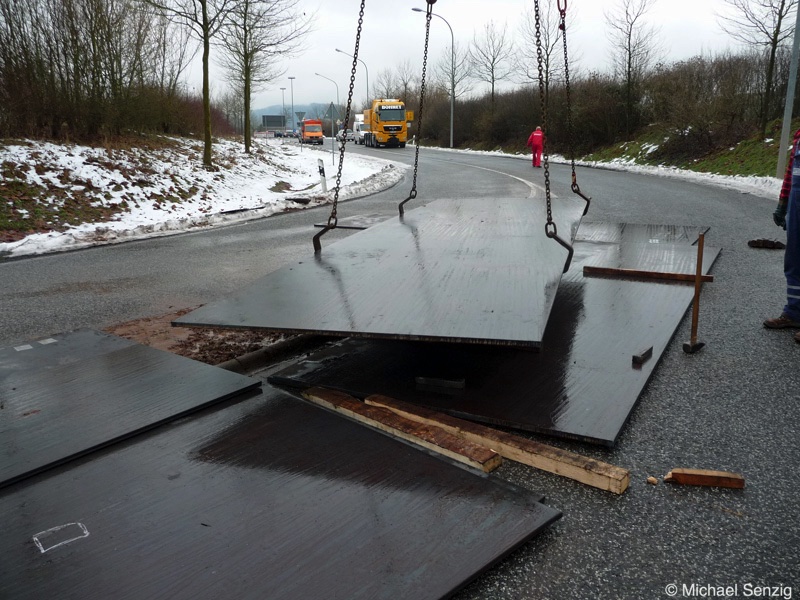 Am 23.12.2010 war Bohnet im saarländischen Saarlouis unterwegs. An einer engen Kreuzung musste eine Verkehrsinsel mit Stahlplatten ausgelegt werdem, damit der Schwertransport das Nadelöhr passieren konnte. Michael Senzig hat das beobachtet und die Fotos gemacht.