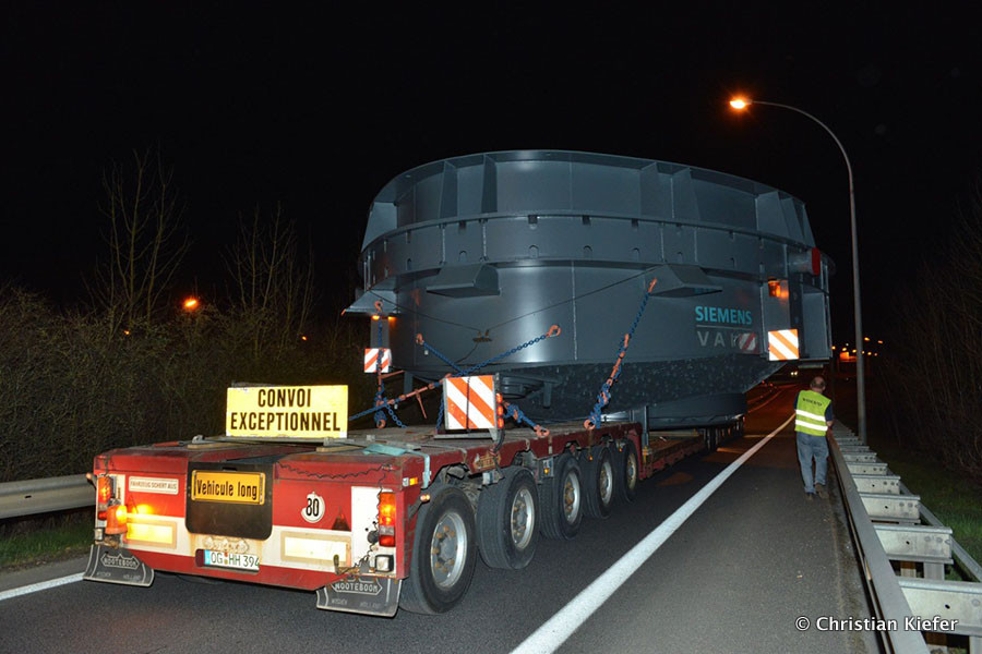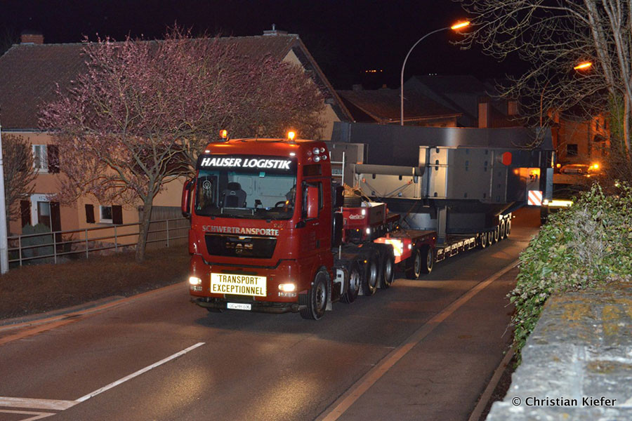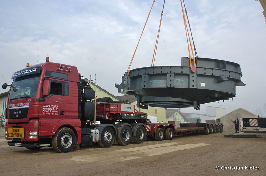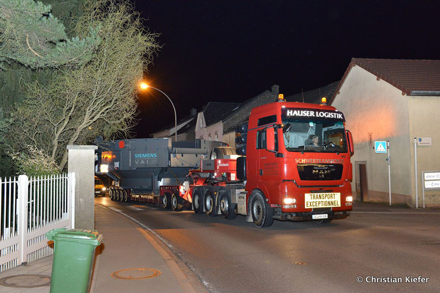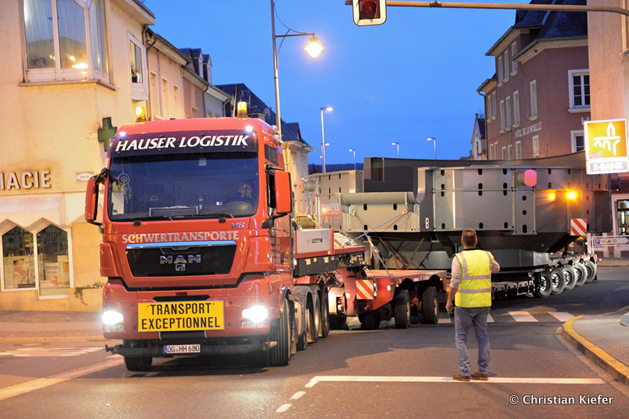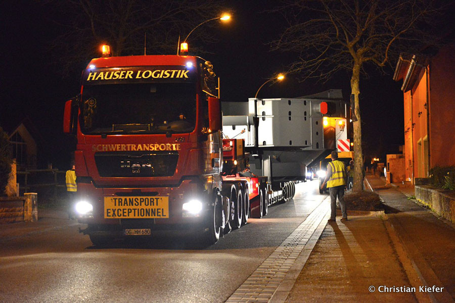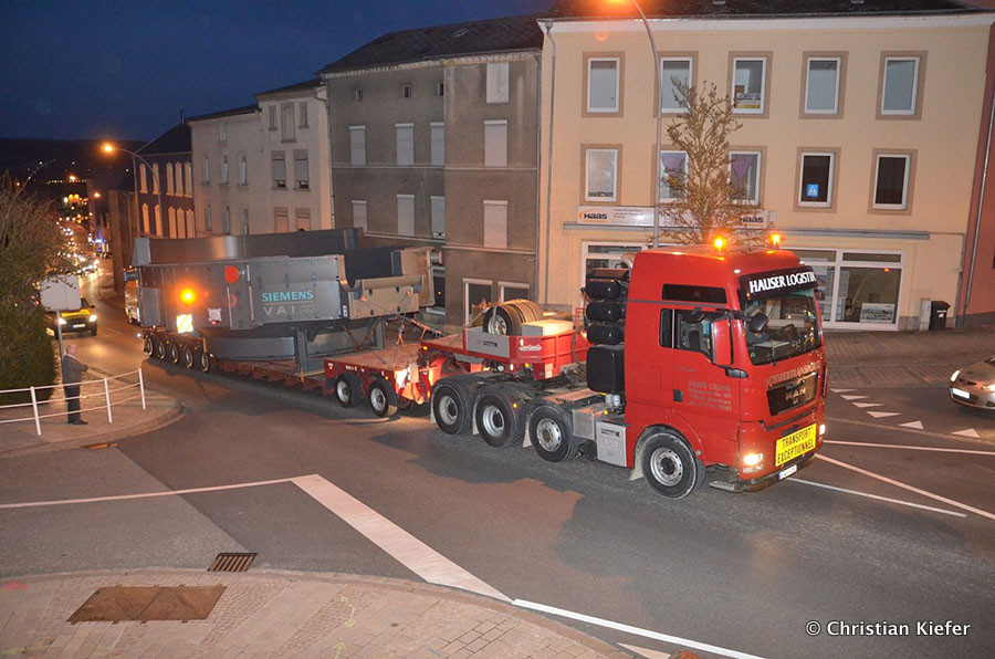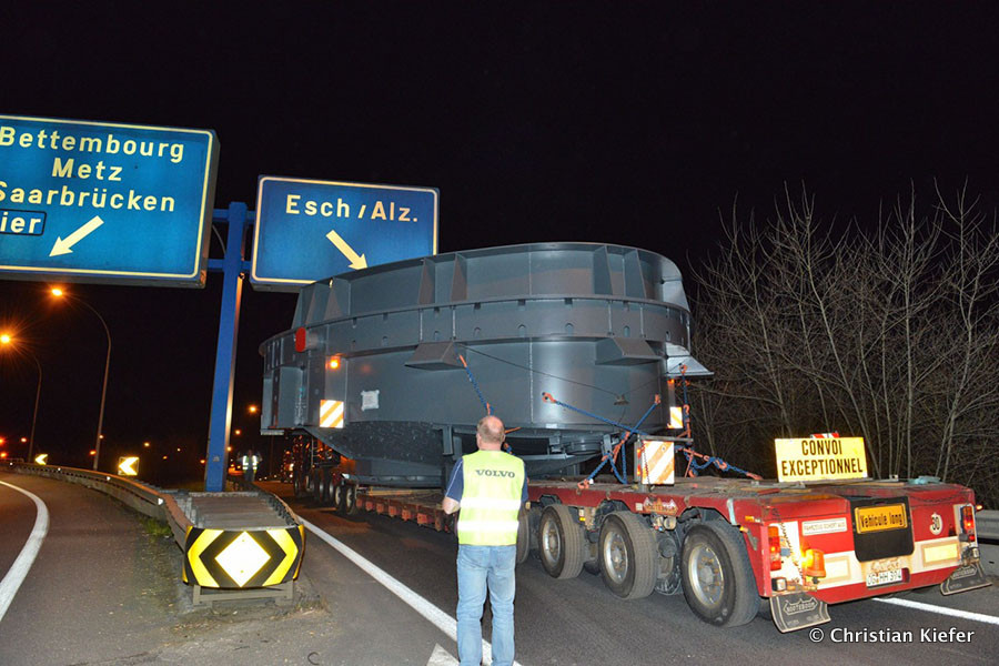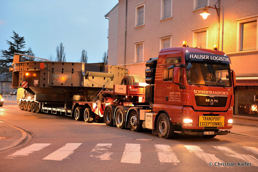 Am 17.04.2013 hat die Firma Hauser Logistik im Saarland ein schweres Hochofenteil transportiert. Die Bilder sind von Christian Kiefer, der Verladung und Transport beobachtet/begleitet hat.