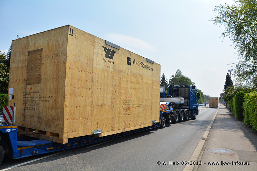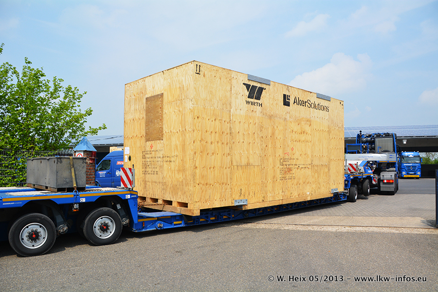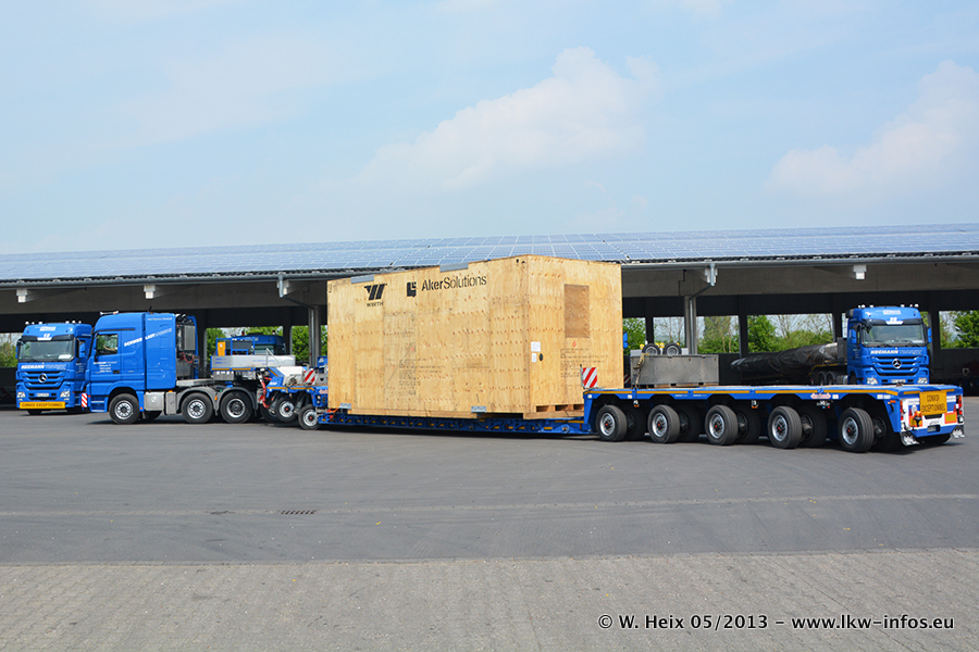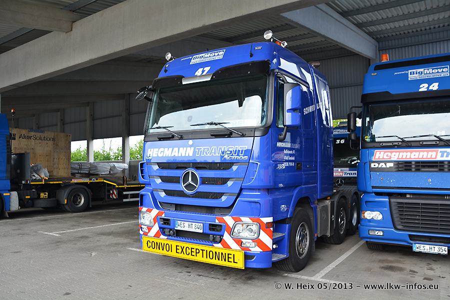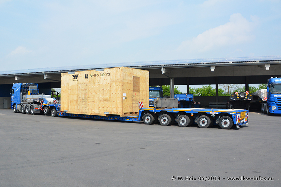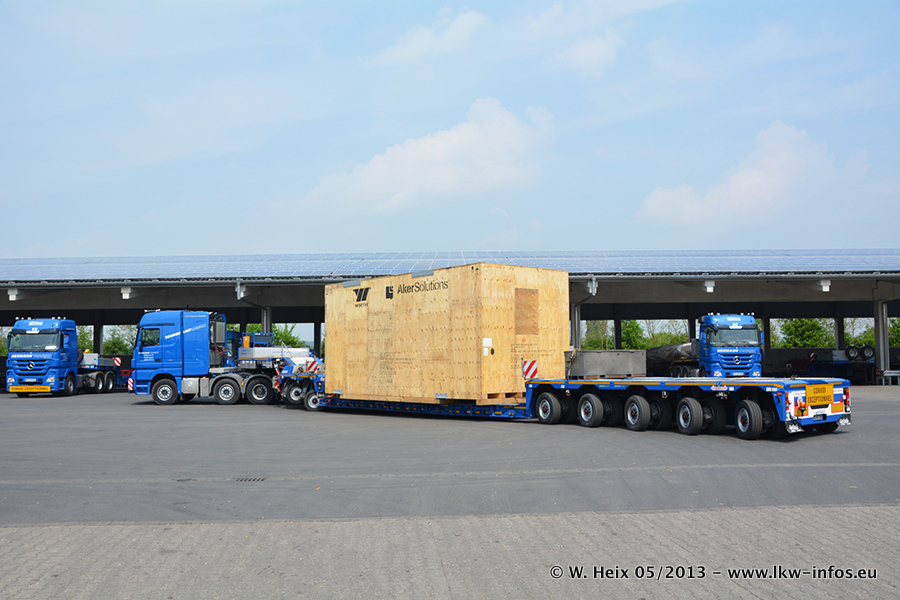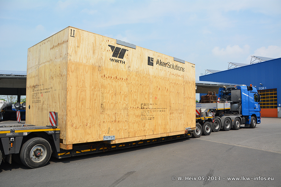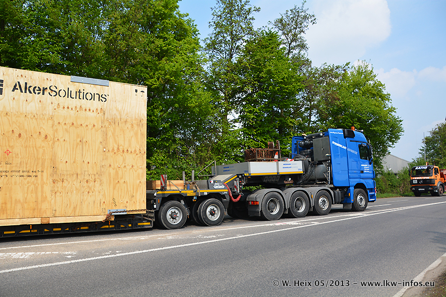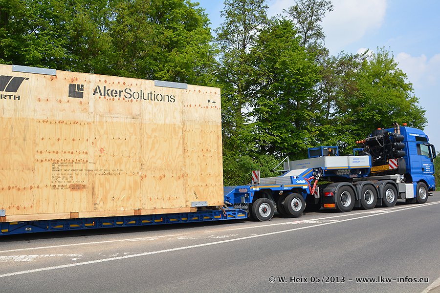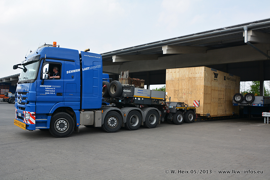 Am 08.05.2013 habe ich die Firma Hegmann Transit wieder auf einer Tagestour begleitet: Bei der Firma Aker Wirth GmbH in Erkelenz waren drei Kisten zu laden mit drei Pumpen, die nach China exportiert werden. Die drei Kisten wogen jeweils ca. 45 Tonnen und hatten die Maße (B x H x T) 760 x 355 x 370 cm. Bestimmungsort für Hegmann Transit ist der Hafen Rotterdam (NL). Von dort gehen die Kisten per Schiff weiter nach China. Gefahren wurden die Pumpen mit dem MAN TGX 41.680, dem MB Actros 3 4165 SLT und einem MB Actros 3 4160 SLT, jeweils mit Aufliegern von Nooteboom. Da auf dem Werksgelände nicht fotografiert werden durfte, konnte ich von der Verladung der Kisten leider keine Bilder machen. Breuer & Wasel war mit einem Liebherr LTM da. (Es gibt vom Kran und dem Ballast-Transporter ein paar Bilder, die ich außerhalb vom Werksgelände machen konnte.. Glücklicherweise wurden Ladungssicherung und Abnahme der Transporte außerhalb des Werksgeländes gemacht, so konnte ich entsprechende Bilder machen. Es ergab sich auch die Möglichkeit, auf dem Weg zur Autobahn noch eine Reihe schöne Aufnahmen zu machen. Abgerundet wird meine Fotoreportage von Bildern der Transporte bei der Ankunft auf dem Firmenhof in Sonsbeck.