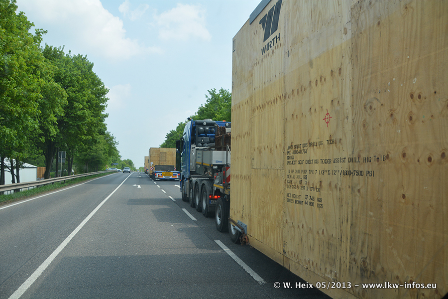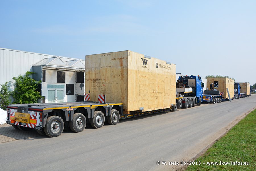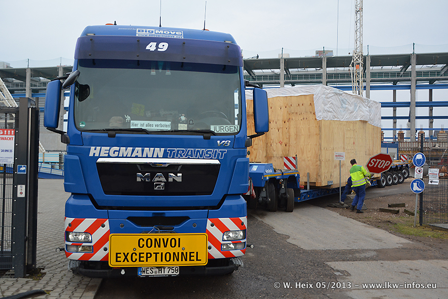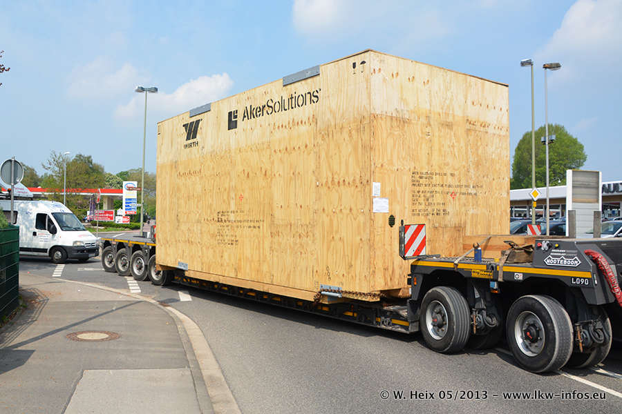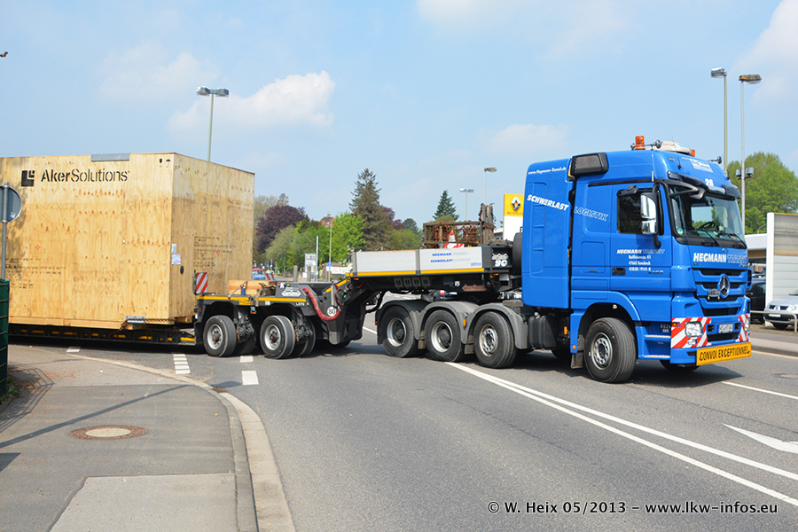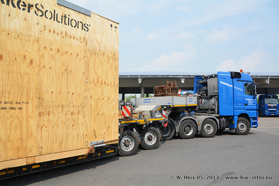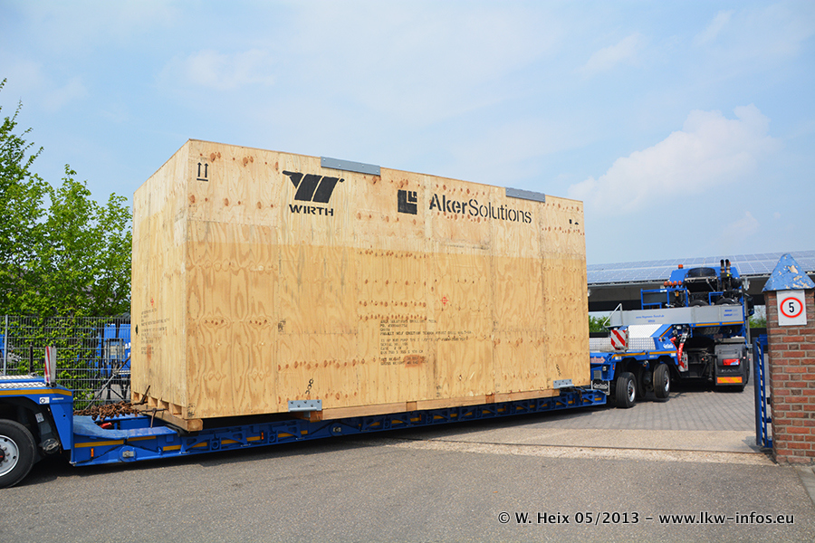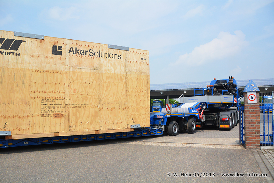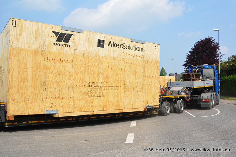 Am 08.05.2013 habe ich die Firma Hegmann Transit wieder auf einer Tagestour begleitet: Bei der Firma Aker Wirth GmbH in Erkelenz waren drei Kisten zu laden mit drei Pumpen, die nach China exportiert werden. Die drei Kisten wogen jeweils ca. 45 Tonnen und hatten die Maße (B x H x T) 760 x 355 x 370 cm. Bestimmungsort für Hegmann Transit ist der Hafen Rotterdam (NL). Von dort gehen die Kisten per Schiff weiter nach China. Gefahren wurden die Pumpen mit dem MAN TGX 41.680, dem MB Actros 3 4165 SLT und einem MB Actros 3 4160 SLT, jeweils mit Aufliegern von Nooteboom. Da auf dem Werksgelände nicht fotografiert werden durfte, konnte ich von der Verladung der Kisten leider keine Bilder machen. Breuer & Wasel war mit einem Liebherr LTM da. (Es gibt vom Kran und dem Ballast-Transporter ein paar Bilder, die ich außerhalb vom Werksgelände machen konnte.. Glücklicherweise wurden Ladungssicherung und Abnahme der Transporte außerhalb des Werksgeländes gemacht, so konnte ich entsprechende Bilder machen. Es ergab sich auch die Möglichkeit, auf dem Weg zur Autobahn noch eine Reihe schöne Aufnahmen zu machen. Abgerundet wird meine Fotoreportage von Bildern der Transporte bei der Ankunft auf dem Firmenhof in Sonsbeck.