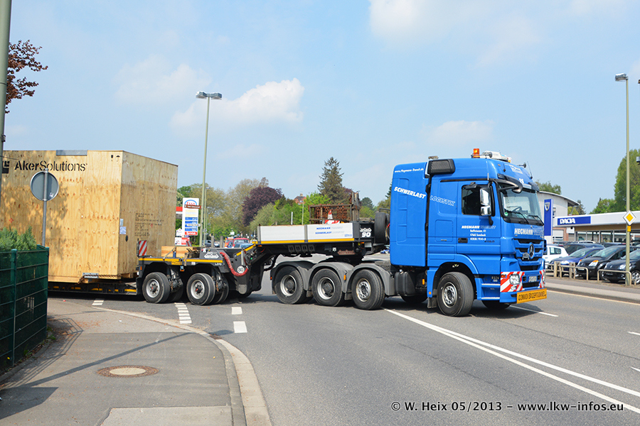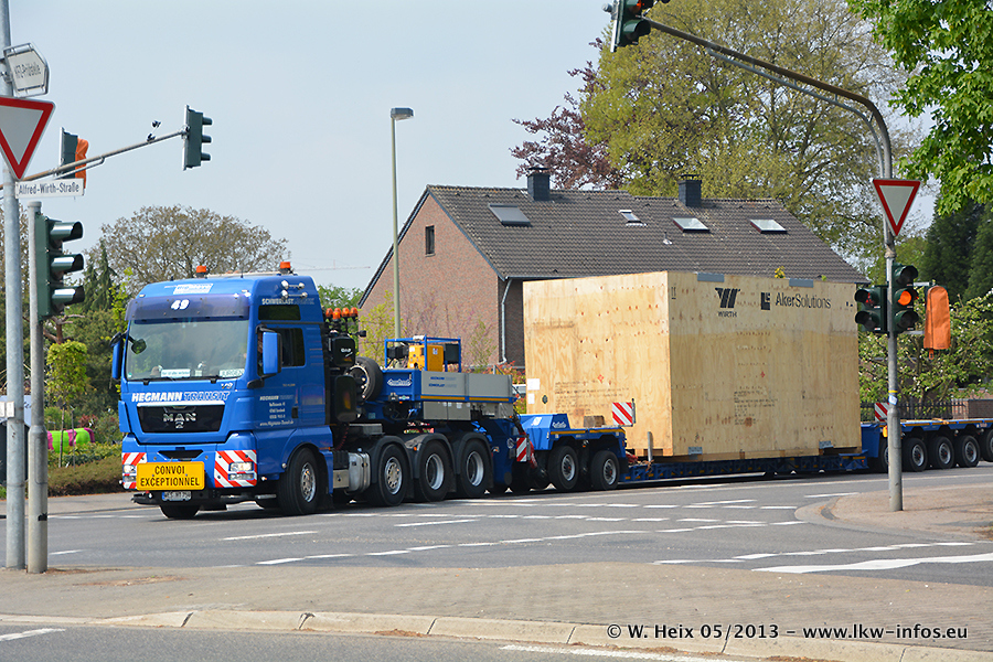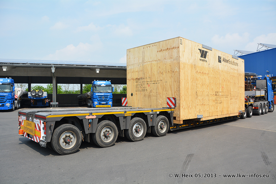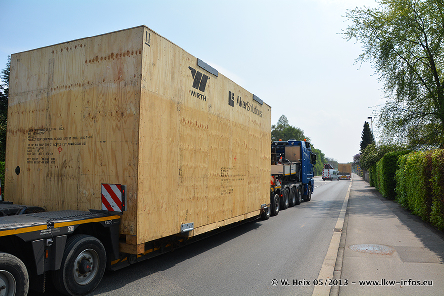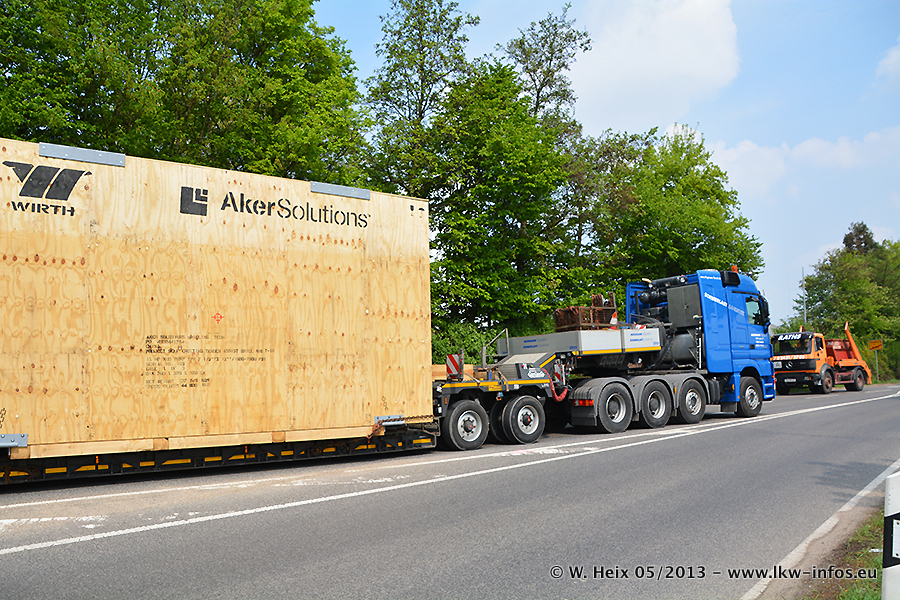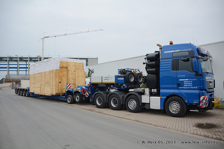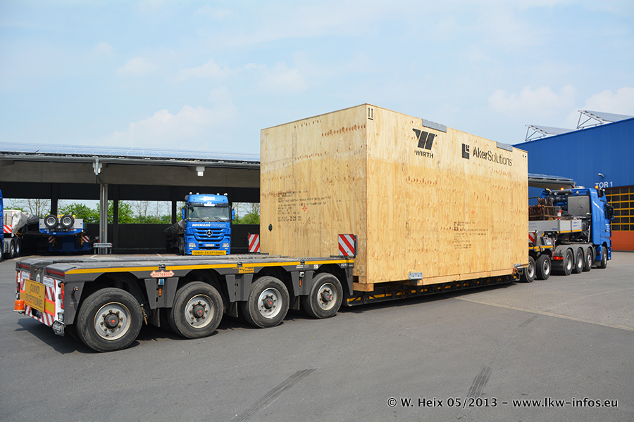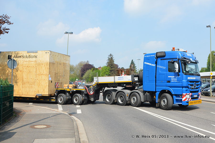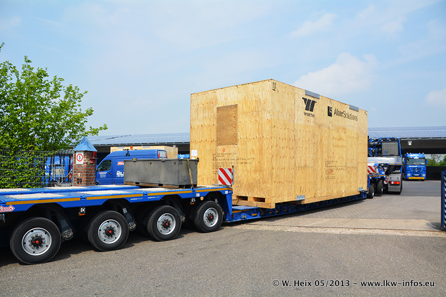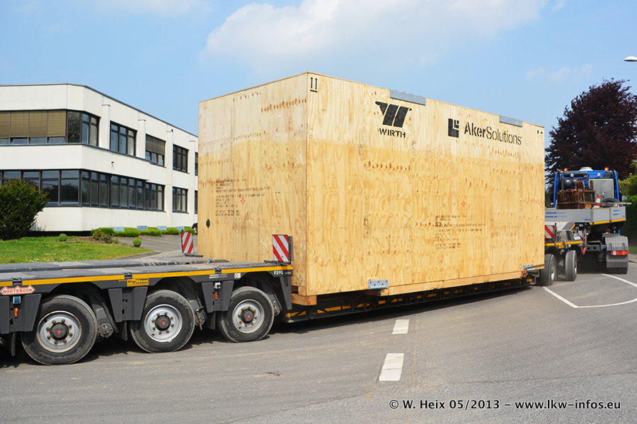 Am 08.05.2013 habe ich die Firma Hegmann Transit wieder auf einer Tagestour begleitet: Bei der Firma Aker Wirth GmbH in Erkelenz waren drei Kisten zu laden mit drei Pumpen, die nach China exportiert werden. Die drei Kisten wogen jeweils ca. 45 Tonnen und hatten die Maße (B x H x T) 760 x 355 x 370 cm. Bestimmungsort für Hegmann Transit ist der Hafen Rotterdam (NL). Von dort gehen die Kisten per Schiff weiter nach China. Gefahren wurden die Pumpen mit dem MAN TGX 41.680, dem MB Actros 3 4165 SLT und einem MB Actros 3 4160 SLT, jeweils mit Aufliegern von Nooteboom. Da auf dem Werksgelände nicht fotografiert werden durfte, konnte ich von der Verladung der Kisten leider keine Bilder machen. Breuer & Wasel war mit einem Liebherr LTM da. (Es gibt vom Kran und dem Ballast-Transporter ein paar Bilder, die ich außerhalb vom Werksgelände machen konnte.. Glücklicherweise wurden Ladungssicherung und Abnahme der Transporte außerhalb des Werksgeländes gemacht, so konnte ich entsprechende Bilder machen. Es ergab sich auch die Möglichkeit, auf dem Weg zur Autobahn noch eine Reihe schöne Aufnahmen zu machen. Abgerundet wird meine Fotoreportage von Bildern der Transporte bei der Ankunft auf dem Firmenhof in Sonsbeck.