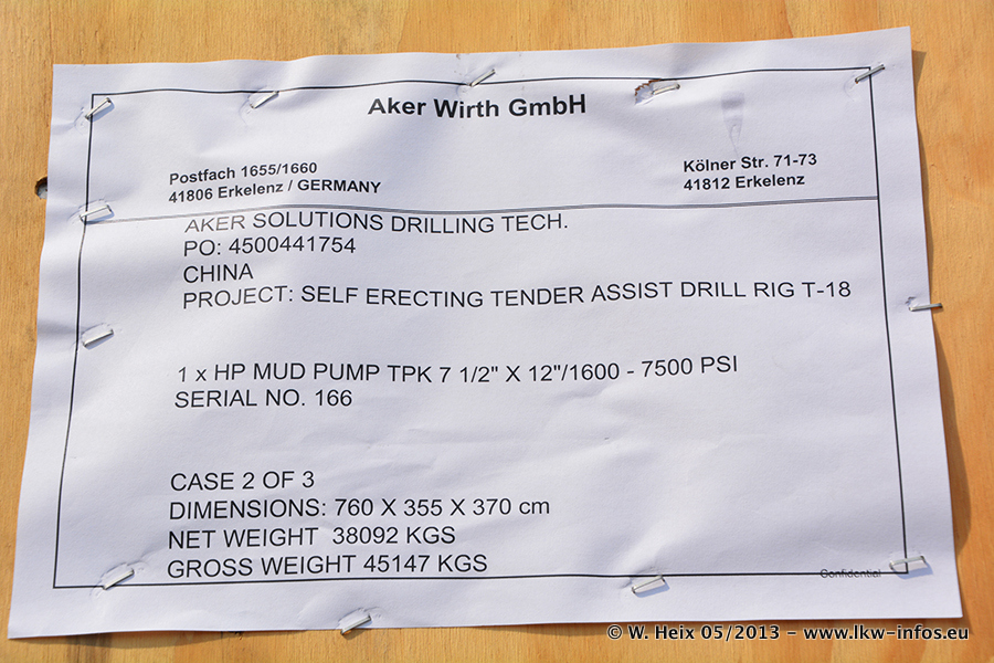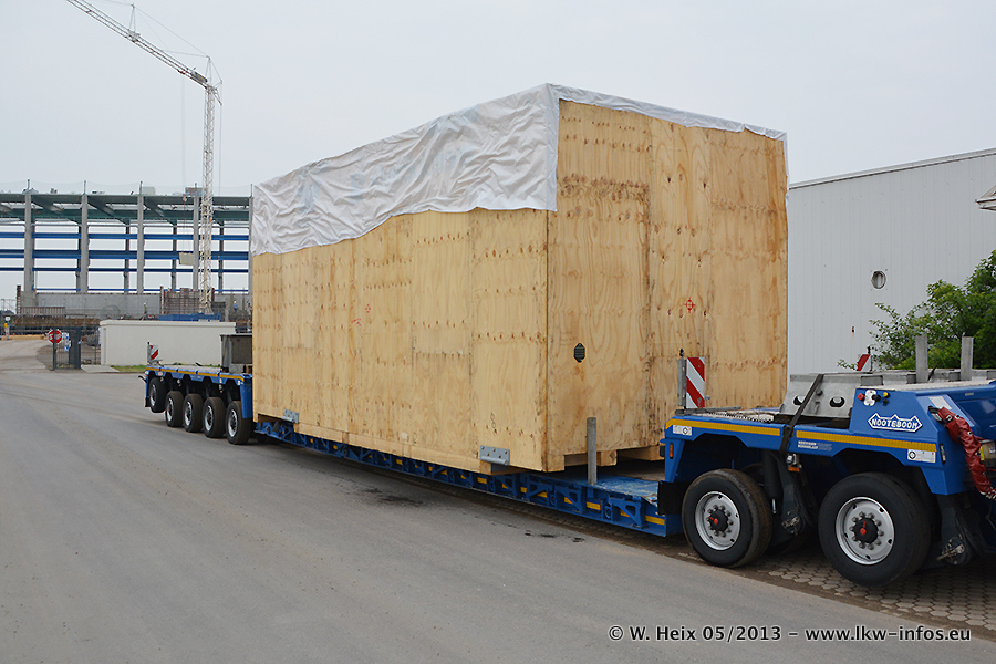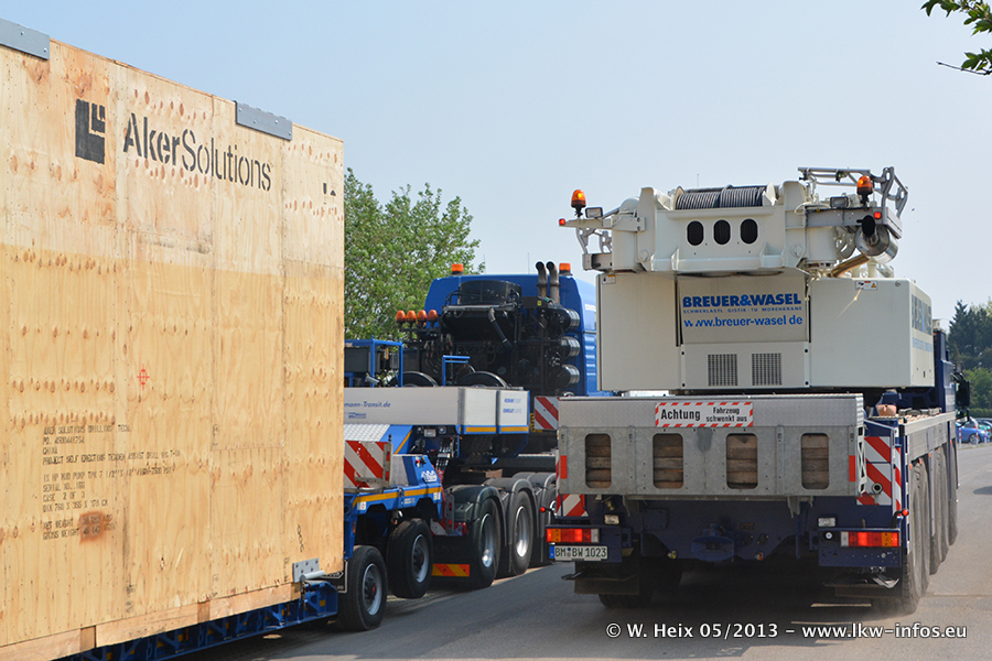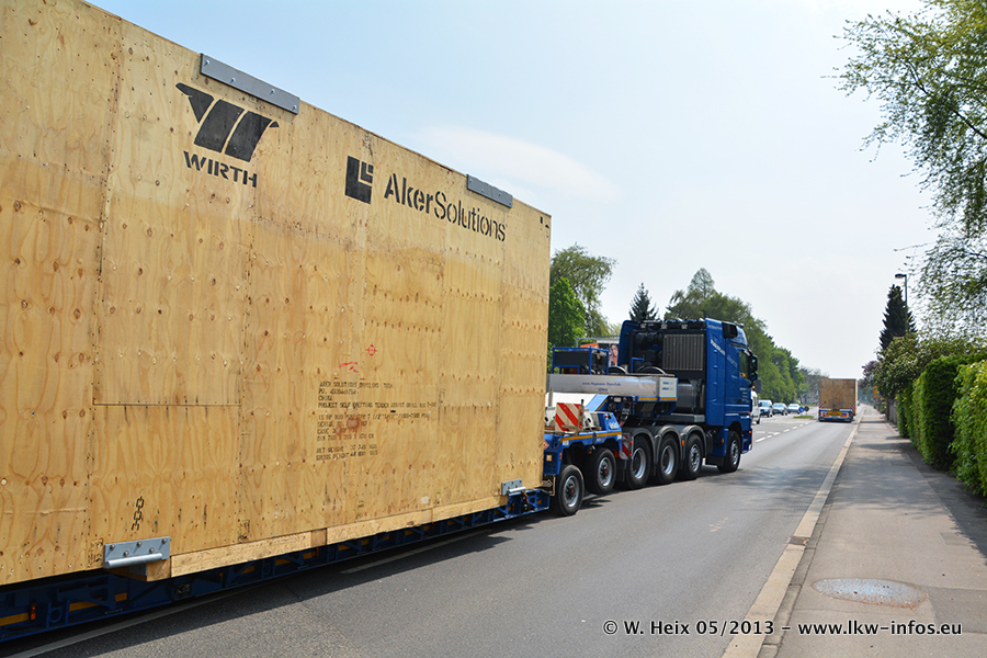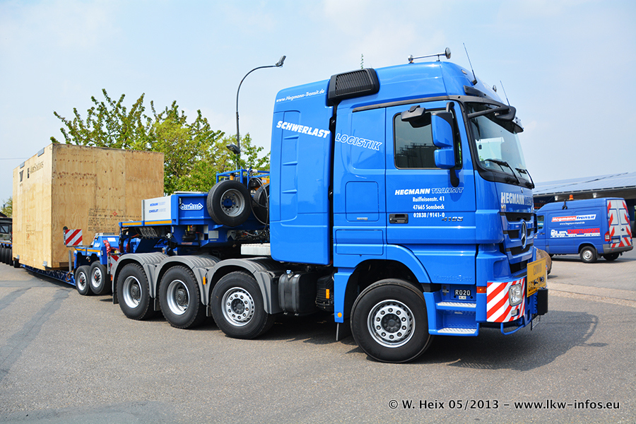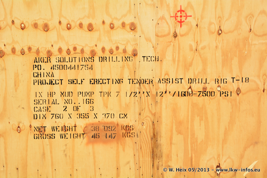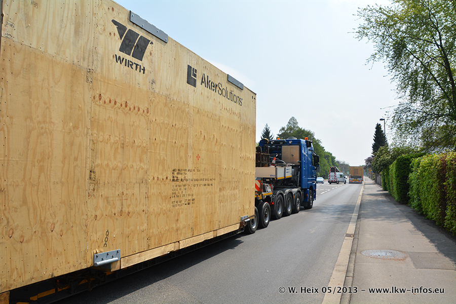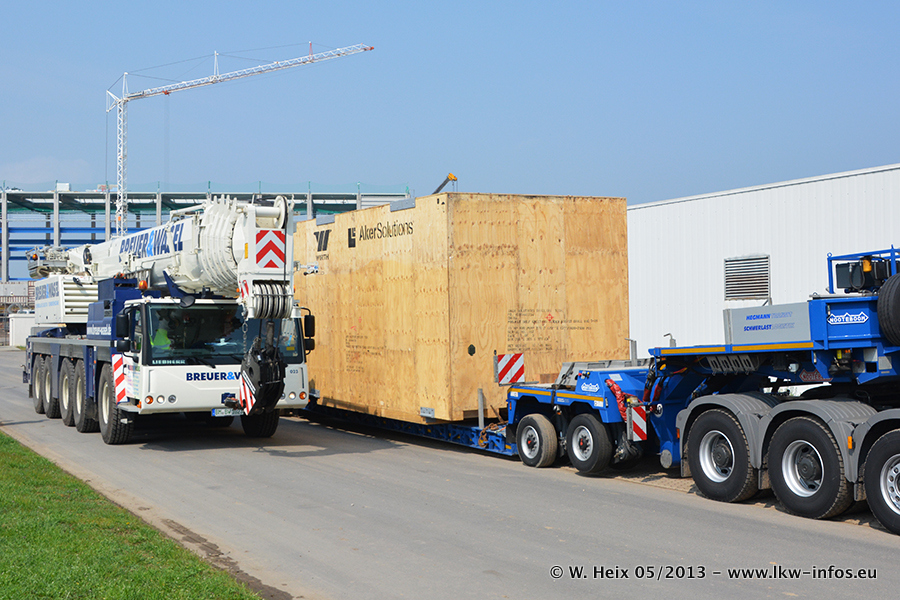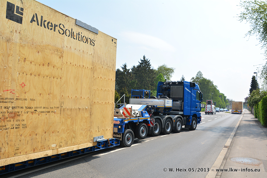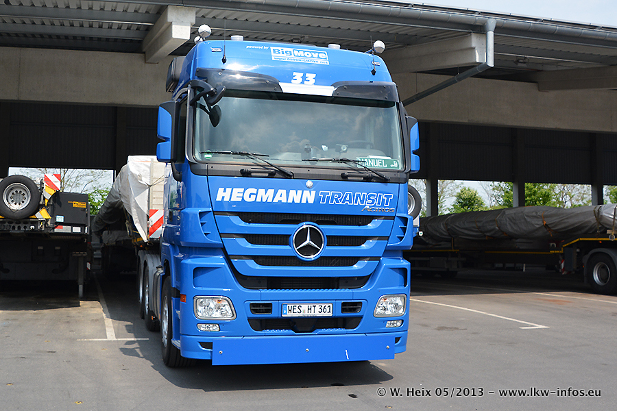Am 08.05.2013 habe ich die Firma Hegmann Transit wieder auf einer Tagestour begleitet: Bei der Firma Aker Wirth GmbH in Erkelenz waren drei Kisten zu laden mit drei Pumpen, die nach China exportiert werden. Die drei Kisten wogen jeweils ca. 45 Tonnen und hatten die Maße (B x H x T) 760 x 355 x 370 cm. Bestimmungsort für Hegmann Transit ist der Hafen Rotterdam (NL). Von dort gehen die Kisten per Schiff weiter nach China. Gefahren wurden die Pumpen mit dem MAN TGX 41.680, dem MB Actros 3 4165 SLT und einem MB Actros 3 4160 SLT, jeweils mit Aufliegern von Nooteboom. Da auf dem Werksgelände nicht fotografiert werden durfte, konnte ich von der Verladung der Kisten leider keine Bilder machen. Breuer & Wasel war mit einem Liebherr LTM da. (Es gibt vom Kran und dem Ballast-Transporter ein paar Bilder, die ich außerhalb vom Werksgelände machen konnte.. Glücklicherweise wurden Ladungssicherung und Abnahme der Transporte außerhalb des Werksgeländes gemacht, so konnte ich entsprechende Bilder machen. Es ergab sich auch die Möglichkeit, auf dem Weg zur Autobahn noch eine Reihe schöne Aufnahmen zu machen. Abgerundet wird meine Fotoreportage von Bildern der Transporte bei der Ankunft auf dem Firmenhof in Sonsbeck.