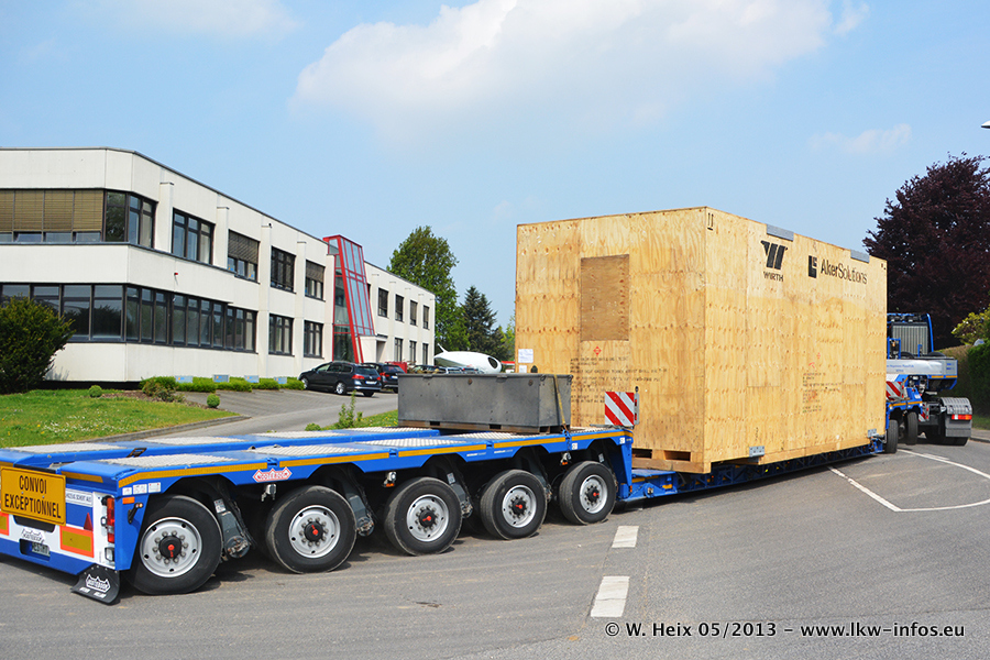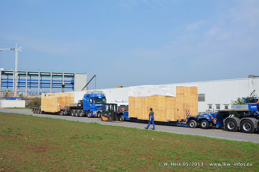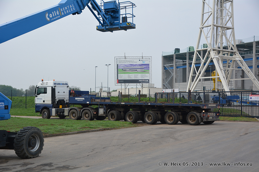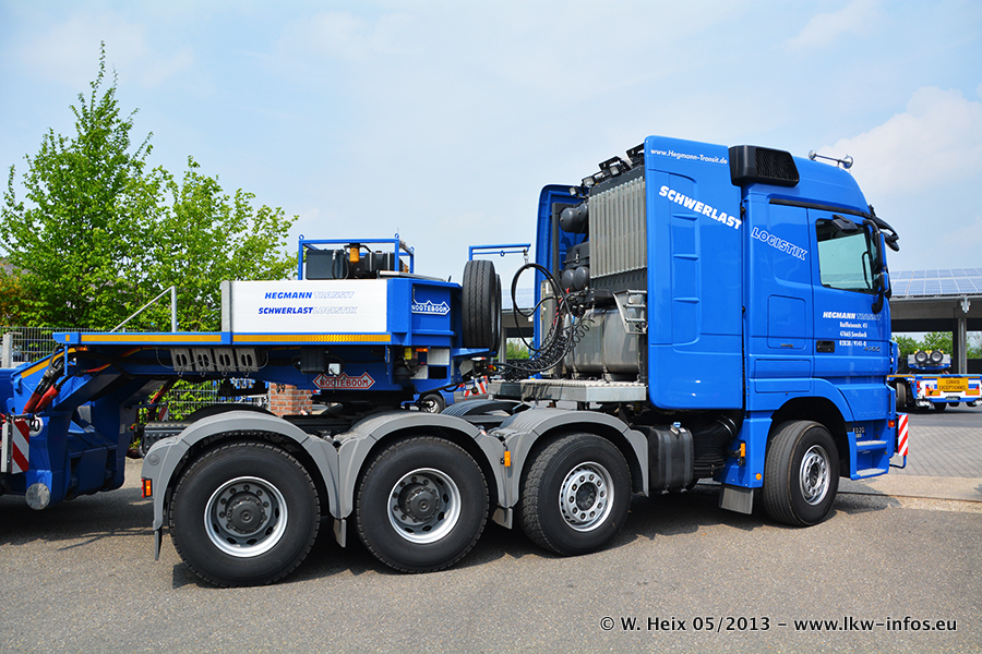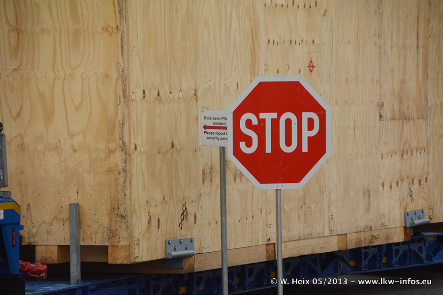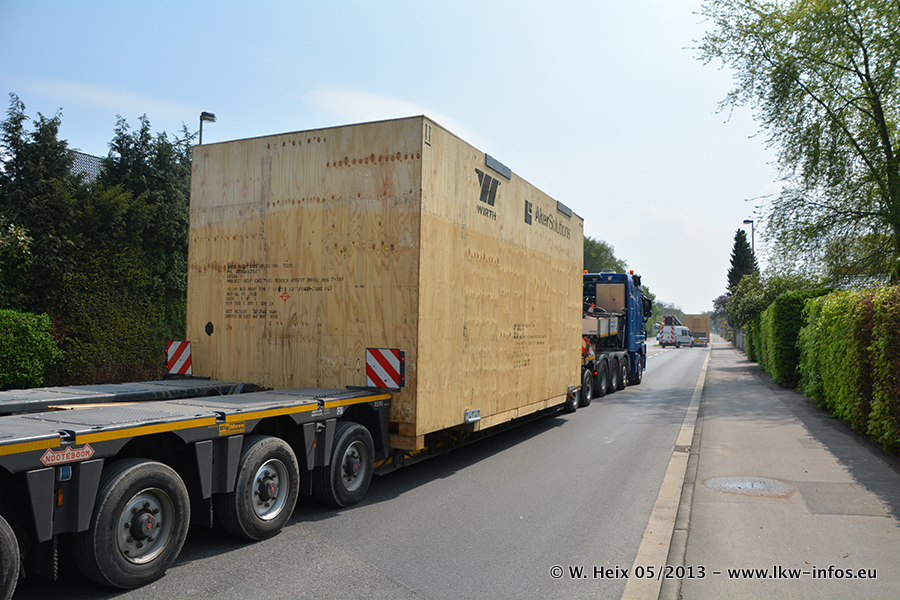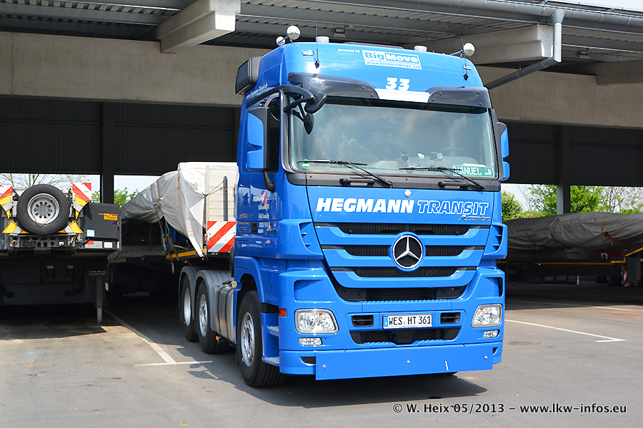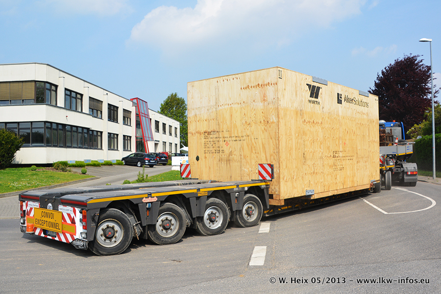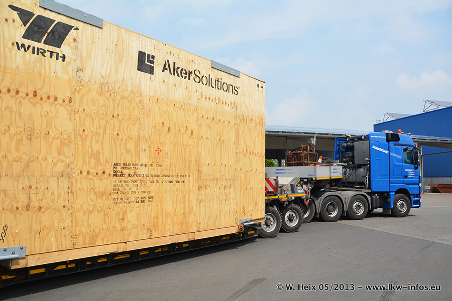 Am 08.05.2013 habe ich die Firma Hegmann Transit wieder auf einer Tagestour begleitet: Bei der Firma Aker Wirth GmbH in Erkelenz waren drei Kisten zu laden mit drei Pumpen, die nach China exportiert werden. Die drei Kisten wogen jeweils ca. 45 Tonnen und hatten die Maße (B x H x T) 760 x 355 x 370 cm. Bestimmungsort für Hegmann Transit ist der Hafen Rotterdam (NL). Von dort gehen die Kisten per Schiff weiter nach China. Gefahren wurden die Pumpen mit dem MAN TGX 41.680, dem MB Actros 3 4165 SLT und einem MB Actros 3 4160 SLT, jeweils mit Aufliegern von Nooteboom. Da auf dem Werksgelände nicht fotografiert werden durfte, konnte ich von der Verladung der Kisten leider keine Bilder machen. Breuer & Wasel war mit einem Liebherr LTM da. (Es gibt vom Kran und dem Ballast-Transporter ein paar Bilder, die ich außerhalb vom Werksgelände machen konnte.. Glücklicherweise wurden Ladungssicherung und Abnahme der Transporte außerhalb des Werksgeländes gemacht, so konnte ich entsprechende Bilder machen. Es ergab sich auch die Möglichkeit, auf dem Weg zur Autobahn noch eine Reihe schöne Aufnahmen zu machen. Abgerundet wird meine Fotoreportage von Bildern der Transporte bei der Ankunft auf dem Firmenhof in Sonsbeck.