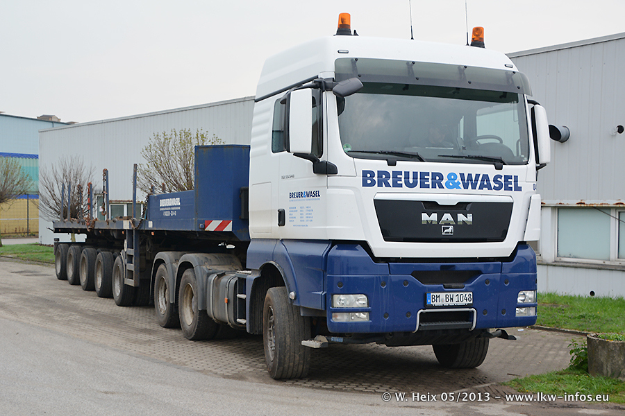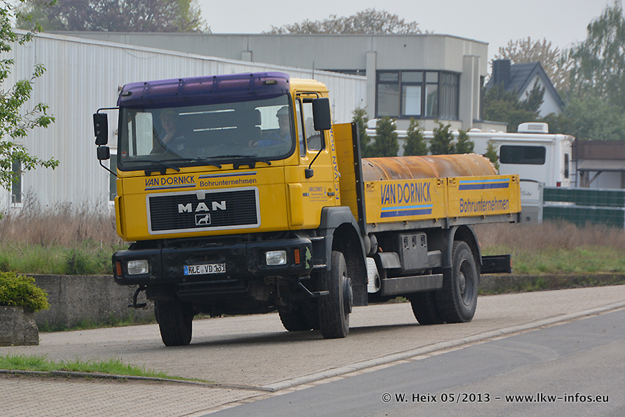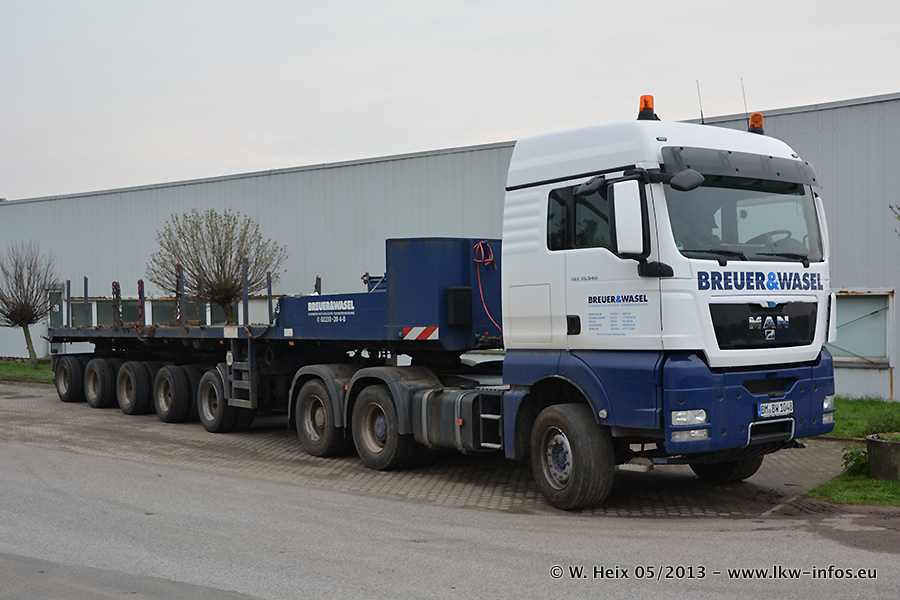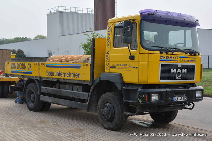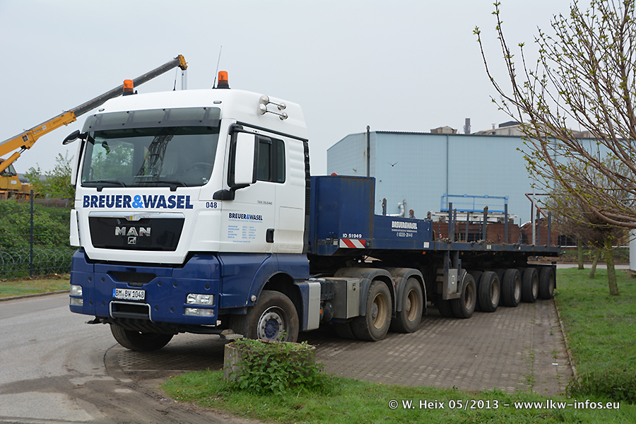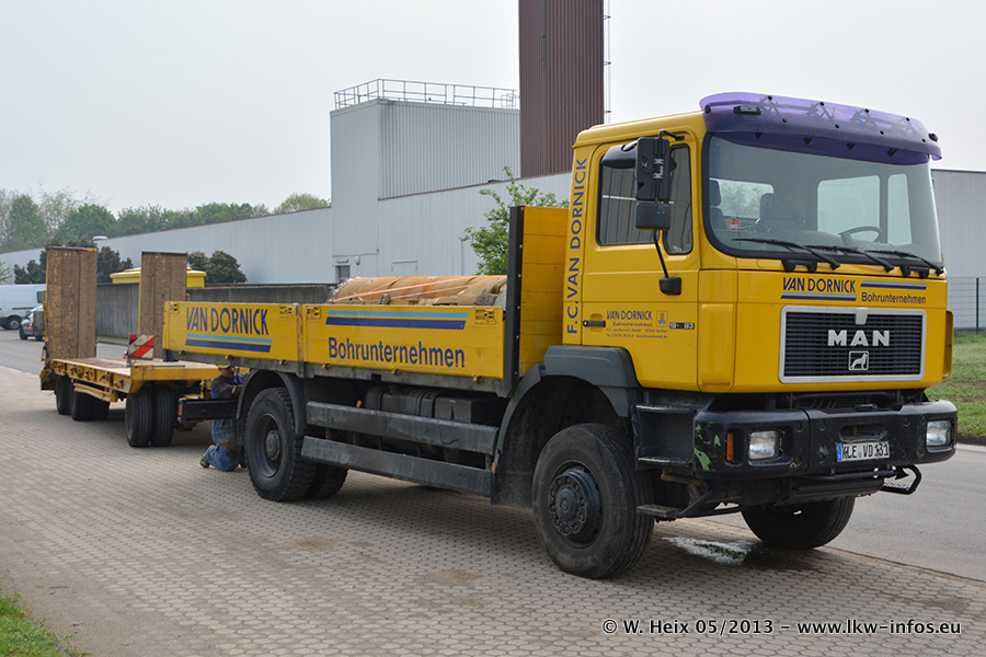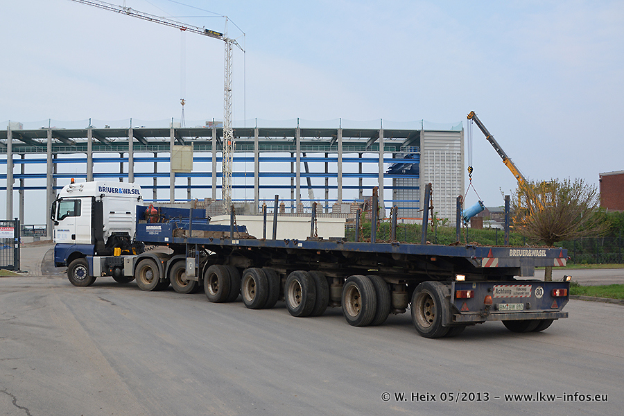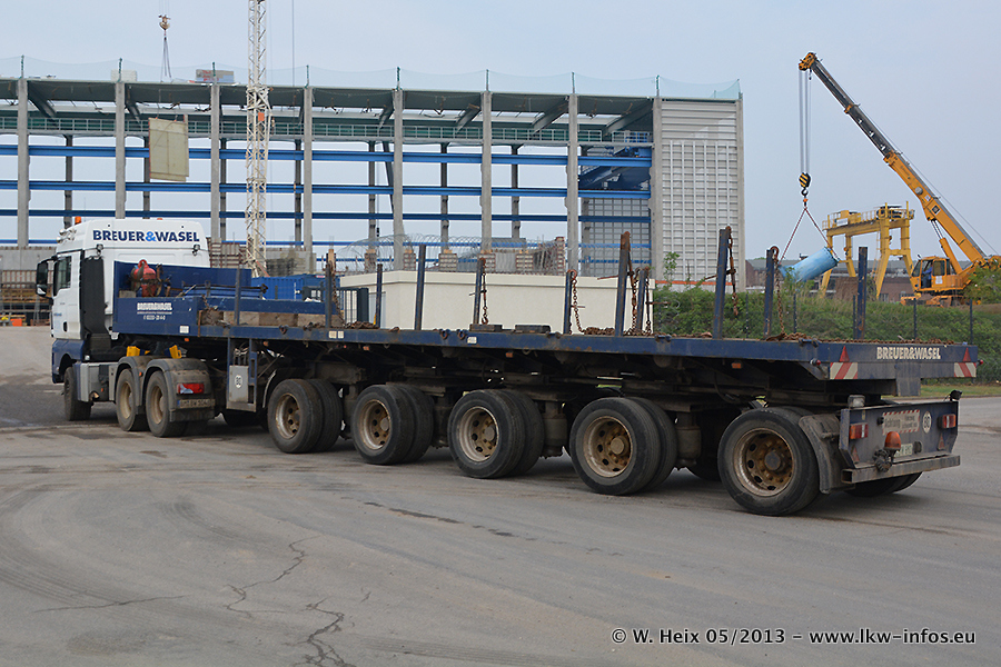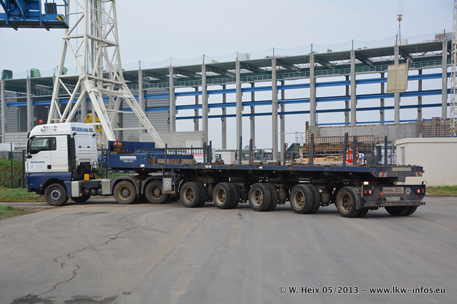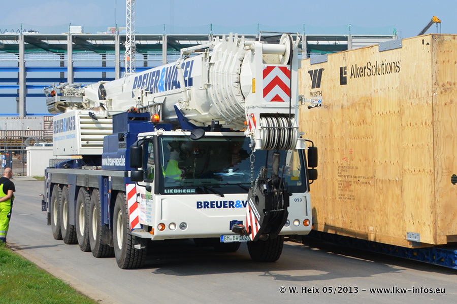 Am 08.05.2013 habe ich die Firma Hegmann Transit wieder auf einer Tagestour begleitet: Bei der Firma Aker Wirth GmbH in Erkelenz waren drei Kisten zu laden mit drei Pumpen, die nach China exportiert werden. Die drei Kisten wogen jeweils ca. 45 Tonnen und hatten die Maße (B x H x T) 760 x 355 x 370 cm. Bestimmungsort für Hegmann Transit ist der Hafen Rotterdam (NL). Von dort gehen die Kisten per Schiff weiter nach China. Gefahren wurden die Pumpen mit dem MAN TGX 41.680, dem MB Actros 3 4165 SLT und einem MB Actros 3 4160 SLT, jeweils mit Aufliegern von Nooteboom. Da auf dem Werksgelände nicht fotografiert werden durfte, konnte ich von der Verladung der Kisten leider keine Bilder machen. Breuer & Wasel war mit einem Liebherr LTM da. (Es gibt vom Kran und dem Ballast-Transporter ein paar Bilder, die ich außerhalb vom Werksgelände machen konnte.. Glücklicherweise wurden Ladungssicherung und Abnahme der Transporte außerhalb des Werksgeländes gemacht, so konnte ich entsprechende Bilder machen. Es ergab sich auch die Möglichkeit, auf dem Weg zur Autobahn noch eine Reihe schöne Aufnahmen zu machen. Abgerundet wird meine Fotoreportage von Bildern der Transporte bei der Ankunft auf dem Firmenhof in Sonsbeck.