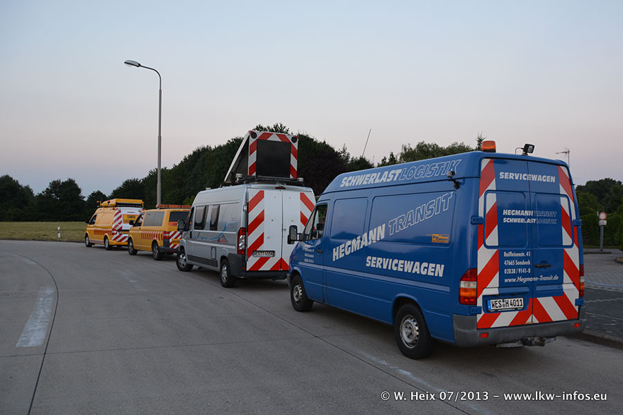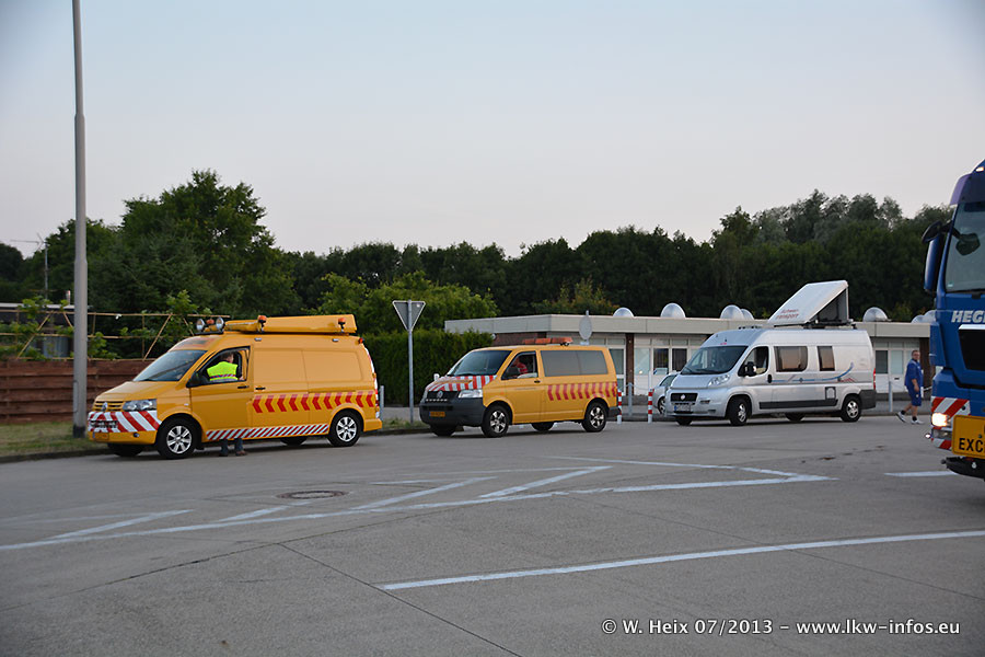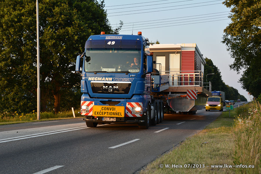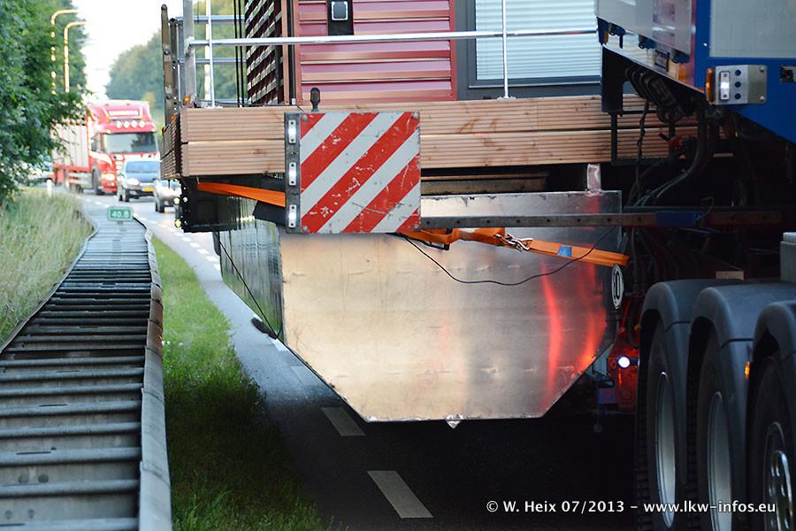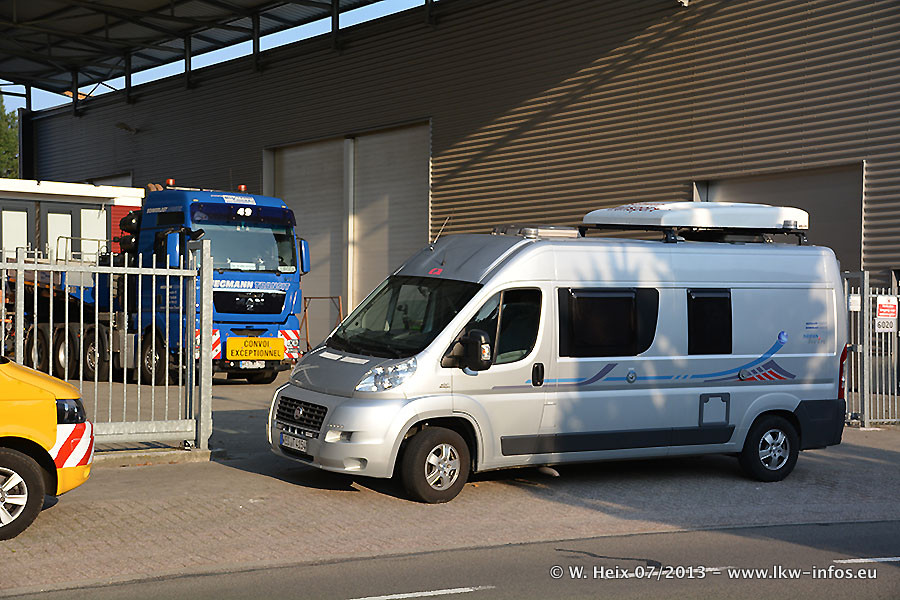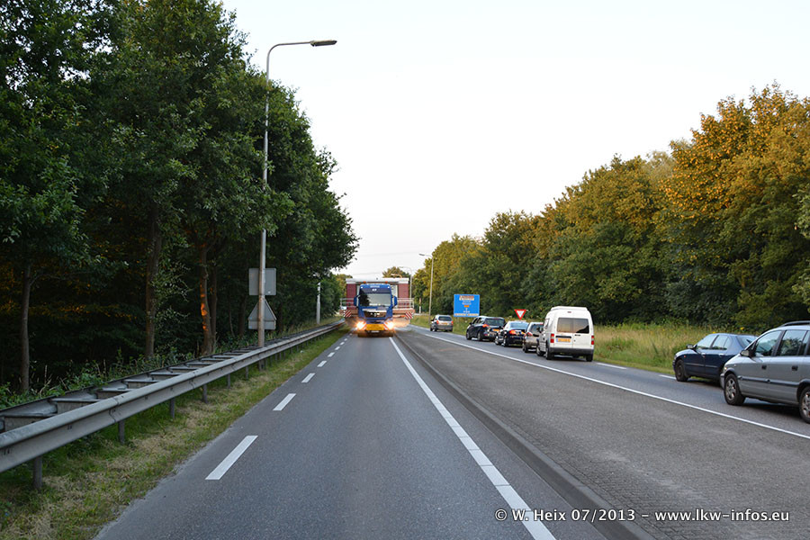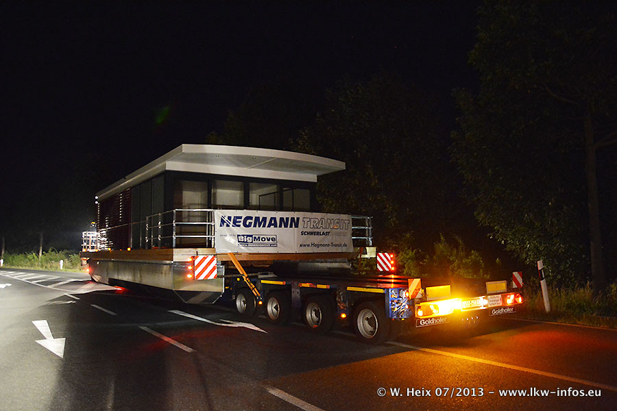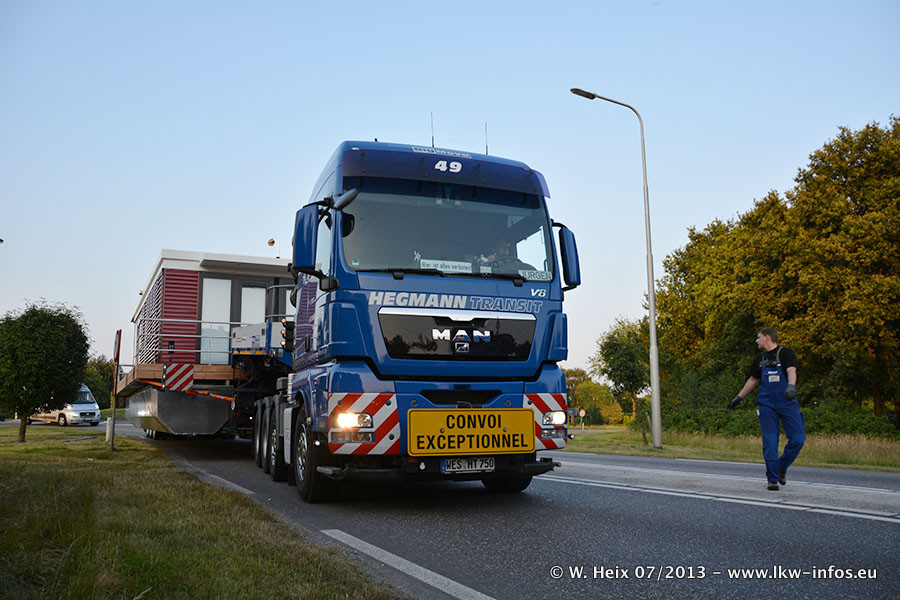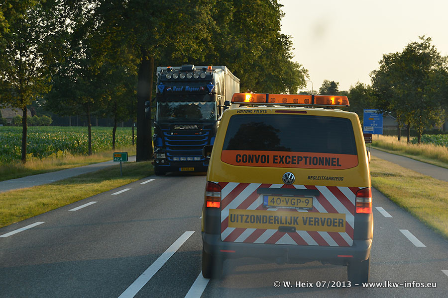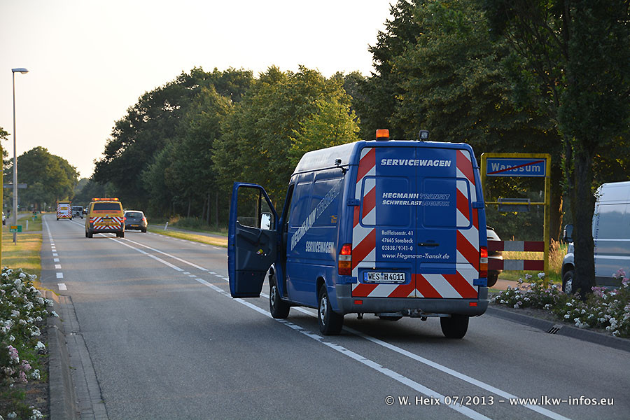 Am 15.07.2013 hatte die Firma Hegmann Transit aus Sonsbeck den Auftrag, ein 6,10 m breites und 13,0 m langes voll eingerichtetes Hausboot vom Hersteller im niederländischen Wanssum (zwischen Venlo und Nijmegen gelegen) zum Freizeitpark "Xantener Nordsee" im niederrheinischen Xanten-Wardt zu transportieren. Der Transport startet gegen 20:00 Uhr und führte zunächst mit zwei und später vier niederländischen Begleitern durch den Ort Wanssum und dann ca. 10 km über Nationalstraße bis zur A73. Diese Etappe war auch das interessanteste Stück mit einigen engen Verkehrsinseln und zwei Kreisverkehren, die einmal rechts und einmal links im Gegenverkehr durchfahren wurden. Dann ging es über die Autobahnen A73 und A77 bis zum Grenzübergang Goch Autobahn auf der A57. Dort blieb der Transport für eine gute Stunde stehen bis die deutsche Polizeibegleitung vor Ort war. Die Fahrt führte dann über die A57 bis zur Anschlussstelle Alpen. Dort wechselte dann die Polizeibegleitung und die Fahrt ging weiter über die B58 bis Alpen und dann über die B57 vorbei an Xanten bis zum Ortsteil Wardt.