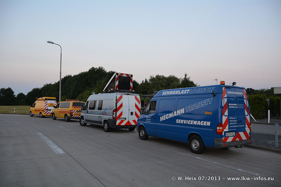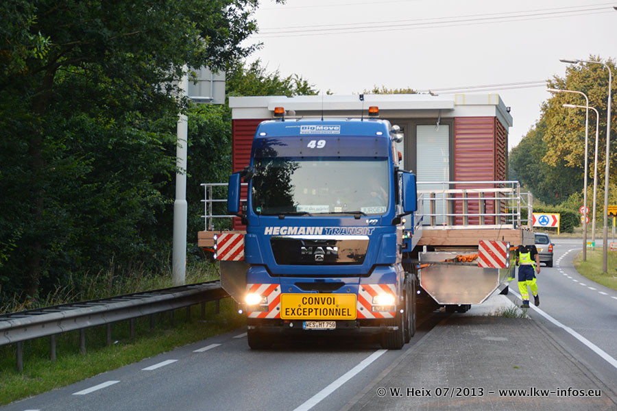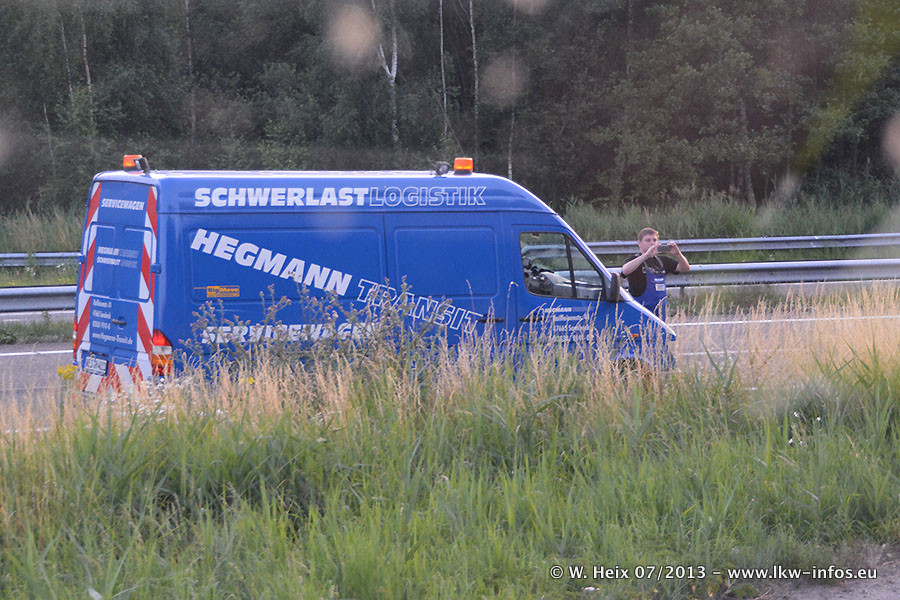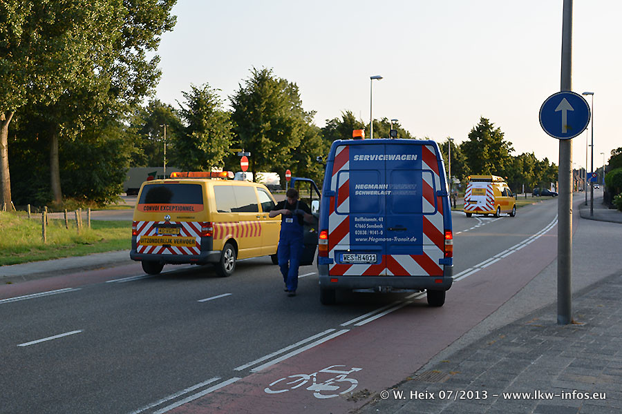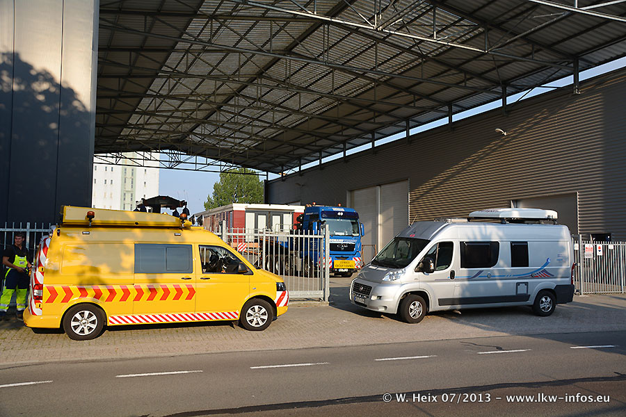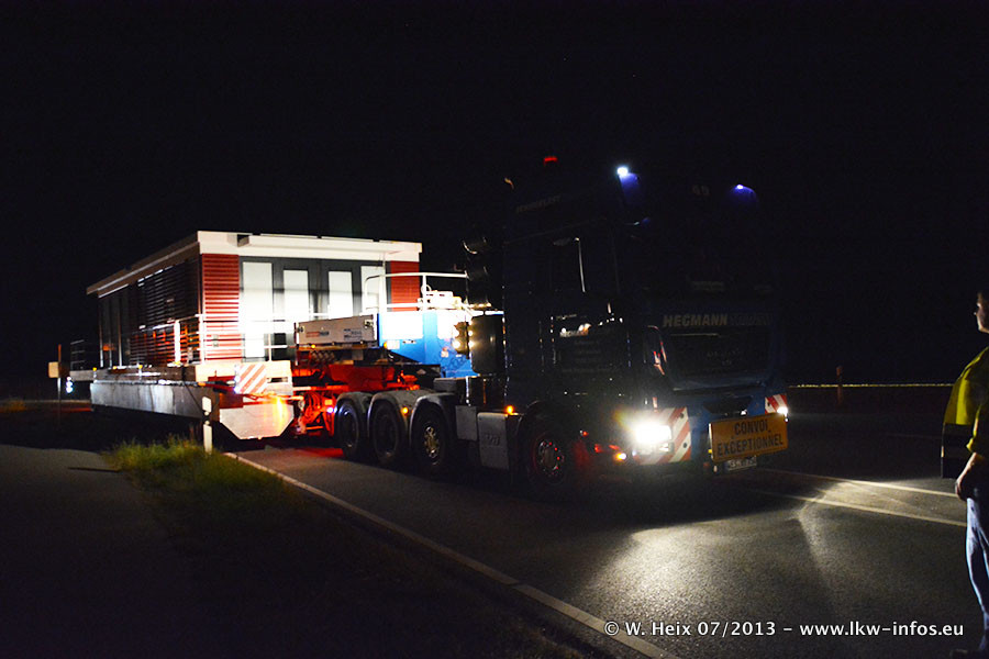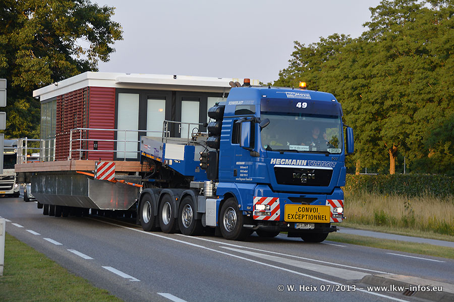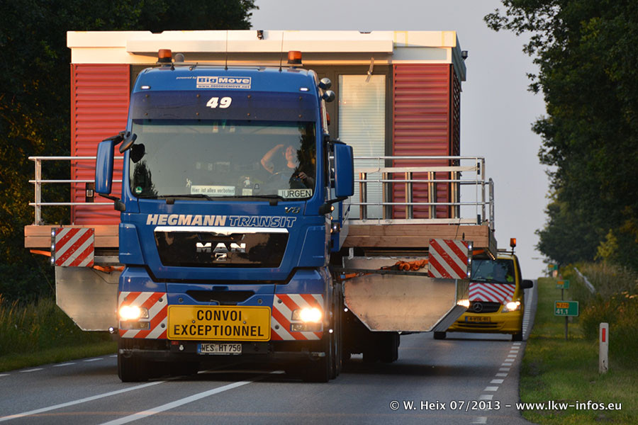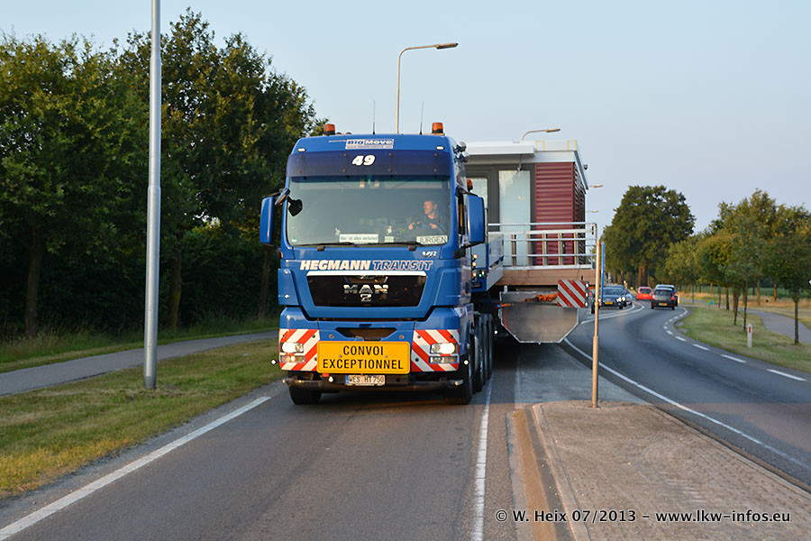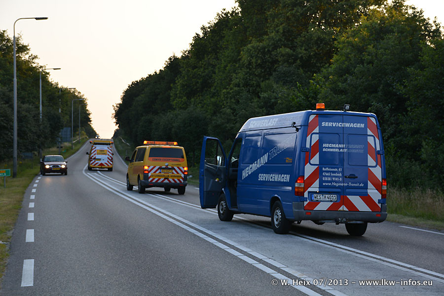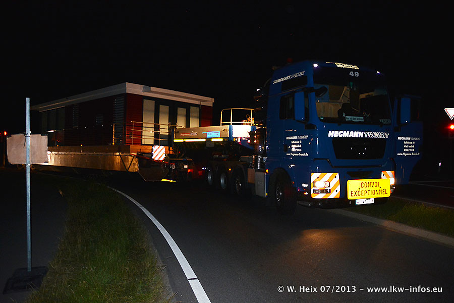 Am 15.07.2013 hatte die Firma Hegmann Transit aus Sonsbeck den Auftrag, ein 6,10 m breites und 13,0 m langes voll eingerichtetes Hausboot vom Hersteller im niederländischen Wanssum (zwischen Venlo und Nijmegen gelegen) zum Freizeitpark "Xantener Nordsee" im niederrheinischen Xanten-Wardt zu transportieren. Der Transport startet gegen 20:00 Uhr und führte zunächst mit zwei und später vier niederländischen Begleitern durch den Ort Wanssum und dann ca. 10 km über Nationalstraße bis zur A73. Diese Etappe war auch das interessanteste Stück mit einigen engen Verkehrsinseln und zwei Kreisverkehren, die einmal rechts und einmal links im Gegenverkehr durchfahren wurden. Dann ging es über die Autobahnen A73 und A77 bis zum Grenzübergang Goch Autobahn auf der A57. Dort blieb der Transport für eine gute Stunde stehen bis die deutsche Polizeibegleitung vor Ort war. Die Fahrt führte dann über die A57 bis zur Anschlussstelle Alpen. Dort wechselte dann die Polizeibegleitung und die Fahrt ging weiter über die B58 bis Alpen und dann über die B57 vorbei an Xanten bis zum Ortsteil Wardt.