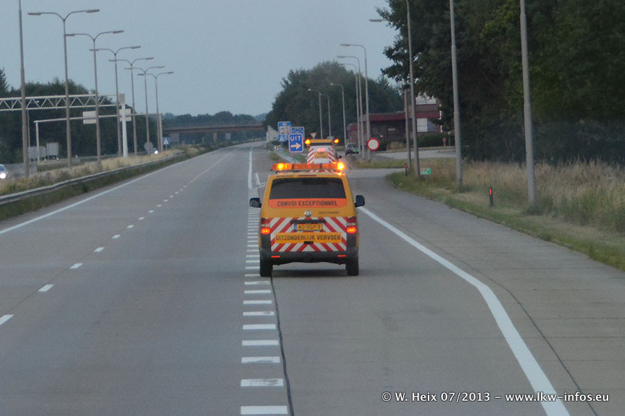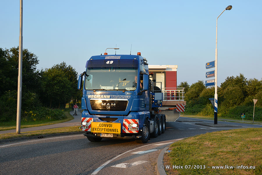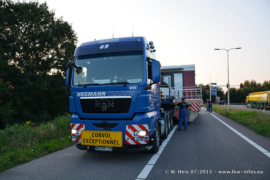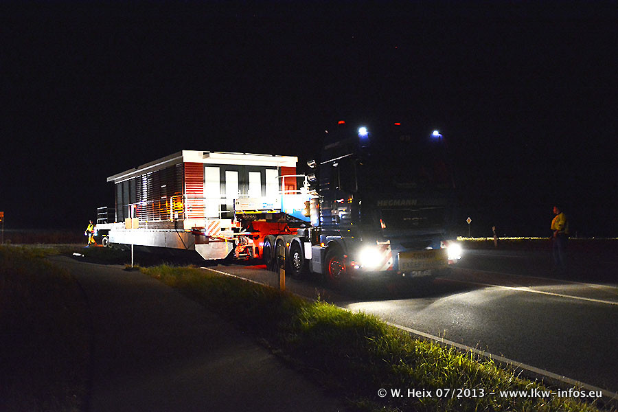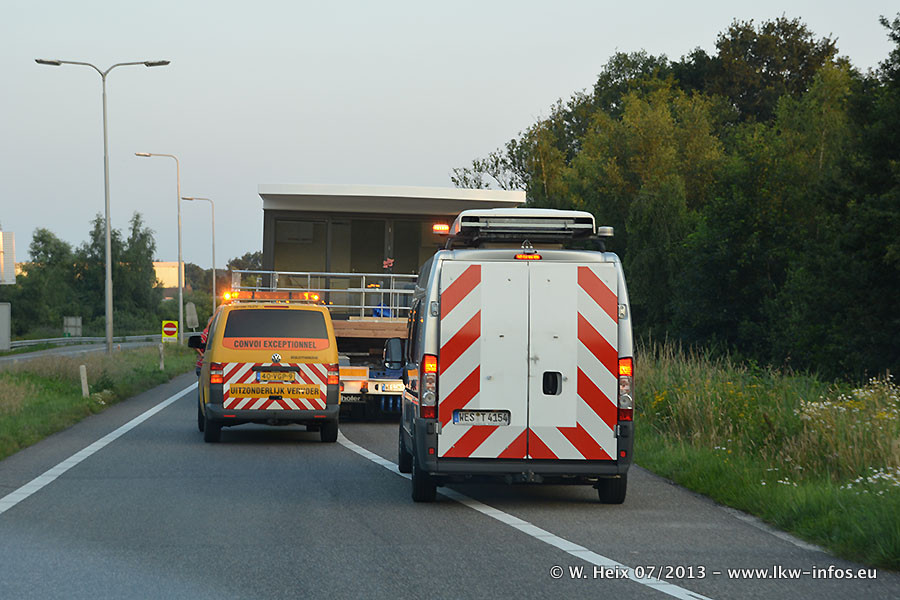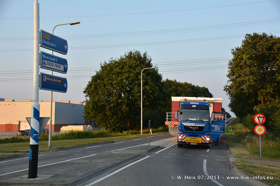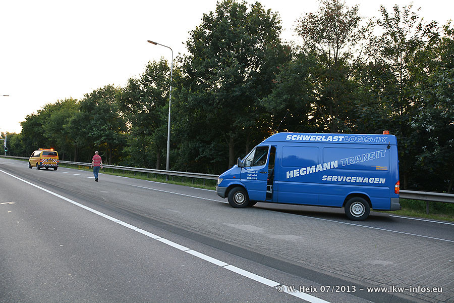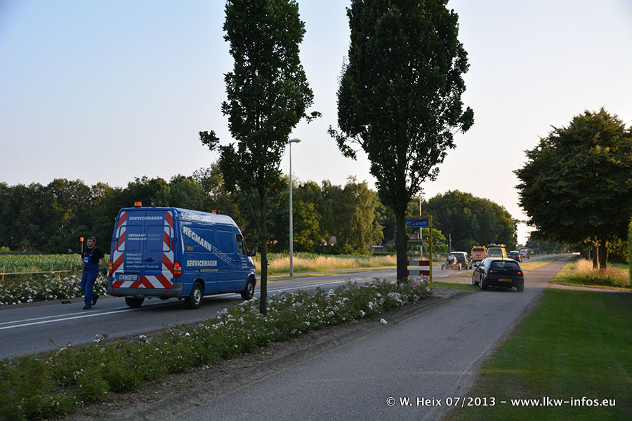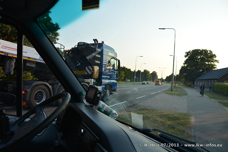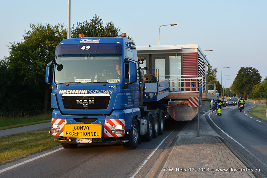 Am 15.07.2013 hatte die Firma Hegmann Transit aus Sonsbeck den Auftrag, ein 6,10 m breites und 13,0 m langes voll eingerichtetes Hausboot vom Hersteller im niederländischen Wanssum (zwischen Venlo und Nijmegen gelegen) zum Freizeitpark "Xantener Nordsee" im niederrheinischen Xanten-Wardt zu transportieren. Der Transport startet gegen 20:00 Uhr und führte zunächst mit zwei und später vier niederländischen Begleitern durch den Ort Wanssum und dann ca. 10 km über Nationalstraße bis zur A73. Diese Etappe war auch das interessanteste Stück mit einigen engen Verkehrsinseln und zwei Kreisverkehren, die einmal rechts und einmal links im Gegenverkehr durchfahren wurden. Dann ging es über die Autobahnen A73 und A77 bis zum Grenzübergang Goch Autobahn auf der A57. Dort blieb der Transport für eine gute Stunde stehen bis die deutsche Polizeibegleitung vor Ort war. Die Fahrt führte dann über die A57 bis zur Anschlussstelle Alpen. Dort wechselte dann die Polizeibegleitung und die Fahrt ging weiter über die B58 bis Alpen und dann über die B57 vorbei an Xanten bis zum Ortsteil Wardt.