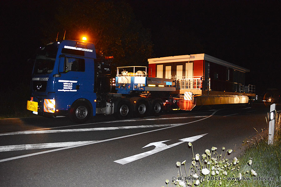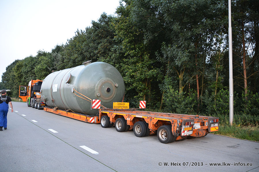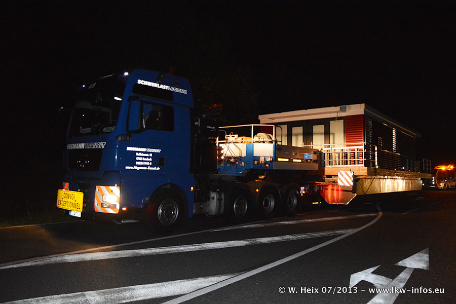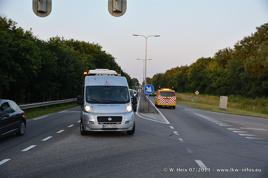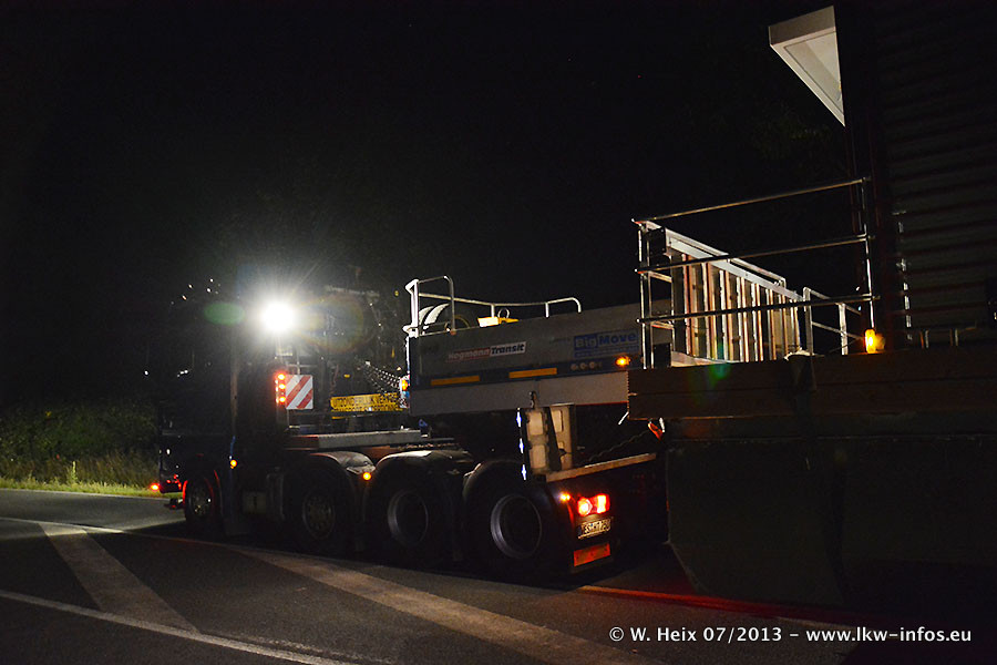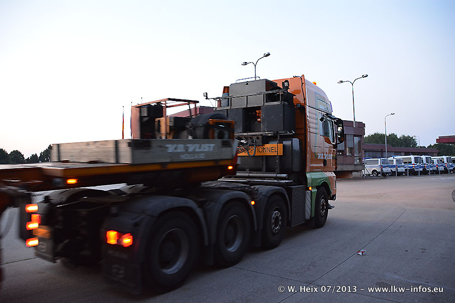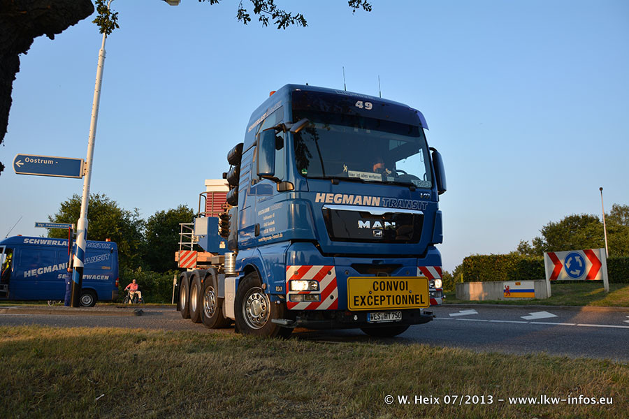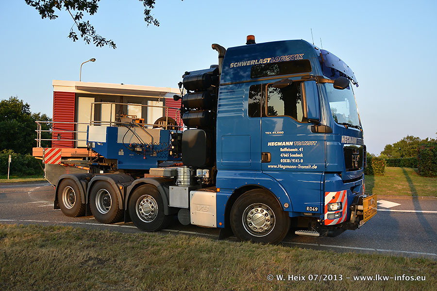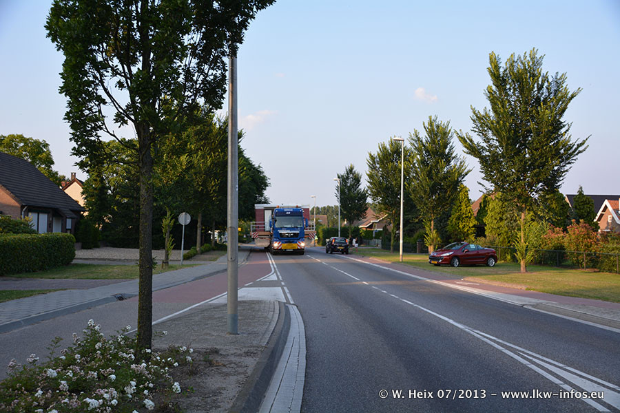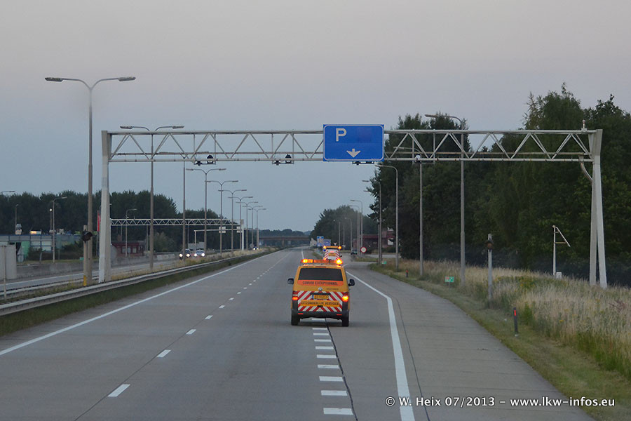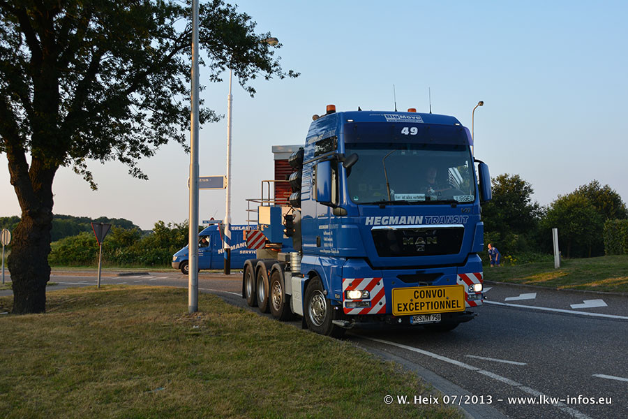 Am 15.07.2013 hatte die Firma Hegmann Transit aus Sonsbeck den Auftrag, ein 6,10 m breites und 13,0 m langes voll eingerichtetes Hausboot vom Hersteller im niederländischen Wanssum (zwischen Venlo und Nijmegen gelegen) zum Freizeitpark "Xantener Nordsee" im niederrheinischen Xanten-Wardt zu transportieren. Der Transport startet gegen 20:00 Uhr und führte zunächst mit zwei und später vier niederländischen Begleitern durch den Ort Wanssum und dann ca. 10 km über Nationalstraße bis zur A73. Diese Etappe war auch das interessanteste Stück mit einigen engen Verkehrsinseln und zwei Kreisverkehren, die einmal rechts und einmal links im Gegenverkehr durchfahren wurden. Dann ging es über die Autobahnen A73 und A77 bis zum Grenzübergang Goch Autobahn auf der A57. Dort blieb der Transport für eine gute Stunde stehen bis die deutsche Polizeibegleitung vor Ort war. Die Fahrt führte dann über die A57 bis zur Anschlussstelle Alpen. Dort wechselte dann die Polizeibegleitung und die Fahrt ging weiter über die B58 bis Alpen und dann über die B57 vorbei an Xanten bis zum Ortsteil Wardt.