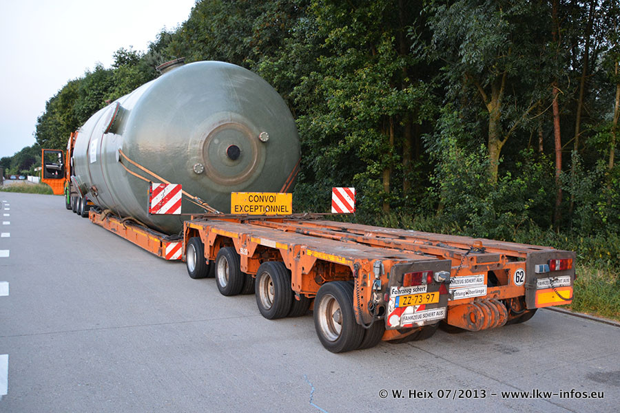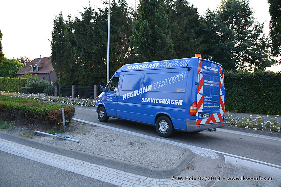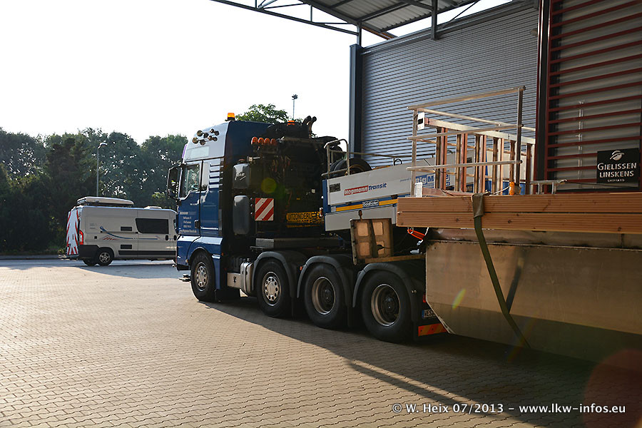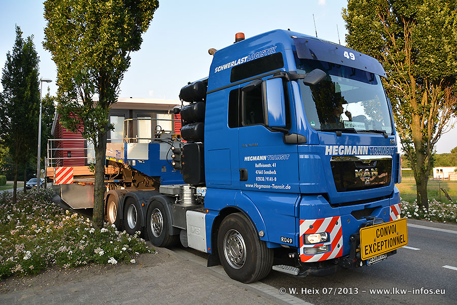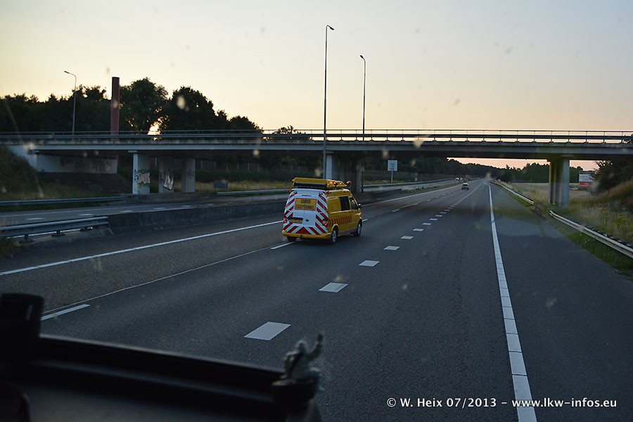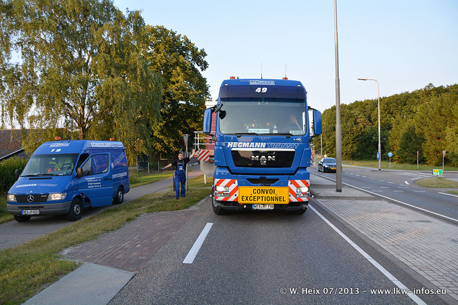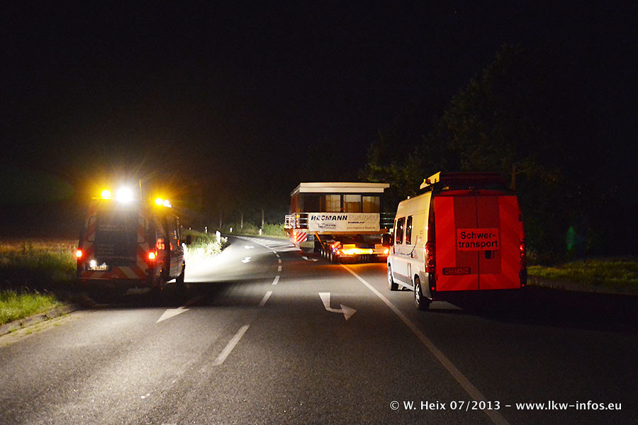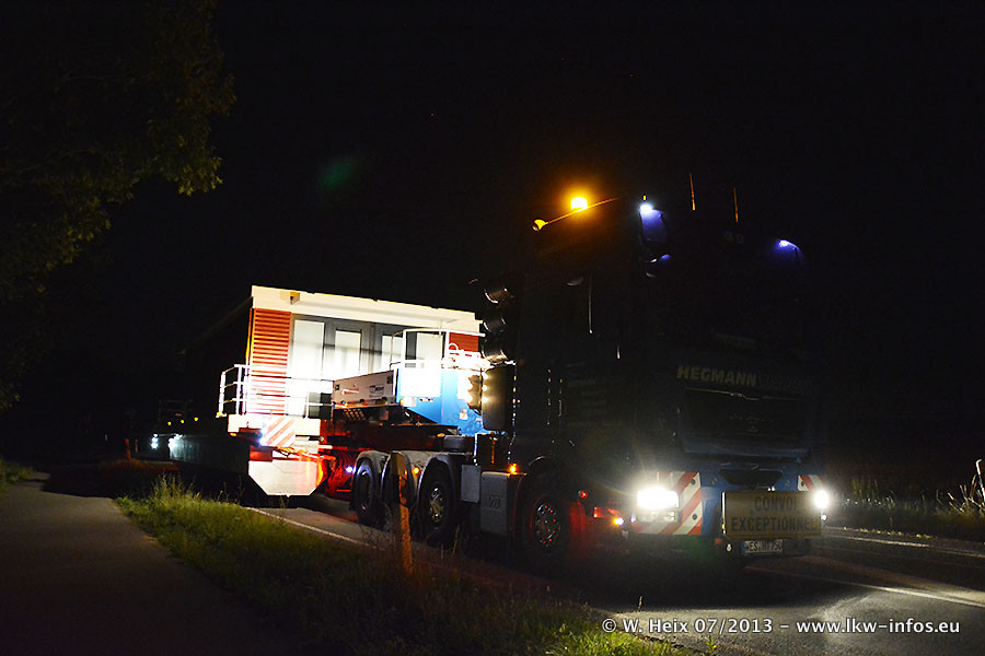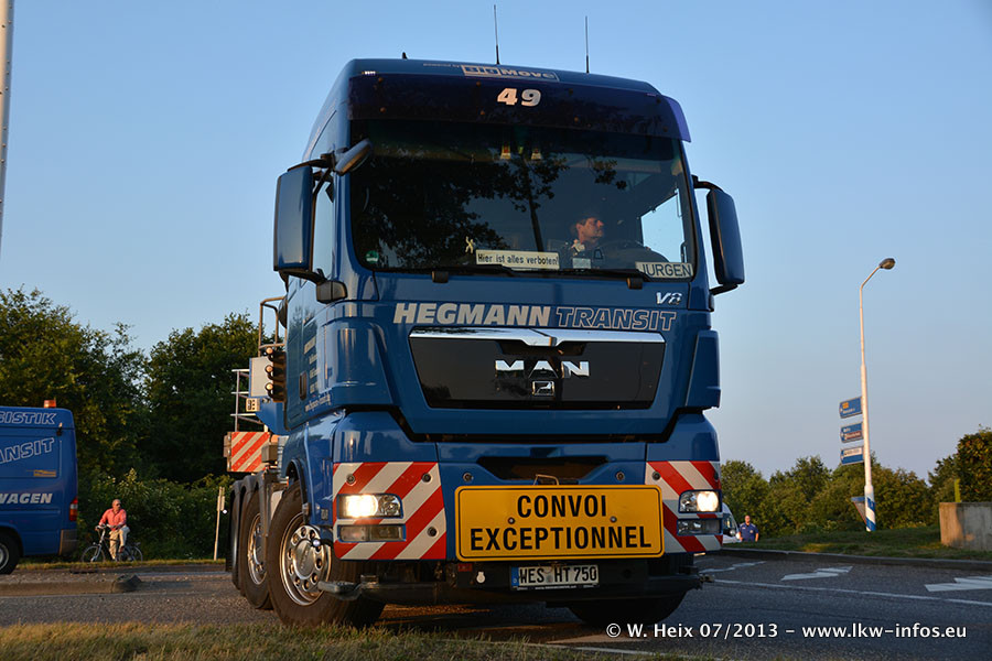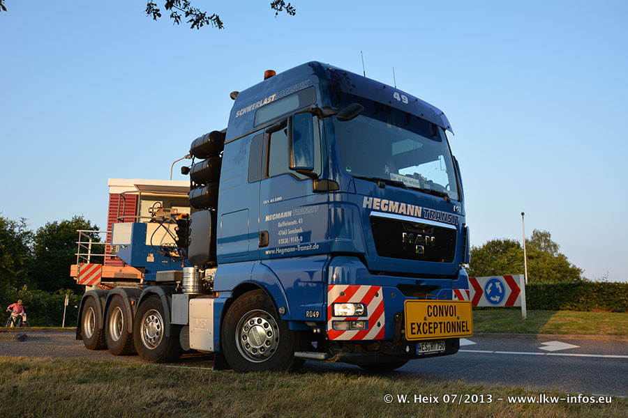 Am 15.07.2013 hatte die Firma Hegmann Transit aus Sonsbeck den Auftrag, ein 6,10 m breites und 13,0 m langes voll eingerichtetes Hausboot vom Hersteller im niederländischen Wanssum (zwischen Venlo und Nijmegen gelegen) zum Freizeitpark "Xantener Nordsee" im niederrheinischen Xanten-Wardt zu transportieren. Der Transport startet gegen 20:00 Uhr und führte zunächst mit zwei und später vier niederländischen Begleitern durch den Ort Wanssum und dann ca. 10 km über Nationalstraße bis zur A73. Diese Etappe war auch das interessanteste Stück mit einigen engen Verkehrsinseln und zwei Kreisverkehren, die einmal rechts und einmal links im Gegenverkehr durchfahren wurden. Dann ging es über die Autobahnen A73 und A77 bis zum Grenzübergang Goch Autobahn auf der A57. Dort blieb der Transport für eine gute Stunde stehen bis die deutsche Polizeibegleitung vor Ort war. Die Fahrt führte dann über die A57 bis zur Anschlussstelle Alpen. Dort wechselte dann die Polizeibegleitung und die Fahrt ging weiter über die B58 bis Alpen und dann über die B57 vorbei an Xanten bis zum Ortsteil Wardt.