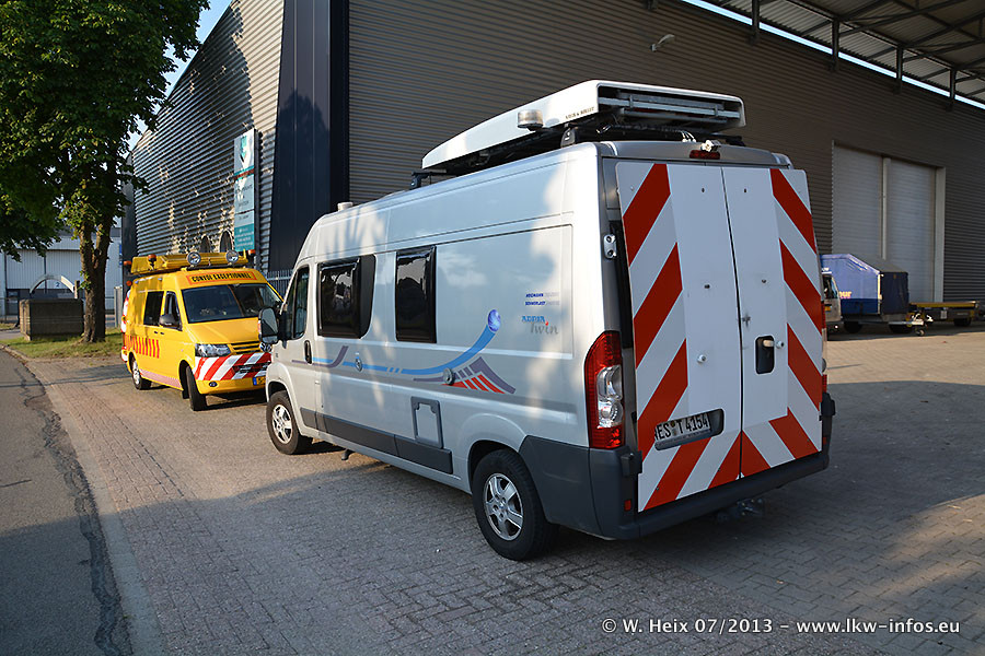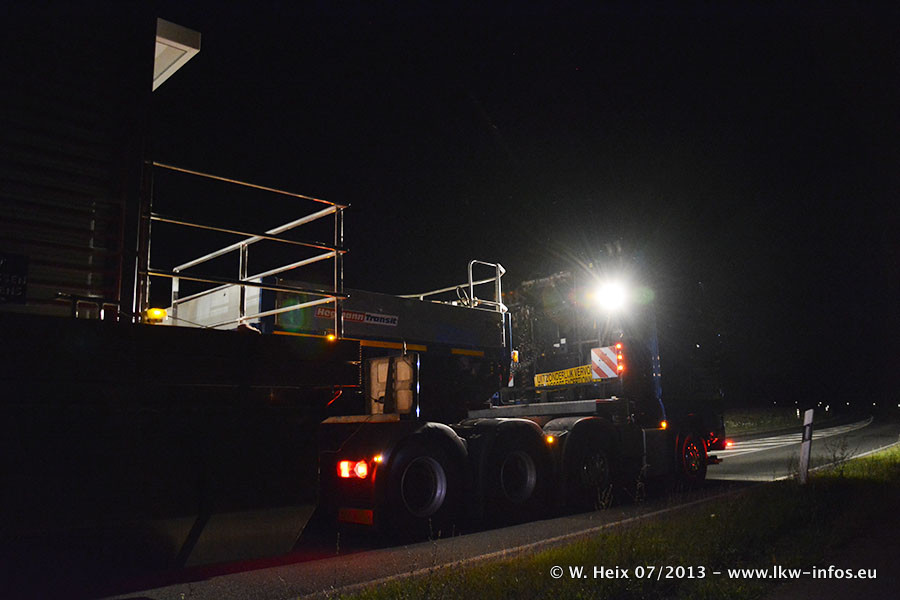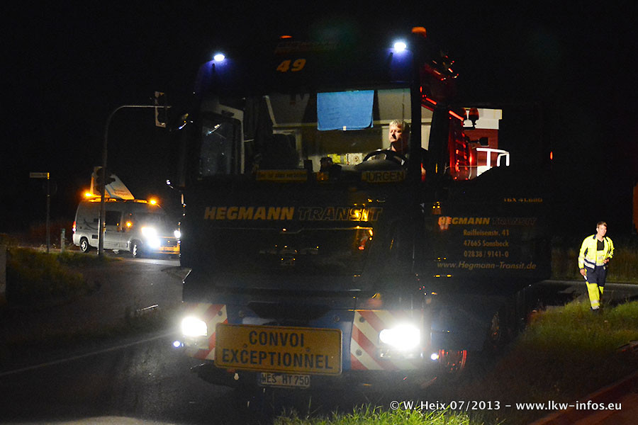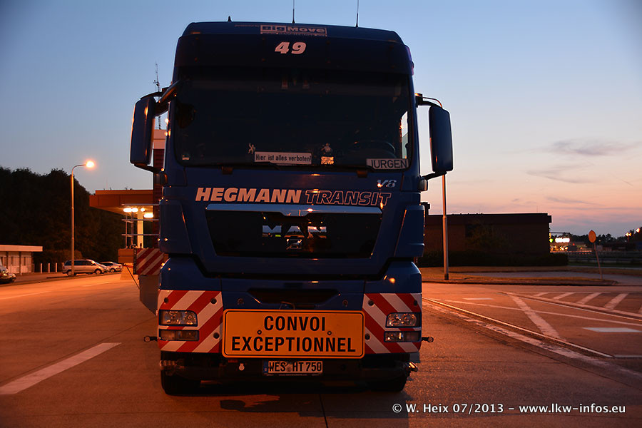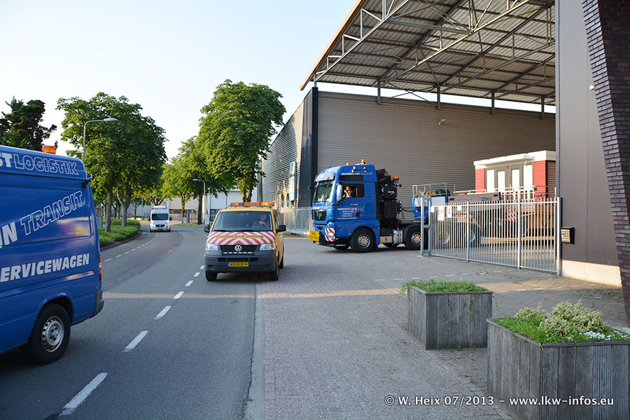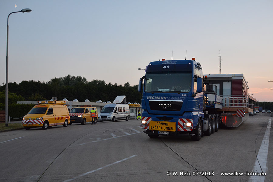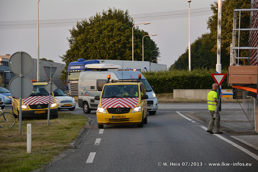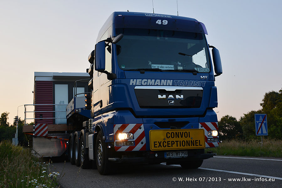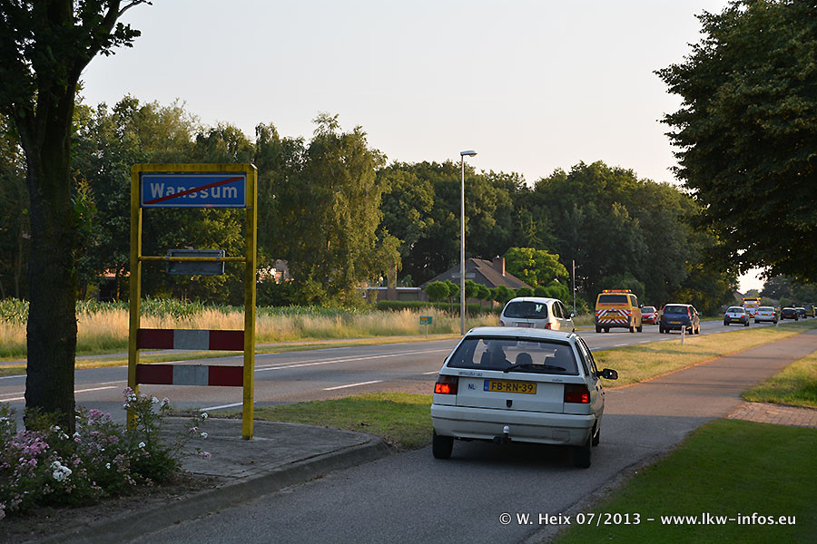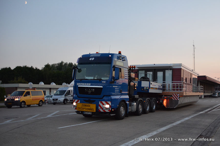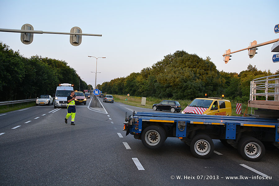 Am 15.07.2013 hatte die Firma Hegmann Transit aus Sonsbeck den Auftrag, ein 6,10 m breites und 13,0 m langes voll eingerichtetes Hausboot vom Hersteller im niederländischen Wanssum (zwischen Venlo und Nijmegen gelegen) zum Freizeitpark "Xantener Nordsee" im niederrheinischen Xanten-Wardt zu transportieren. Der Transport startet gegen 20:00 Uhr und führte zunächst mit zwei und später vier niederländischen Begleitern durch den Ort Wanssum und dann ca. 10 km über Nationalstraße bis zur A73. Diese Etappe war auch das interessanteste Stück mit einigen engen Verkehrsinseln und zwei Kreisverkehren, die einmal rechts und einmal links im Gegenverkehr durchfahren wurden. Dann ging es über die Autobahnen A73 und A77 bis zum Grenzübergang Goch Autobahn auf der A57. Dort blieb der Transport für eine gute Stunde stehen bis die deutsche Polizeibegleitung vor Ort war. Die Fahrt führte dann über die A57 bis zur Anschlussstelle Alpen. Dort wechselte dann die Polizeibegleitung und die Fahrt ging weiter über die B58 bis Alpen und dann über die B57 vorbei an Xanten bis zum Ortsteil Wardt.