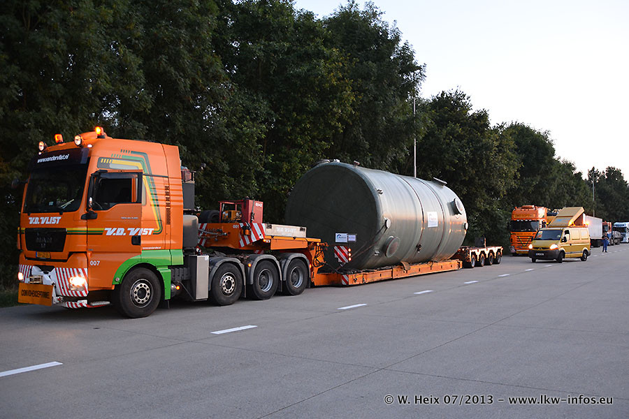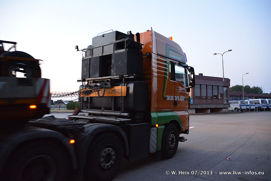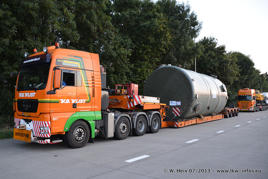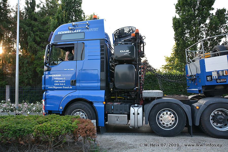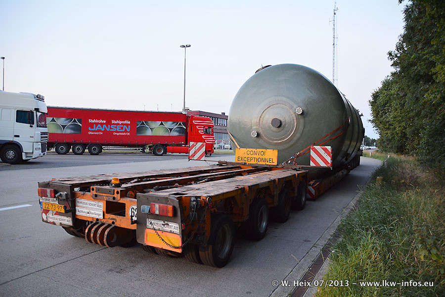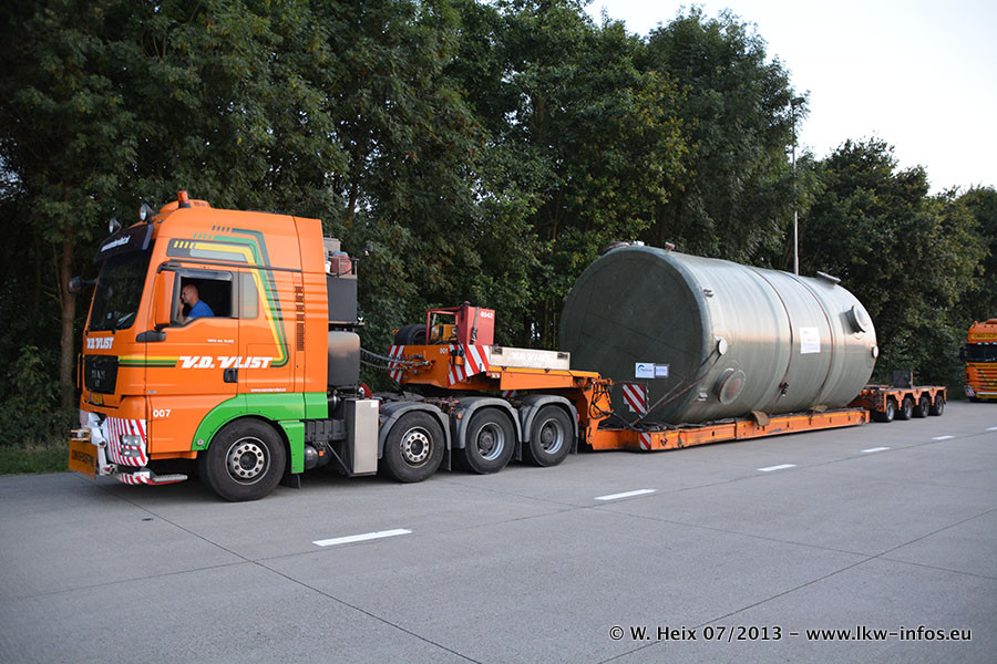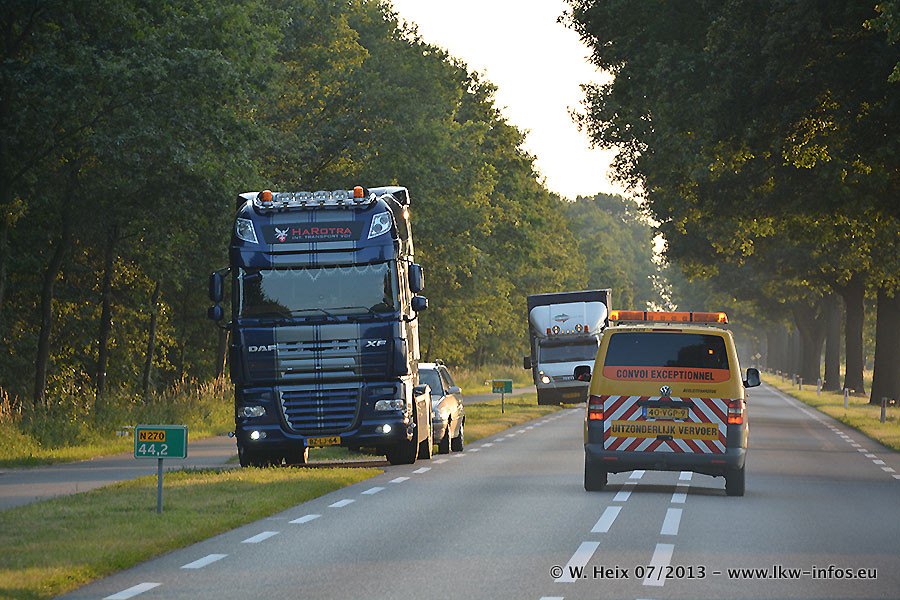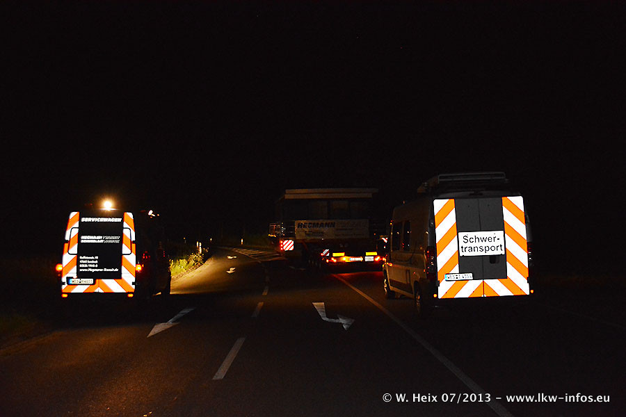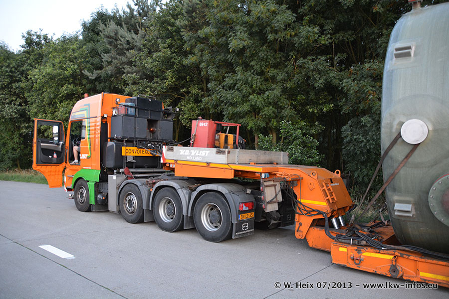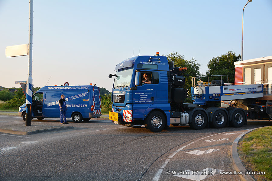 Am 15.07.2013 hatte die Firma Hegmann Transit aus Sonsbeck den Auftrag, ein 6,10 m breites und 13,0 m langes voll eingerichtetes Hausboot vom Hersteller im niederländischen Wanssum (zwischen Venlo und Nijmegen gelegen) zum Freizeitpark "Xantener Nordsee" im niederrheinischen Xanten-Wardt zu transportieren. Der Transport startet gegen 20:00 Uhr und führte zunächst mit zwei und später vier niederländischen Begleitern durch den Ort Wanssum und dann ca. 10 km über Nationalstraße bis zur A73. Diese Etappe war auch das interessanteste Stück mit einigen engen Verkehrsinseln und zwei Kreisverkehren, die einmal rechts und einmal links im Gegenverkehr durchfahren wurden. Dann ging es über die Autobahnen A73 und A77 bis zum Grenzübergang Goch Autobahn auf der A57. Dort blieb der Transport für eine gute Stunde stehen bis die deutsche Polizeibegleitung vor Ort war. Die Fahrt führte dann über die A57 bis zur Anschlussstelle Alpen. Dort wechselte dann die Polizeibegleitung und die Fahrt ging weiter über die B58 bis Alpen und dann über die B57 vorbei an Xanten bis zum Ortsteil Wardt.